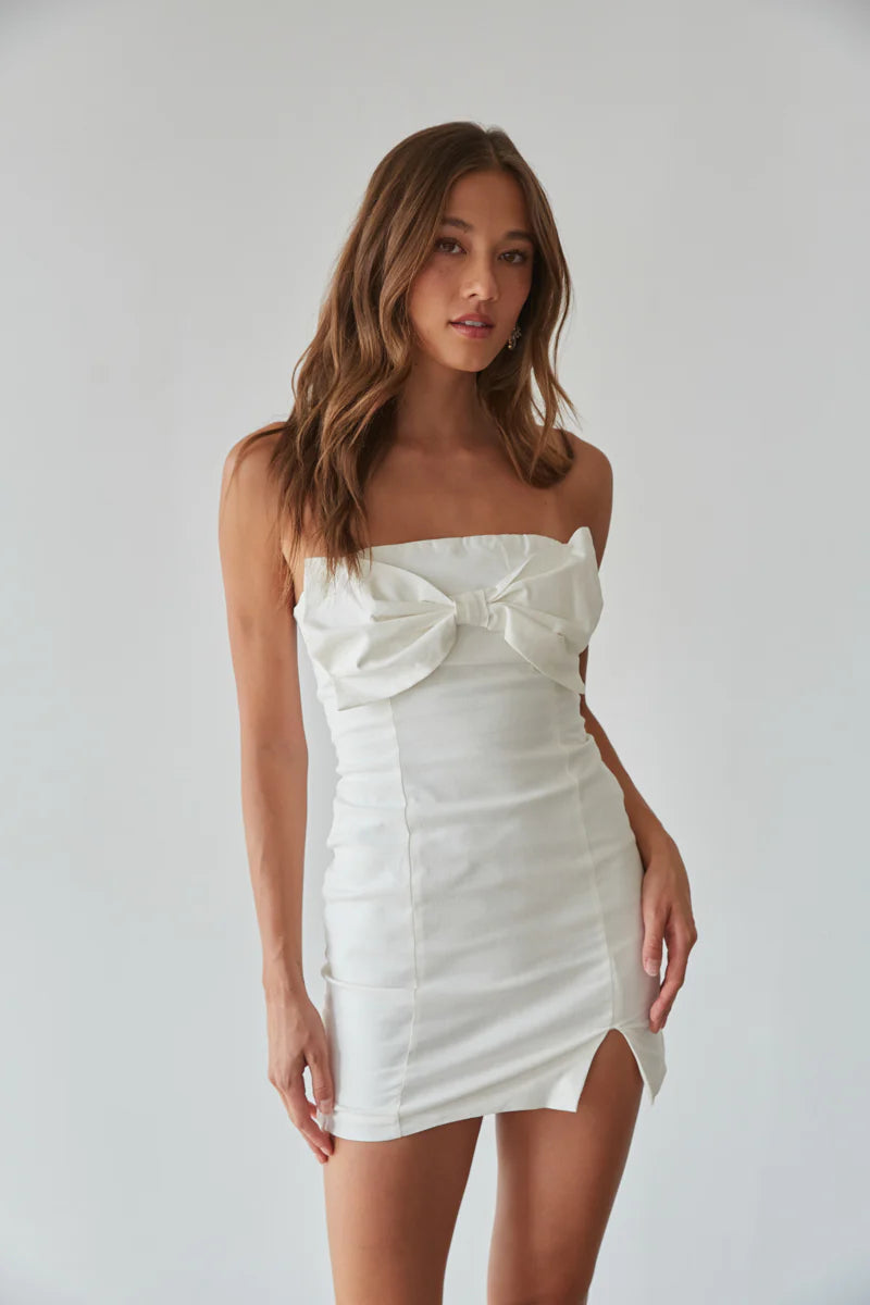 You'll be the star of the show in the Mina Strapless Bow Bodycon Mini Dress! This stunning mini dress features a straight across neckline, statement bow detail at the bust, and a mini side slit. Available in pink and white. Finish off the look with your favorite heels!