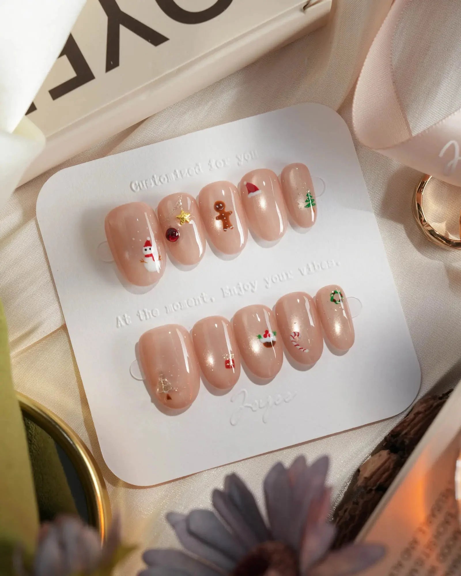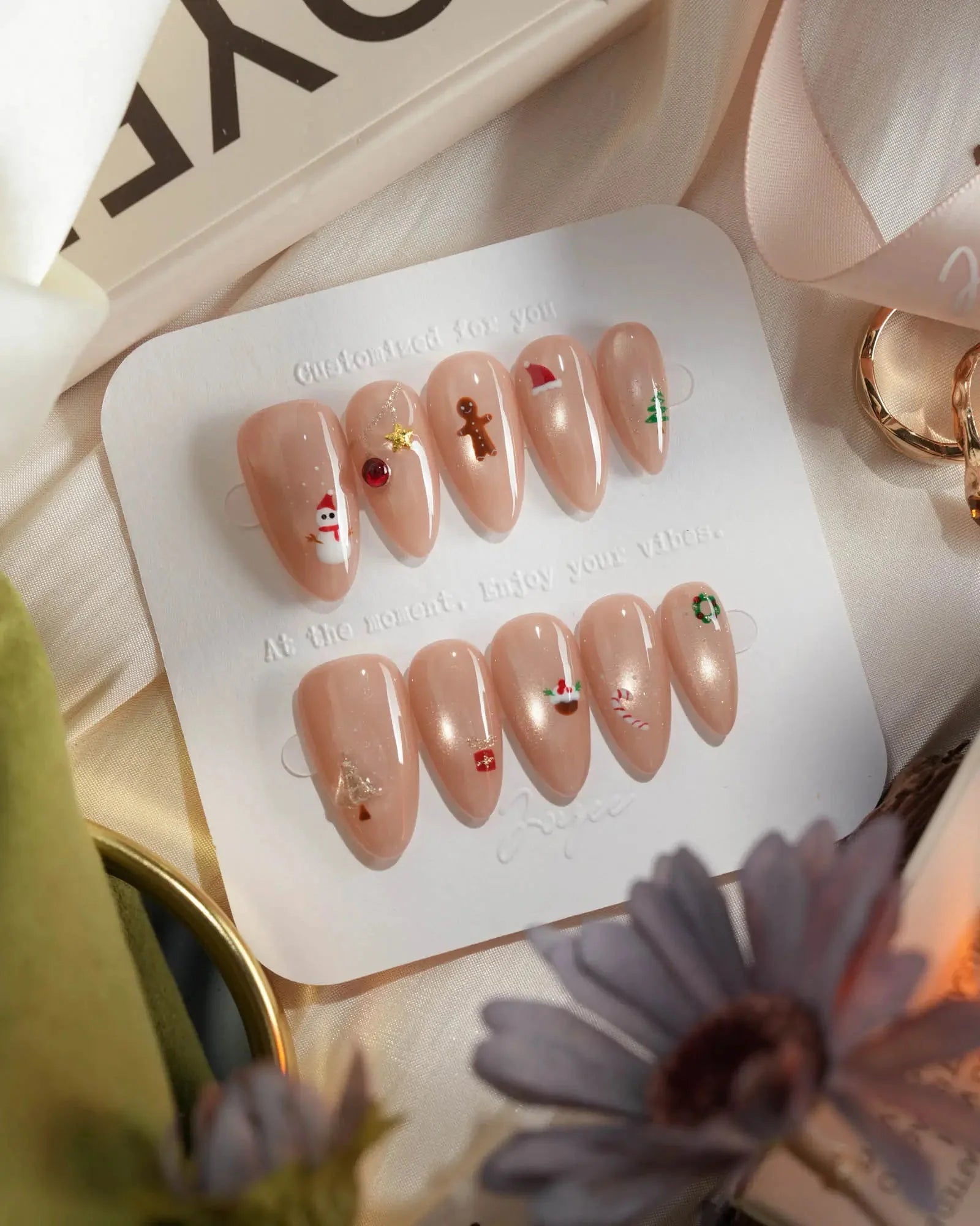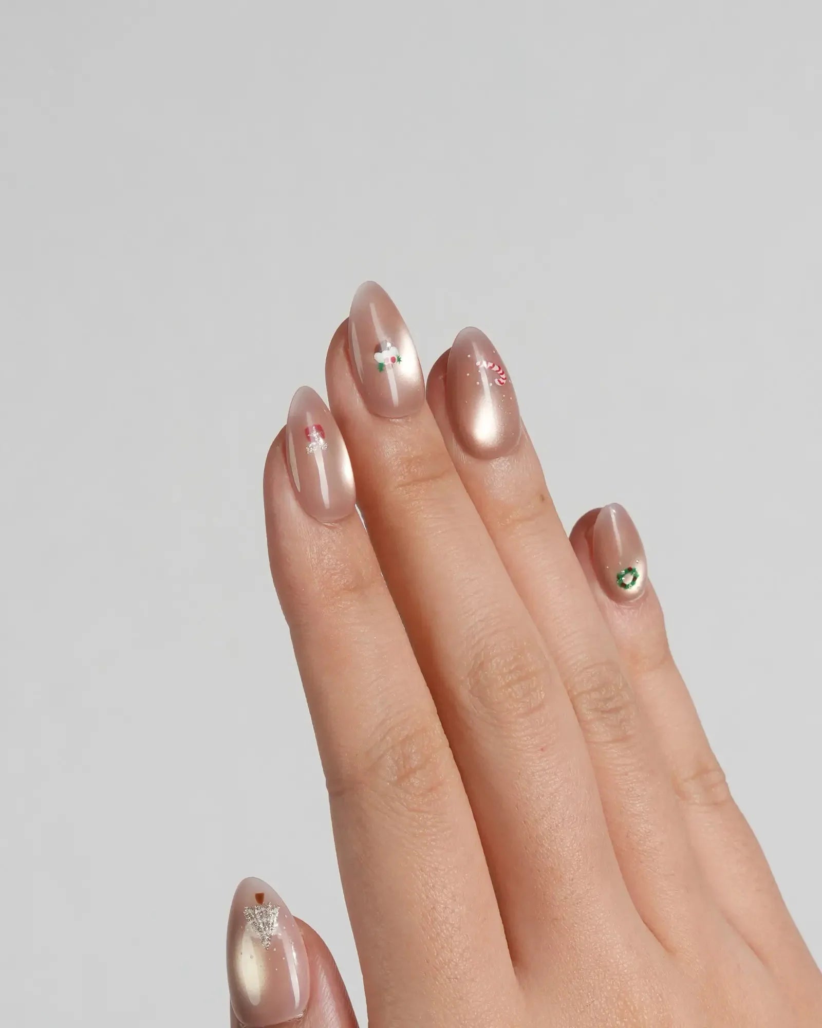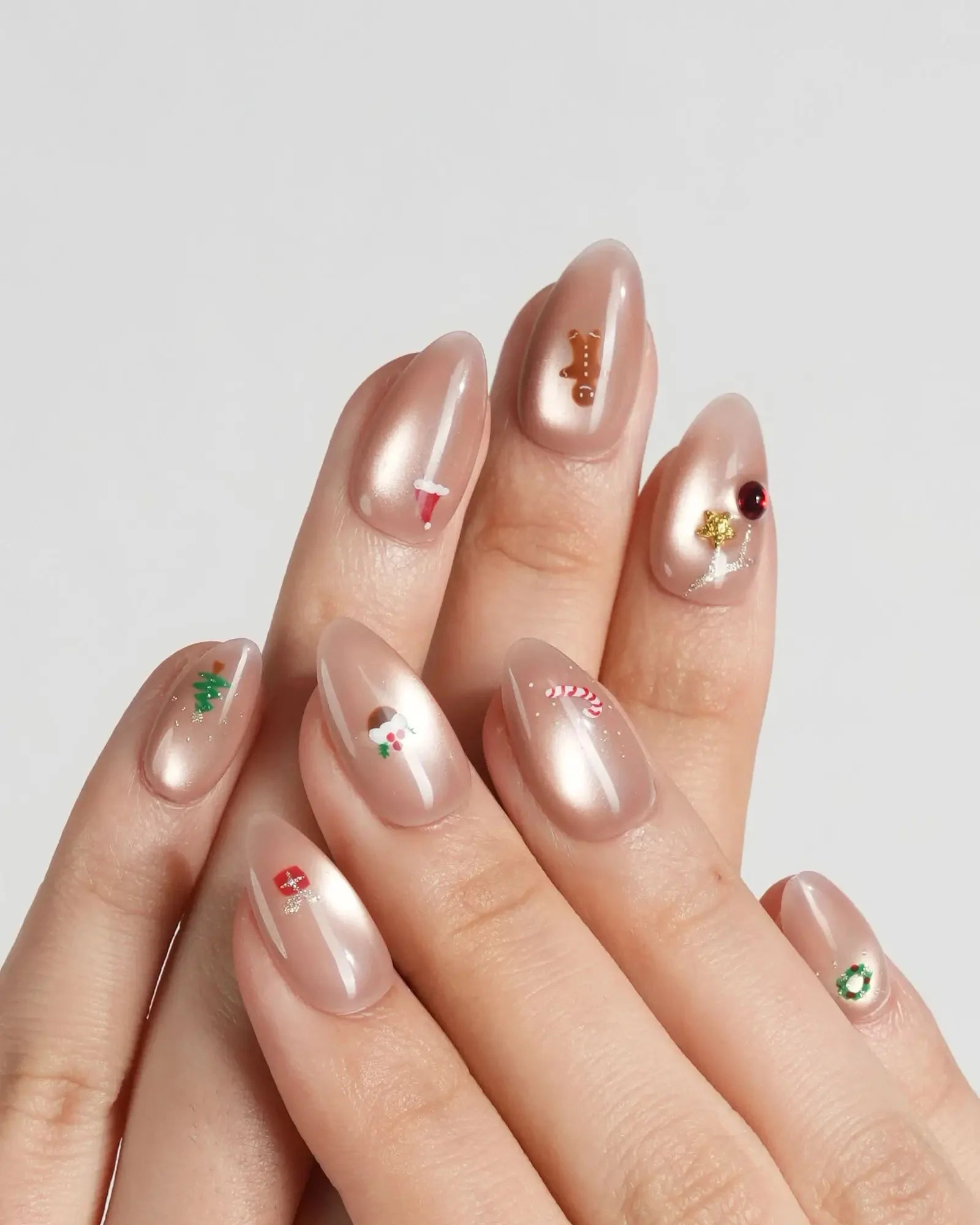 These nude Christmas nails feature a soft glossy base with tiny festive icons like Santa, snowman, gingerbread, and candy cane. The subtle cat-eye shimmer adds dimension while keeping a clean, minimalist look—perfect for cozy holidays, winter getaways, and daily wear.