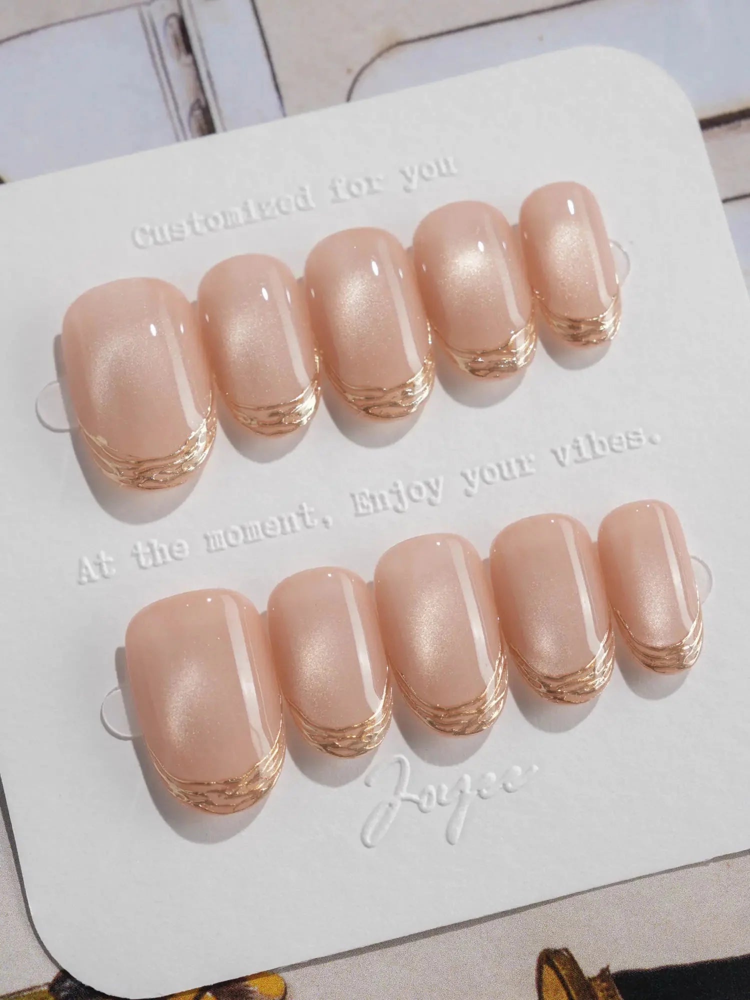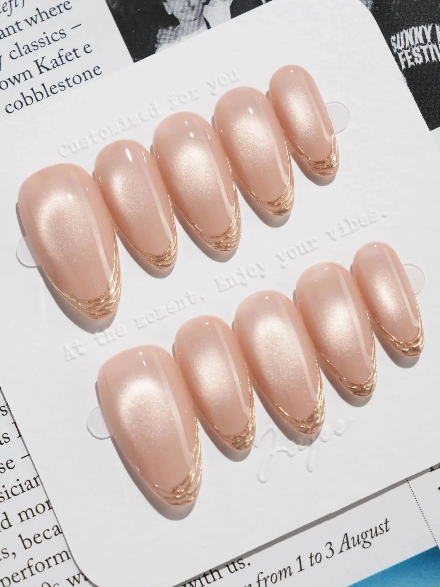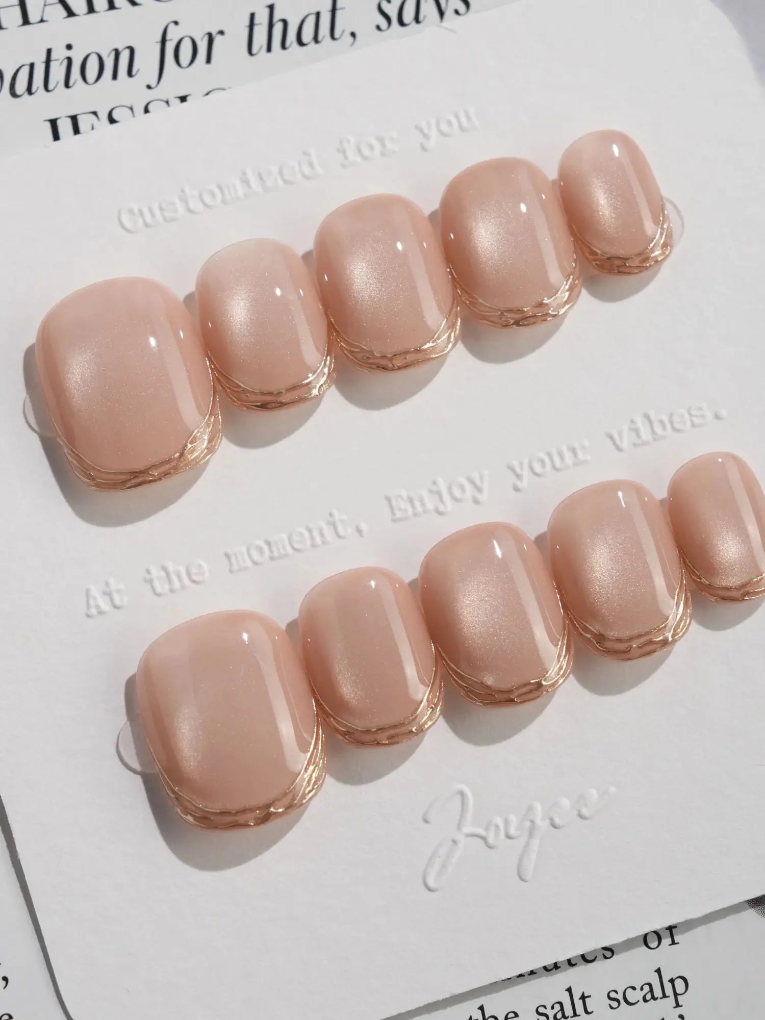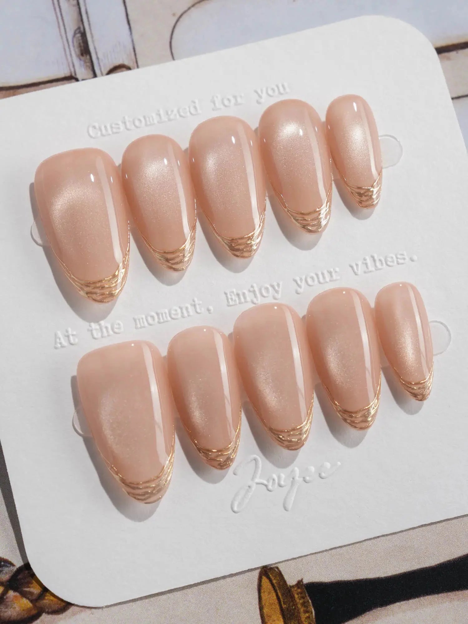 Soft, shimmering, and effortlessly chic — this nude cat eye set is a modern take on French elegance. The delicate gold-lined tips add a subtle touch of glam, while the pearlescent finish brings that salon-perfect glow. Perfect for weddings, workdays, or whenever you want to feel a little fancy.