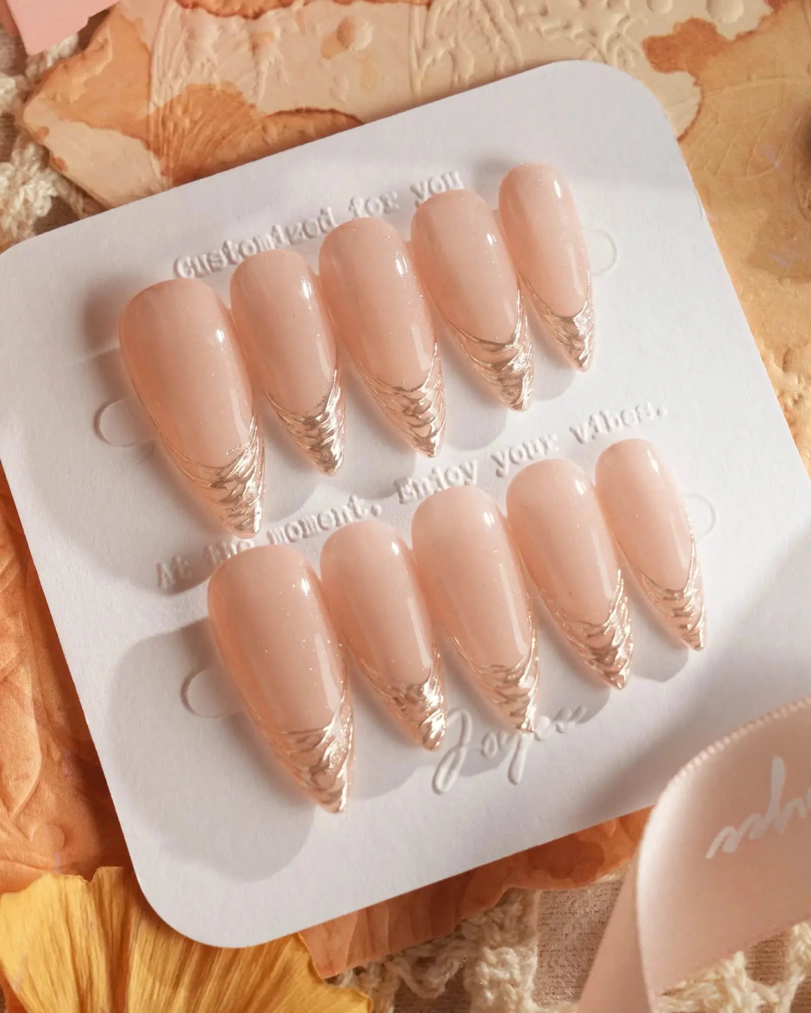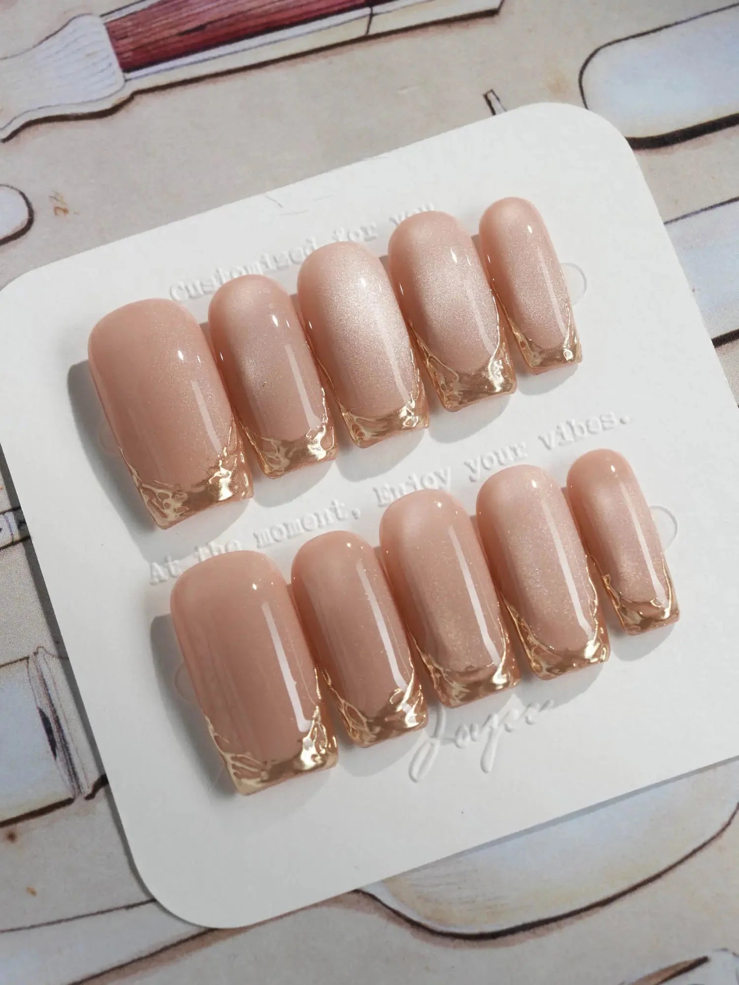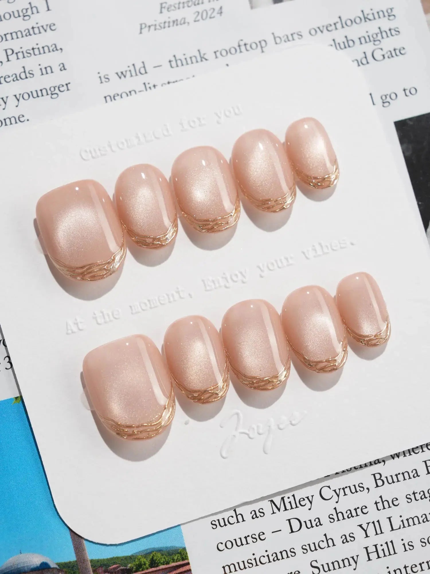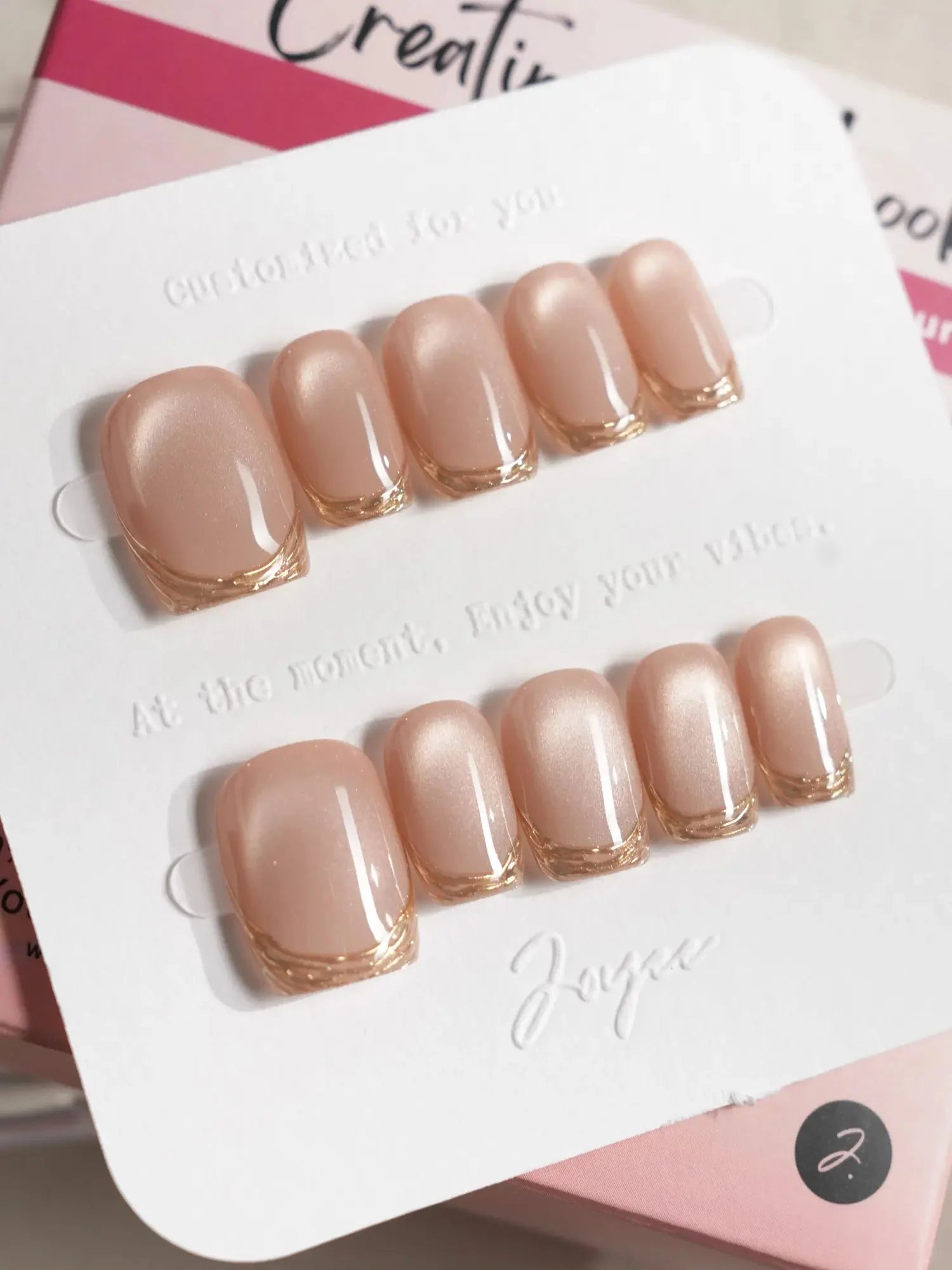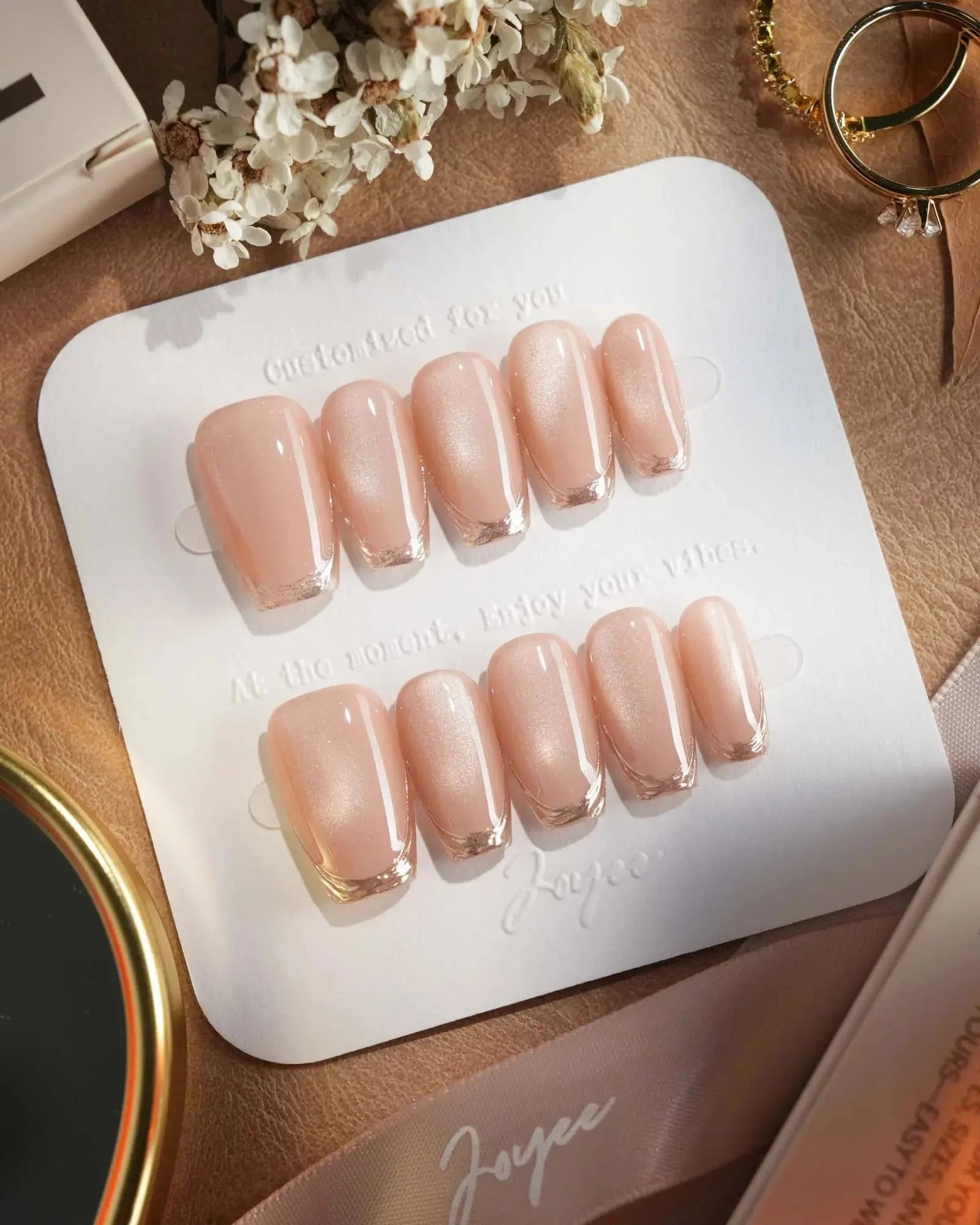 Soft, shimmering, and effortlessly chic — this nude cat eye set is a modern take on French elegance. The delicate gold-lined tips add a subtle touch of glam, while the pearlescent finish brings that salon-perfect glow. Perfect for weddings, workdays, or whenever you want to feel a little fancy.