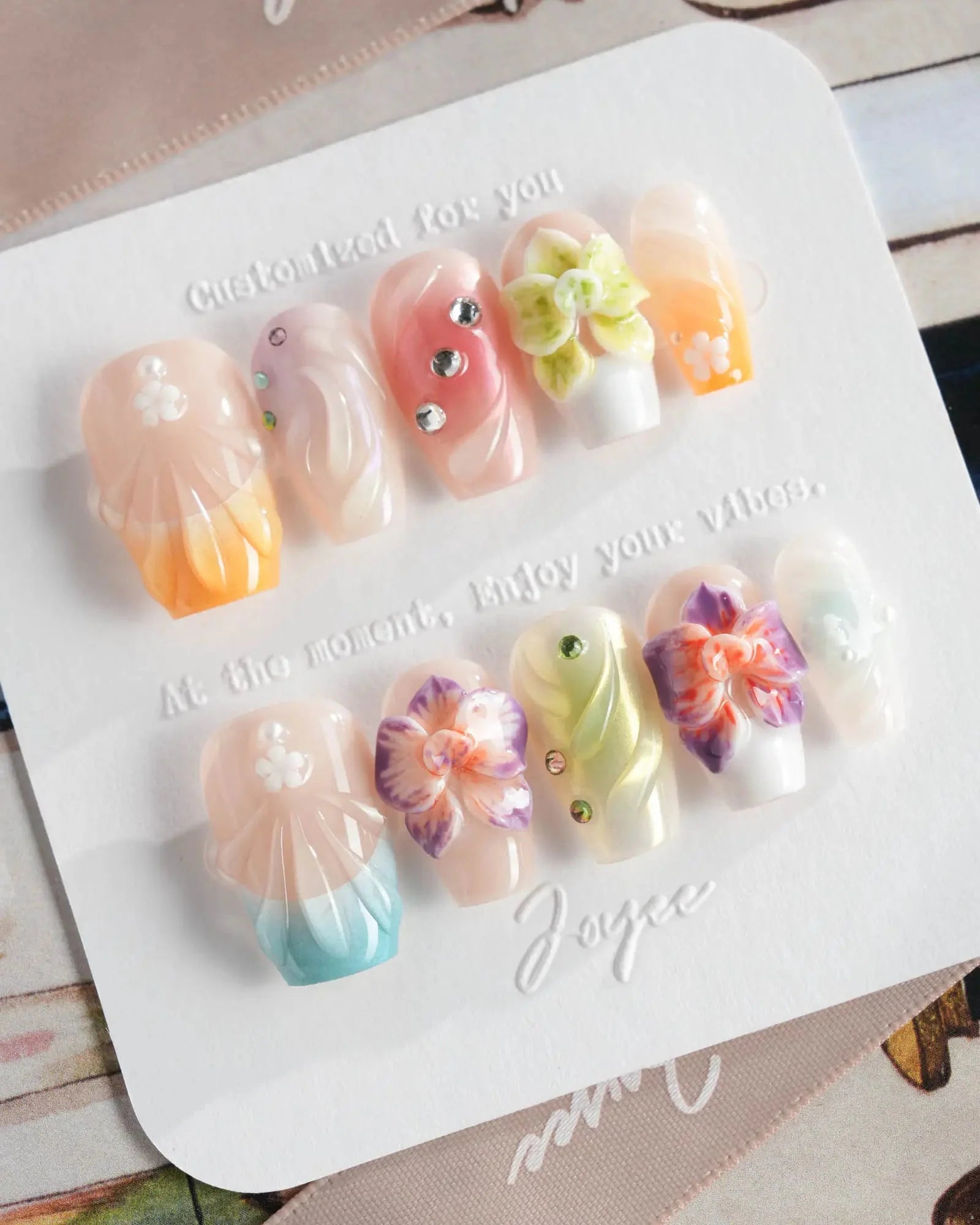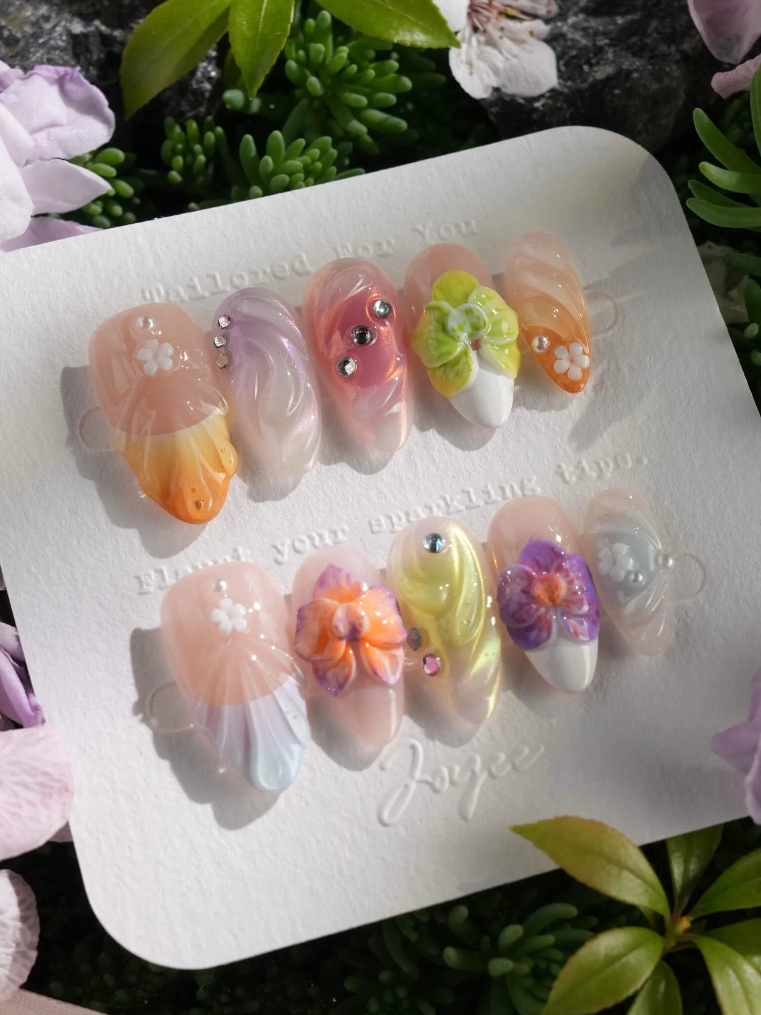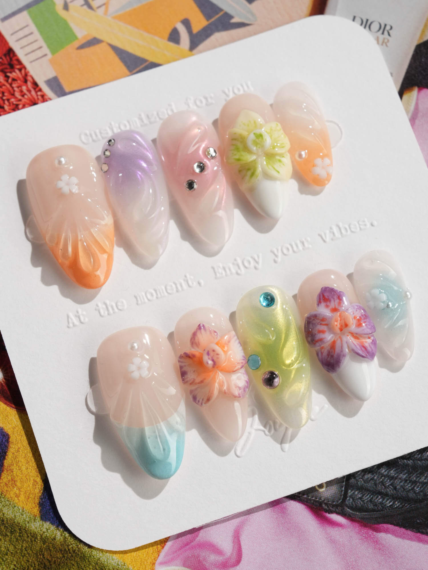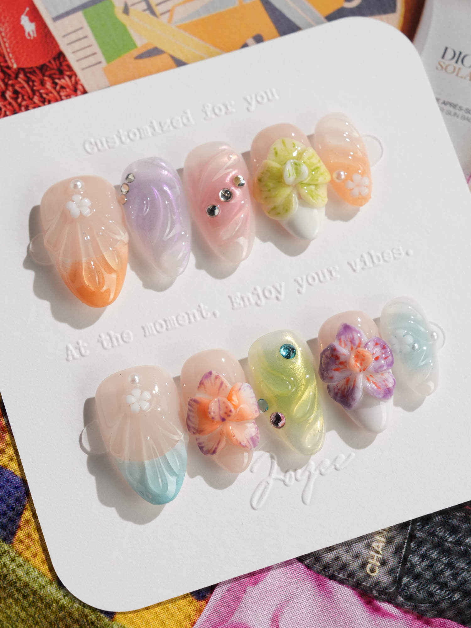 This sculpted orchid nail set captures the elegance and softness of blooming petals. Each flower is carefully handcrafted in layers of jelly-like gel, set against a translucent base with luminous glow and ripple textures. Pops of pastel, dew-like shine, and crystal accents bring the orchid garden to life—right at your fingertips. One-of-a-kind, wearable floral art.