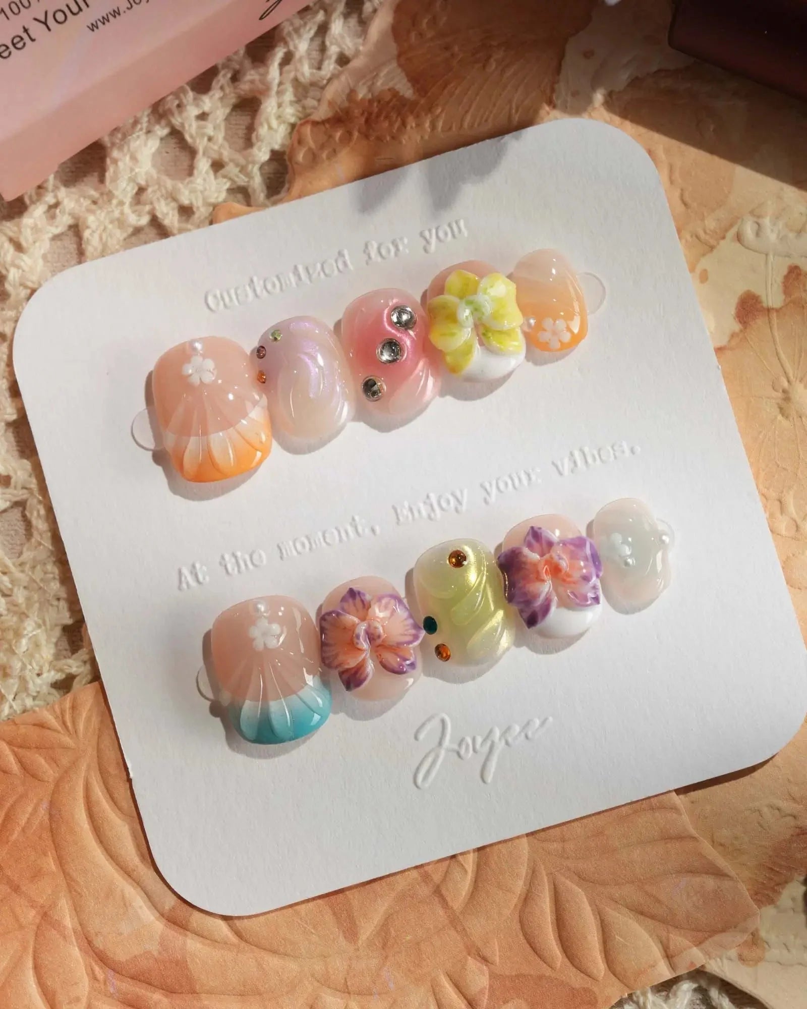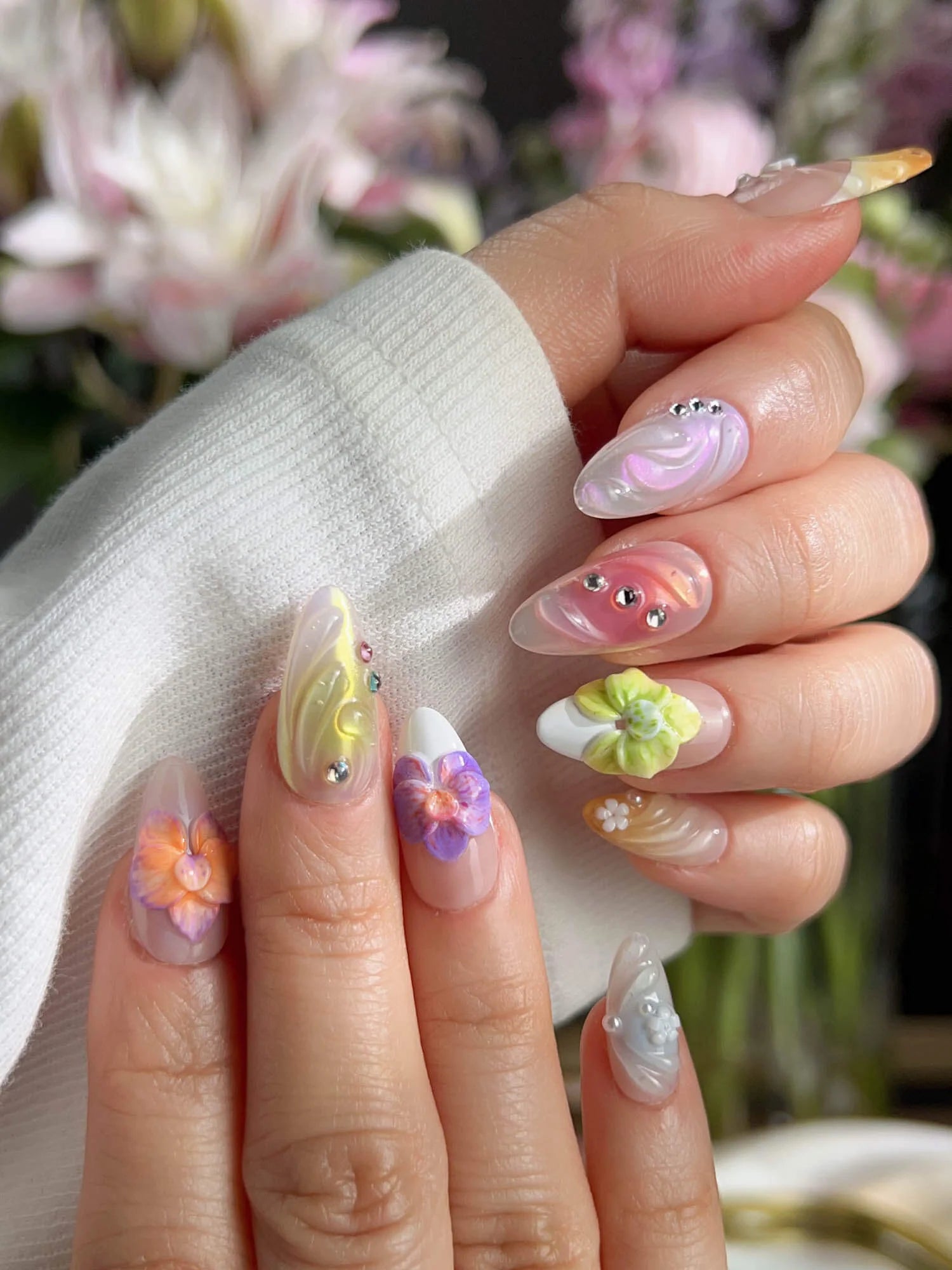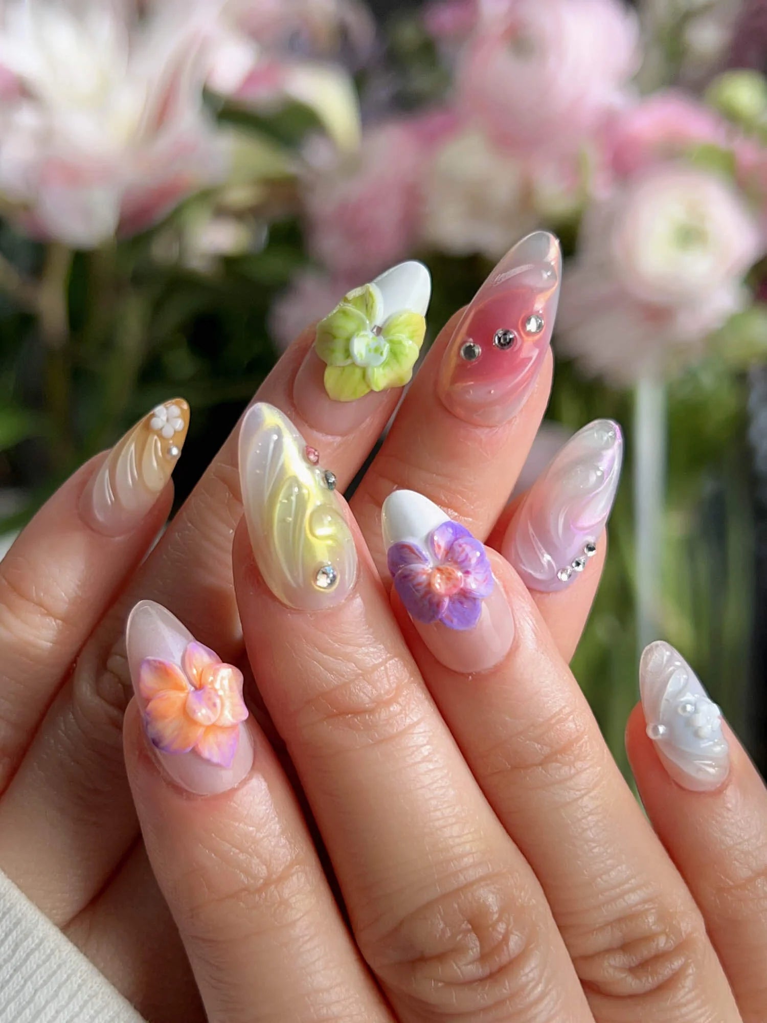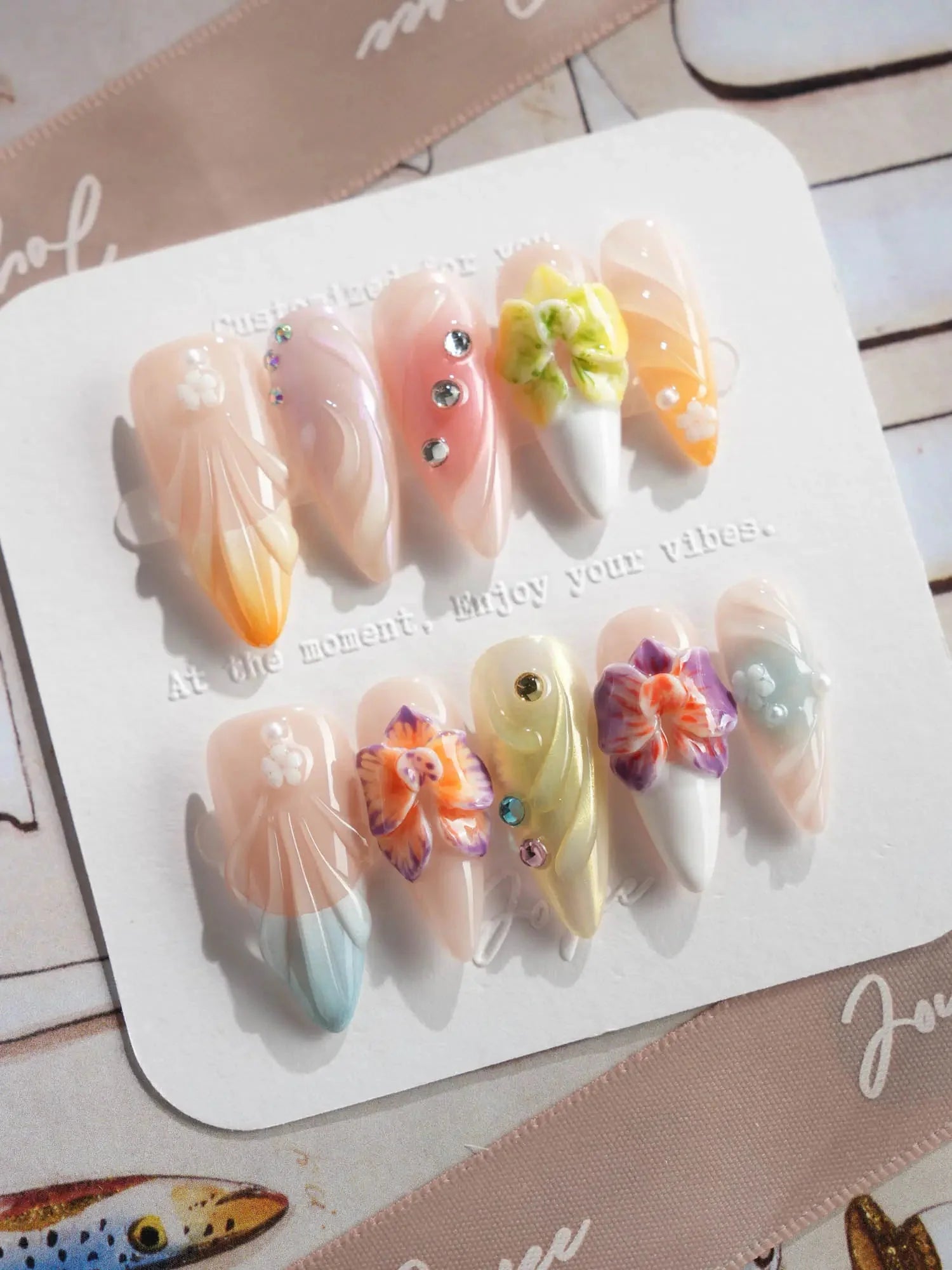 This sculpted orchid nail set captures the elegance and softness of blooming petals. Each flower is carefully handcrafted in layers of jelly-like gel, set against a translucent base with luminous glow and ripple textures. Pops of pastel, dew-like shine, and crystal accents bring the orchid garden to life—right at your fingertips. One-of-a-kind, wearable floral art.
