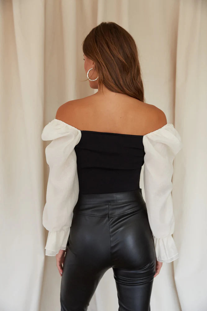 Hey babe, get ready for date night in the Paris Chiffon Puff Sleeve Contrast Top! This crop top features a black knit bodice and double-lined, cream chiffon puff sleeves with ruffle cuffs. Style the romantic sleeves on or off the shoulder. Pair with the Suzie Panel Flare Pants for a stunning going out look!