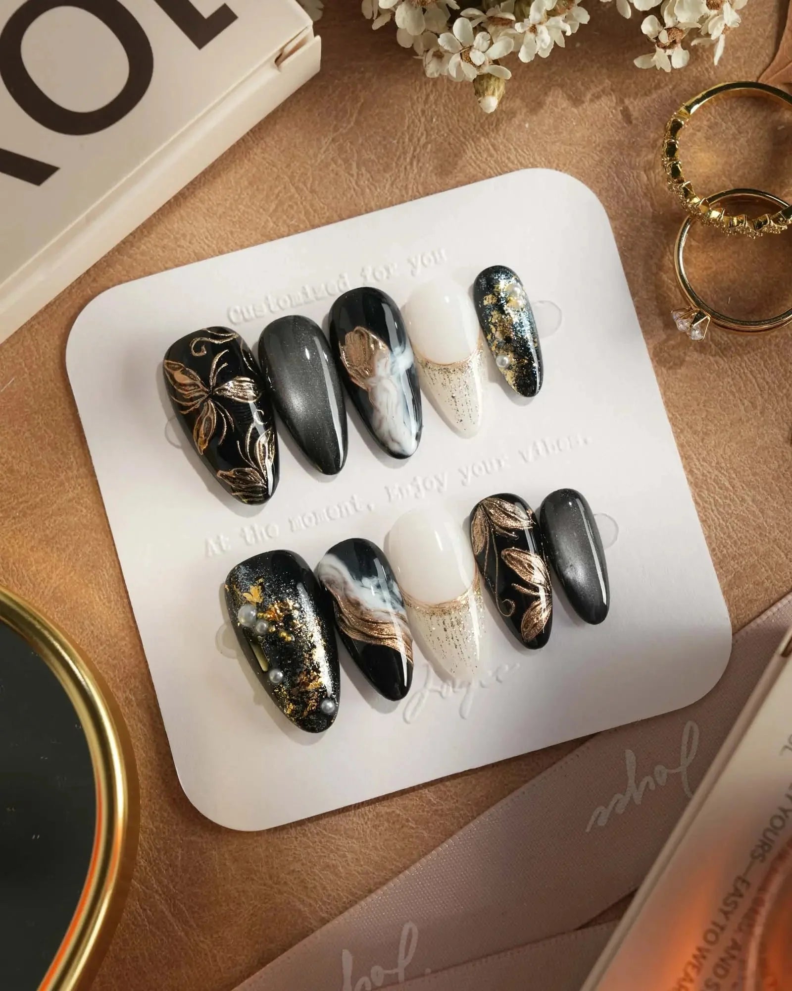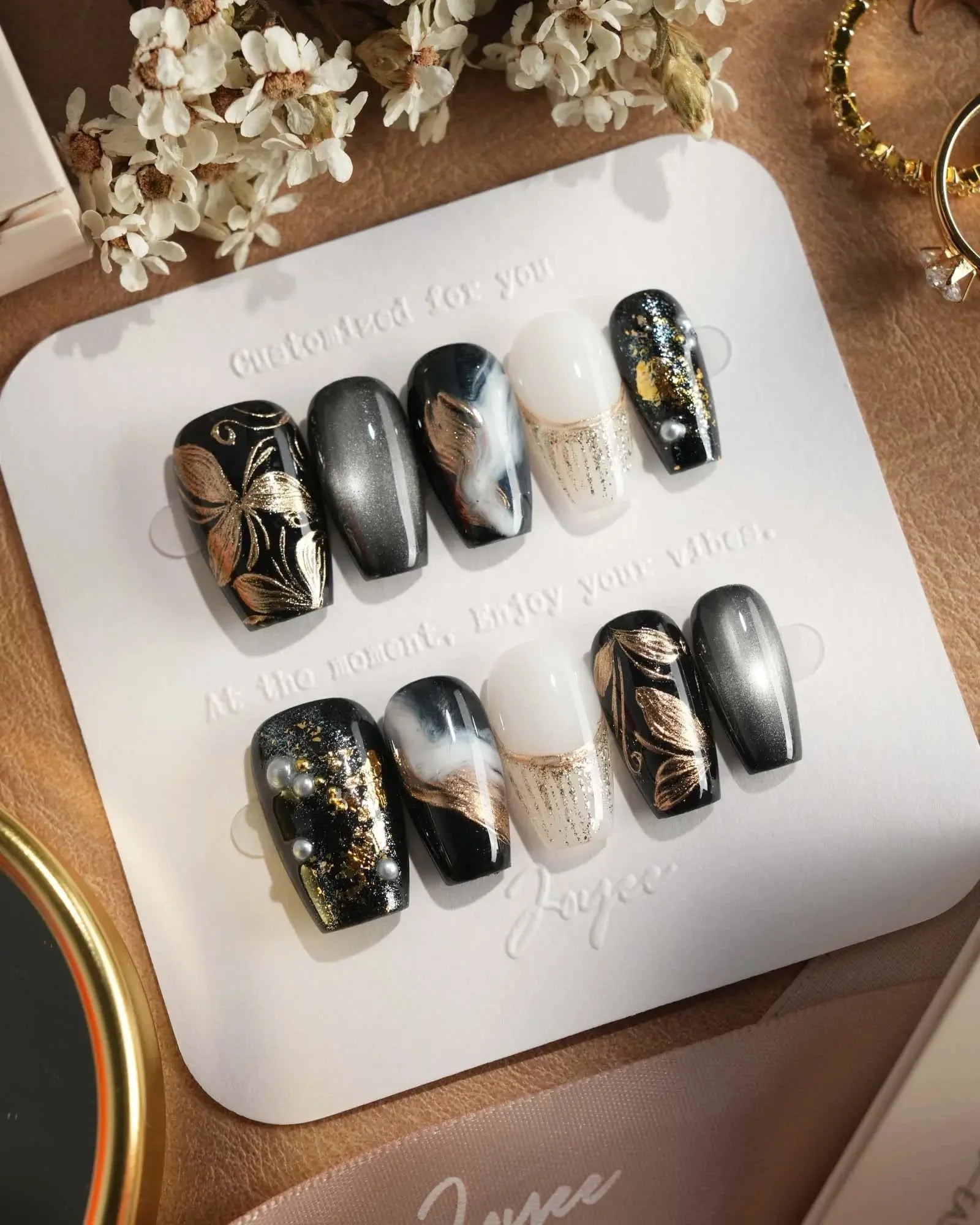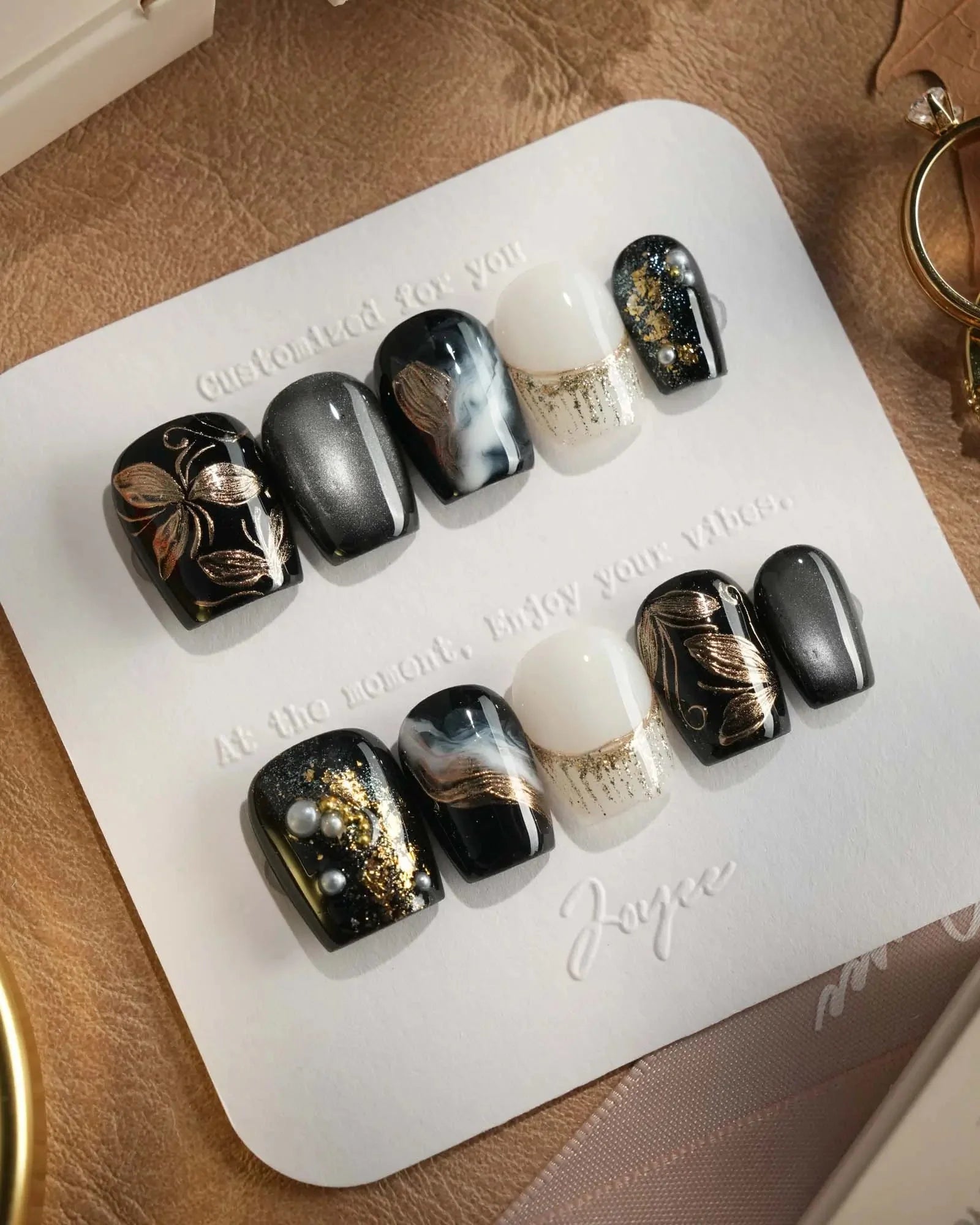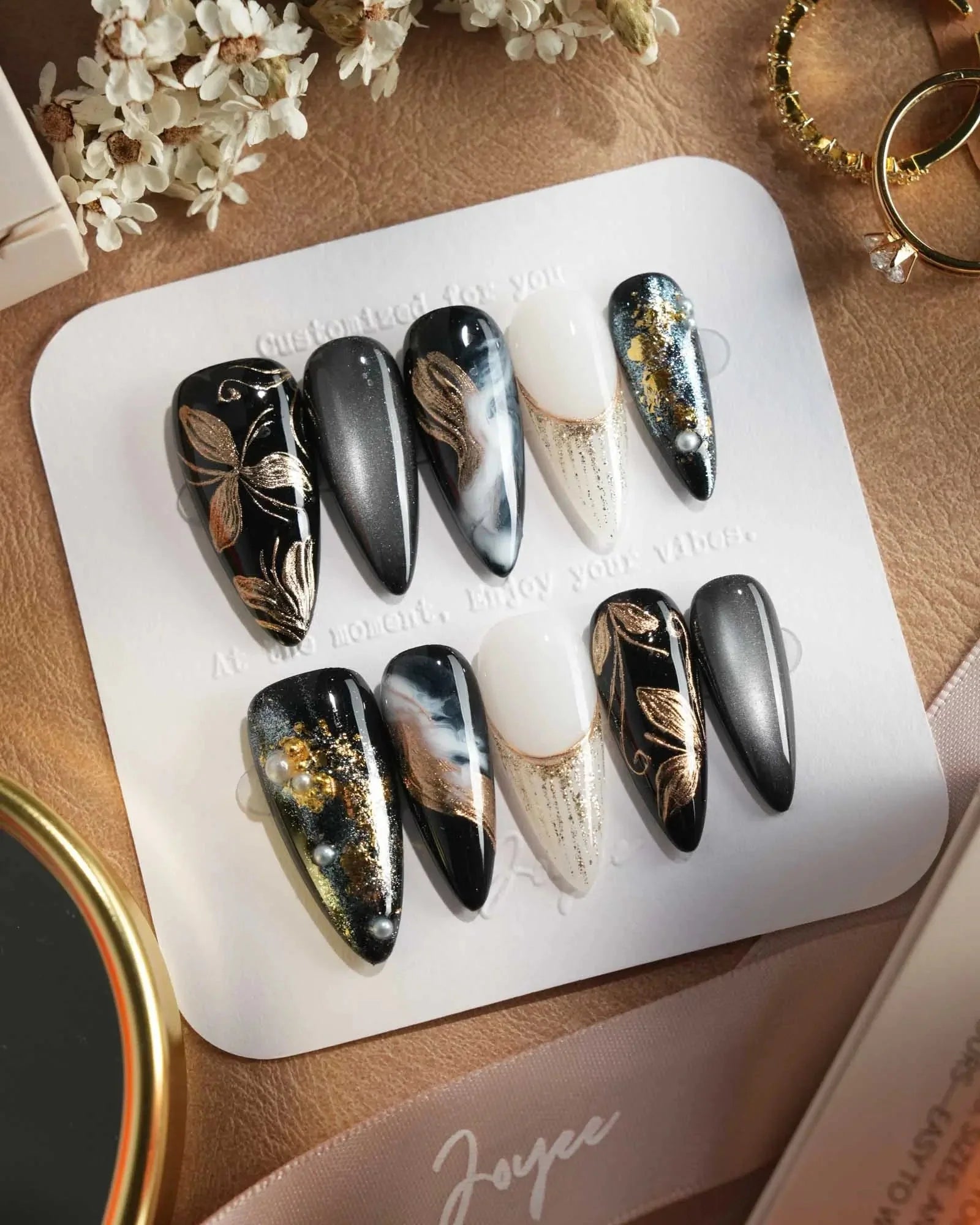 Dark cat-eye hues layered with gold veins and abstract blossoms. The flowers are not innocent—they shimmer with danger, beauty, and hidden temptation.