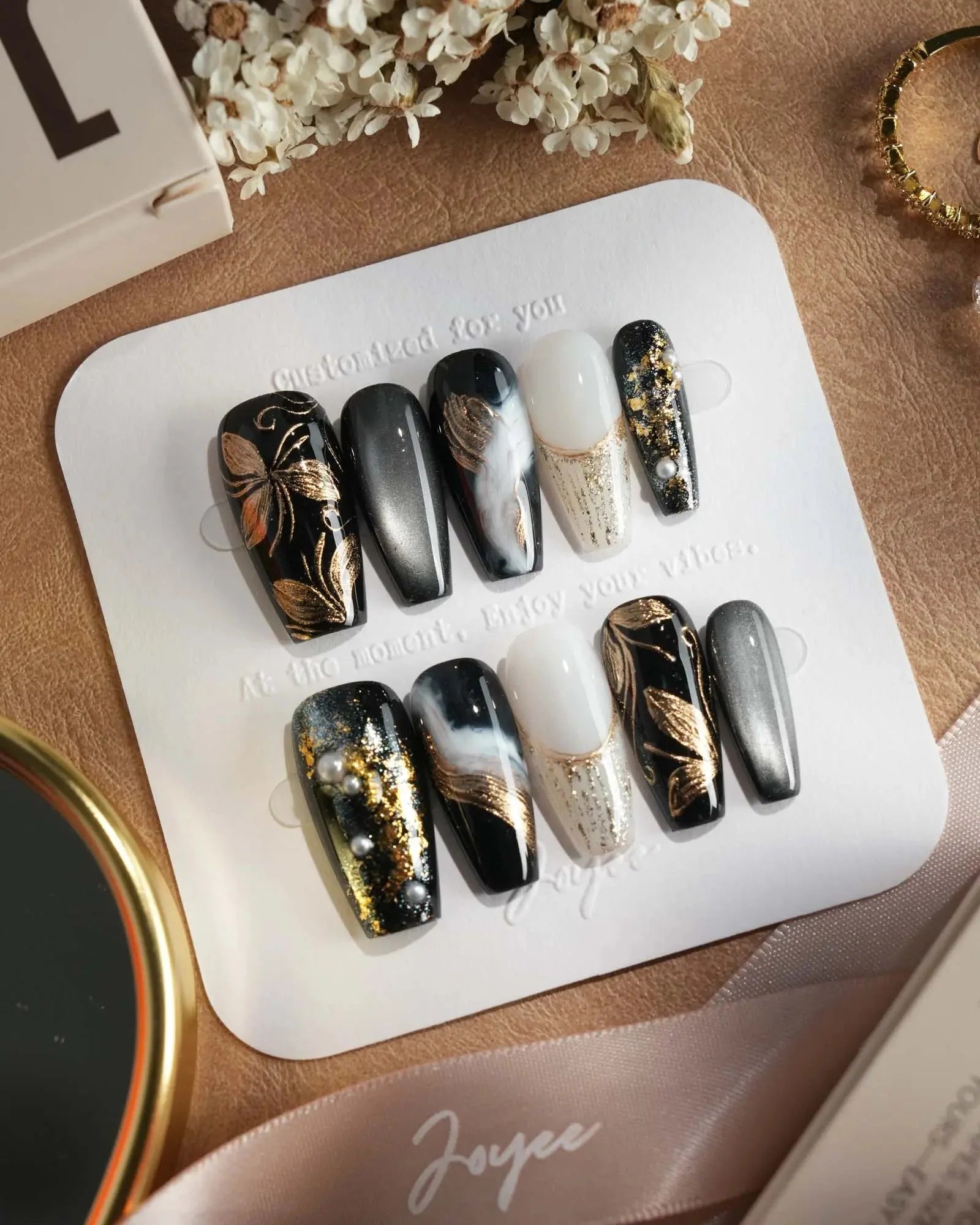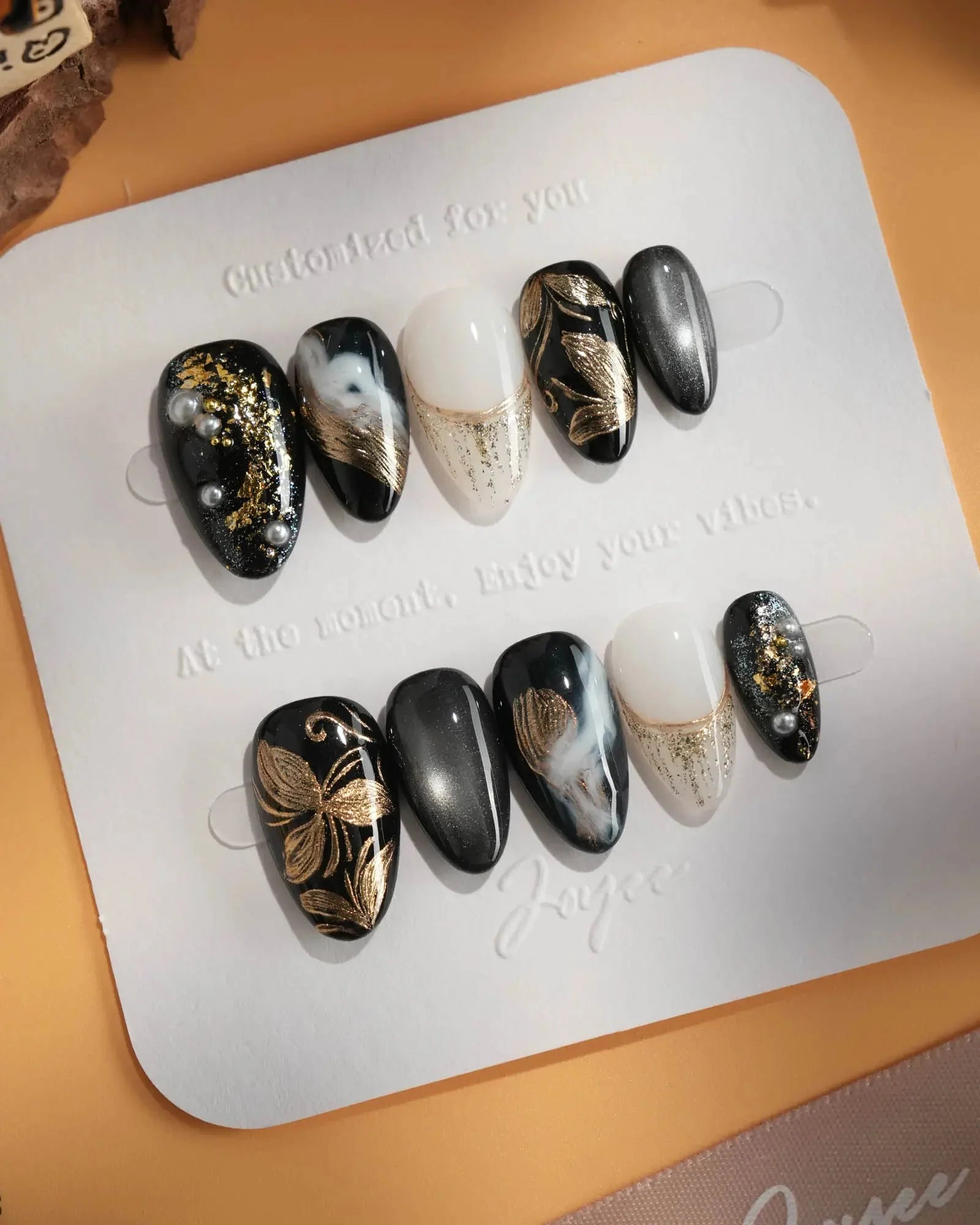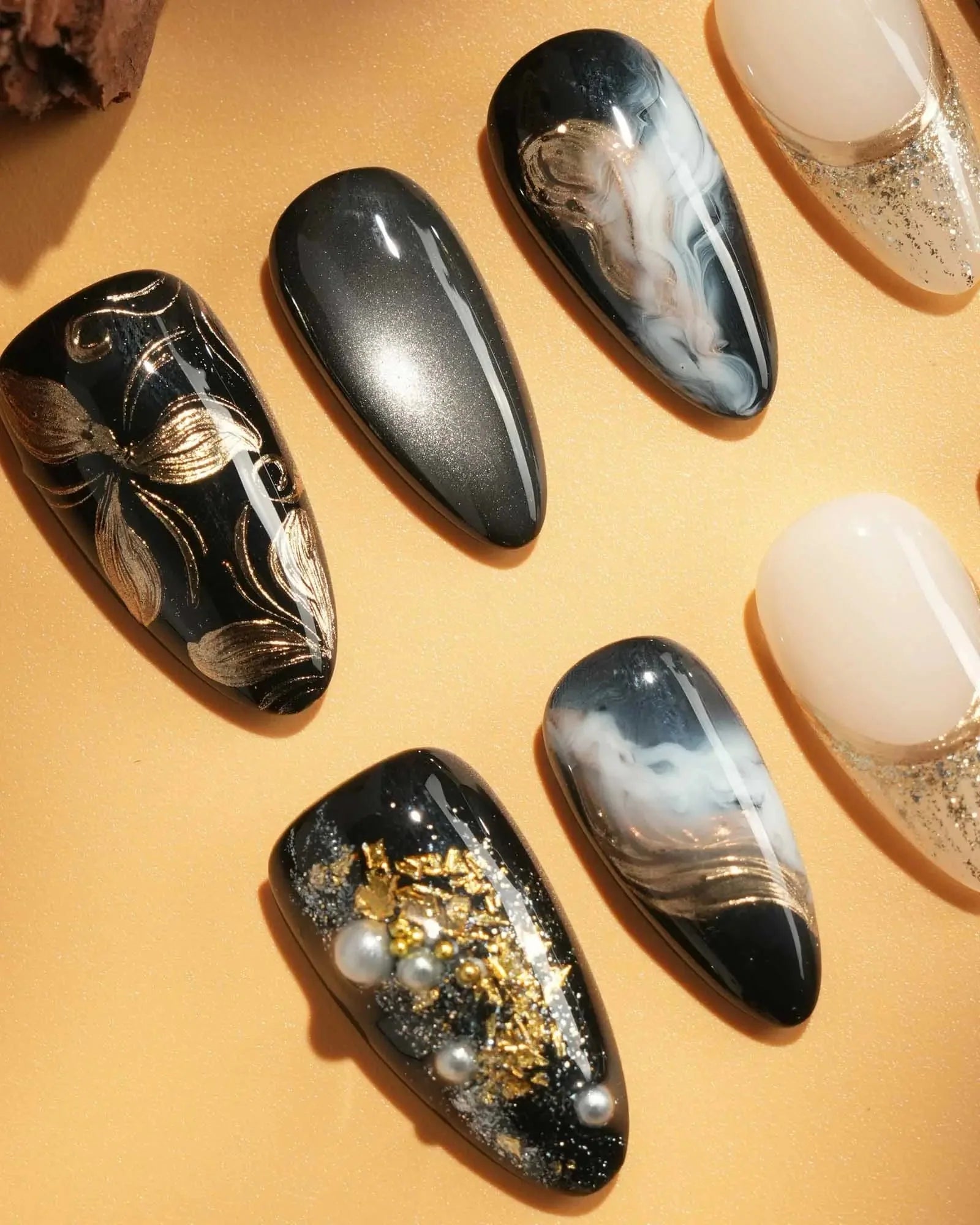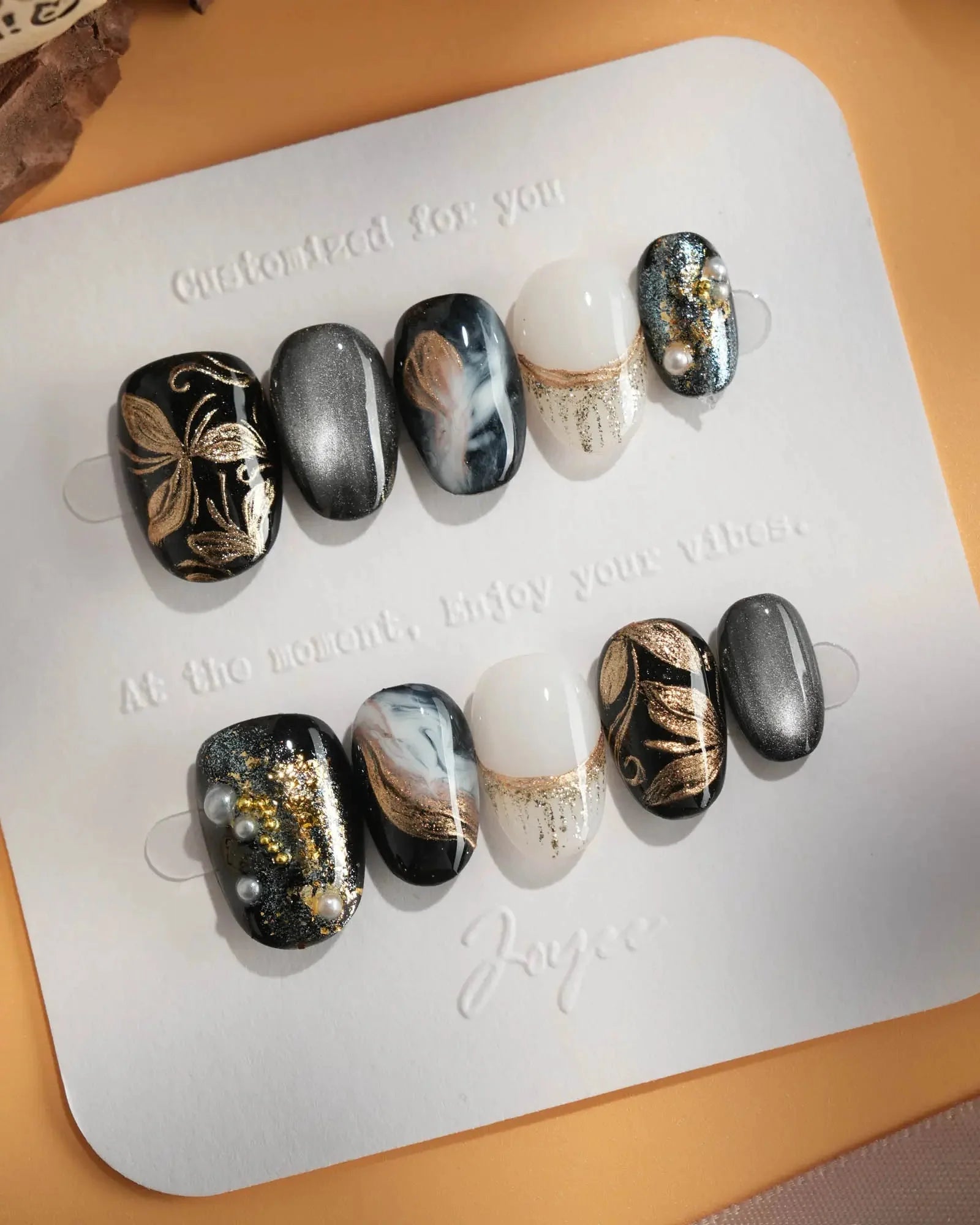 Dark cat-eye hues layered with gold veins and abstract blossoms. The flowers are not innocent—they shimmer with danger, beauty, and hidden temptation.