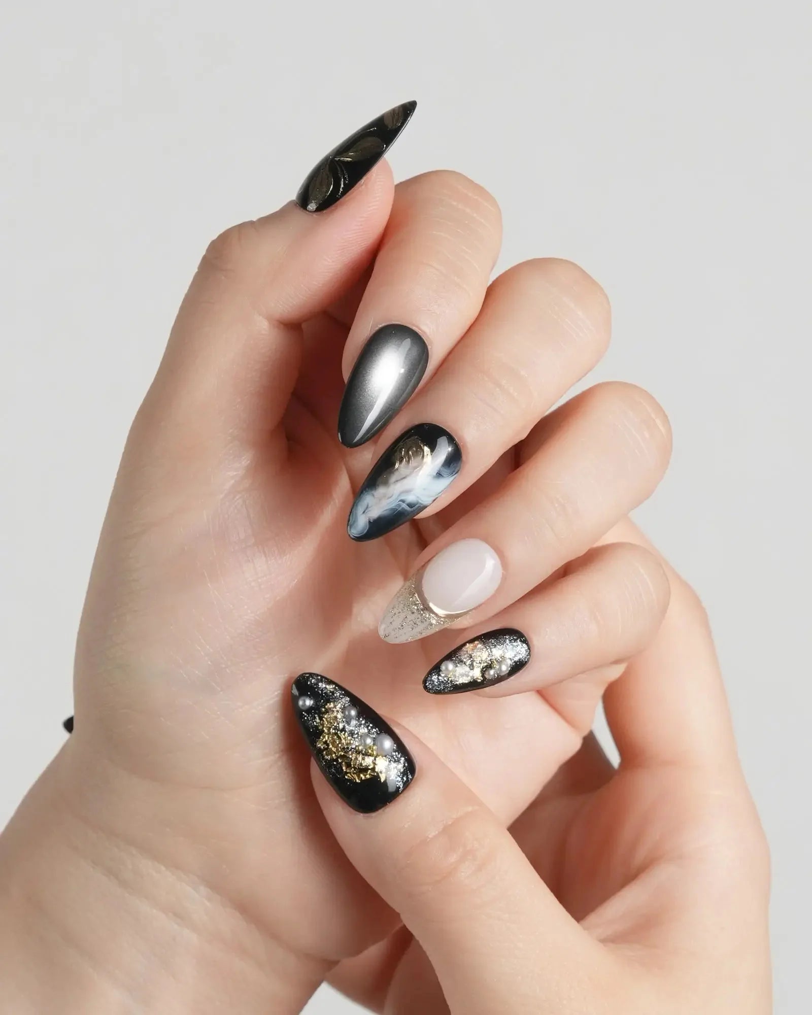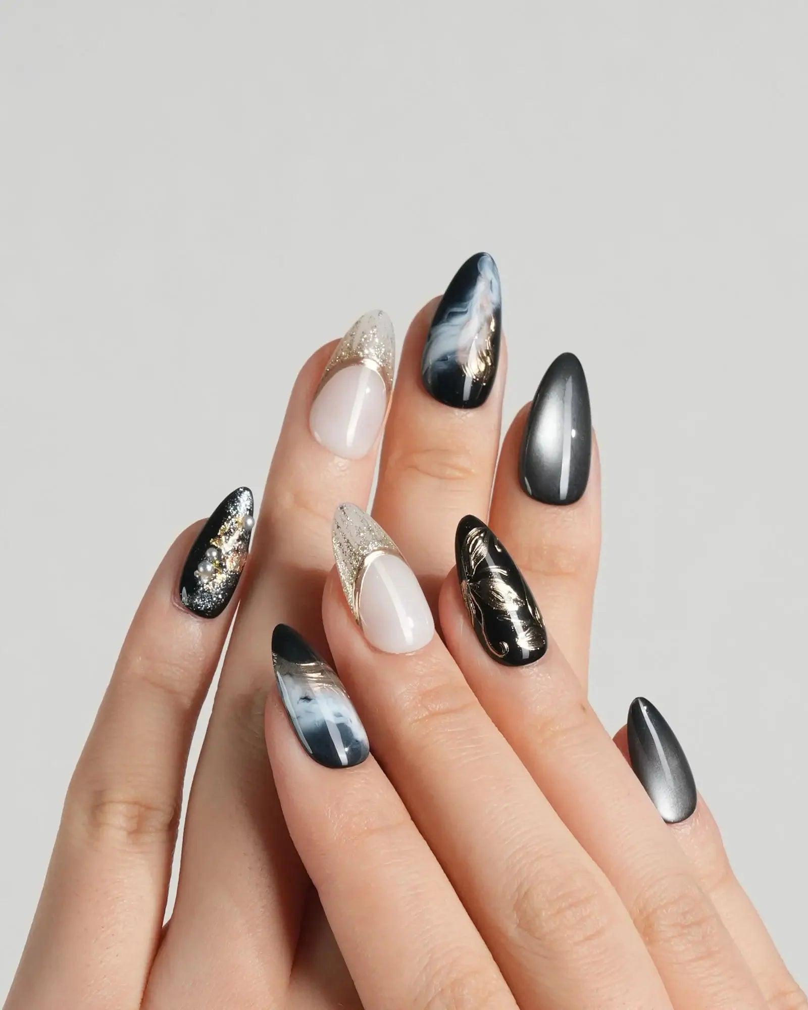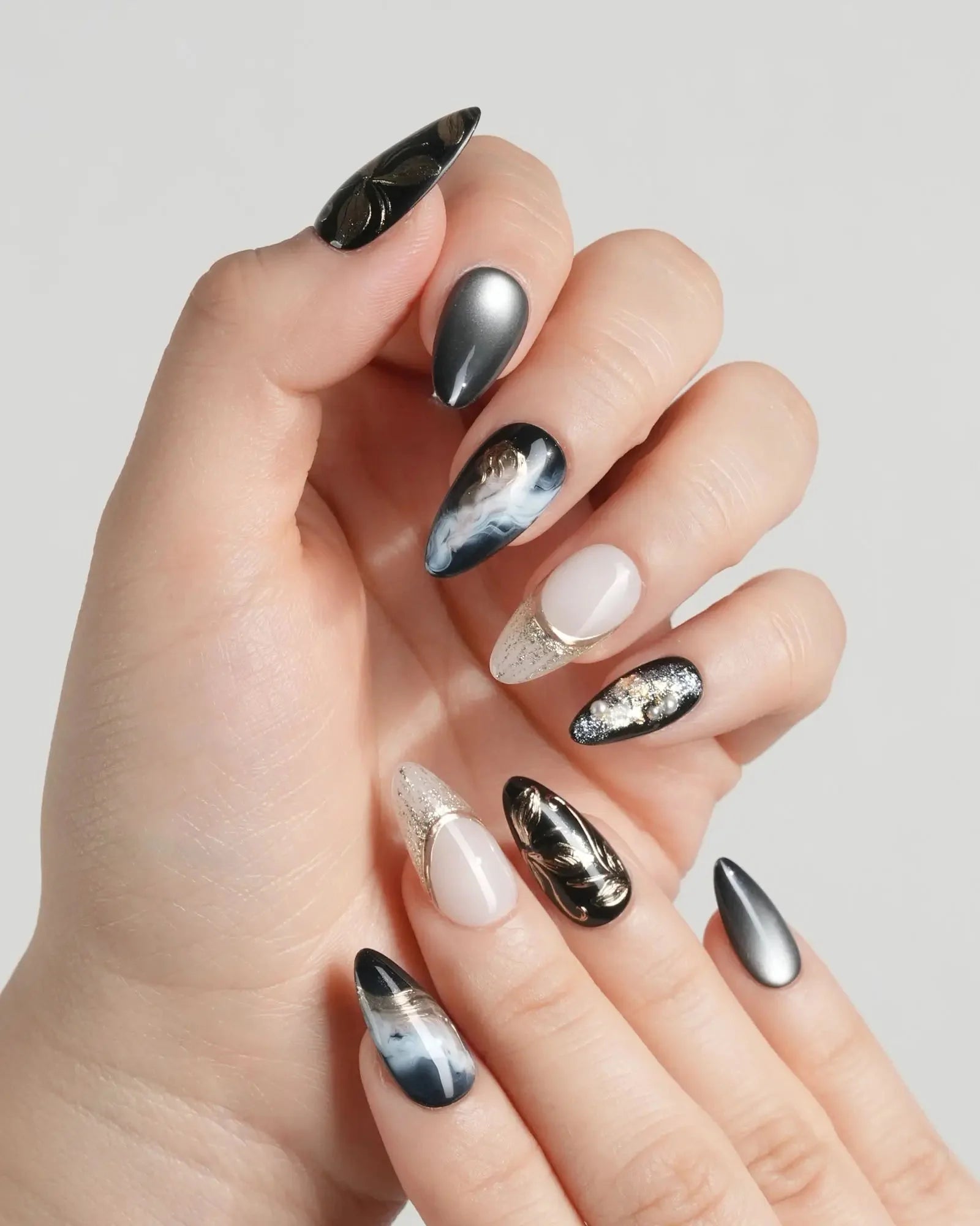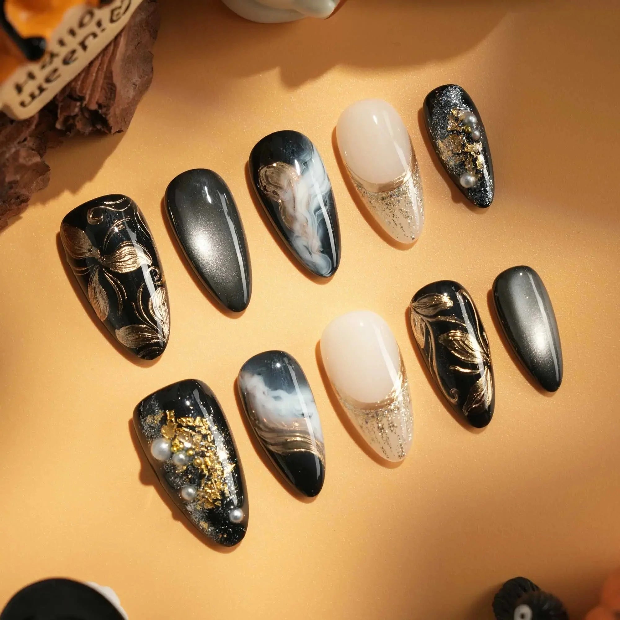 Dark cat-eye hues layered with gold veins and abstract blossoms. The flowers are not innocent—they shimmer with danger, beauty, and hidden temptation.