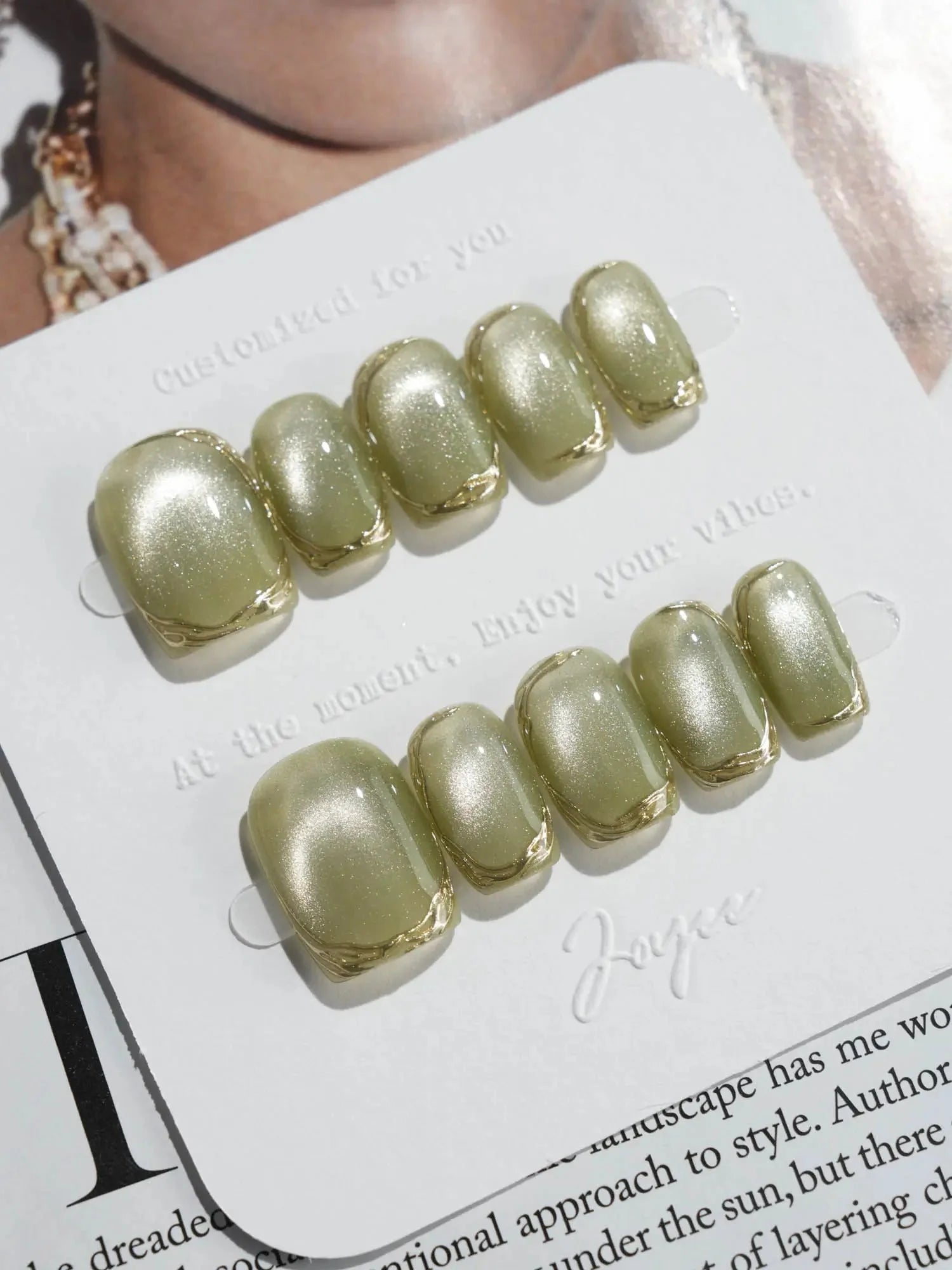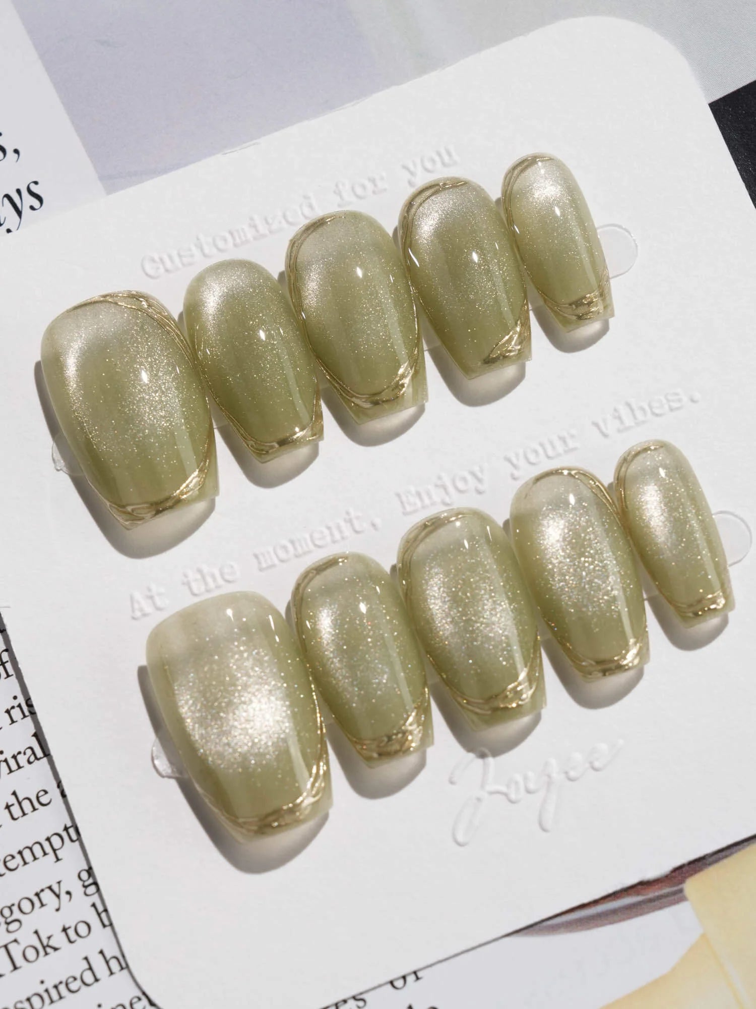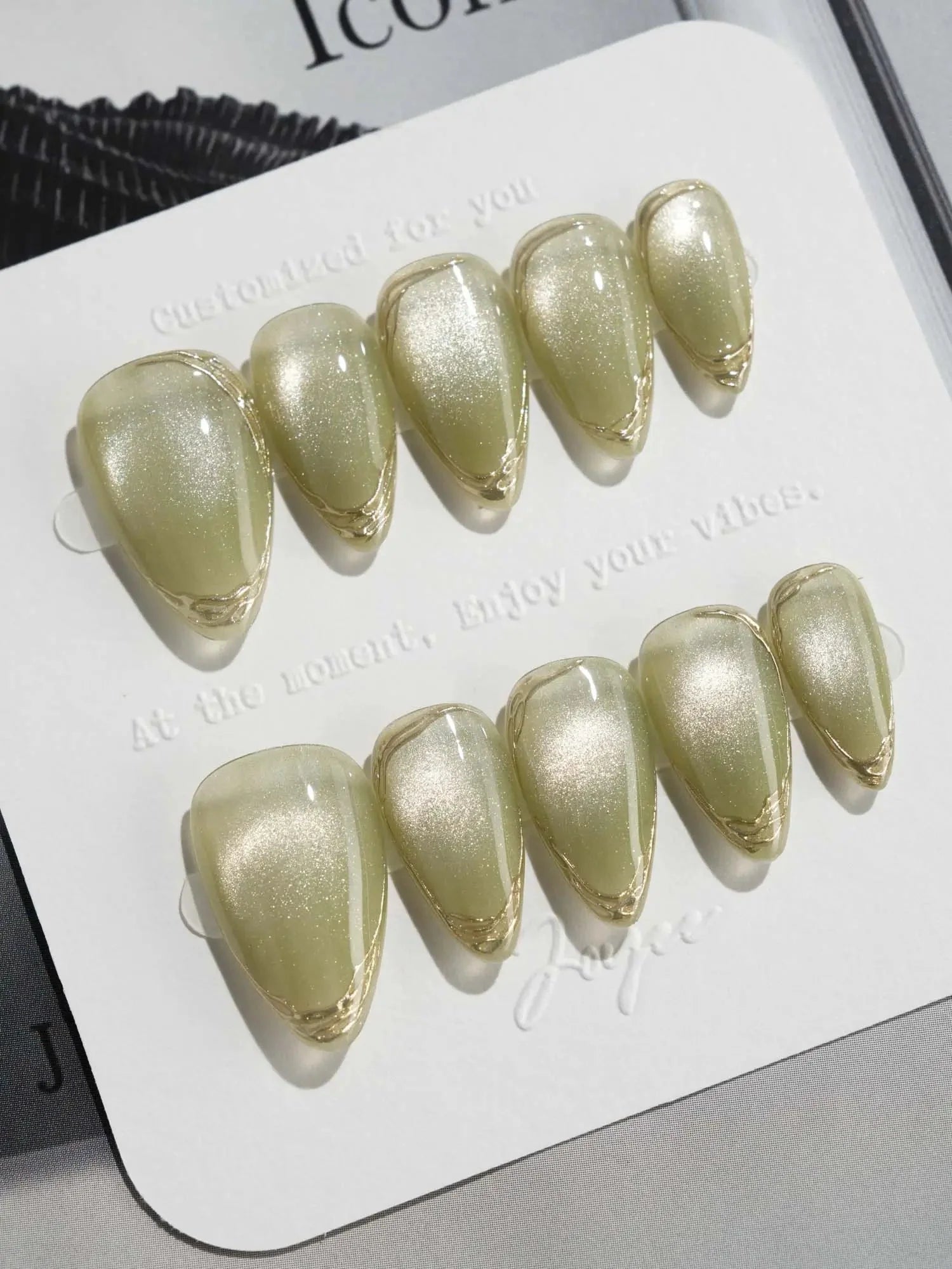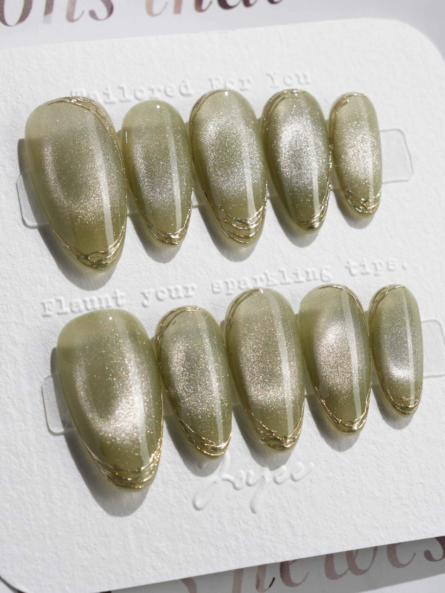 Silver-green cat eye with sunset gold edges. Swipe to activate cosmic shimmer – your portable galaxy for mundane moments.