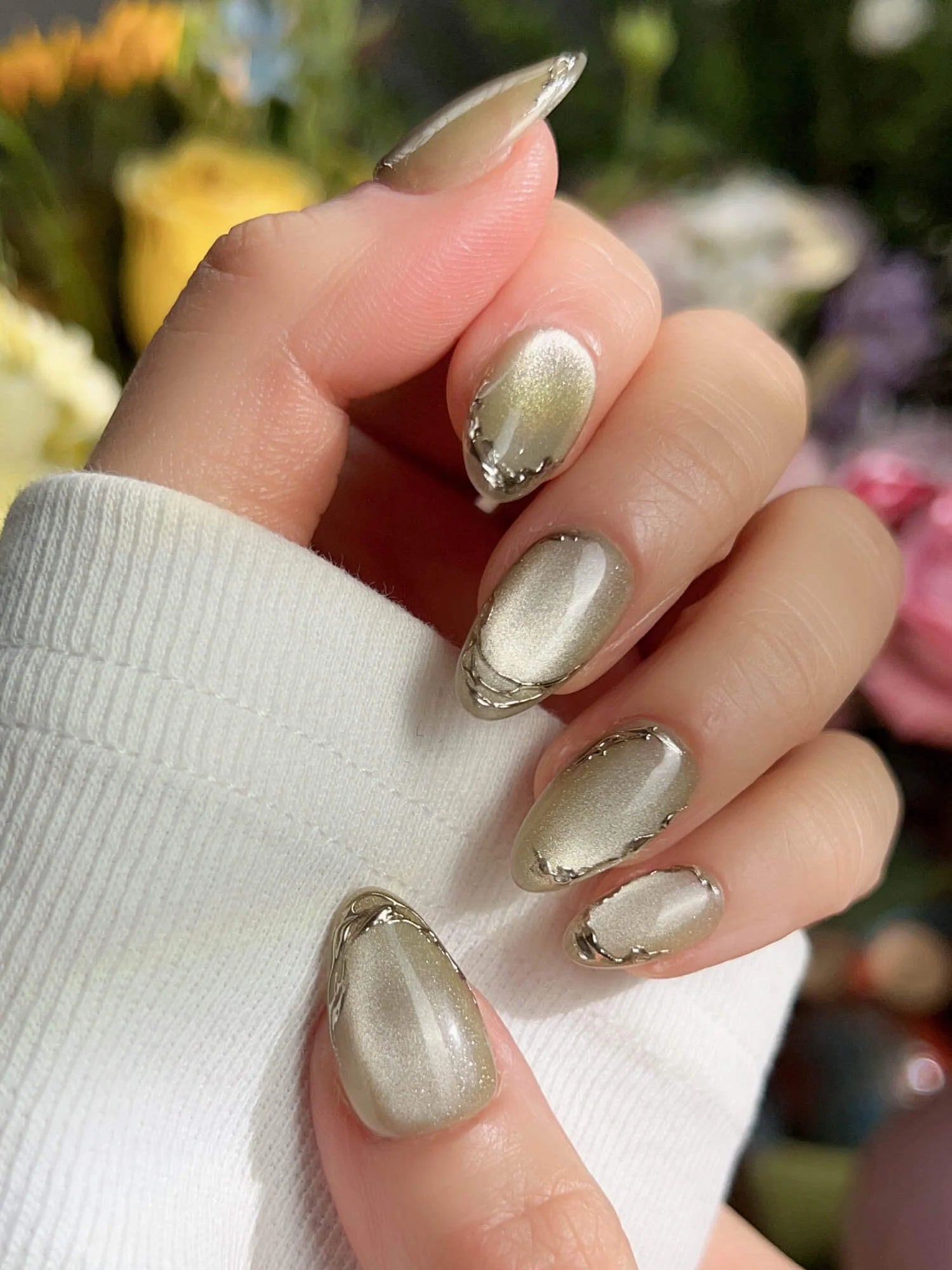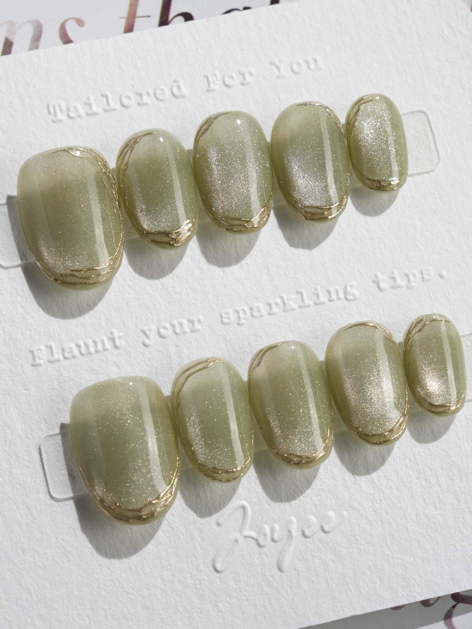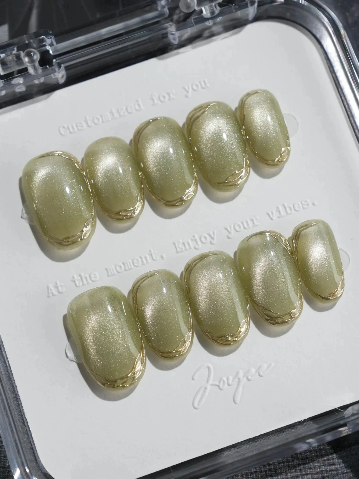 Silver-green cat eye with sunset gold edges. Swipe to activate cosmic shimmer – your portable galaxy for mundane moments.