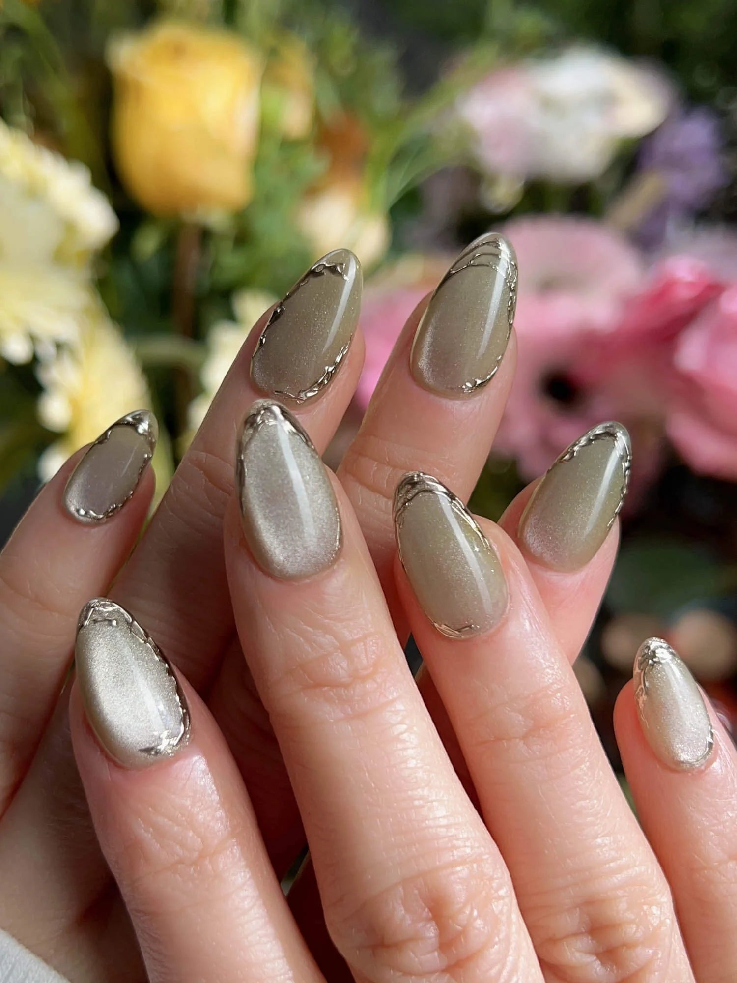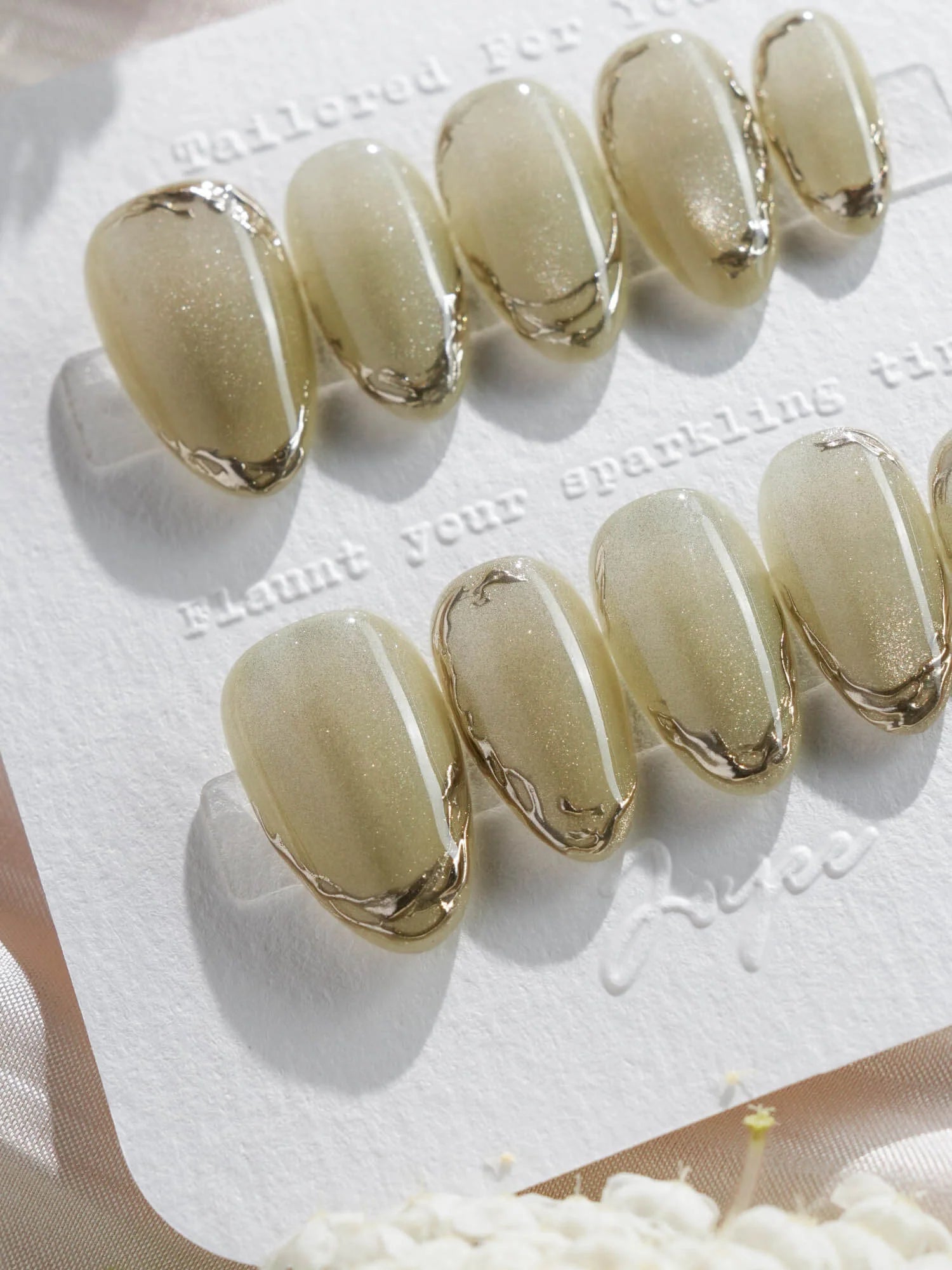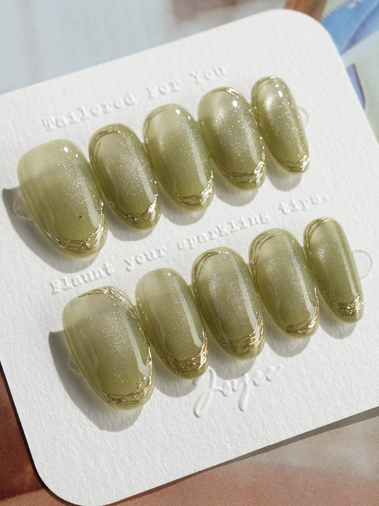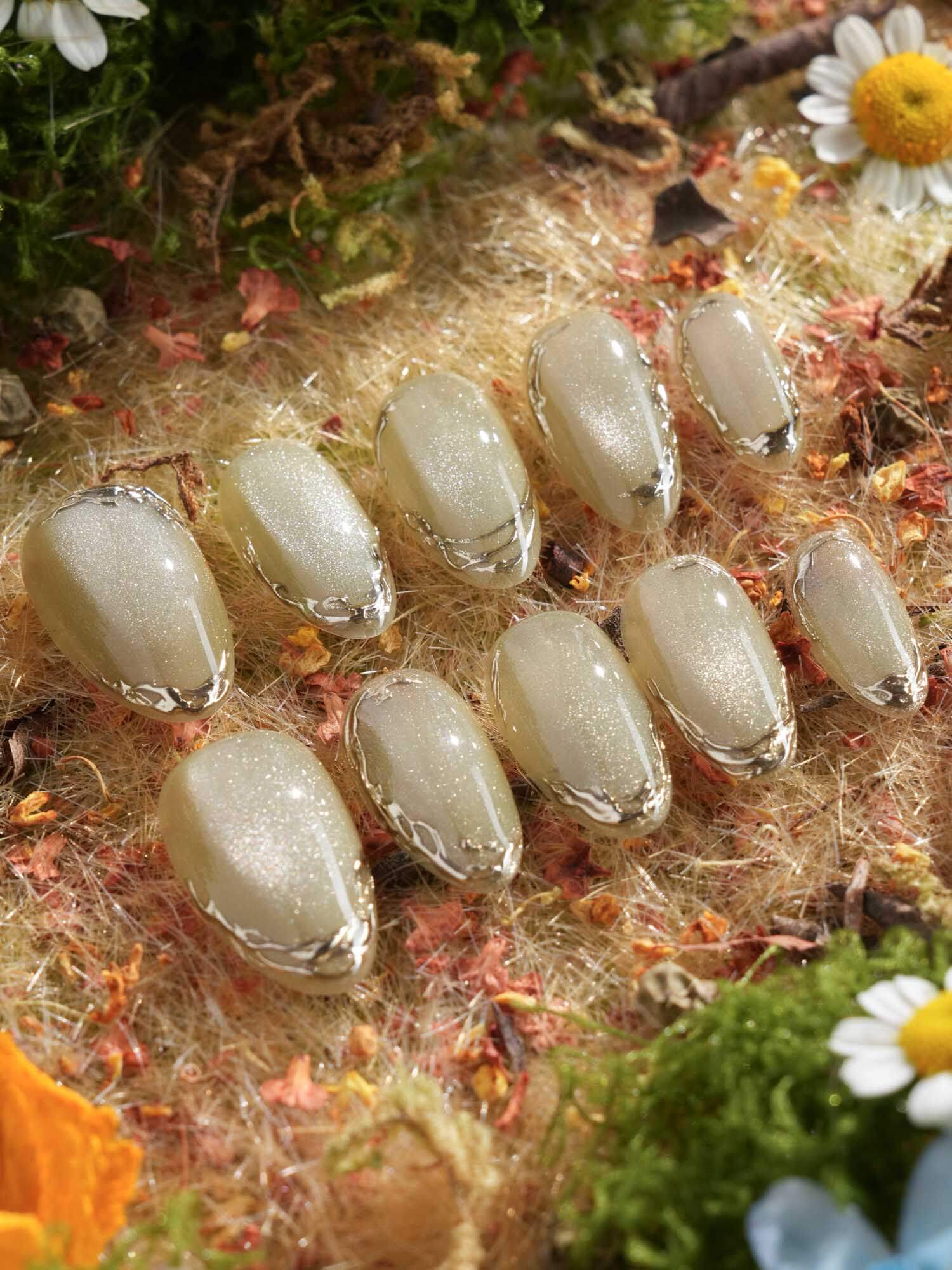 Silver-green cat eye with sunset gold edges. Swipe to activate cosmic shimmer – your portable galaxy for mundane moments.