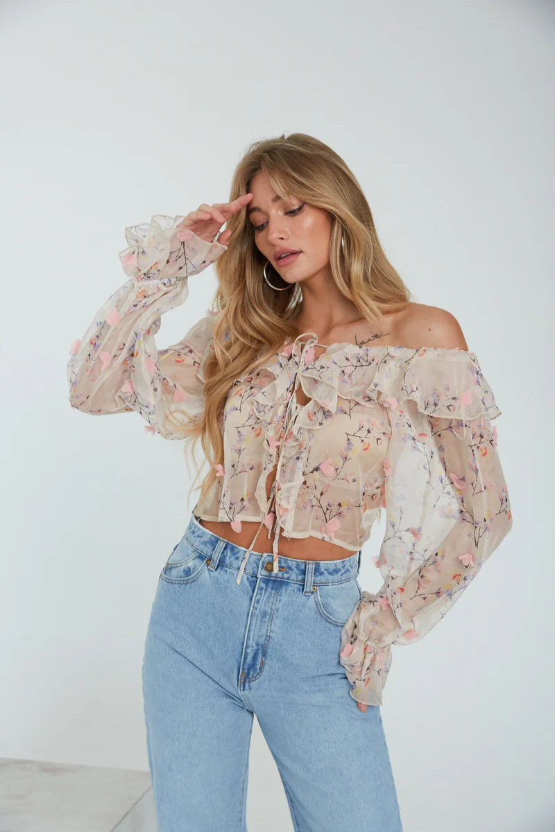 Spring is blooming, and in the Rome Off-The-Shoulder Chiffon Ruffle Top, you'll have a look to match! This stunning blouse features an open front with two adjustable tie details, floral appliqué, and a ruffled-trimmed off-the-shoulder neckline. Pair with your favorite denim to complete this feminine look.