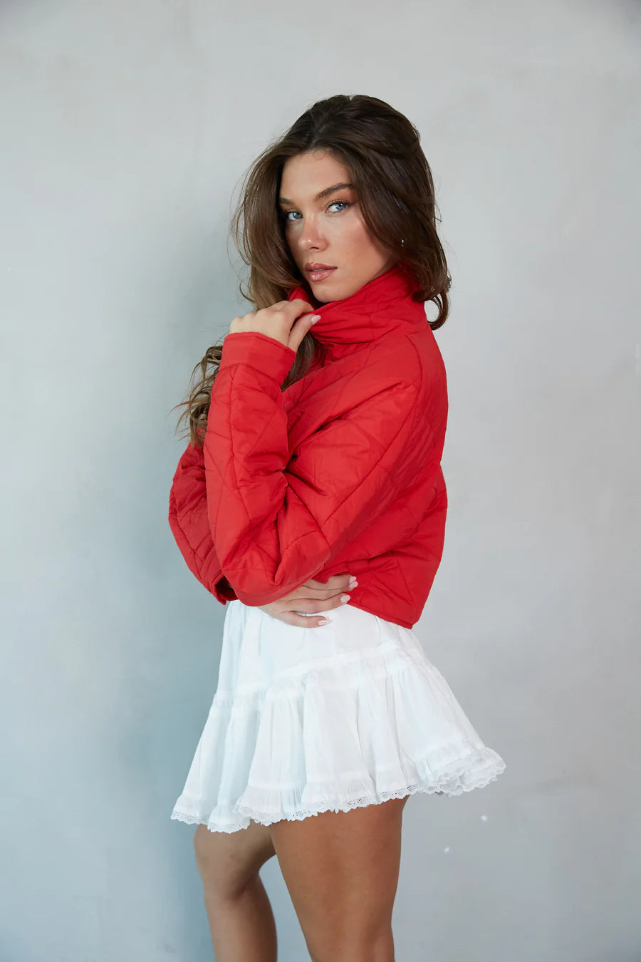 Spice up your everyday outerwear in the Sierra Quilted Cropped Puffer Jacket. This piece features a mock neck collar, quilted fabrication, and unique zipper detailing. Available in Tomato Red; style with a frilly mini skirt to complete the look!