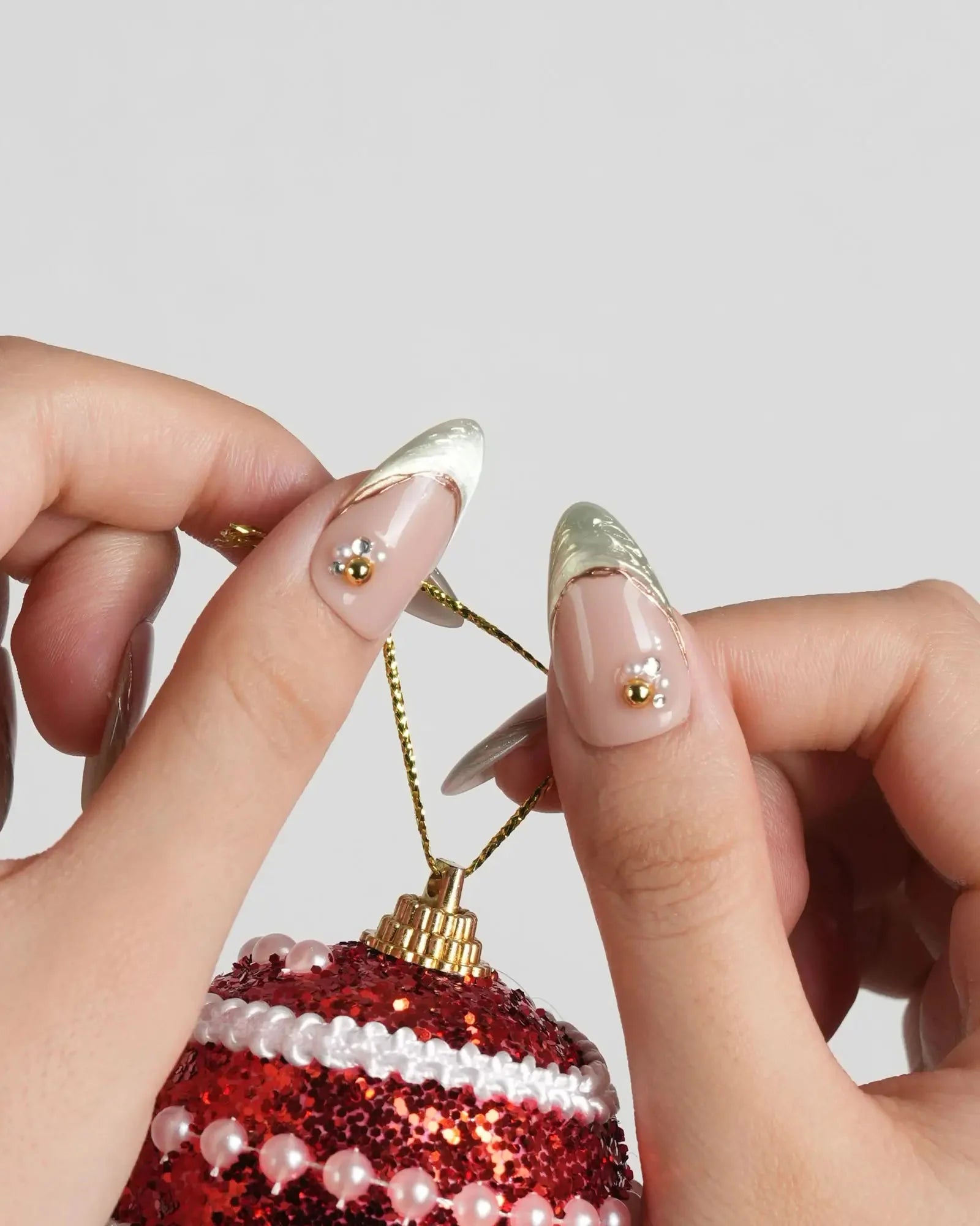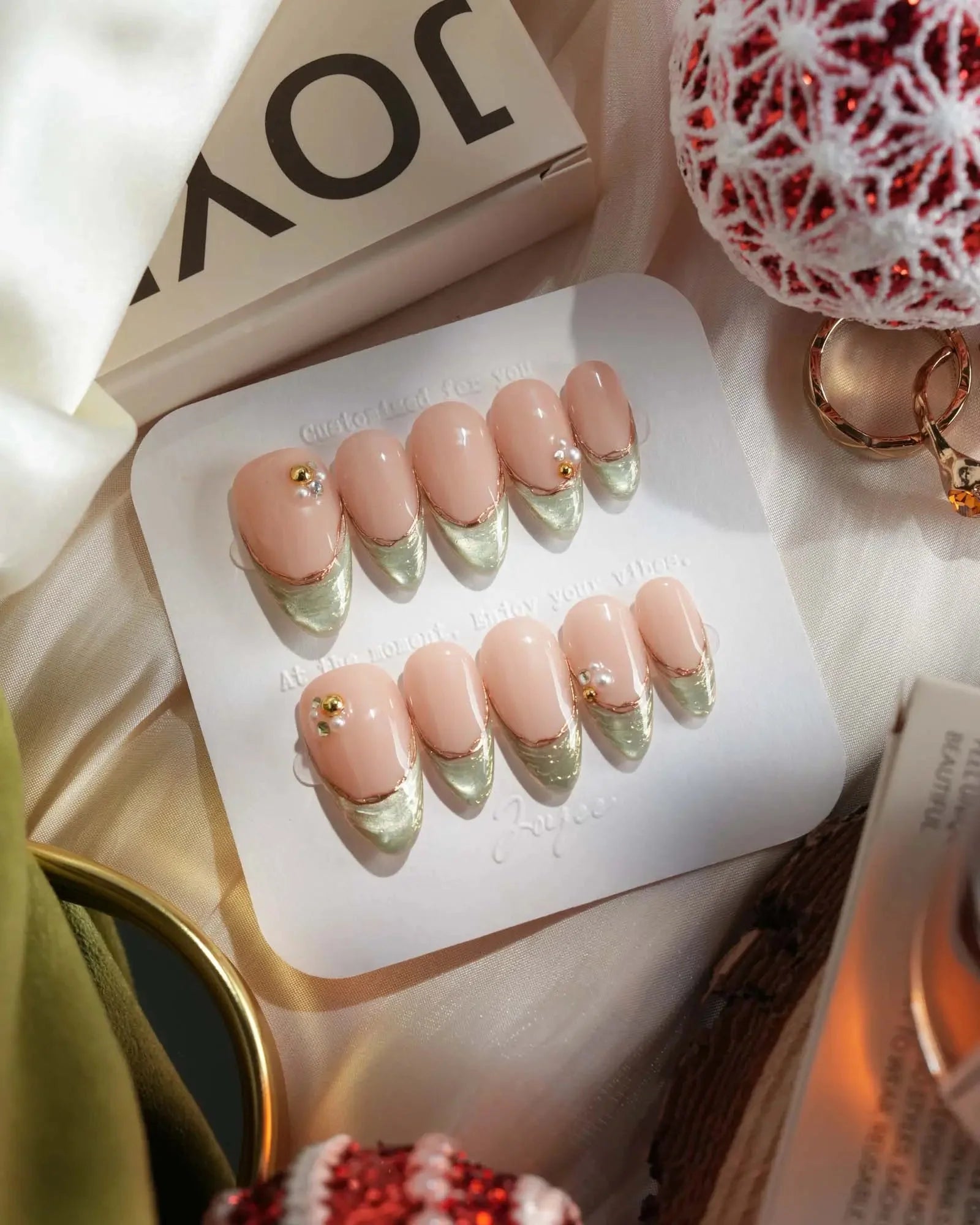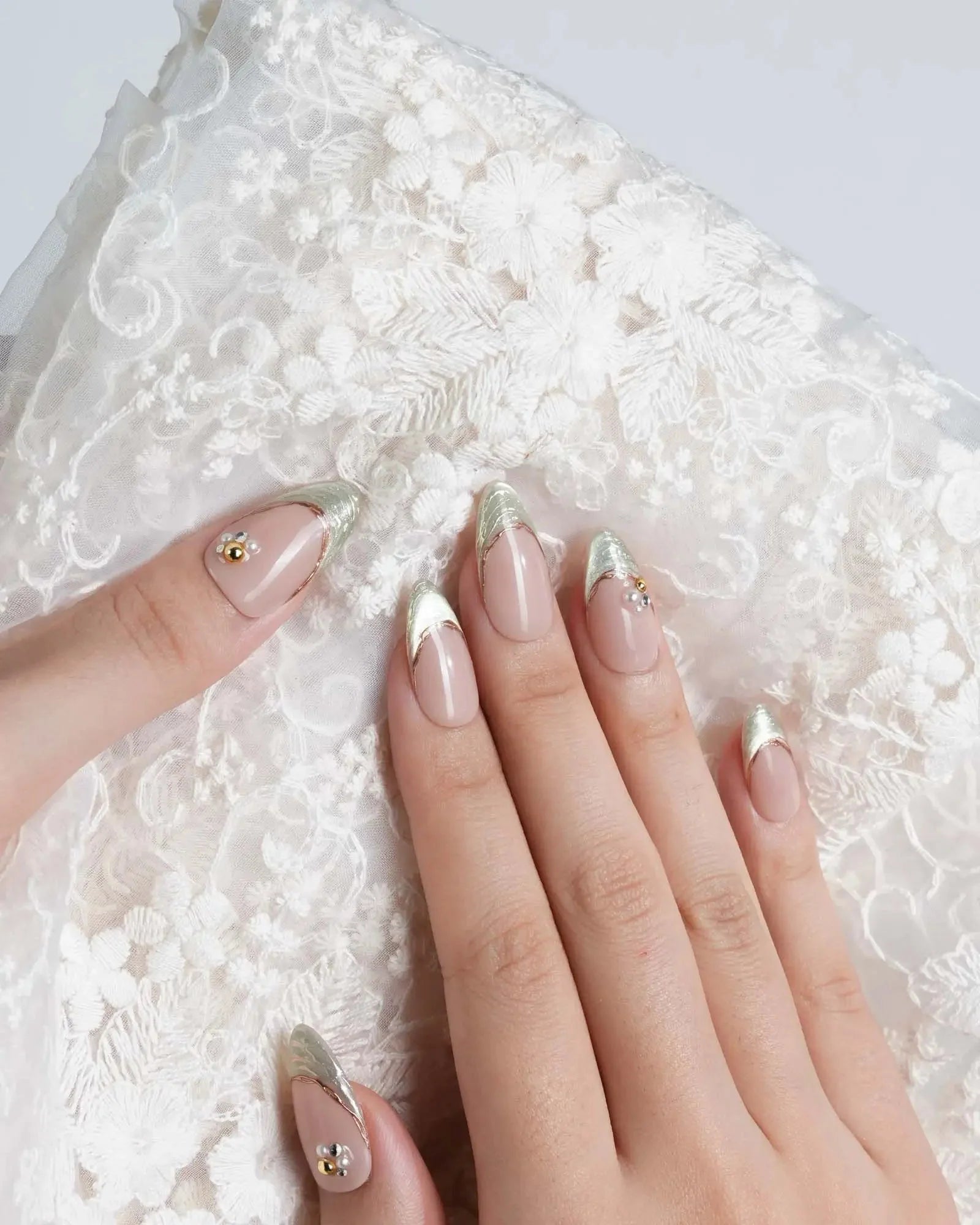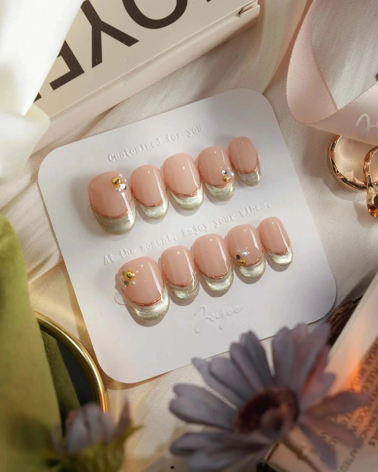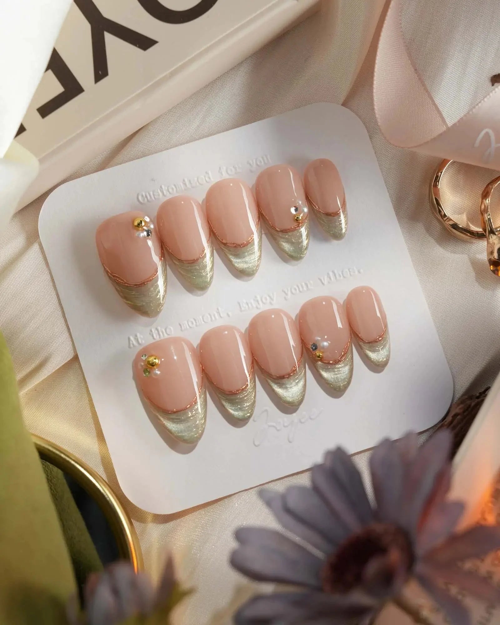 These green cat eye French nails combine a nude glossy base with translucent cat-eye shimmer and golden edges. The elegant metallic finish adds luxury and depth, making it perfect for dates, parties, or evening events. A chic and refined look that glows softly under any light.