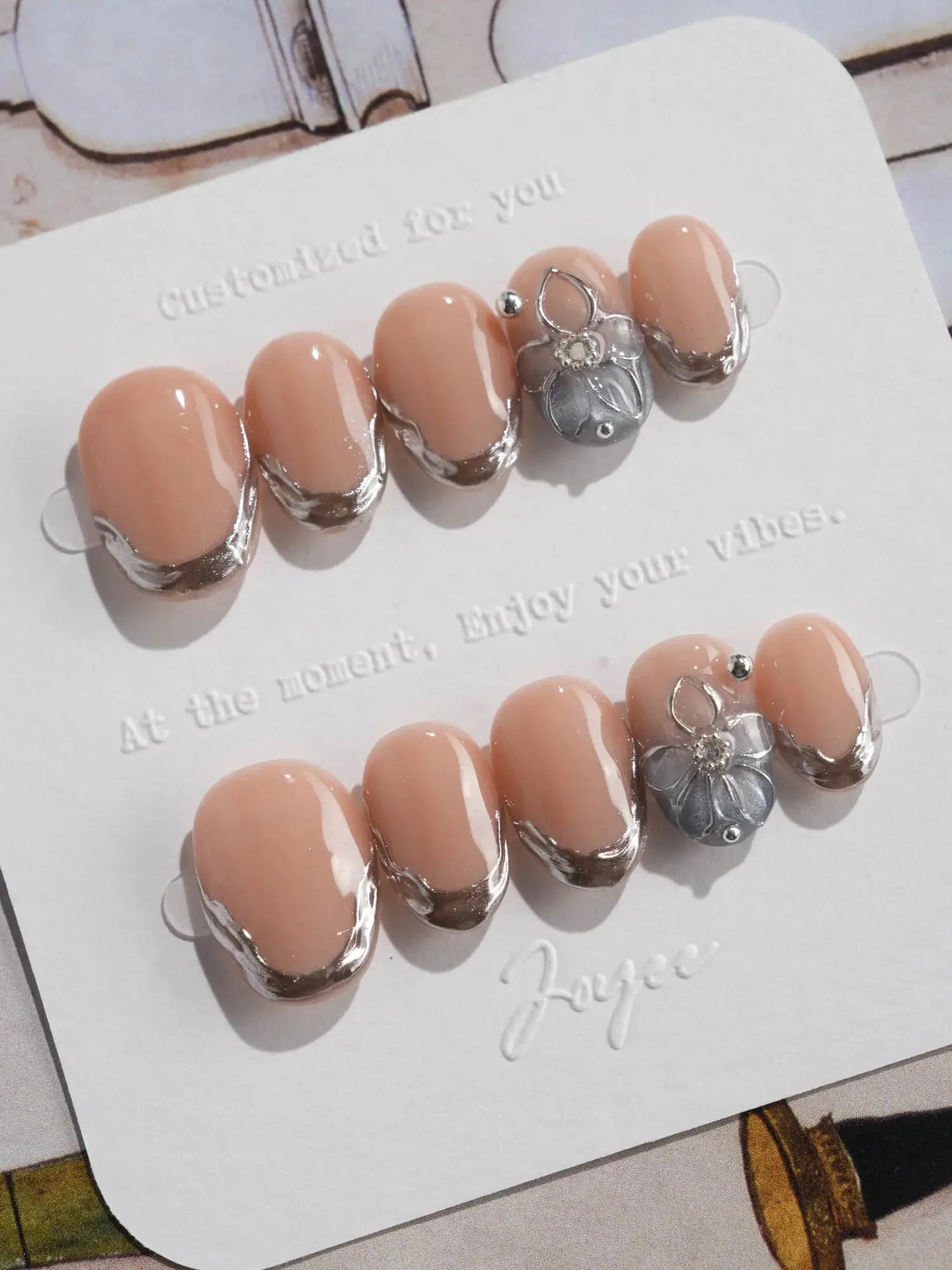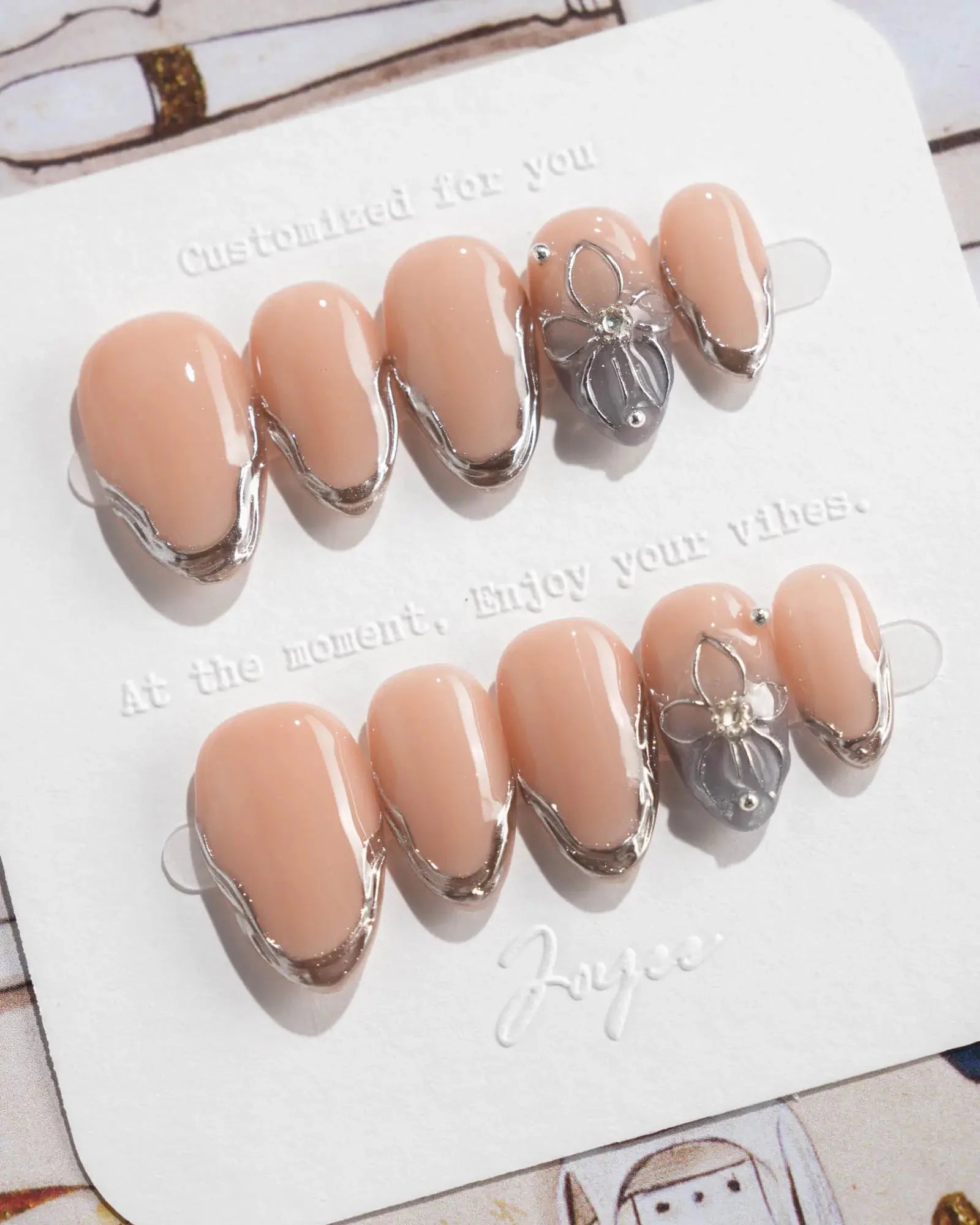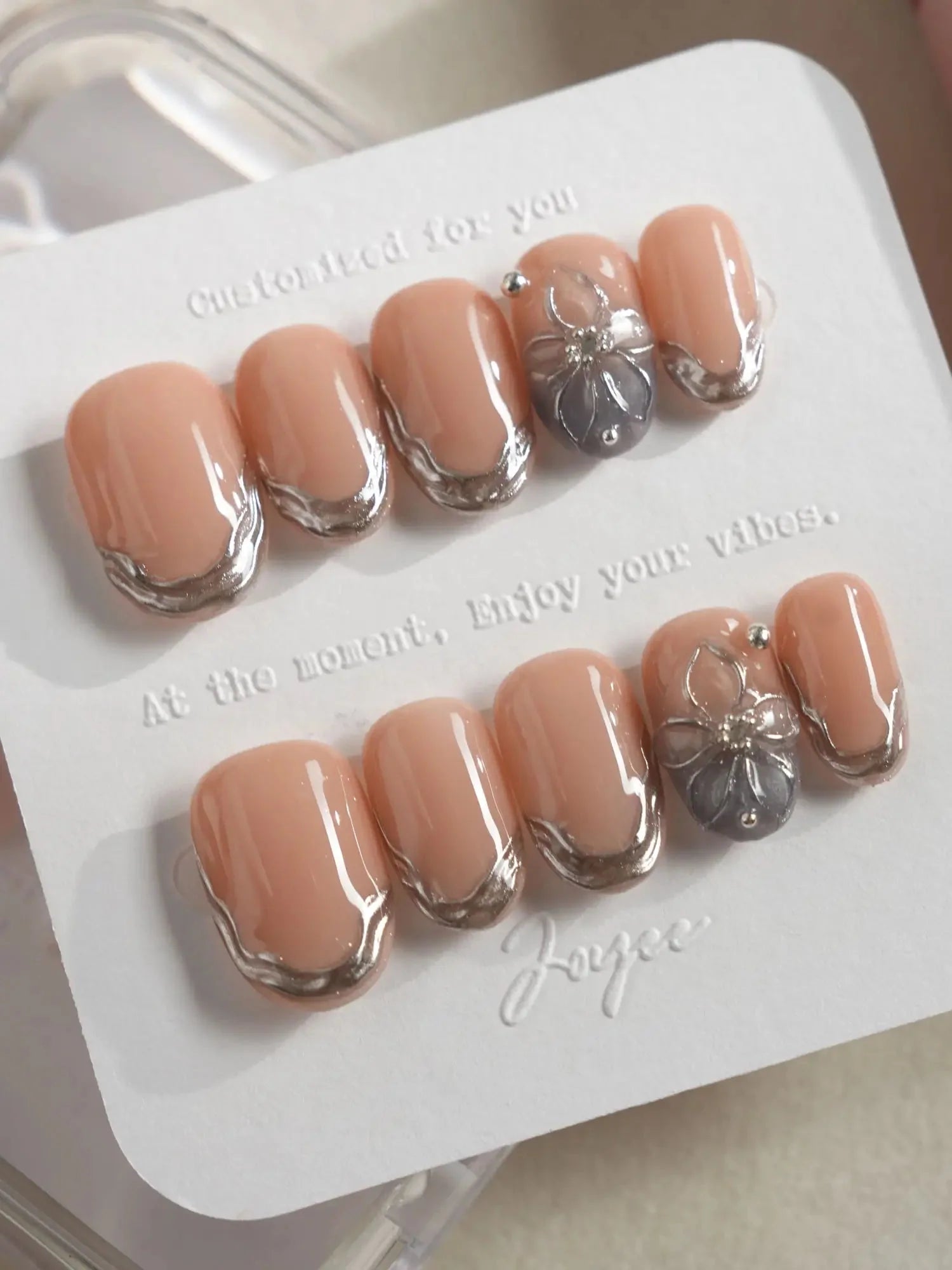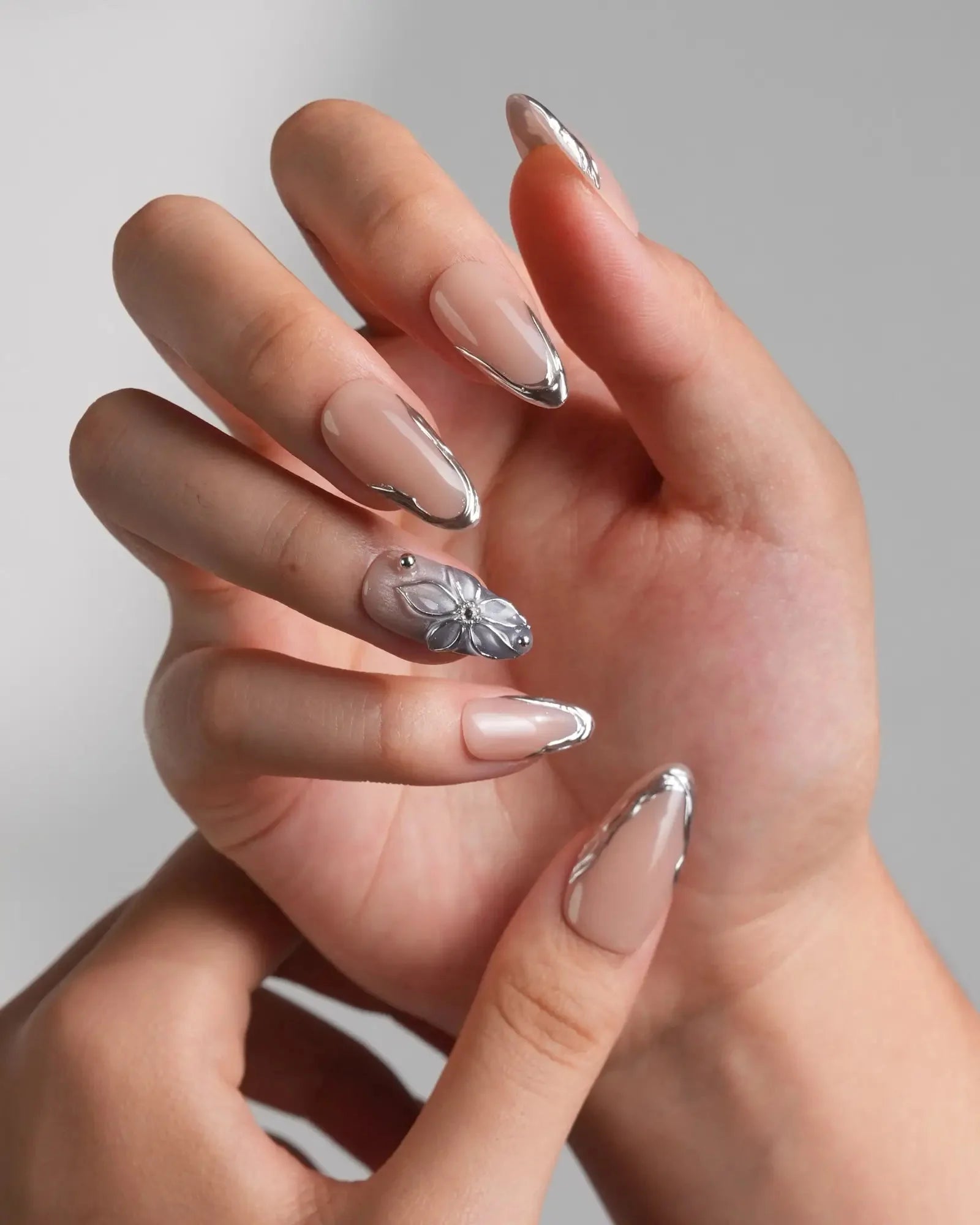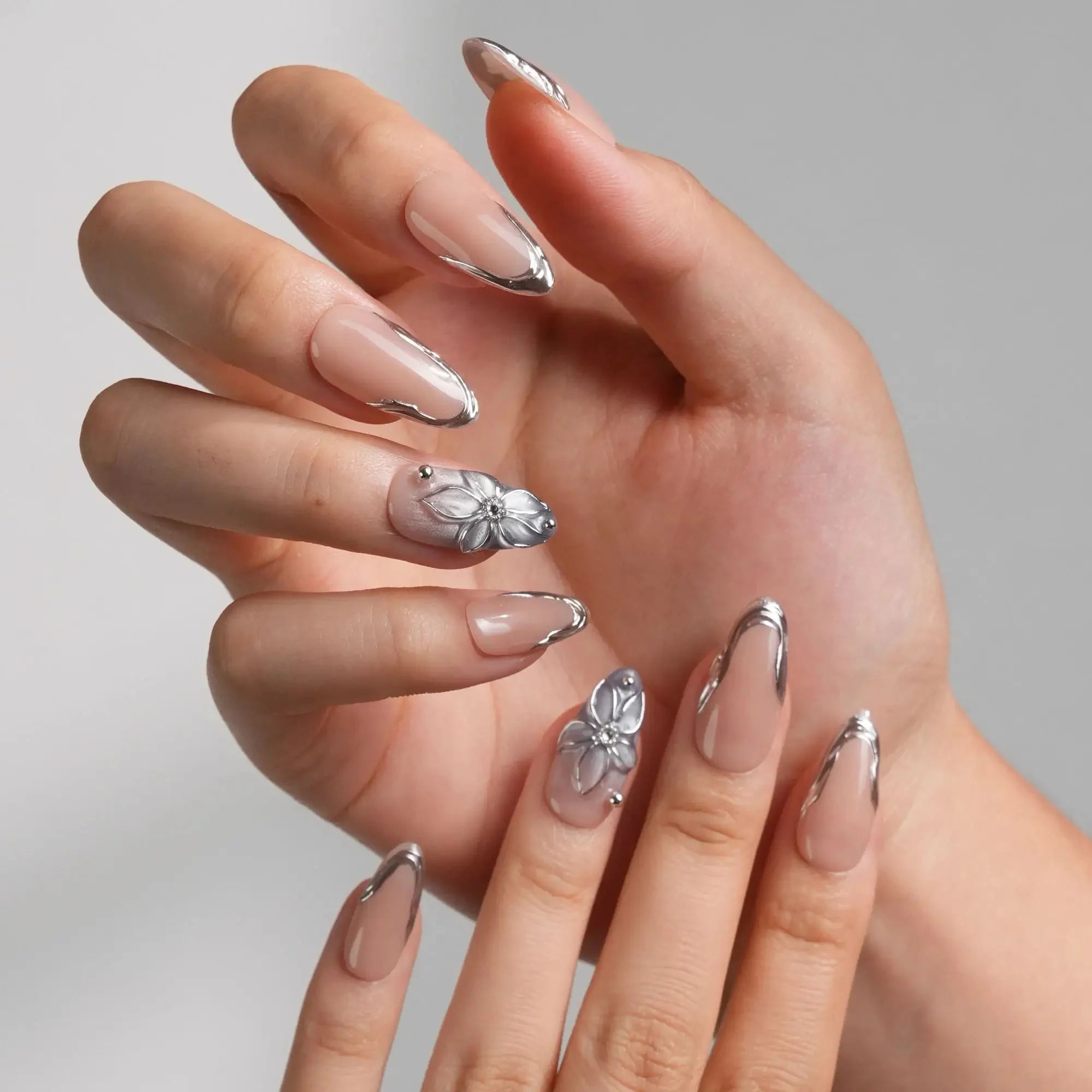 Elevate your look with these silver sculpted French tips, blending a minimalist nude base with artistic metallic edges. Featuring high-gloss silver contours and a 3D sculpted floral accent, this set delivers a refined balance of modern luxury and understated glamour. Ideal for formal events, evening soirées, or any moment when subtle sophistication matters.