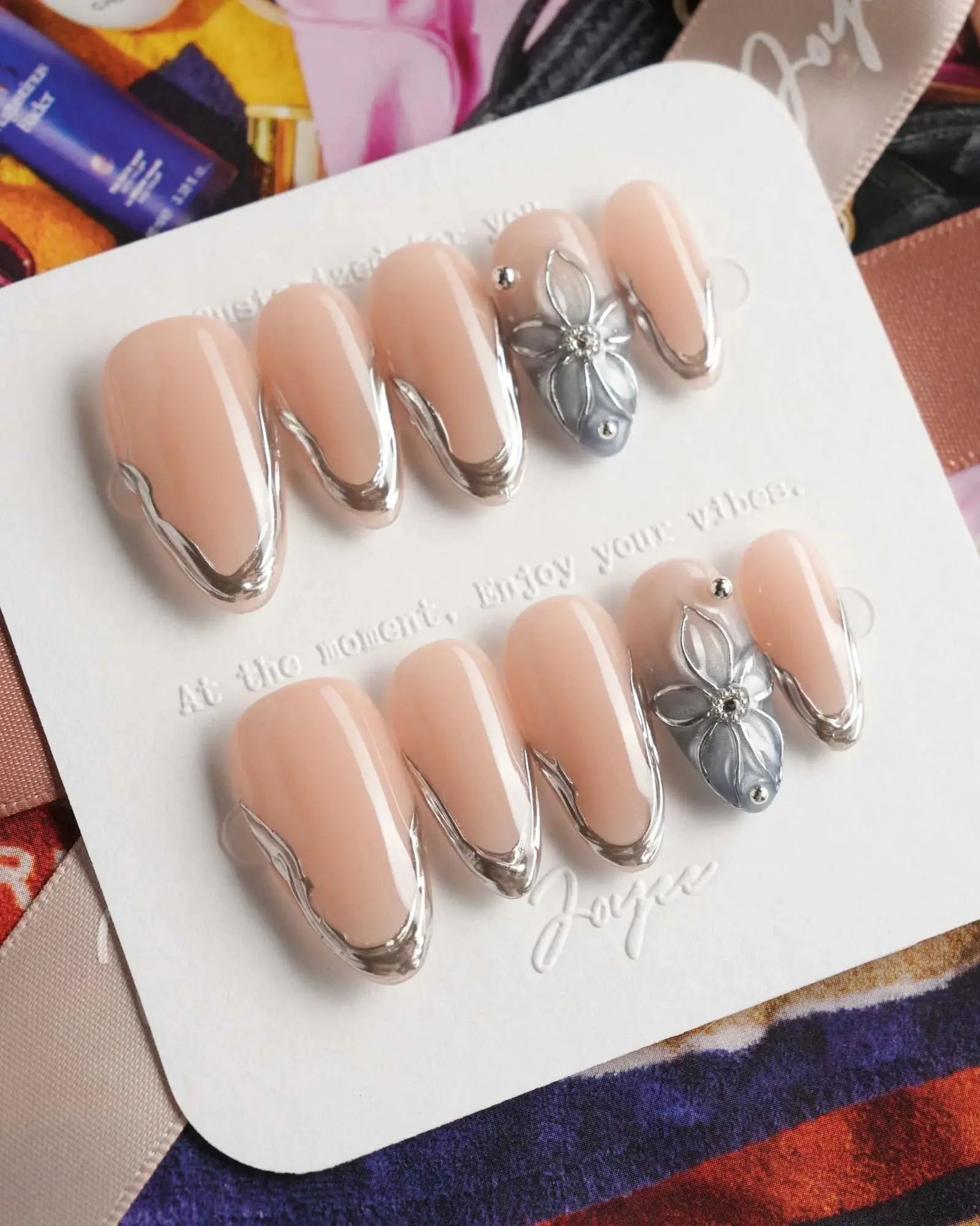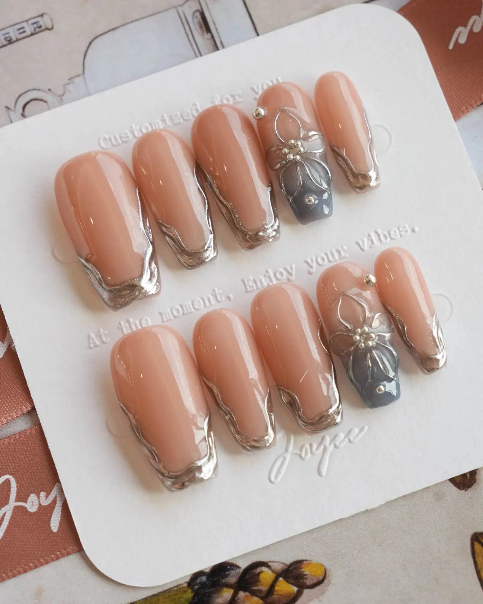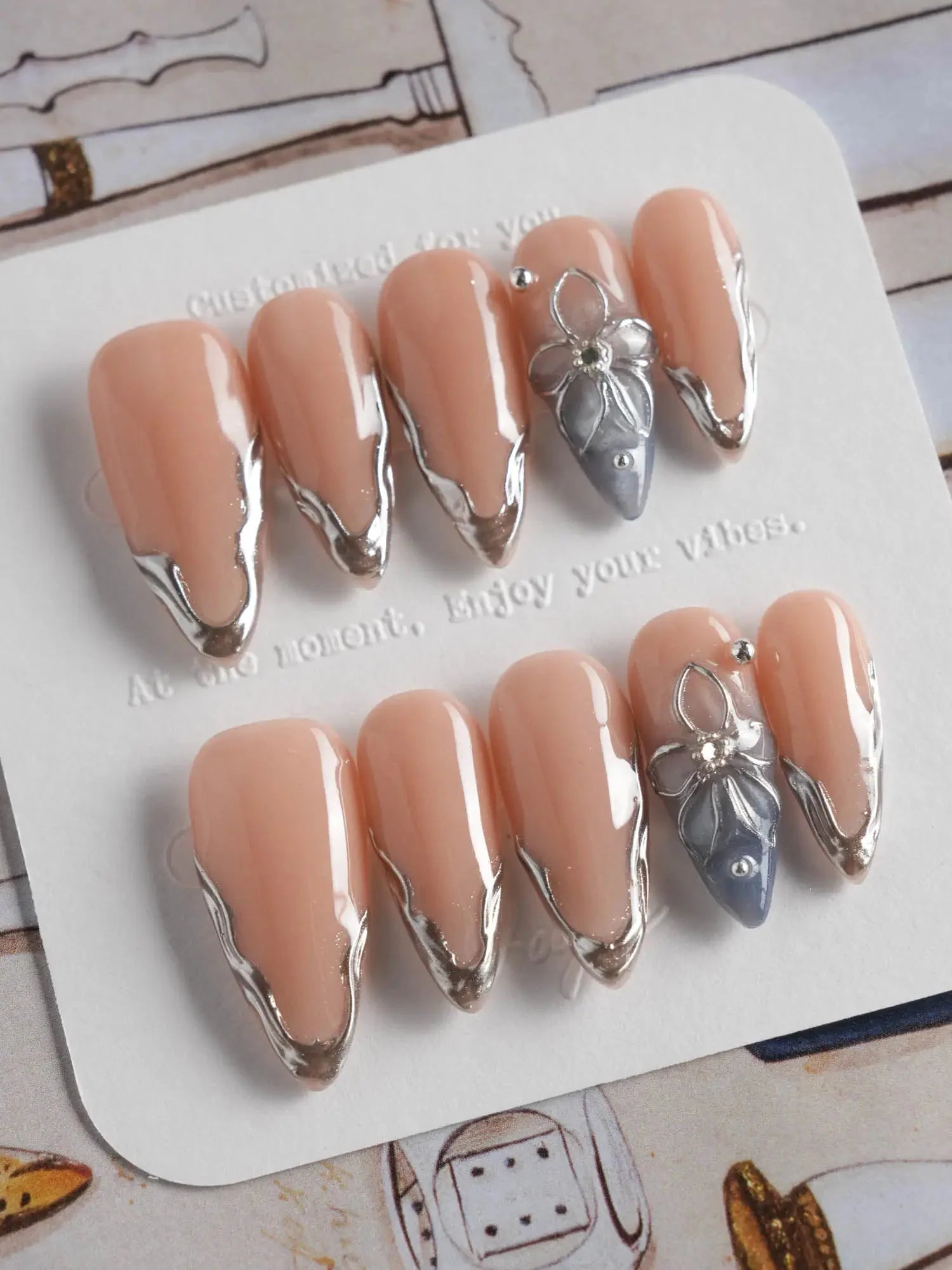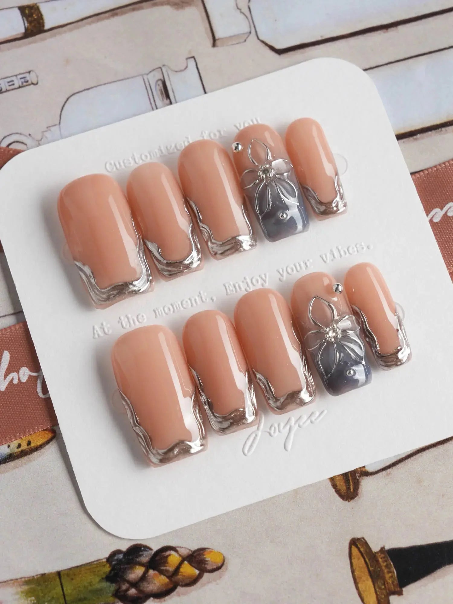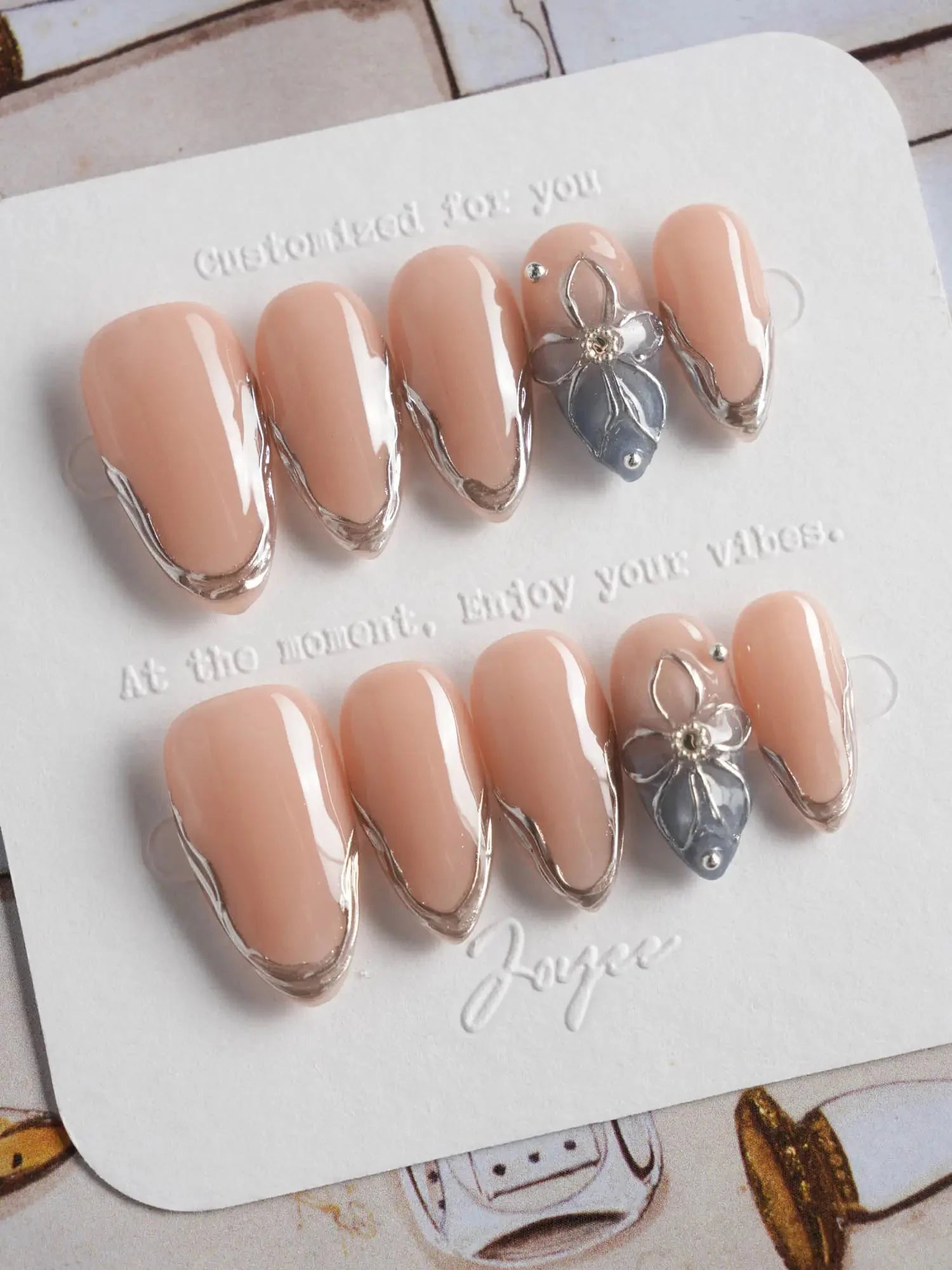 Elevate your look with these silver sculpted French tips, blending a minimalist nude base with artistic metallic edges. Featuring high-gloss silver contours and a 3D sculpted floral accent, this set delivers a refined balance of modern luxury and understated glamour. Ideal for formal events, evening soirées, or any moment when subtle sophistication matters.