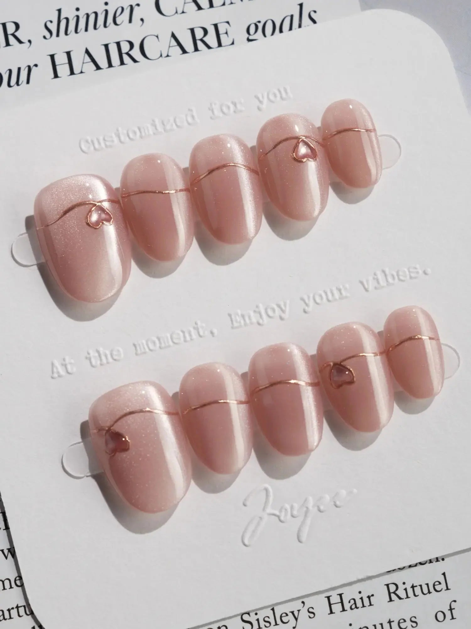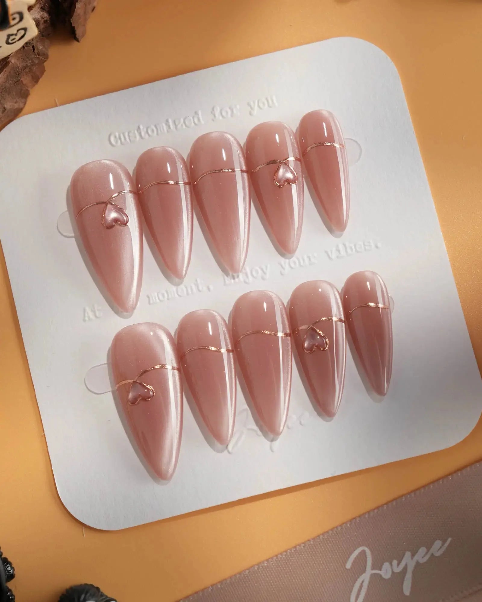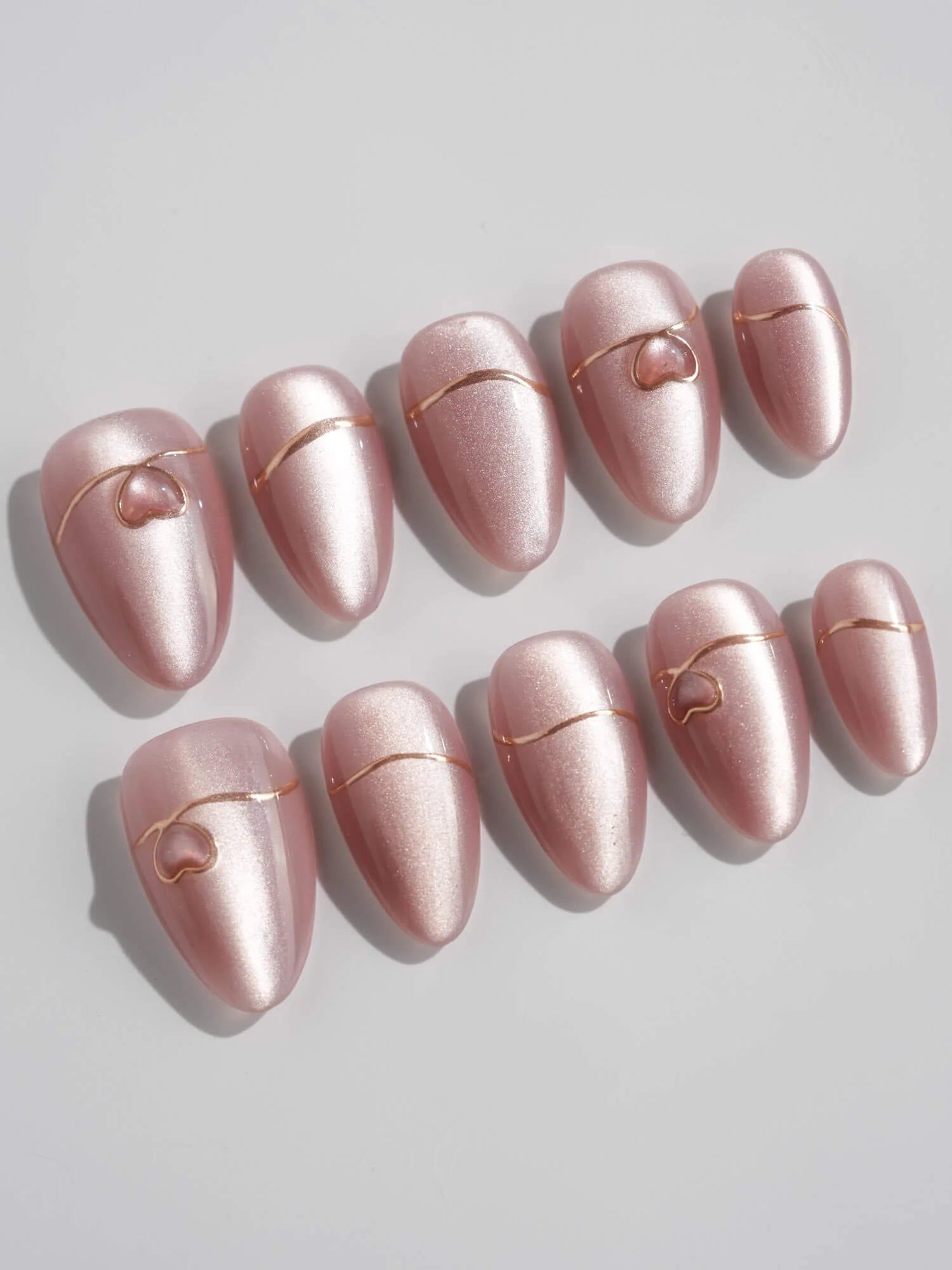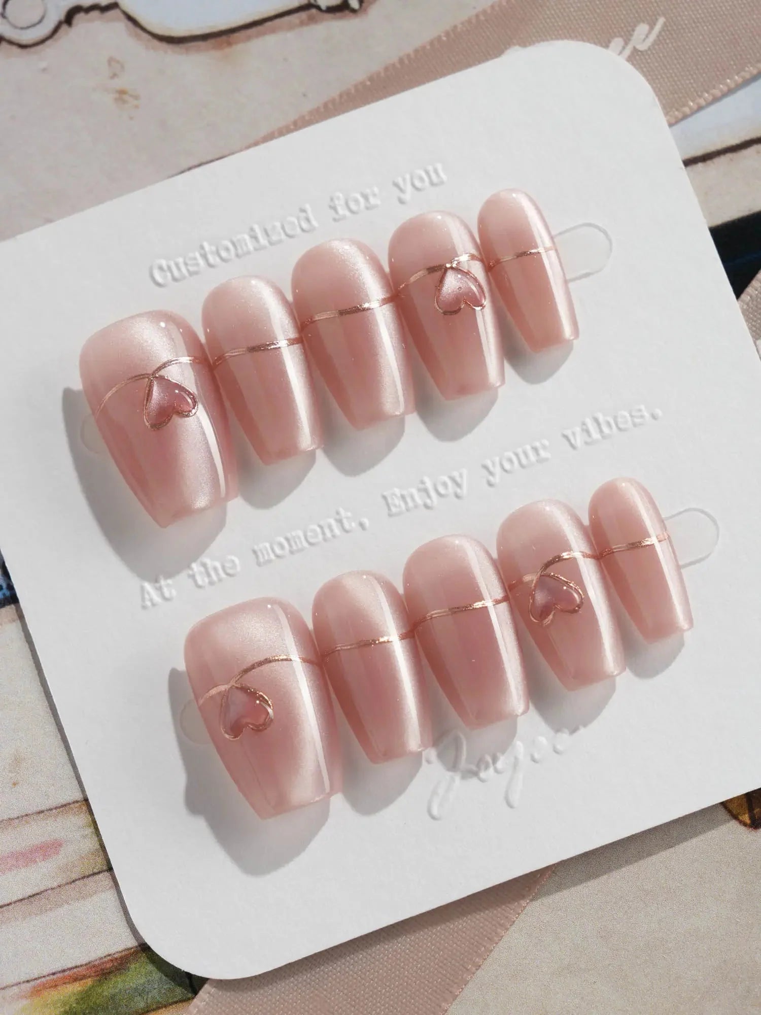 A set that feels like love at first glance—these velvet pink cat eye nails are designed to dazzle with soft shimmer and sculpted elegance. The magnetic cat eye effect adds depth and glow, while the 3D heart and rose gold outline create a romantic statement on each fingertip. Handmade and polished to perfection, this set is your go-to for date nights, Valentine's, or when you simply want to feel a little extra.