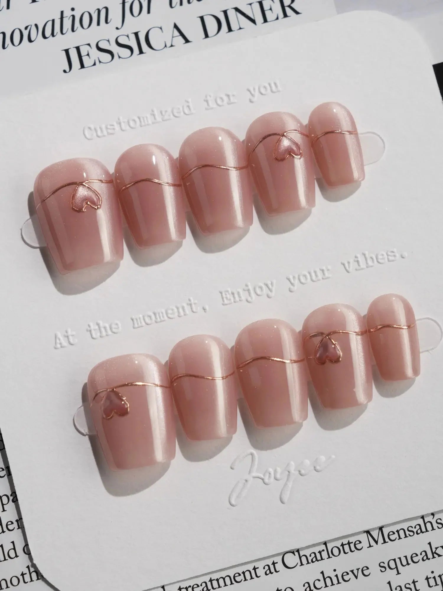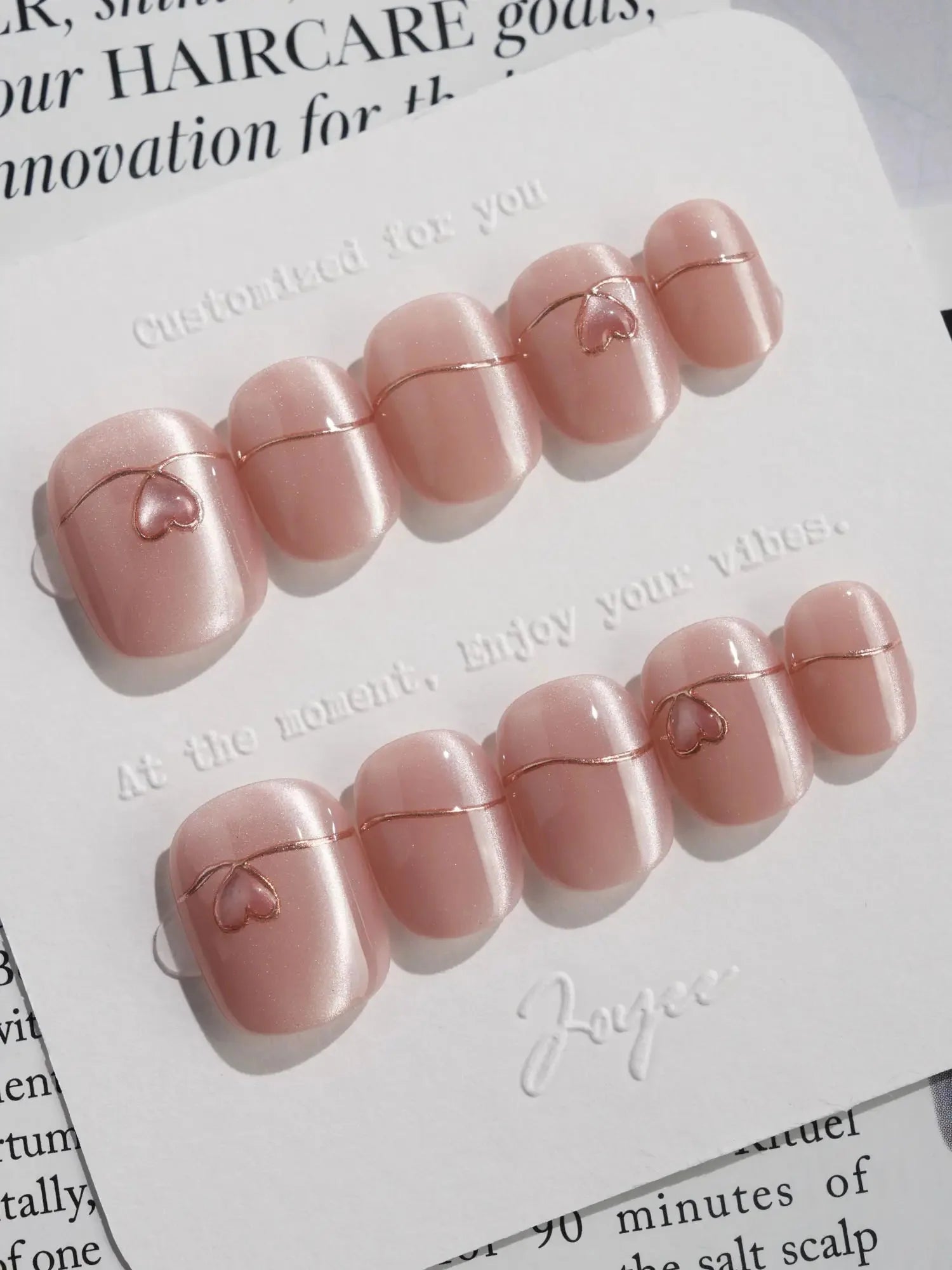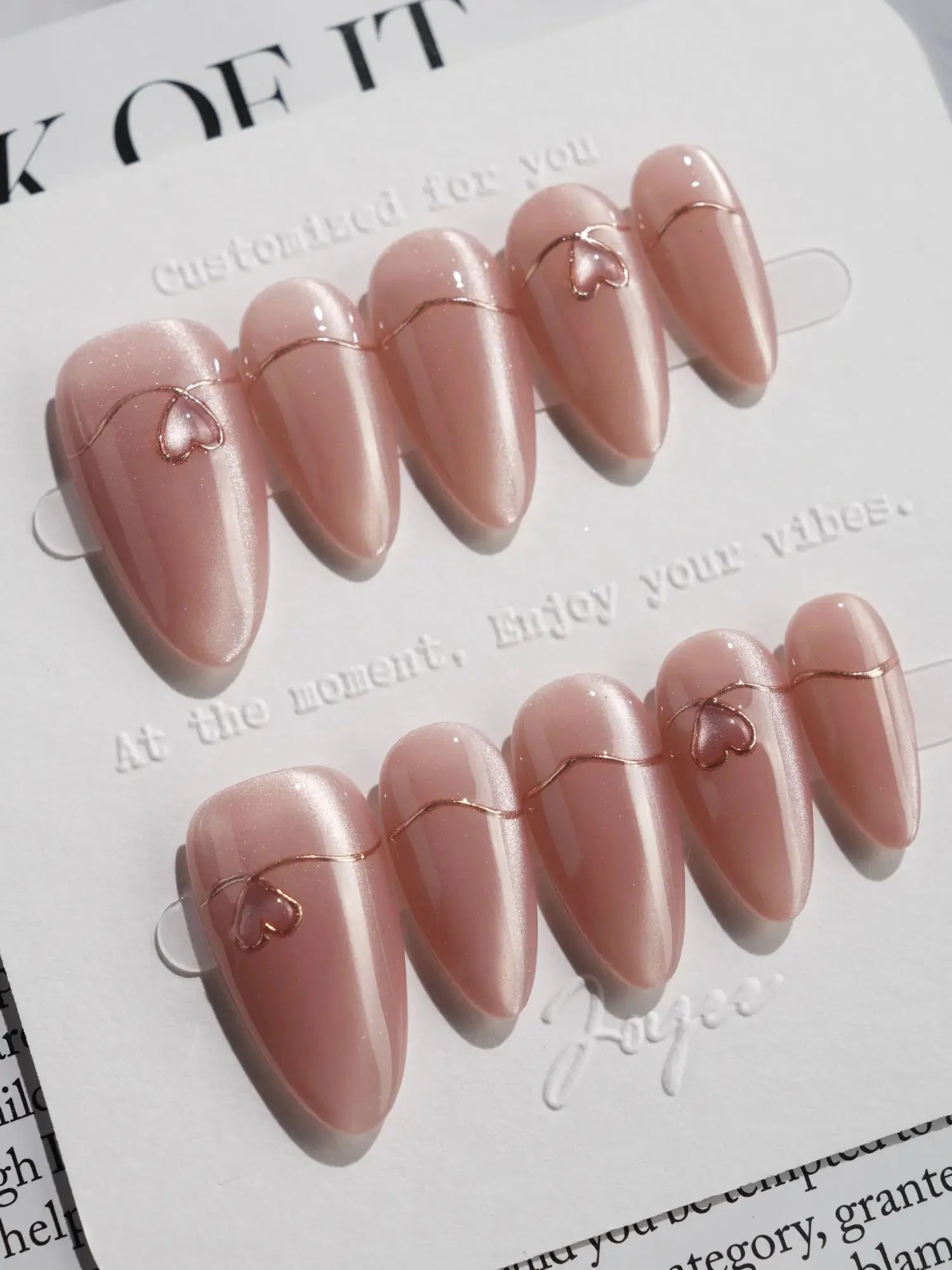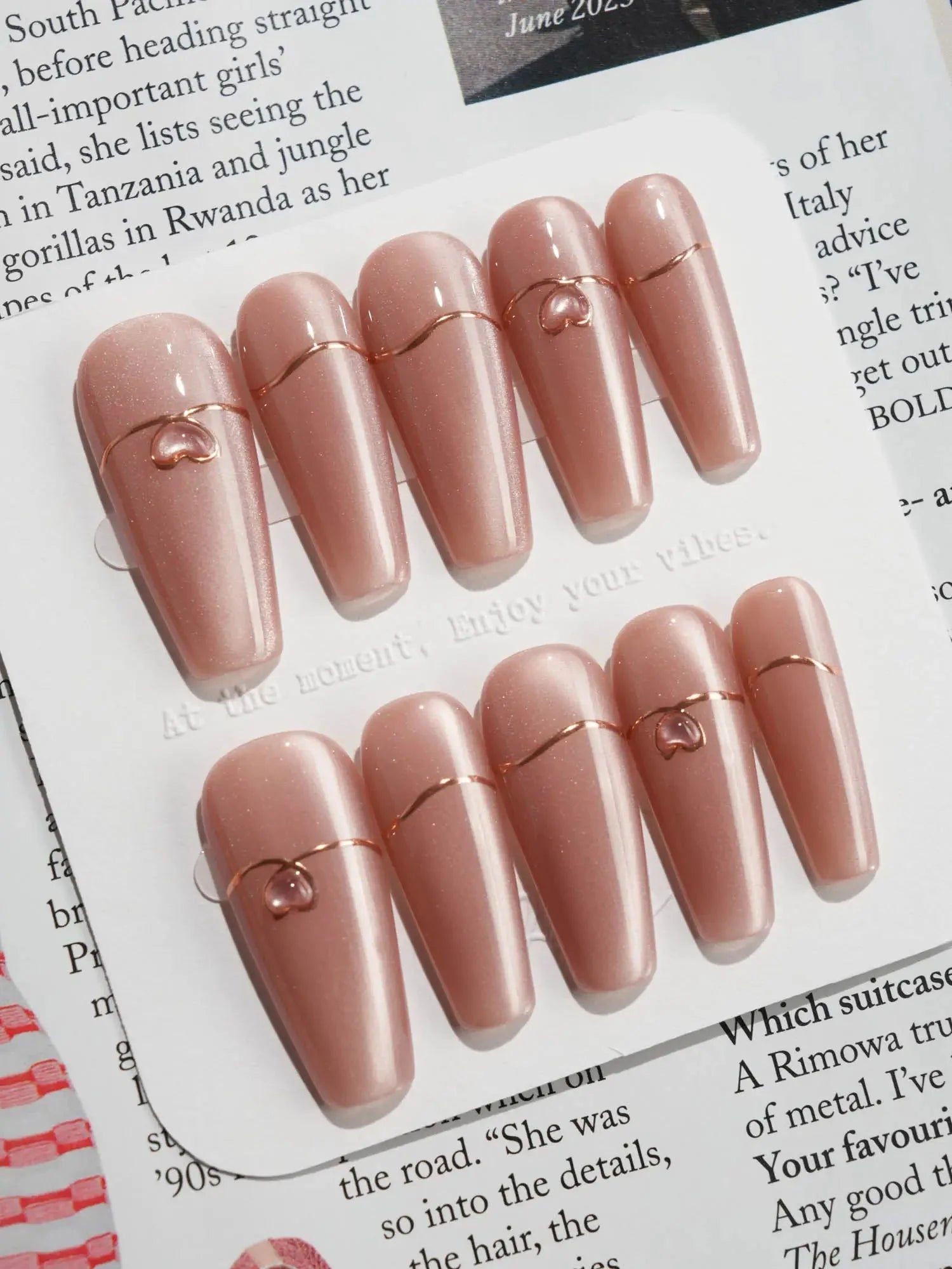 A set that feels like love at first glance—these velvet pink cat eye nails are designed to dazzle with soft shimmer and sculpted elegance. The magnetic cat eye effect adds depth and glow, while the 3D heart and rose gold outline create a romantic statement on each fingertip. Handmade and polished to perfection, this set is your go-to for date nights, Valentine's, or when you simply want to feel a little extra.