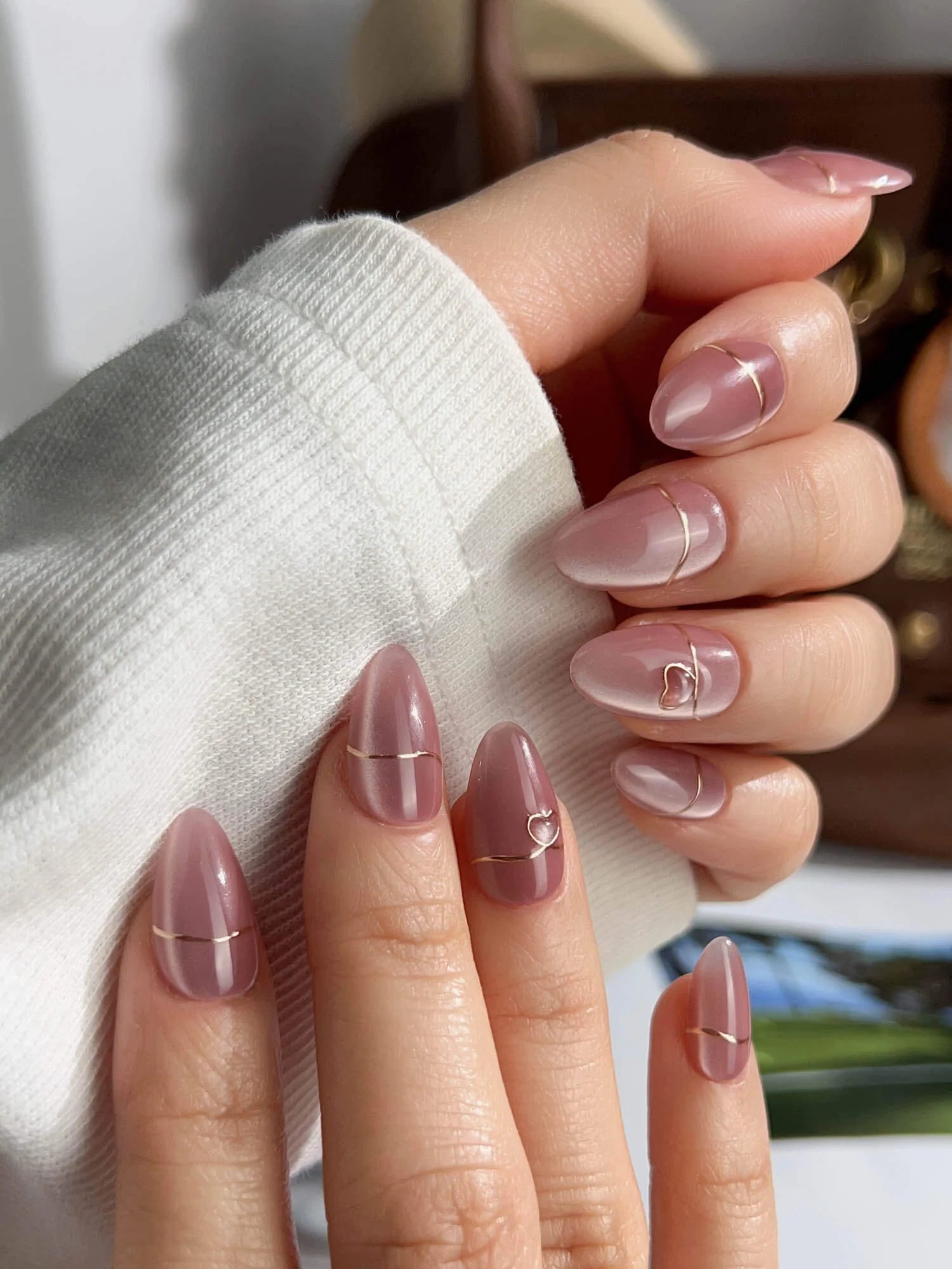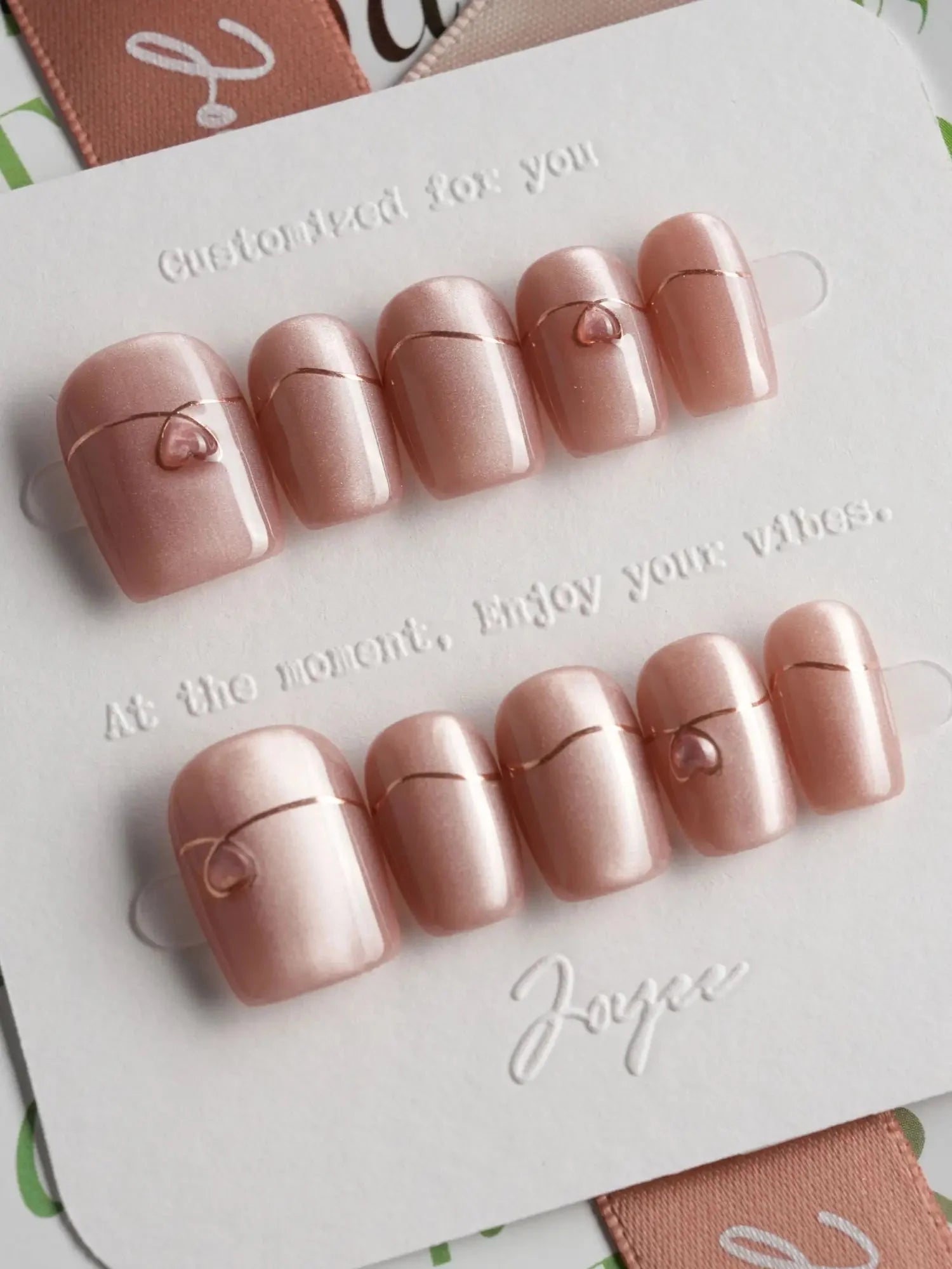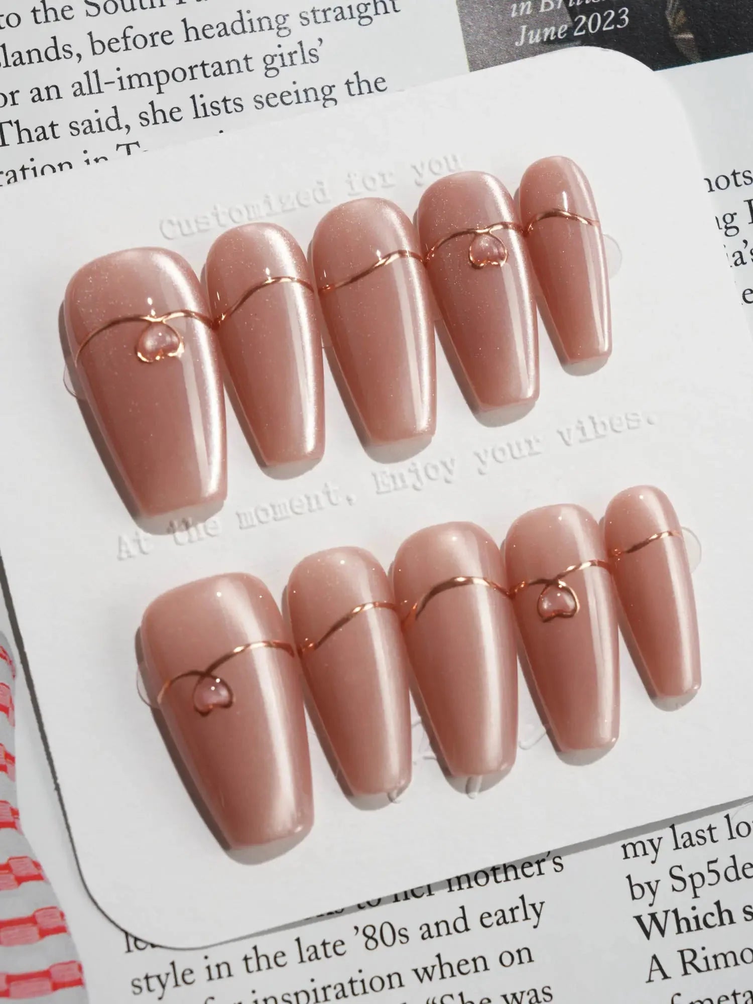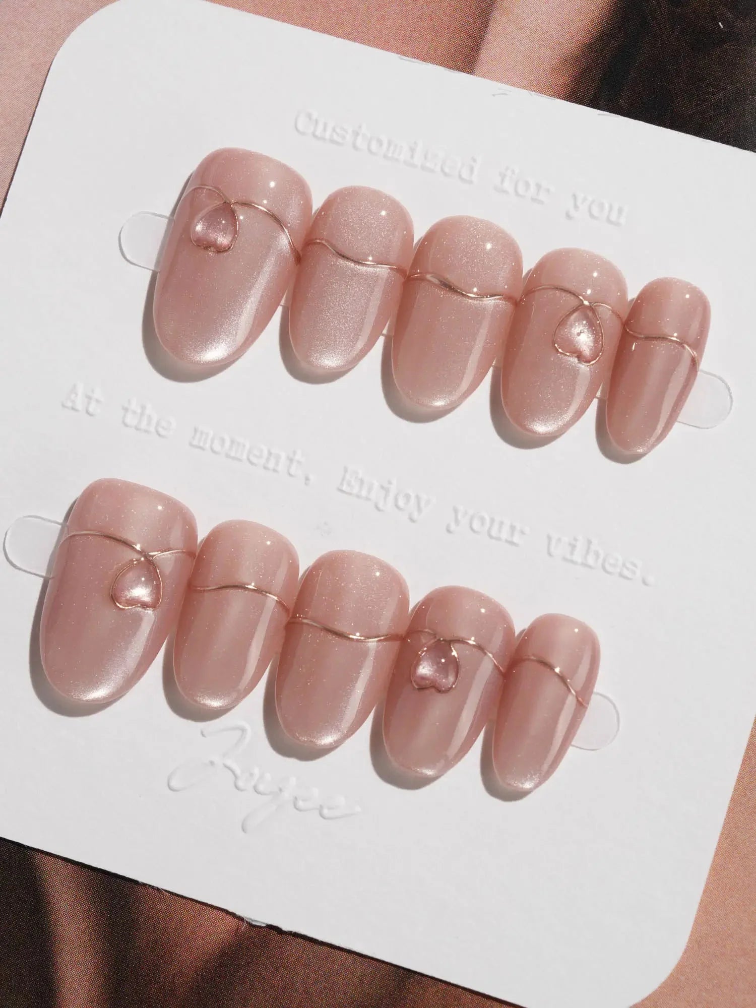 A set that feels like love at first glance—these velvet pink cat eye nails are designed to dazzle with soft shimmer and sculpted elegance. The magnetic cat eye effect adds depth and glow, while the 3D heart and rose gold outline create a romantic statement on each fingertip. Handmade and polished to perfection, this set is your go-to for date nights, Valentine's, or when you simply want to feel a little extra.