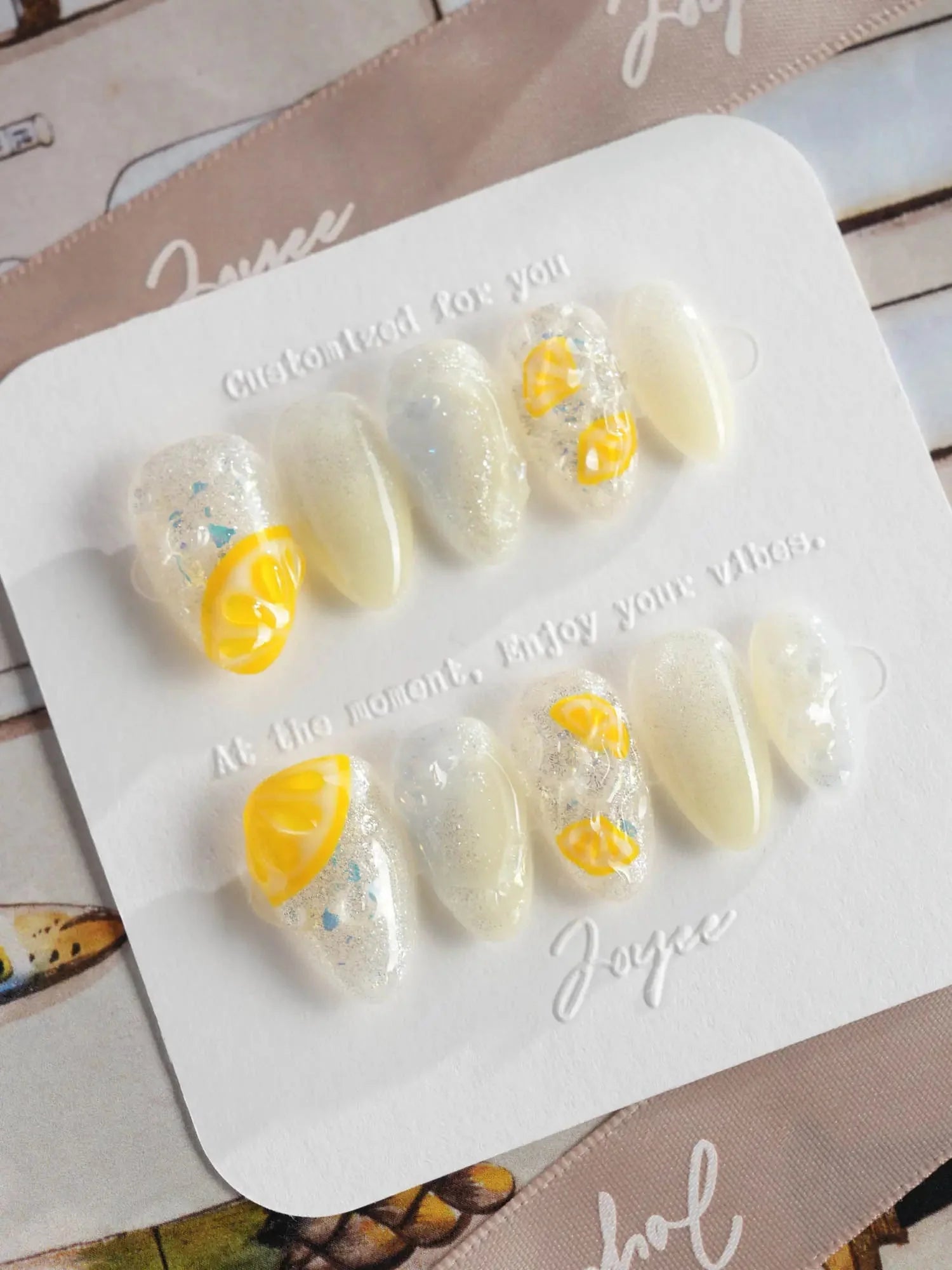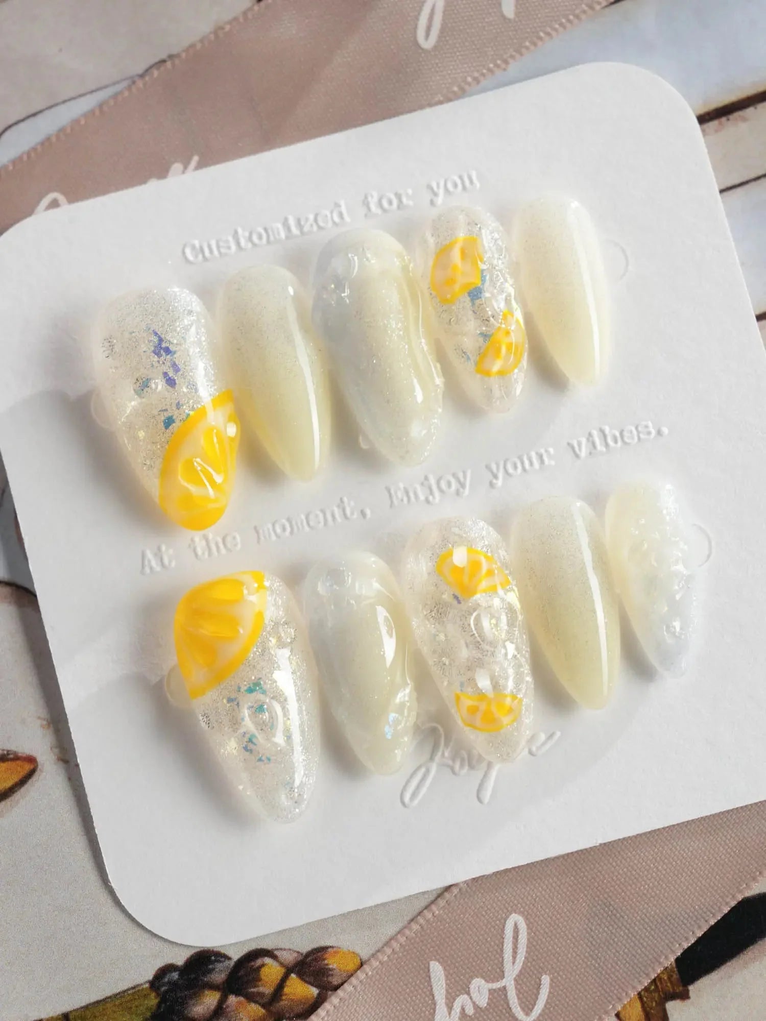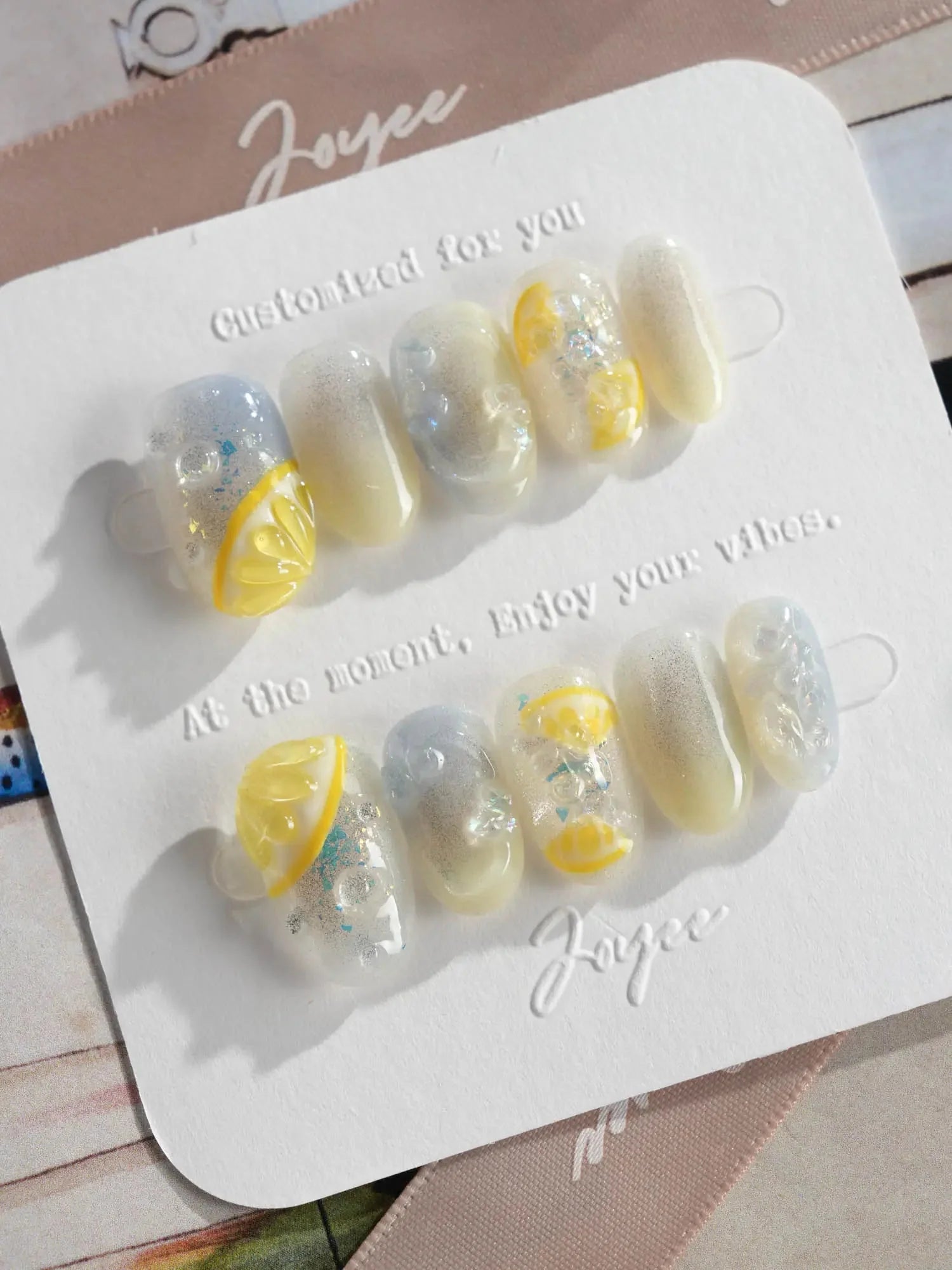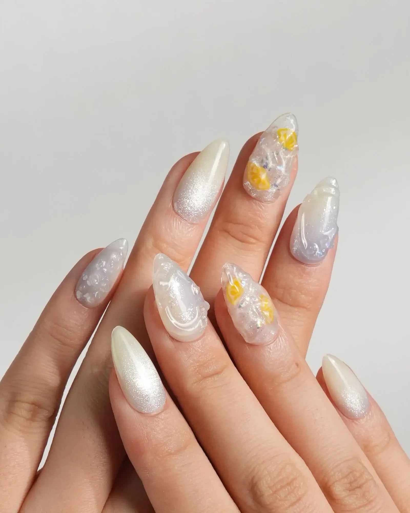 These Lemon Slice Nails look like they just came out of the freezer—literally. Translucent white and pale icy blue create a frozen glass effect, topped with juicy yellow lemon slice charms and delicate crushed glitter.