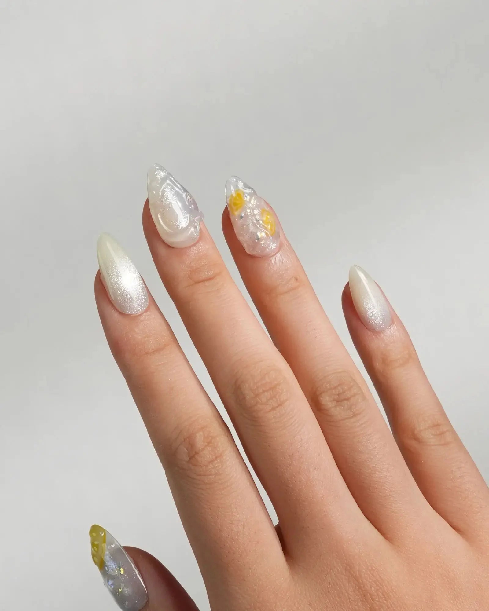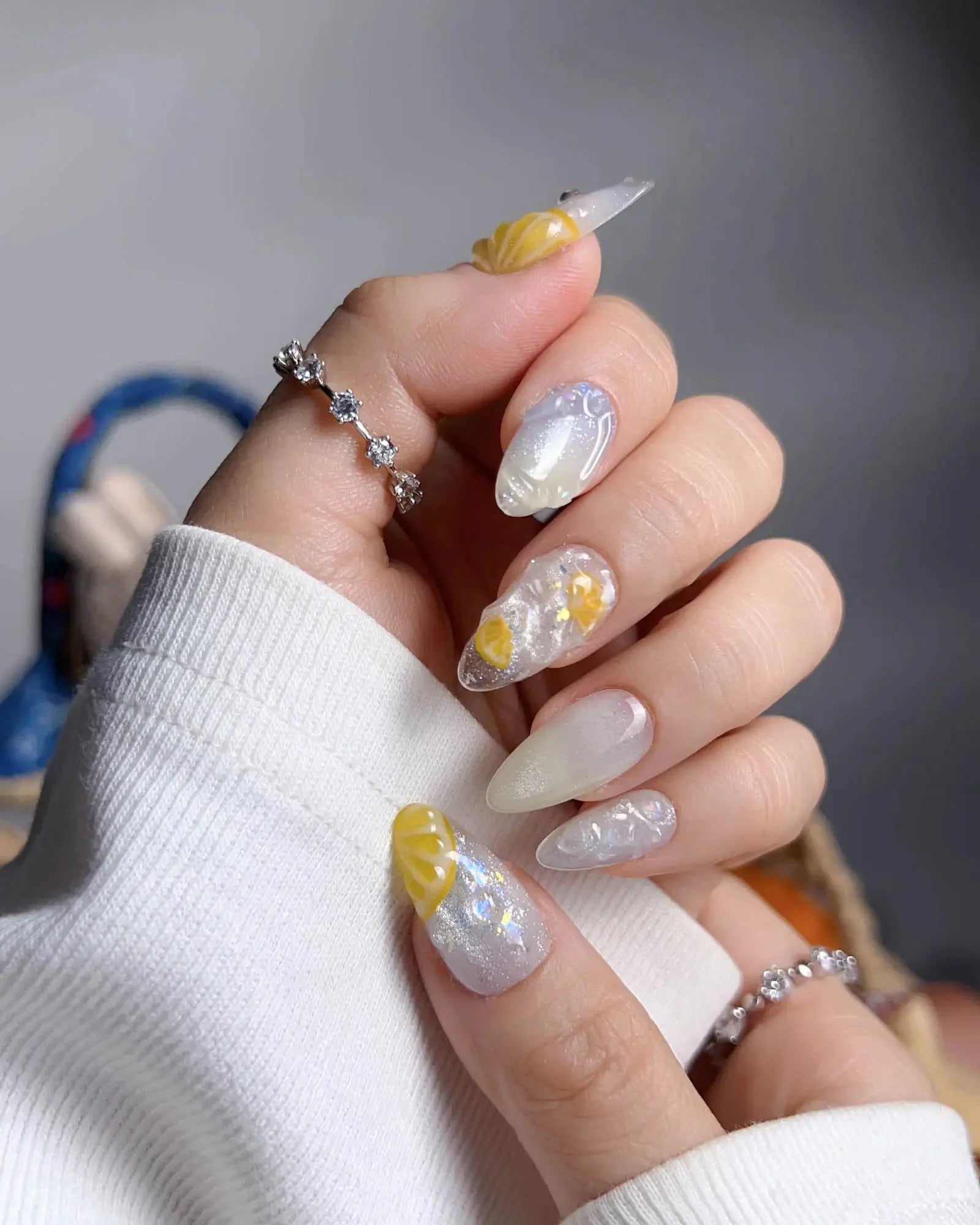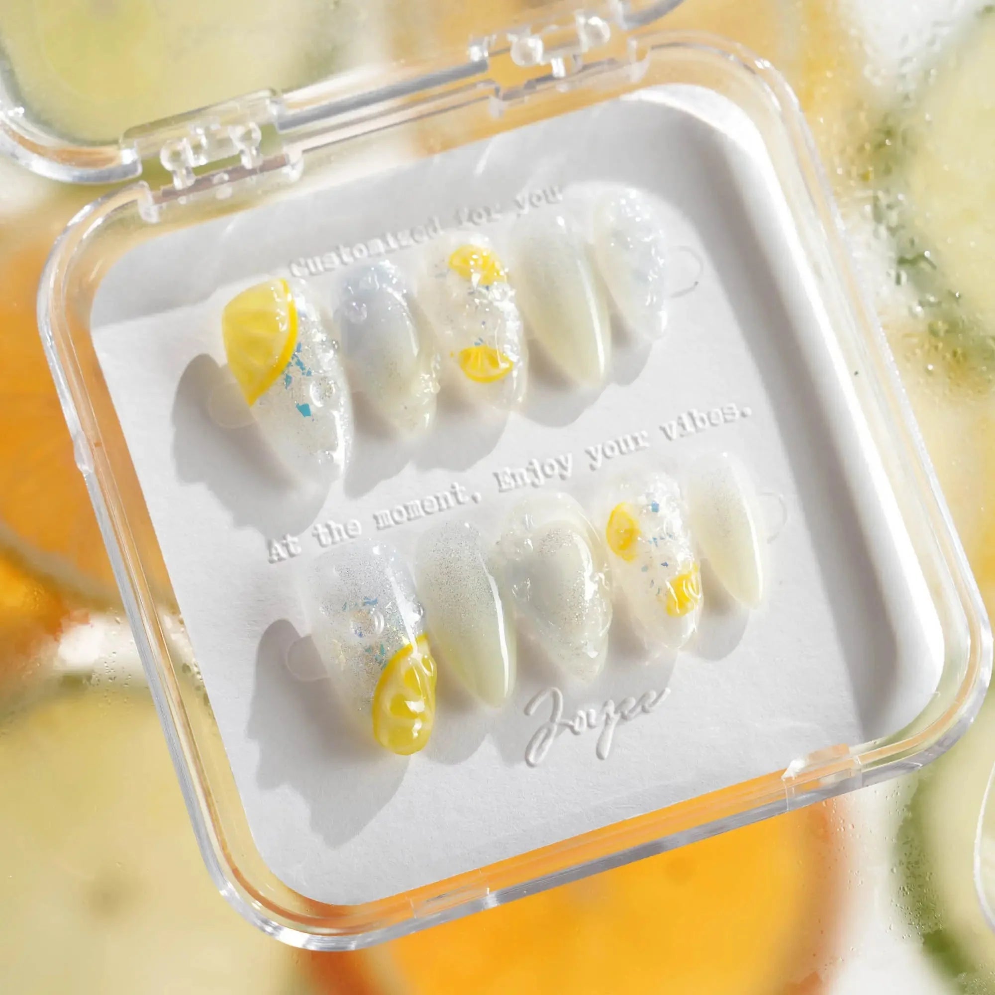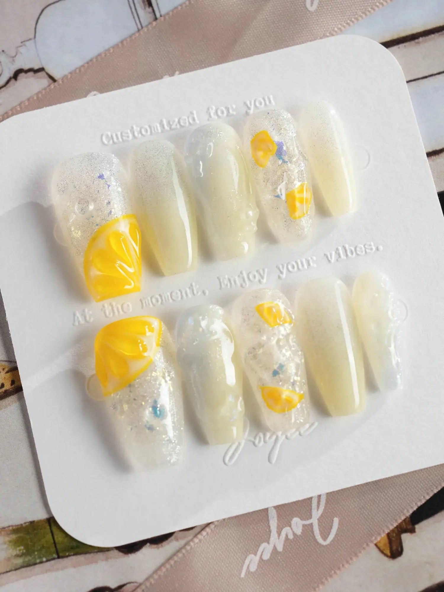 These Lemon Slice Nails look like they just came out of the freezer—literally. Translucent white and pale icy blue create a frozen glass effect, topped with juicy yellow lemon slice charms and delicate crushed glitter.
