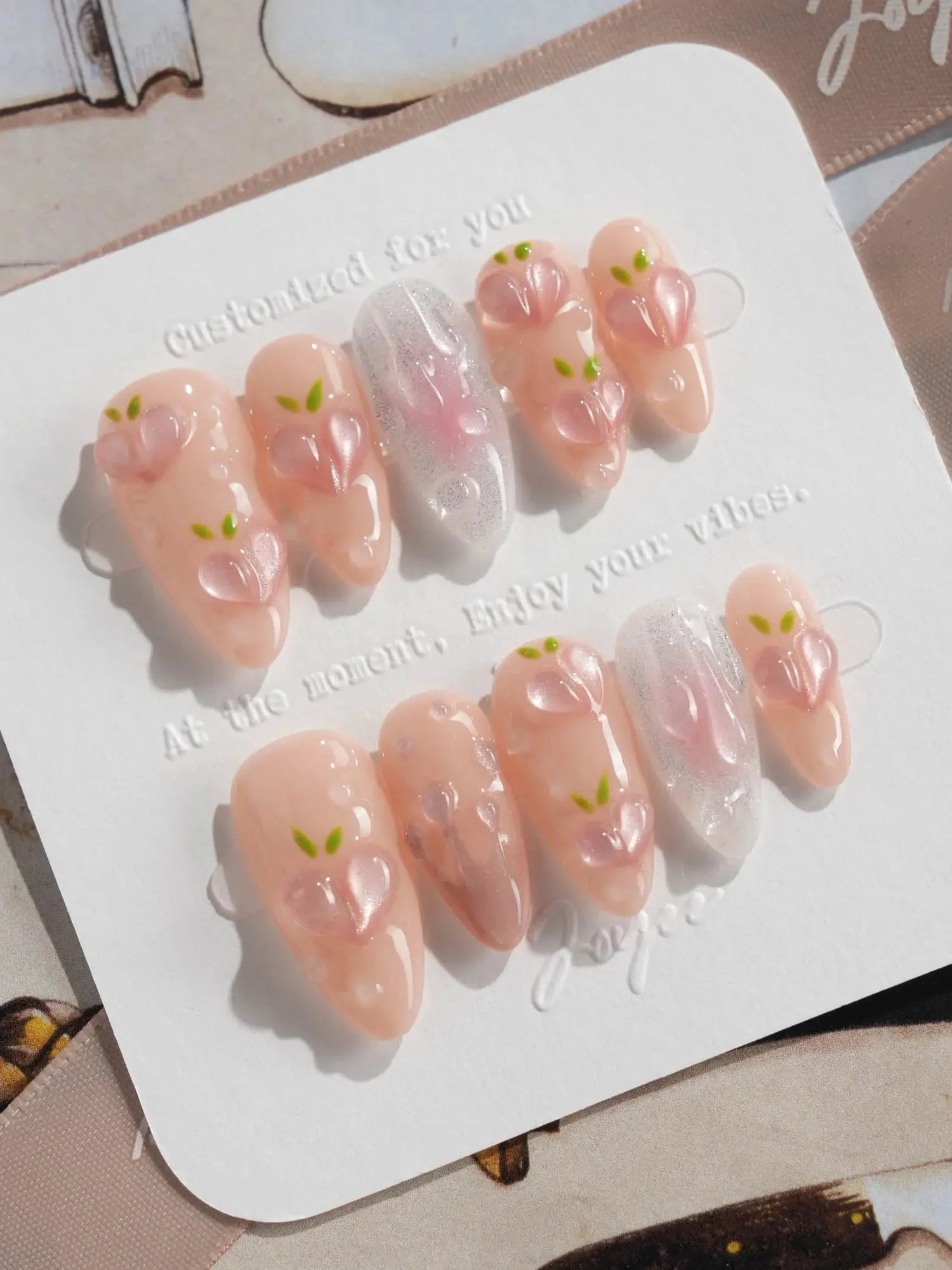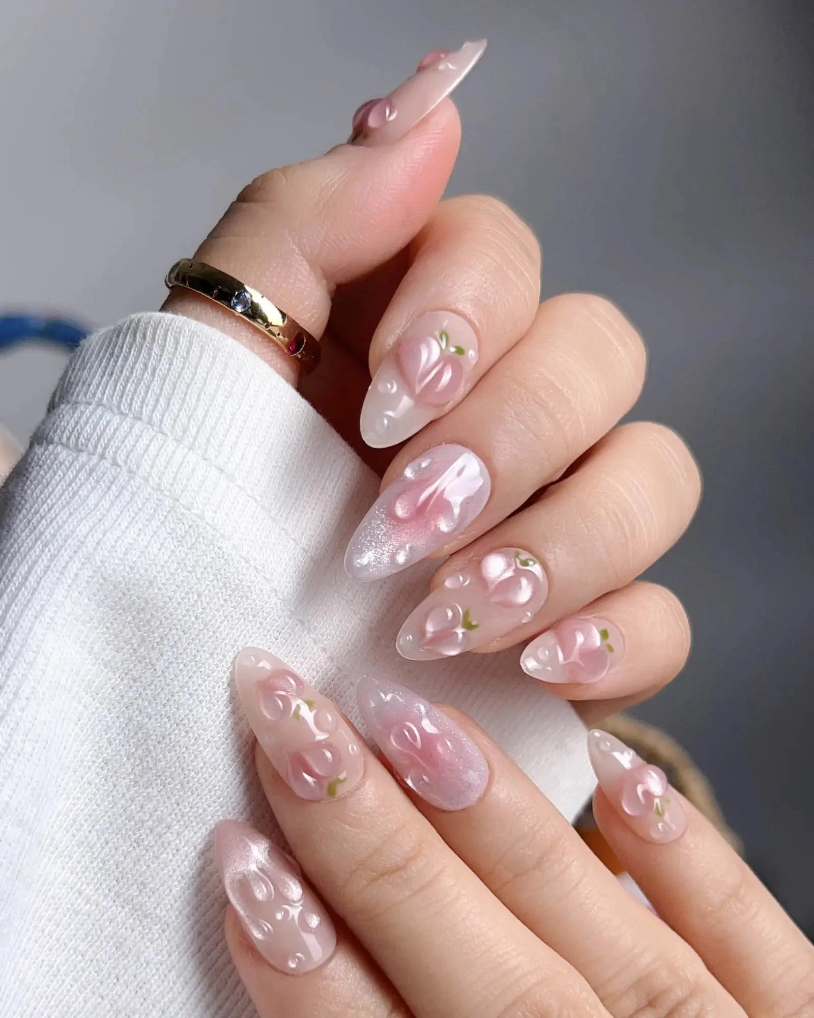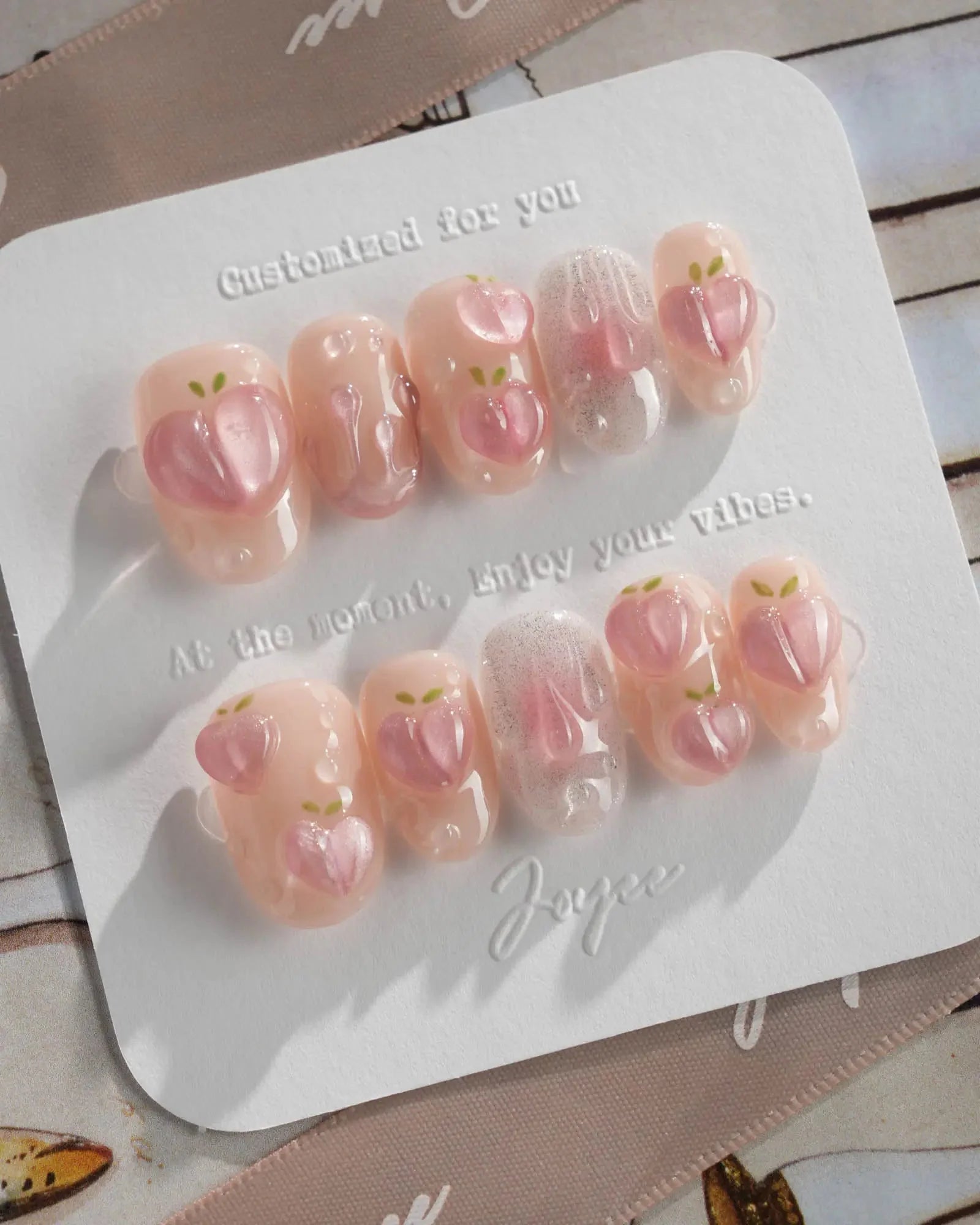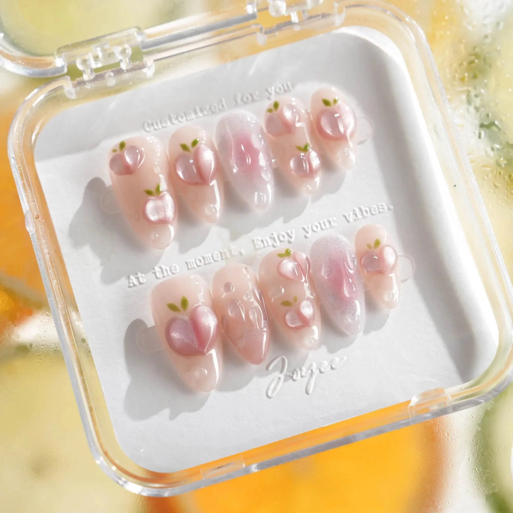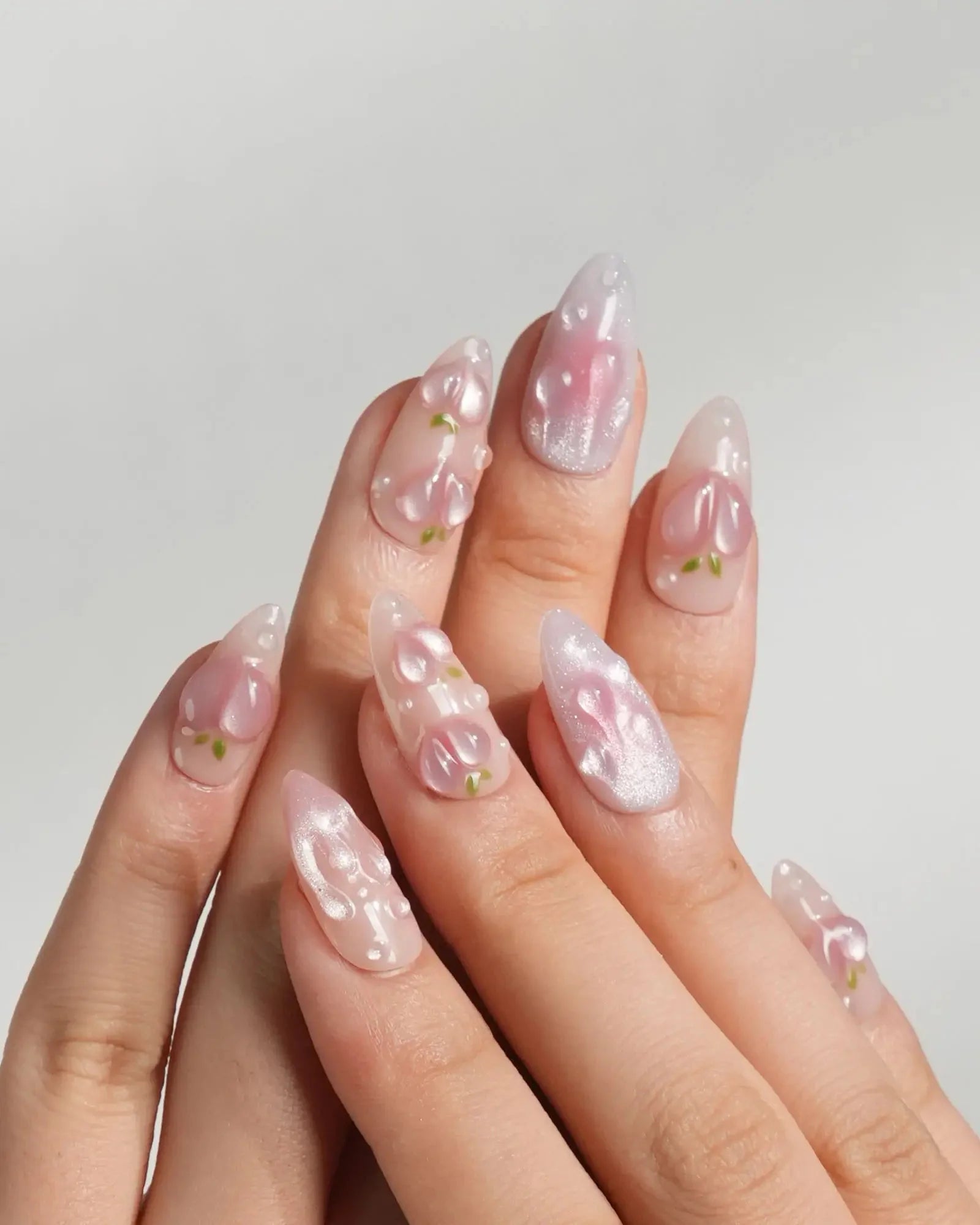 These Peach Nails are basically a fruity crush on your fingertips. Shimmering light pink nails meet juicy 3D peach charms and glistening dewdrop bubbles, like peach slices fresh out the fridge.