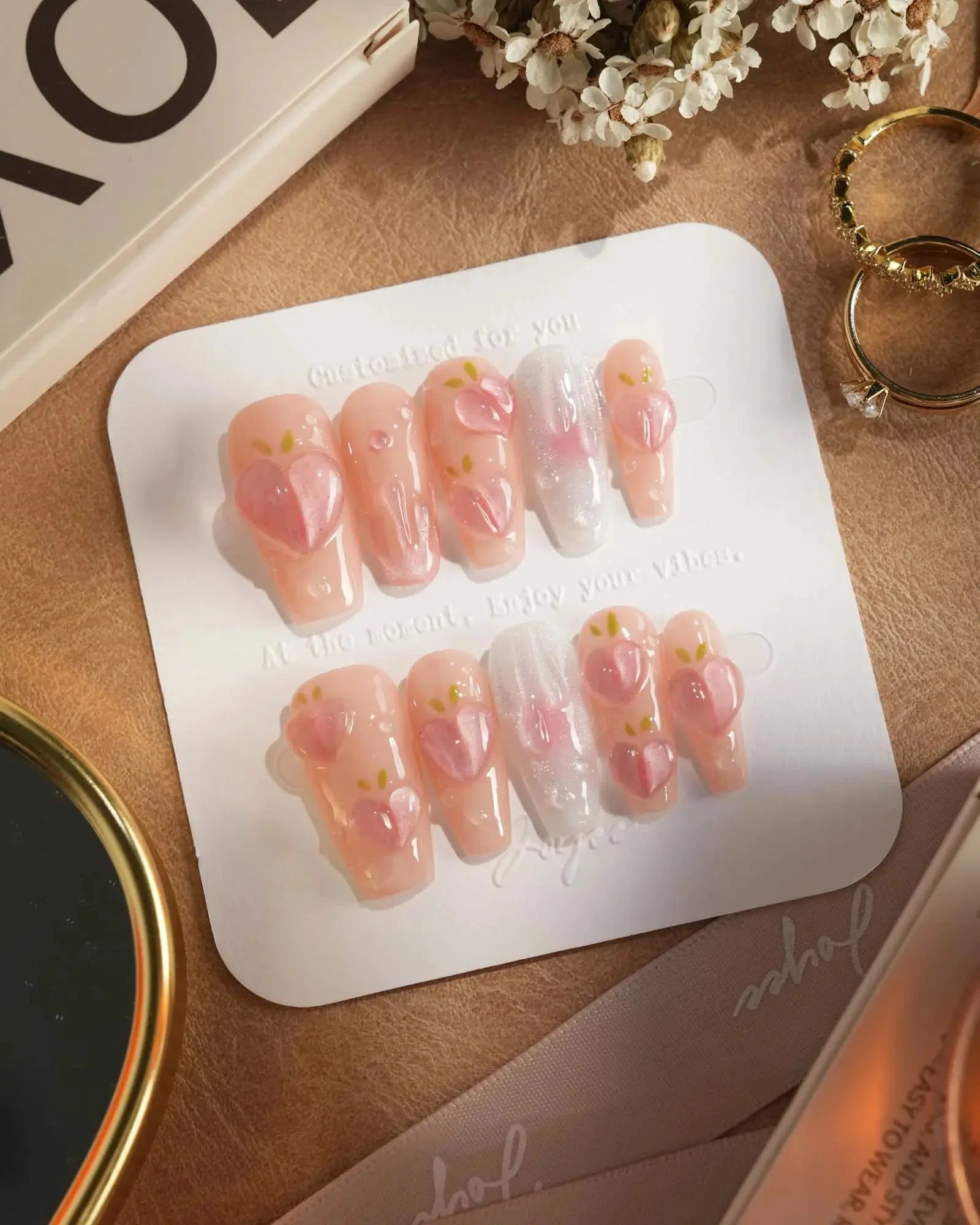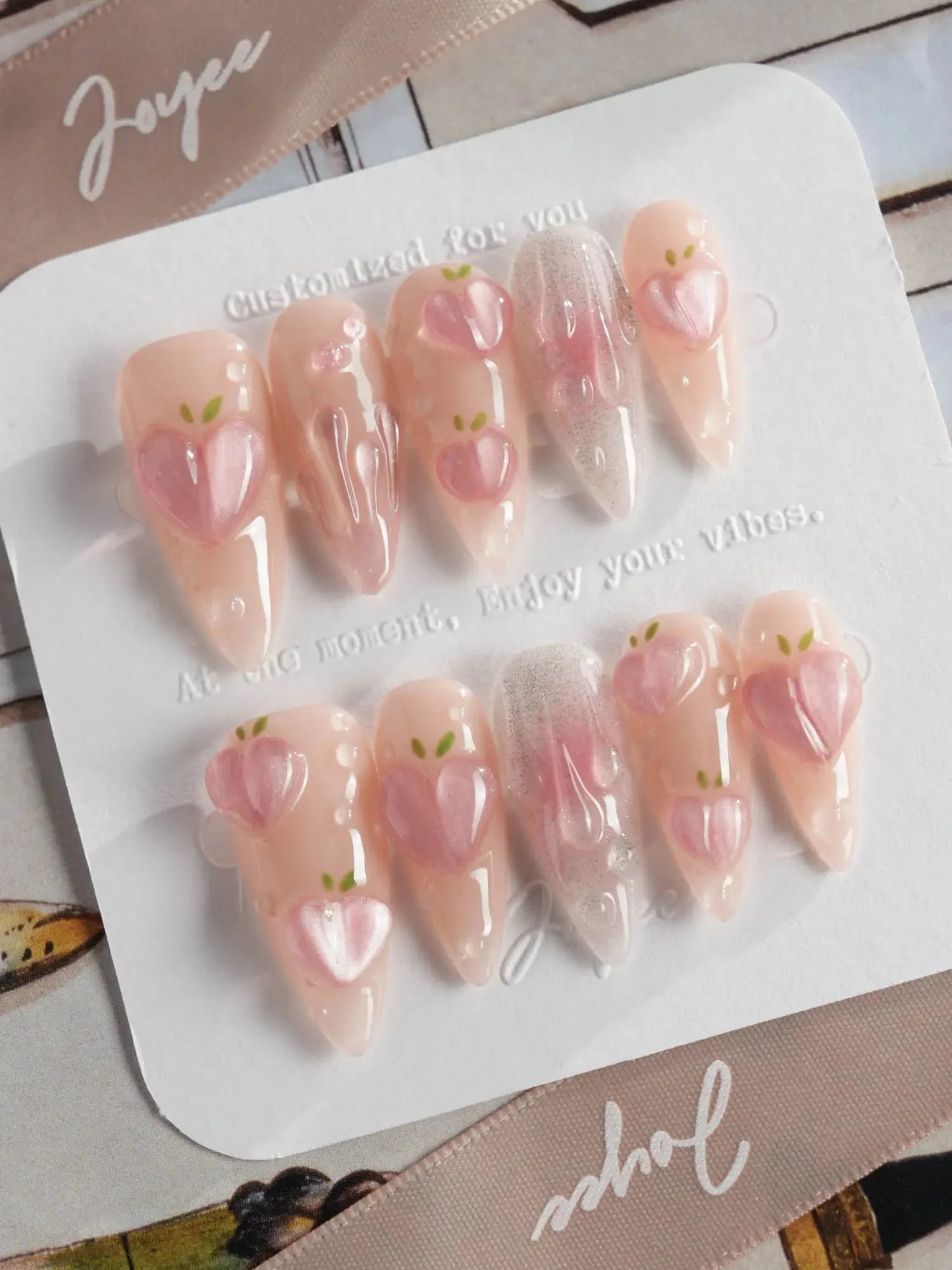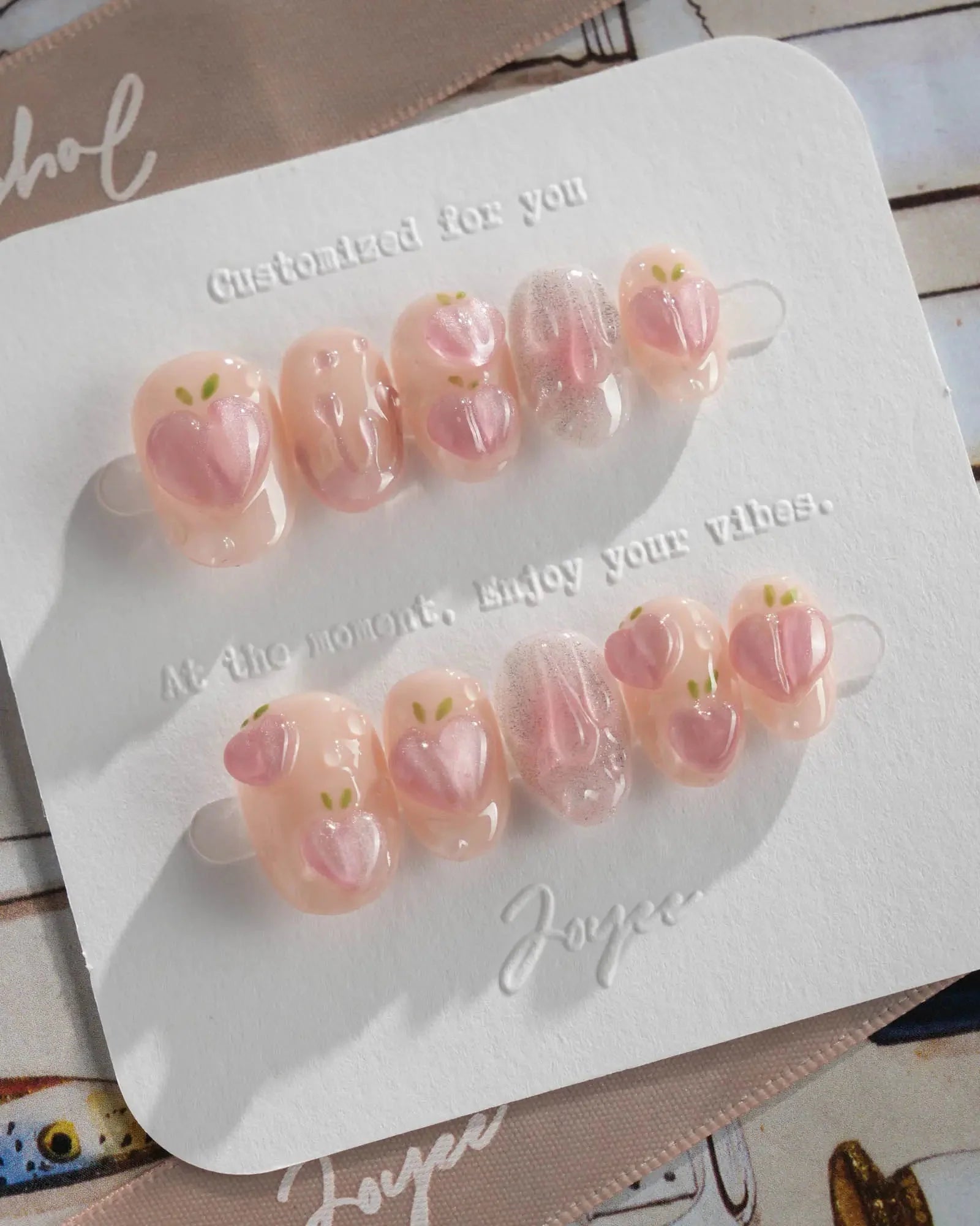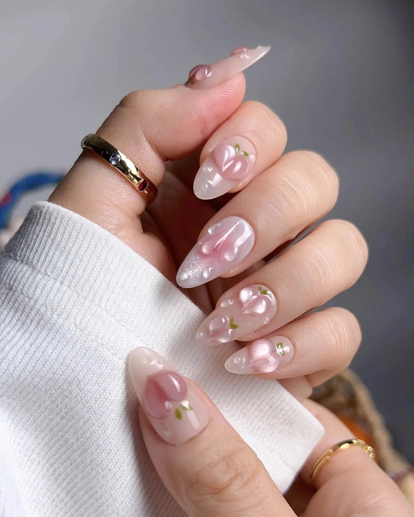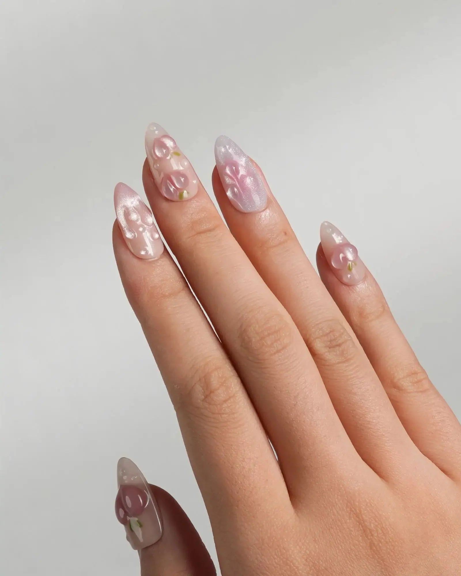 These Peach Nails are basically a fruity crush on your fingertips. Shimmering light pink nails meet juicy 3D peach charms and glistening dewdrop bubbles, like peach slices fresh out the fridge.