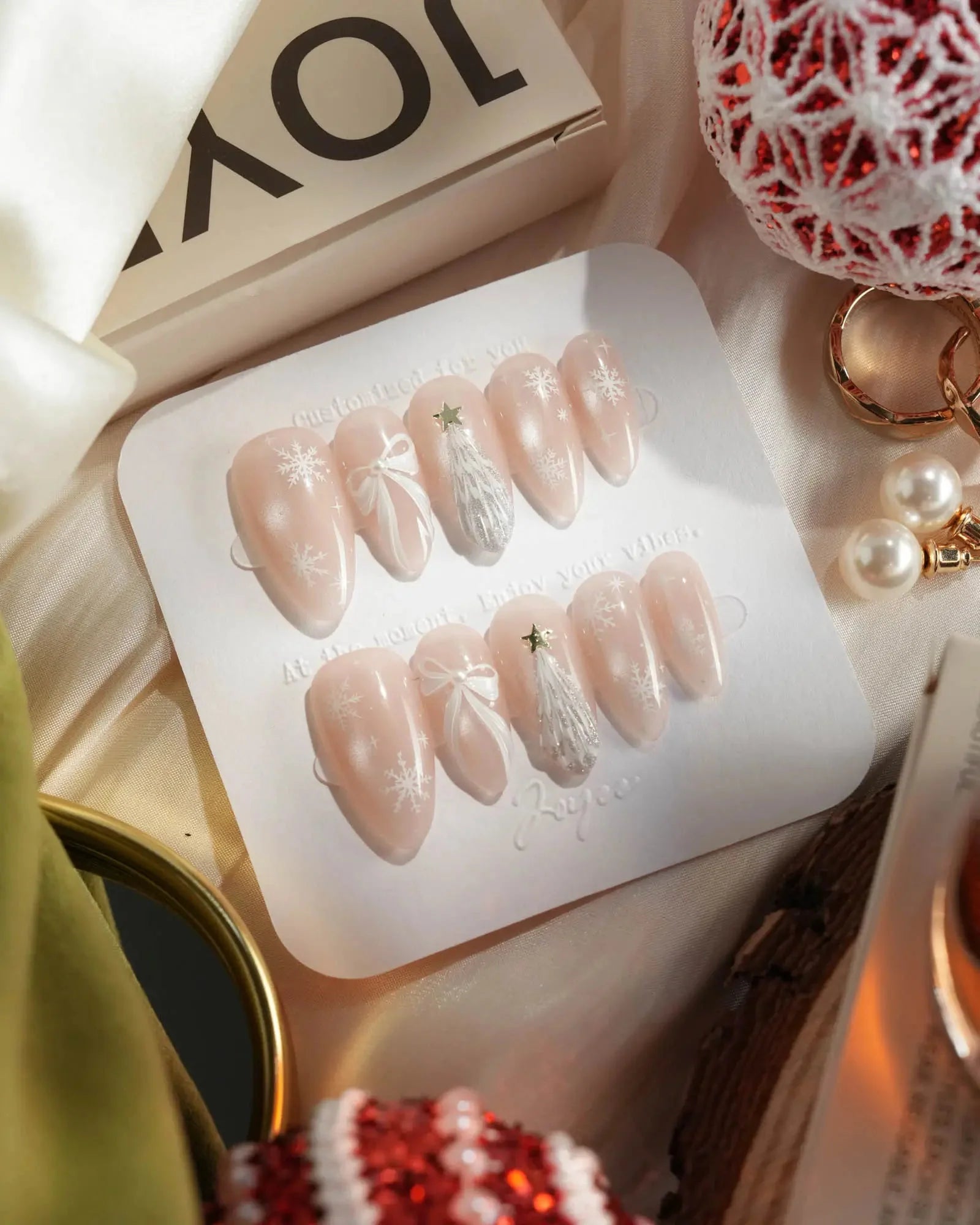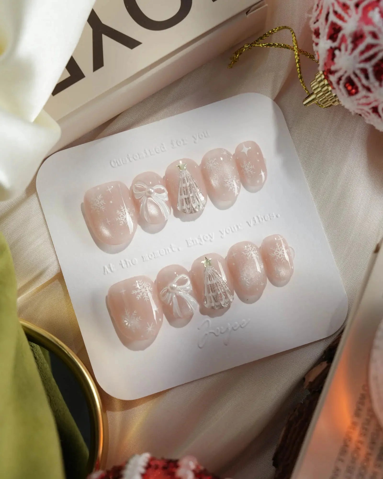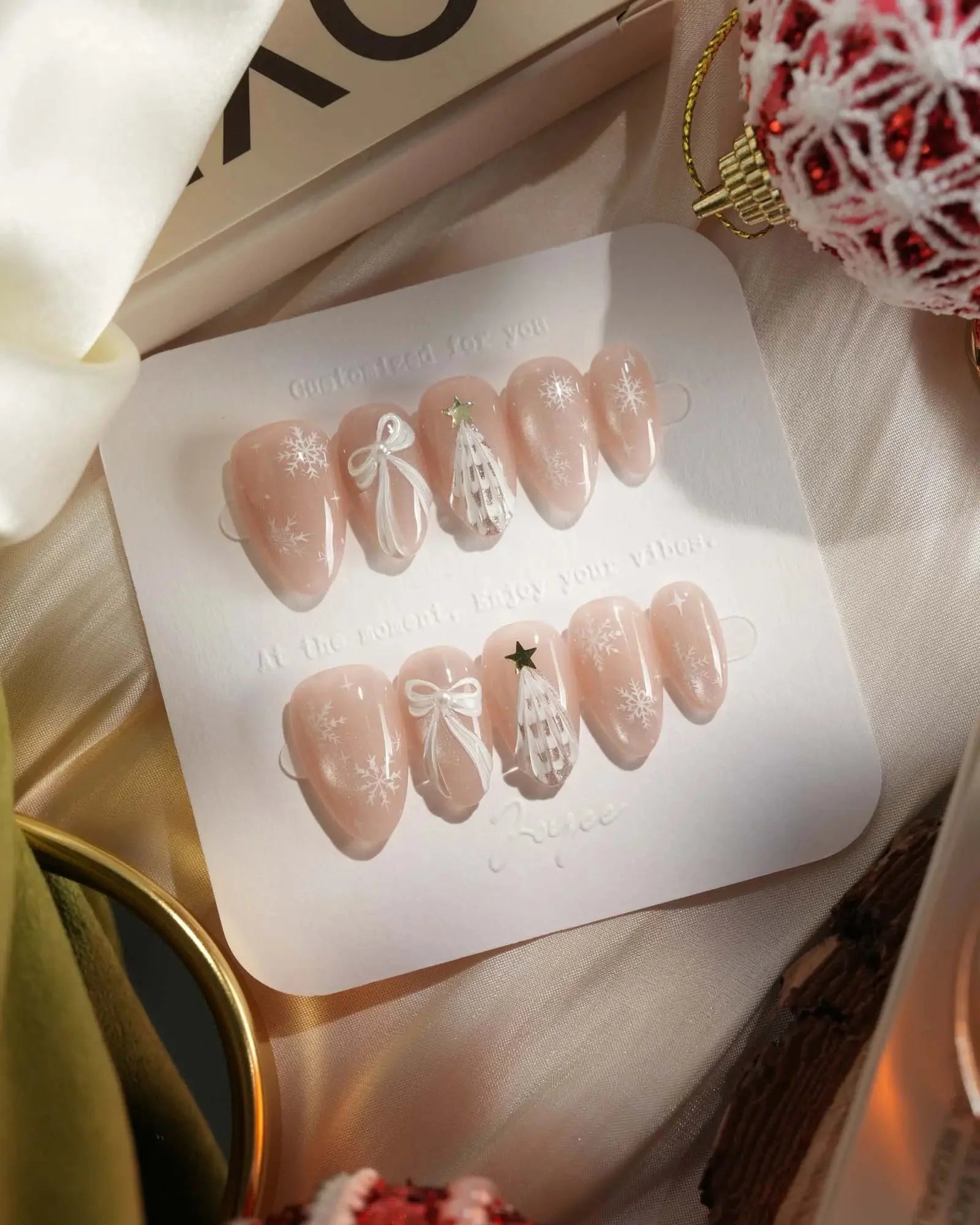 These nude Christmas nails bring a minimalist winter charm with white snowflakes, bows, and tiny stars. The cat-eye shimmer and subtle 3D Christmas tree details add elegant depth to your holiday look—perfect for daily wear, cozy gatherings, and classy Christmas parties.
