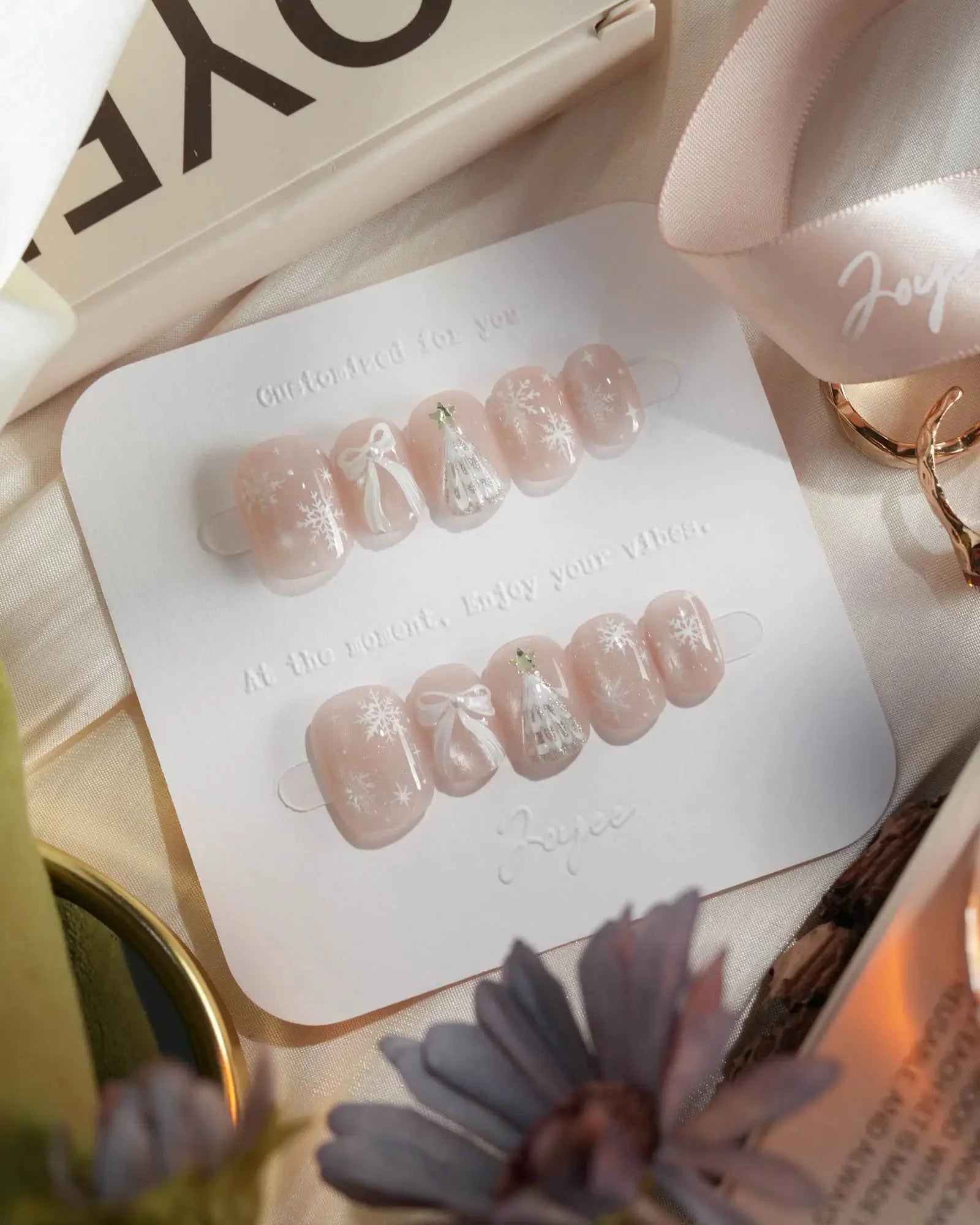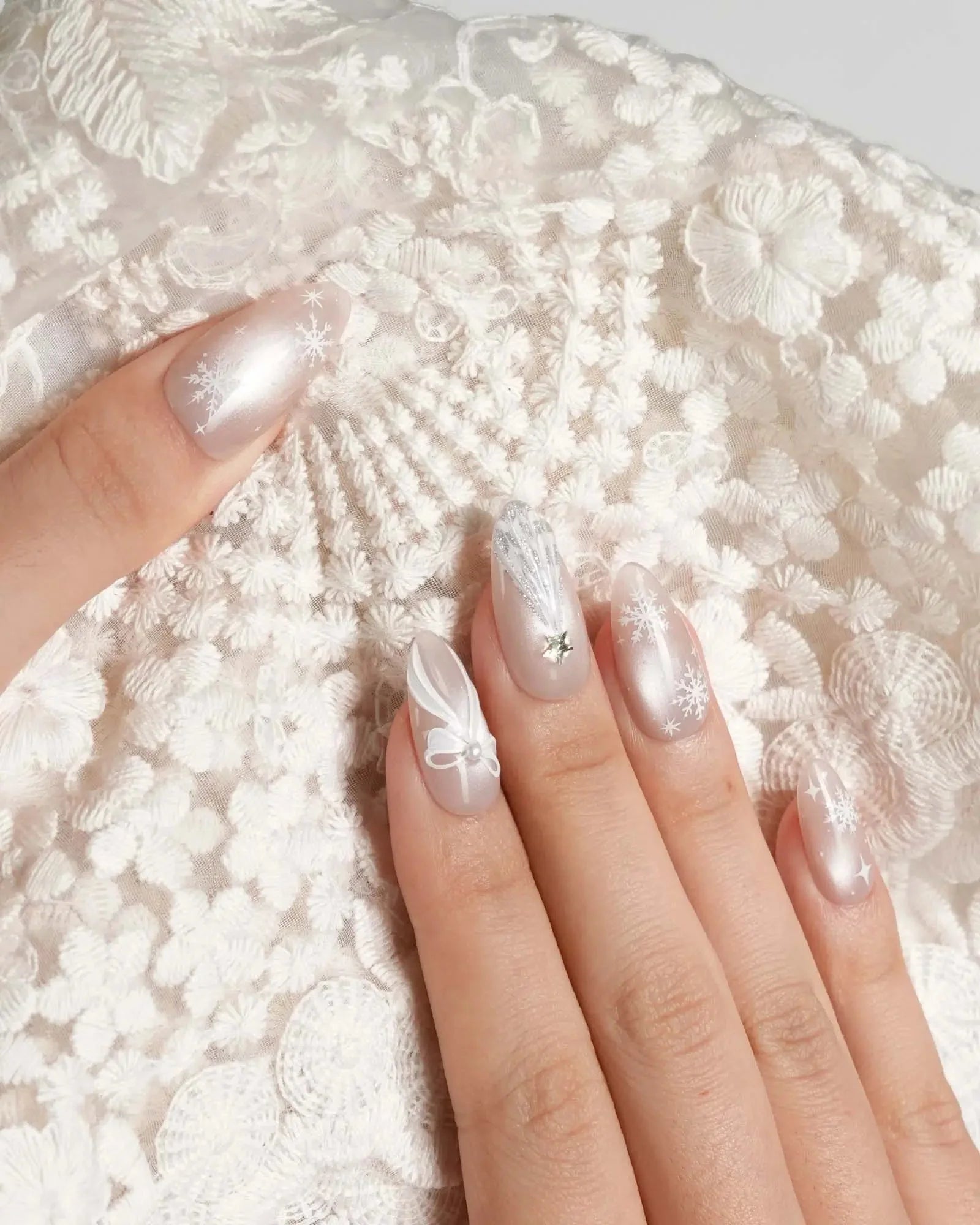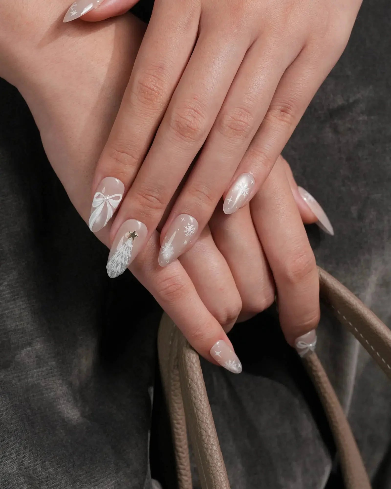 These nude Christmas nails bring a minimalist winter charm with white snowflakes, bows, and tiny stars. The cat-eye shimmer and subtle 3D Christmas tree details add elegant depth to your holiday look—perfect for daily wear, cozy gatherings, and classy Christmas parties.