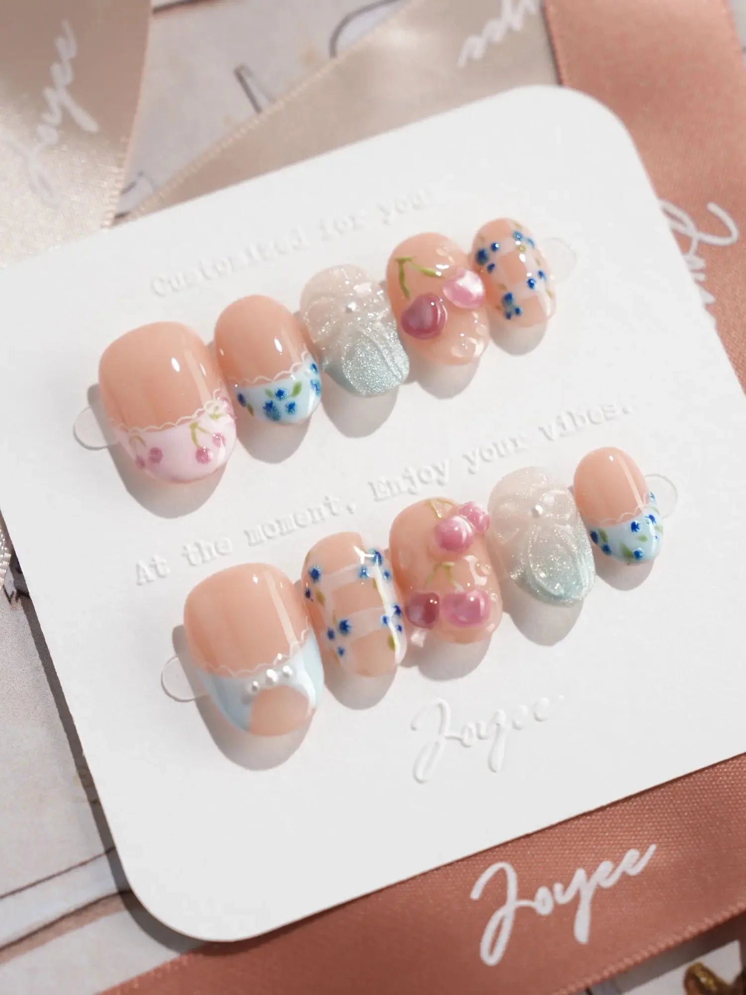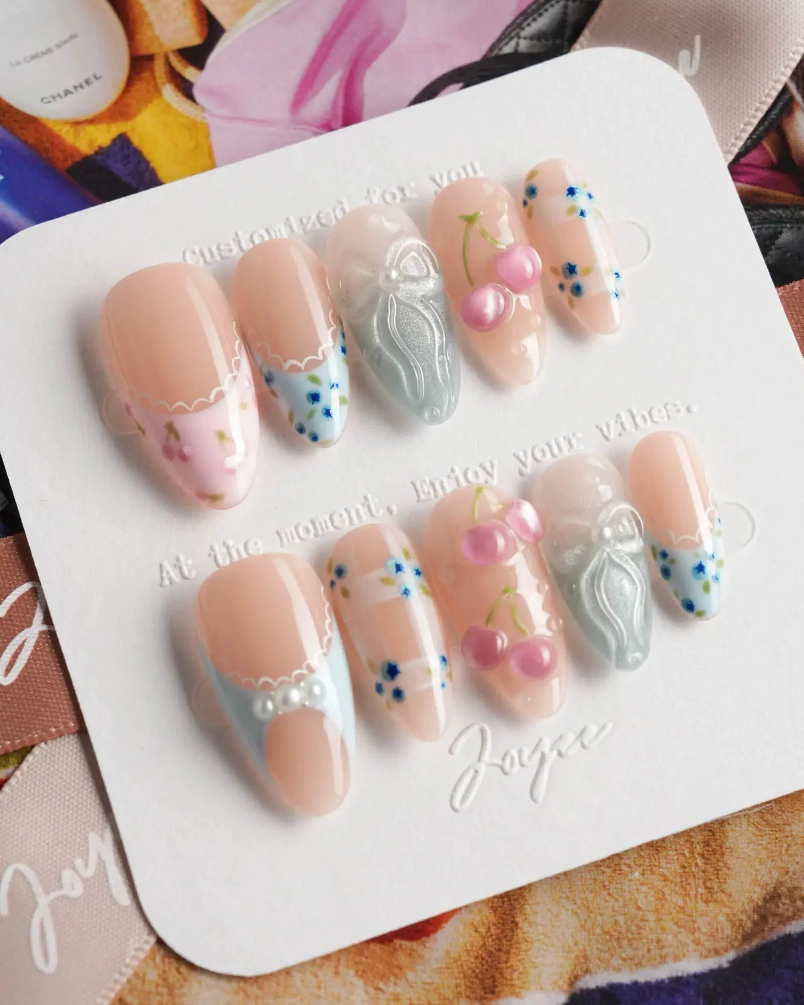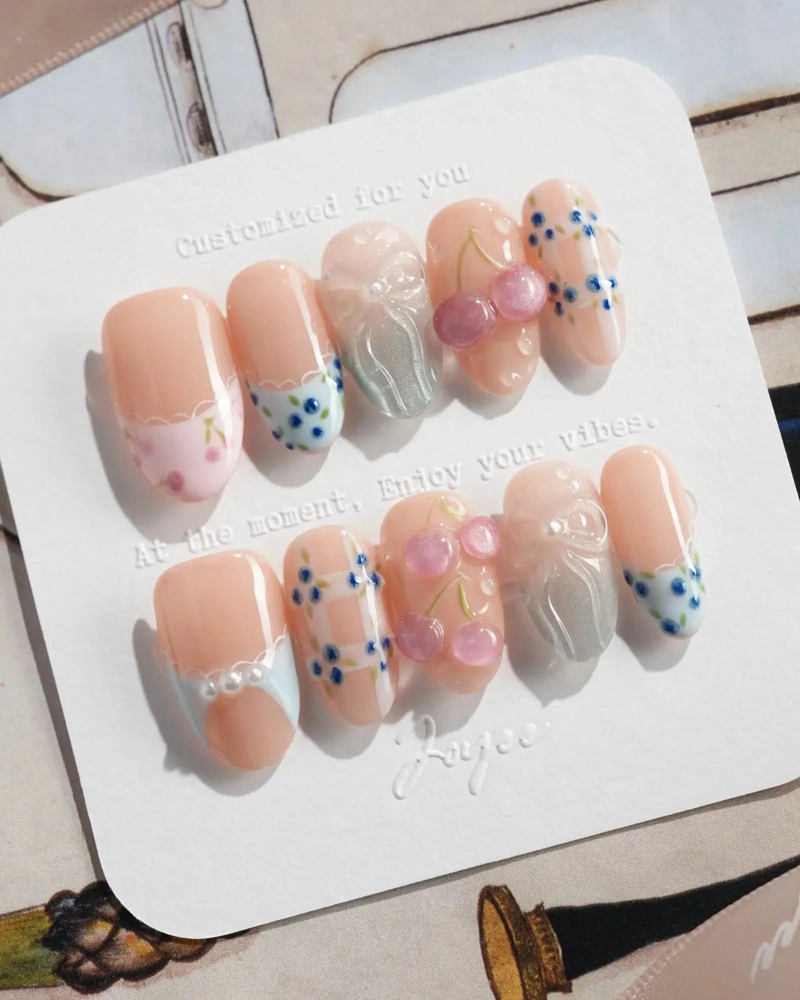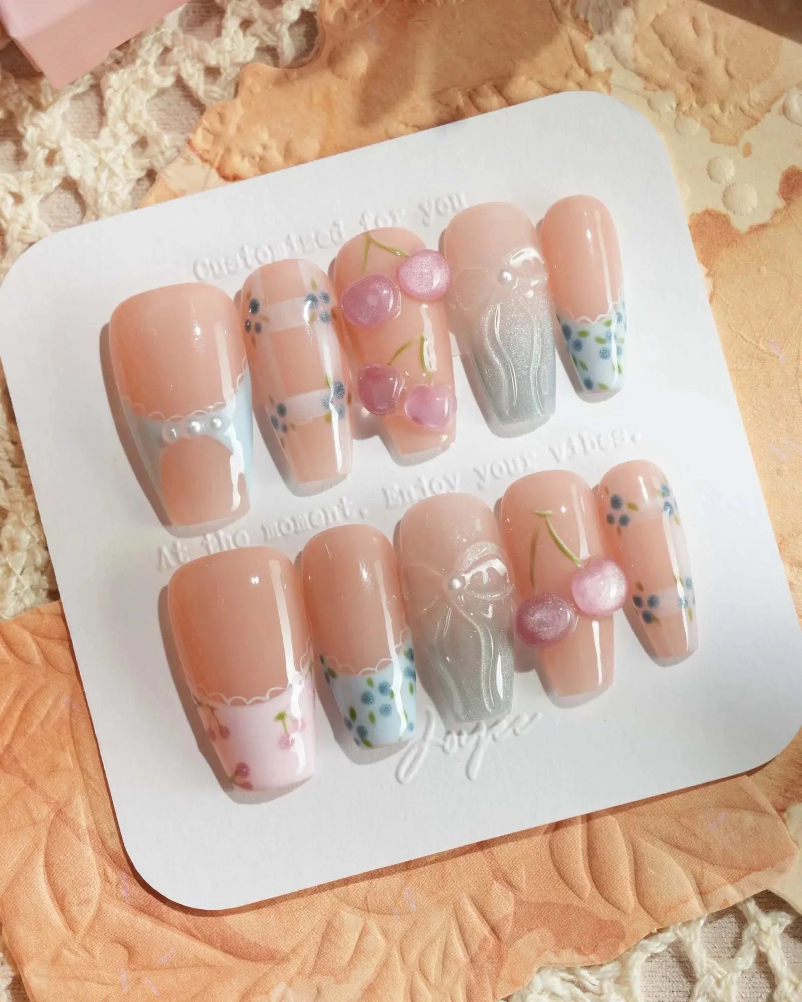 This set captures the essence of a soft summer day with pastel French tips adorned with hand-painted cherries and tiny blue florals. Sculpted 3D bows and delicate pearl accents add a layer of charm, perfect for a cottagecore picnic or a sweet girl summer vibe. Designed in soothing nude tones with hints of pink and blue, these press-ons bring together fruity freshness and vintage romance in every detail.