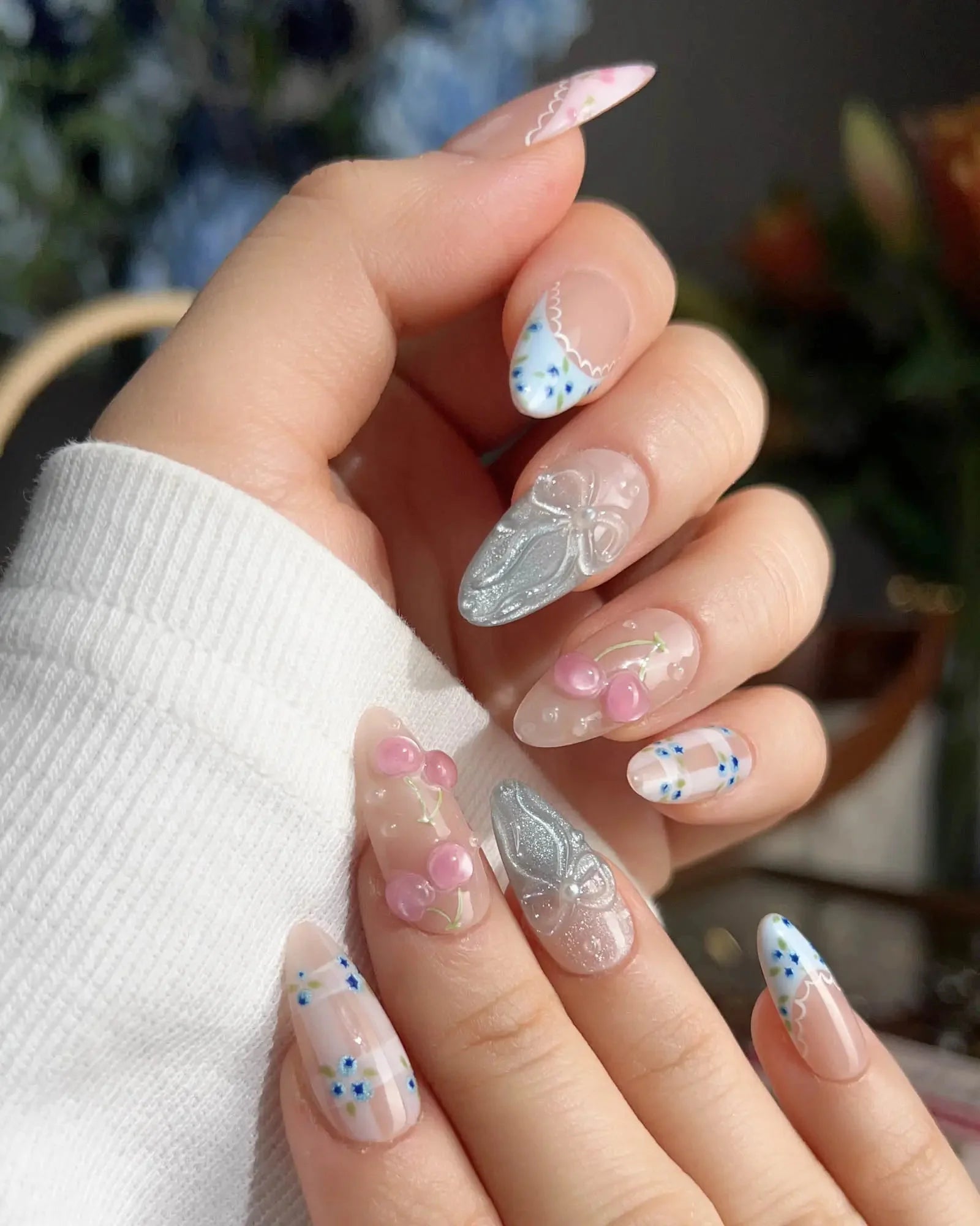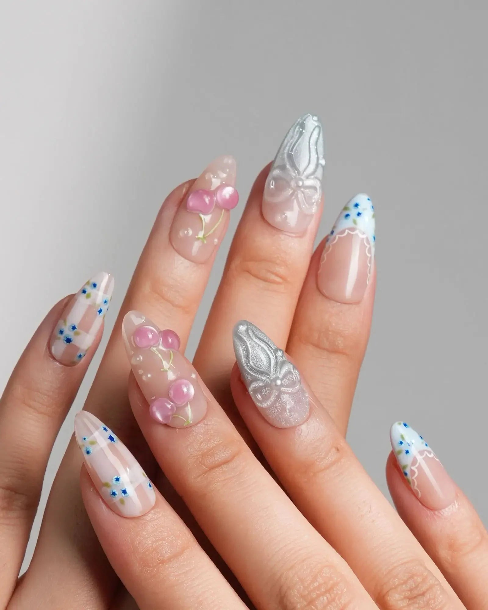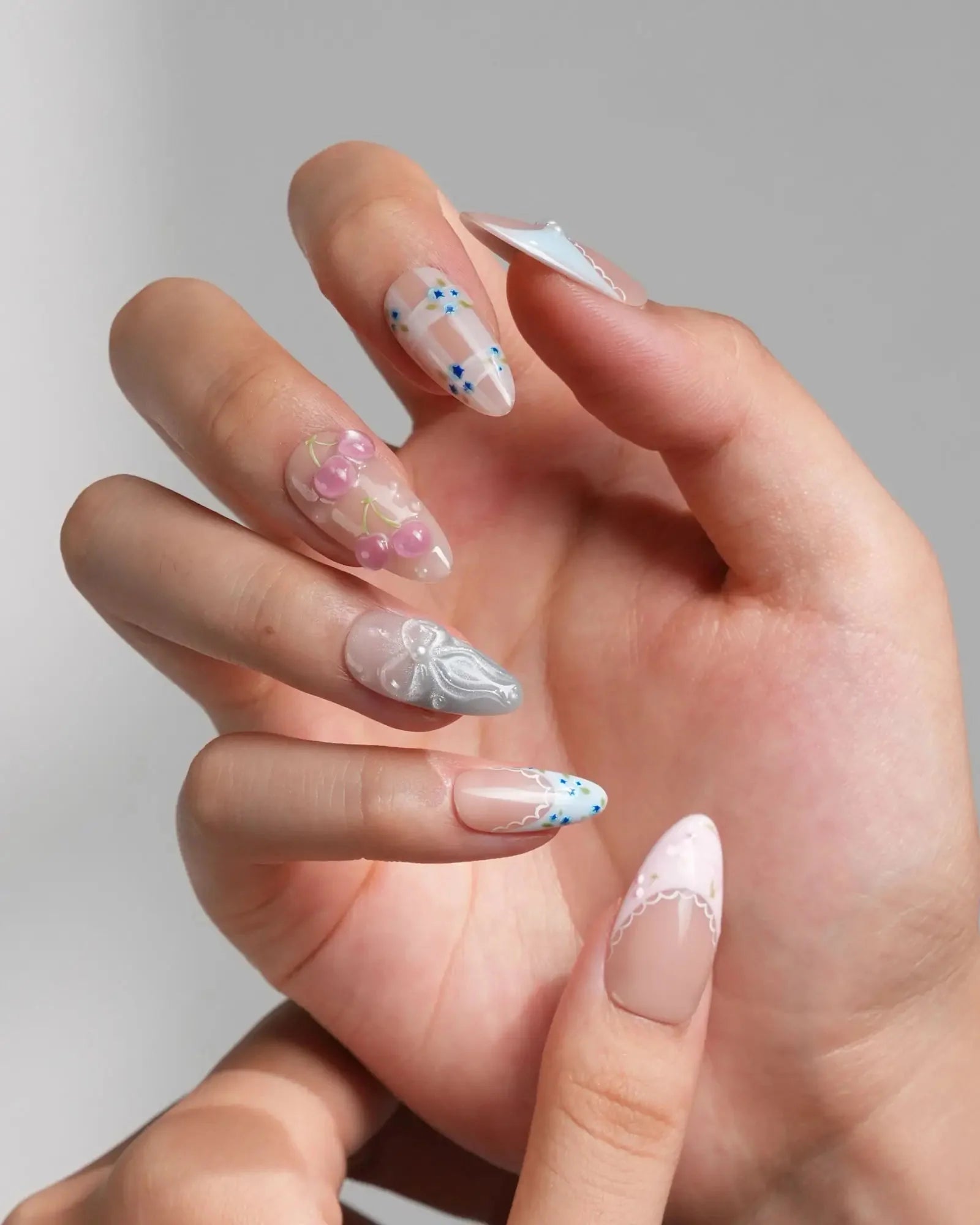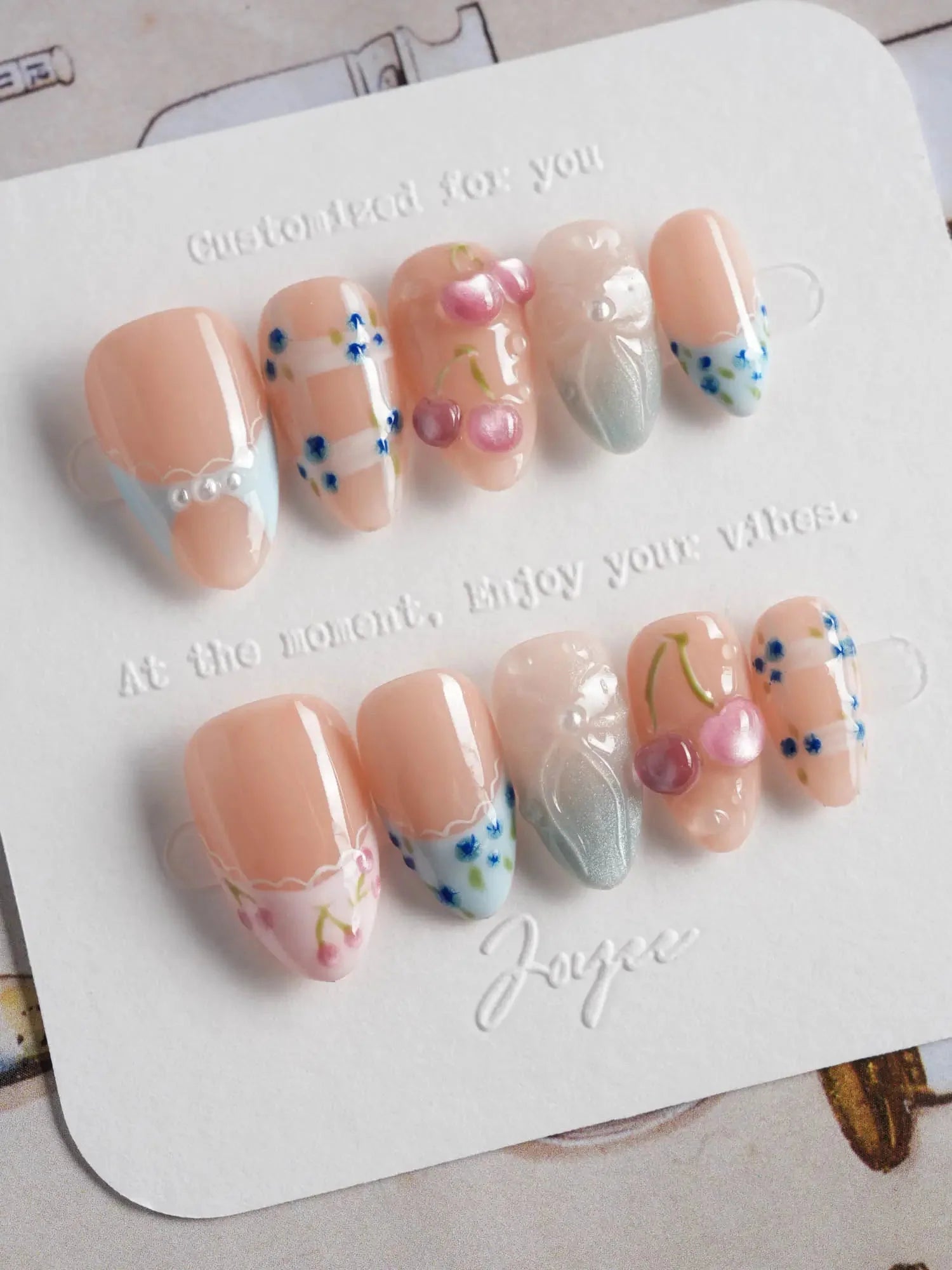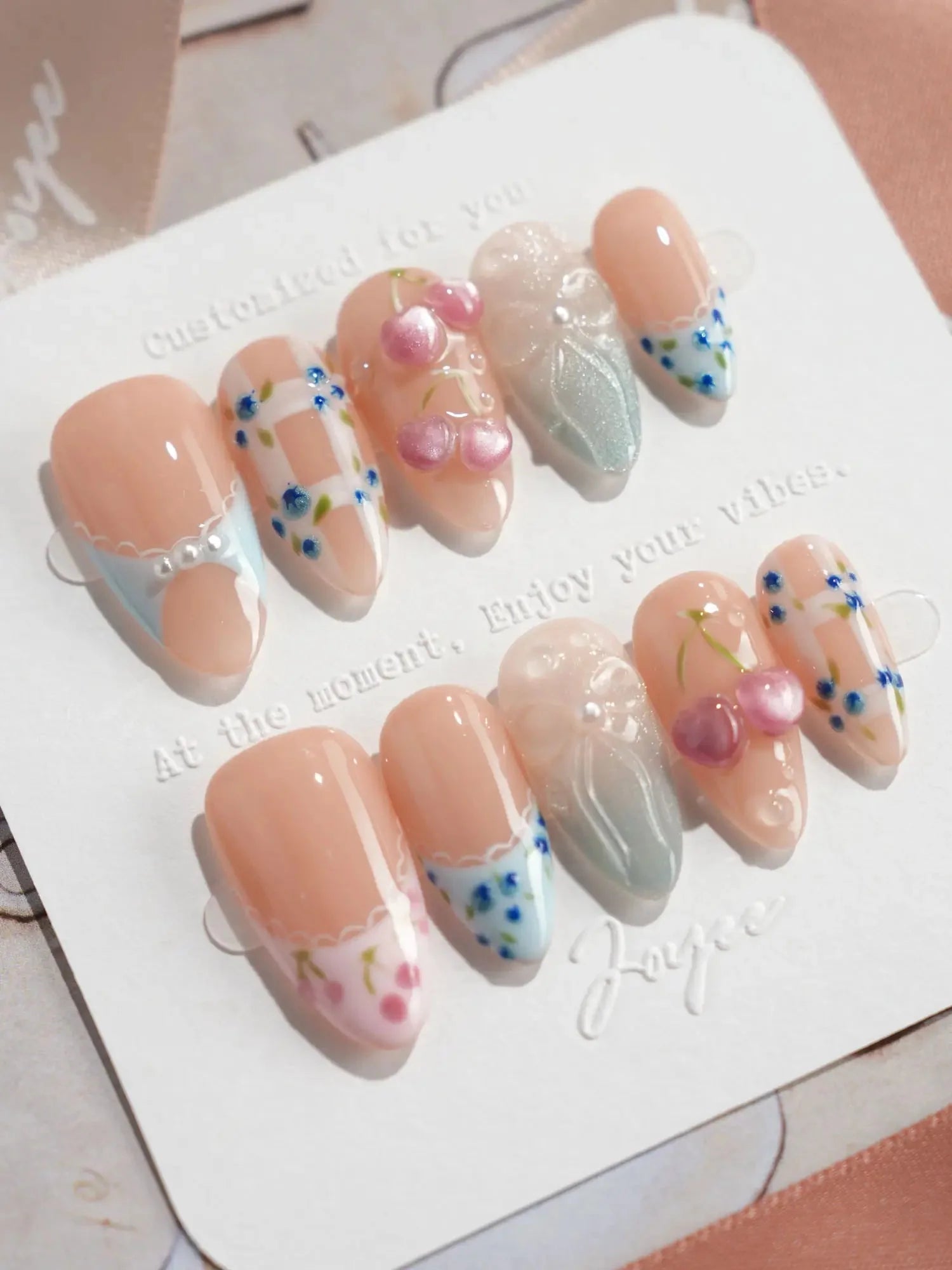 This set captures the essence of a soft summer day with pastel French tips adorned with hand-painted cherries and tiny blue florals. Sculpted 3D bows and delicate pearl accents add a layer of charm, perfect for a cottagecore picnic or a sweet girl summer vibe. Designed in soothing nude tones with hints of pink and blue, these press-ons bring together fruity freshness and vintage romance in every detail.