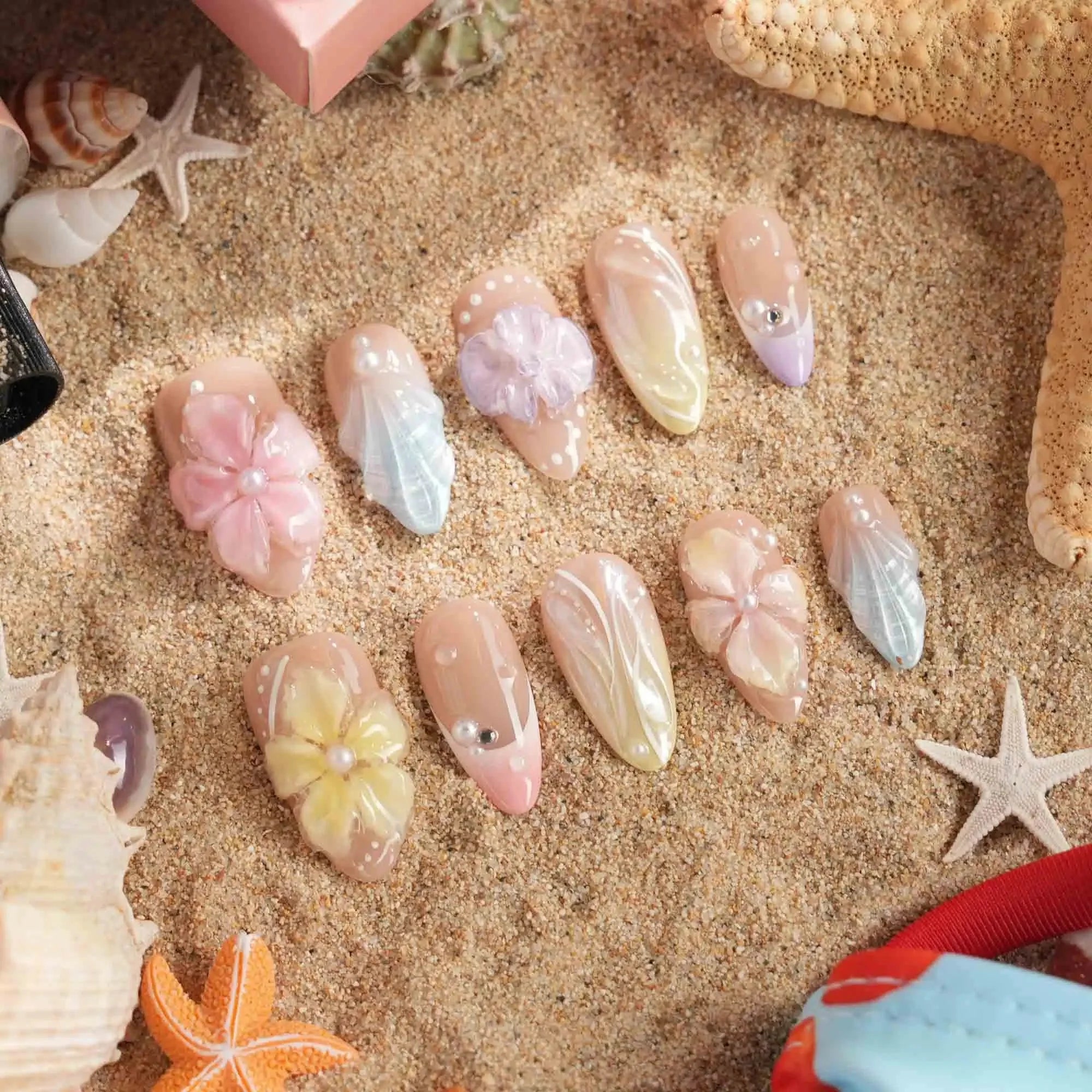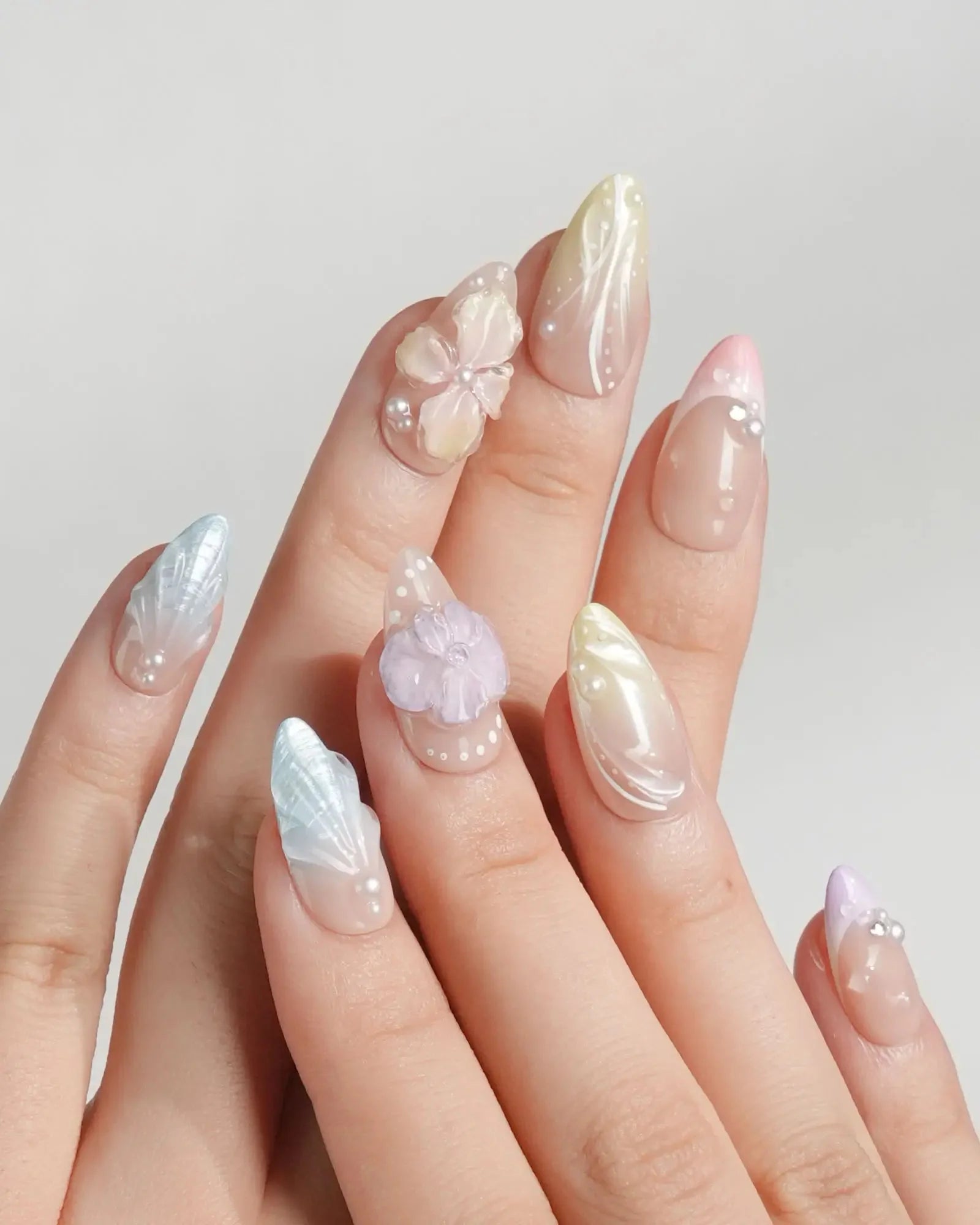 This set feels like a pastel island soaking up the midday sun. A soft macaron base is topped with a sheer chrome finish—perfect for sunbathing by the pool, golden-hour dates, or a glowing summer OOTD.