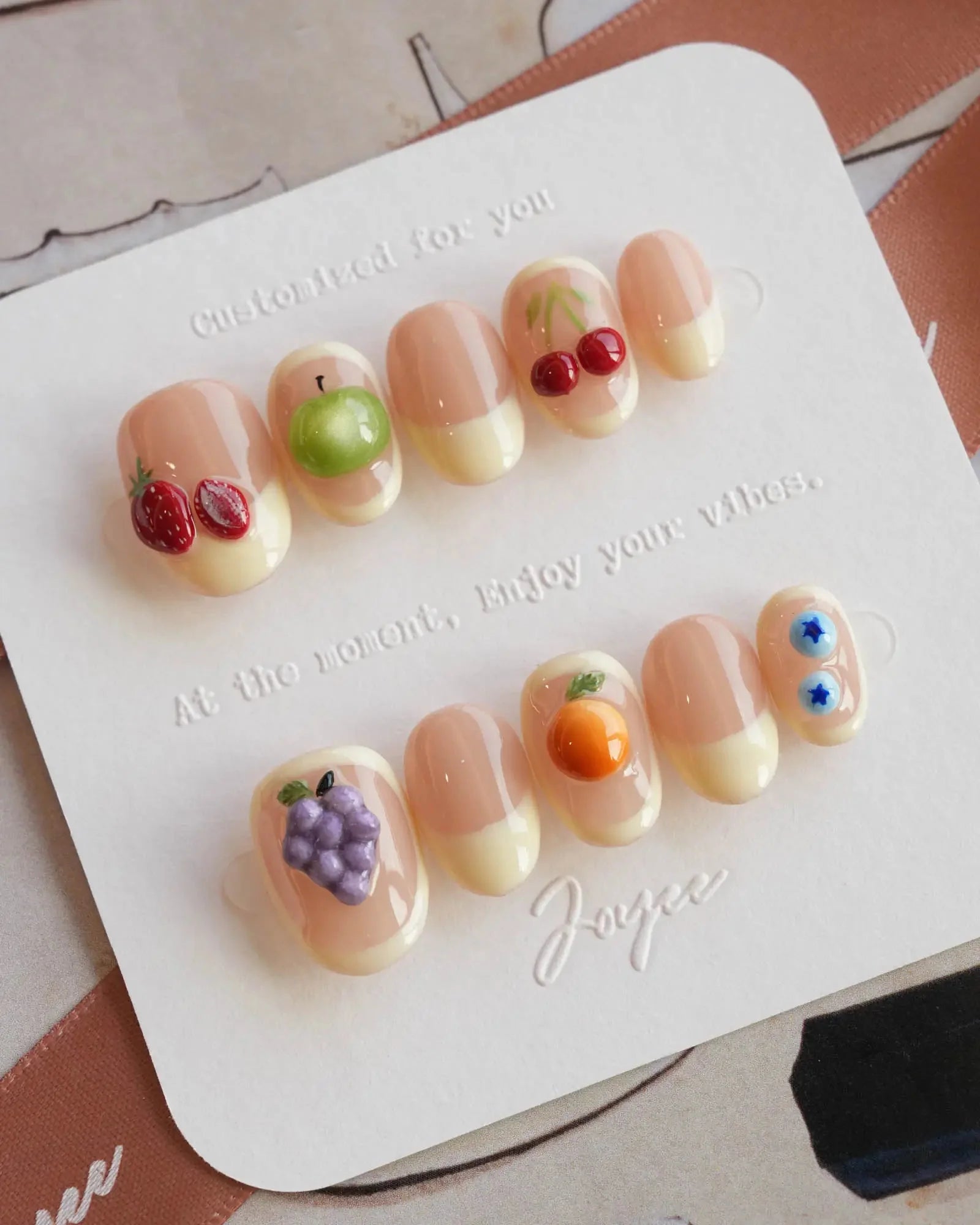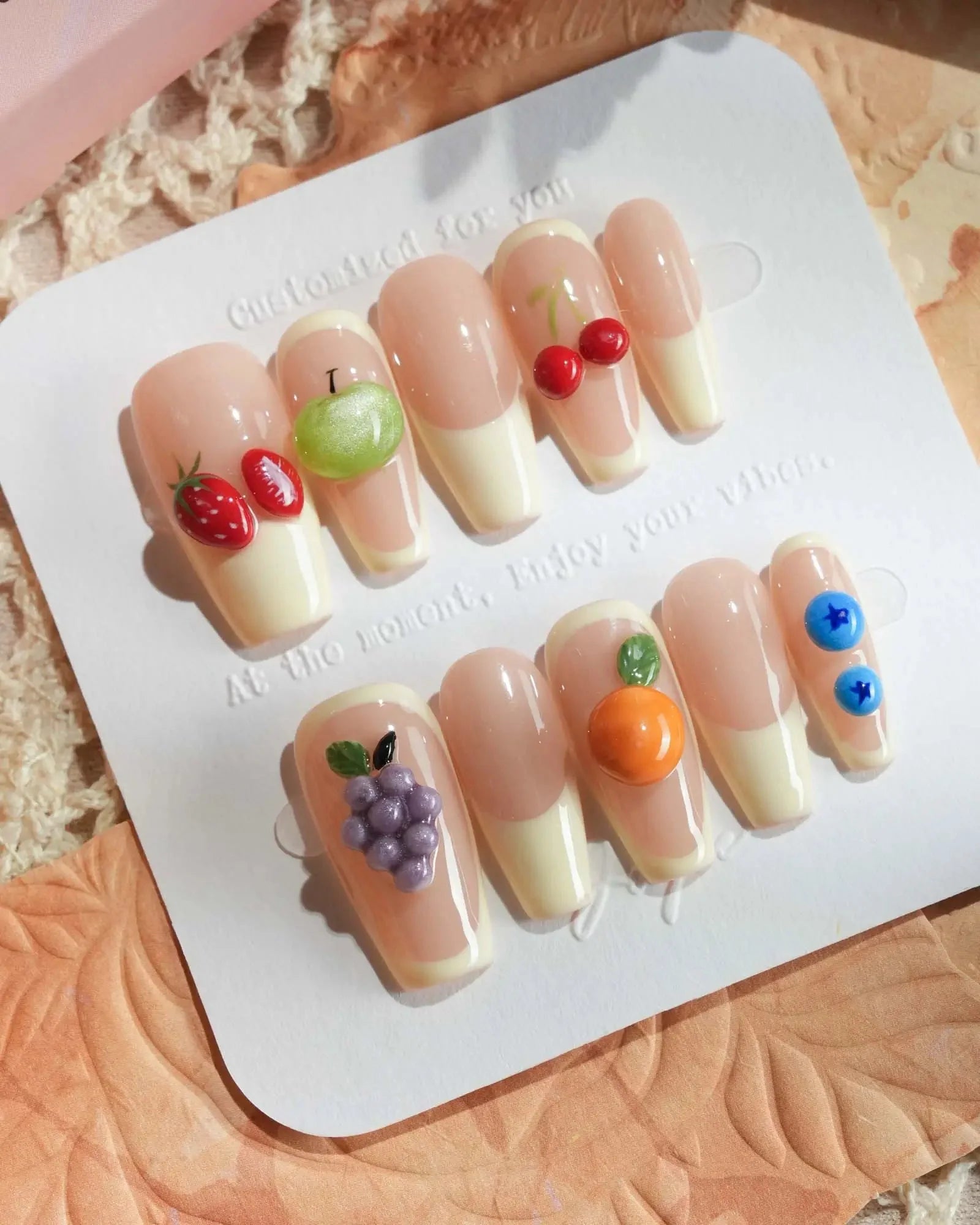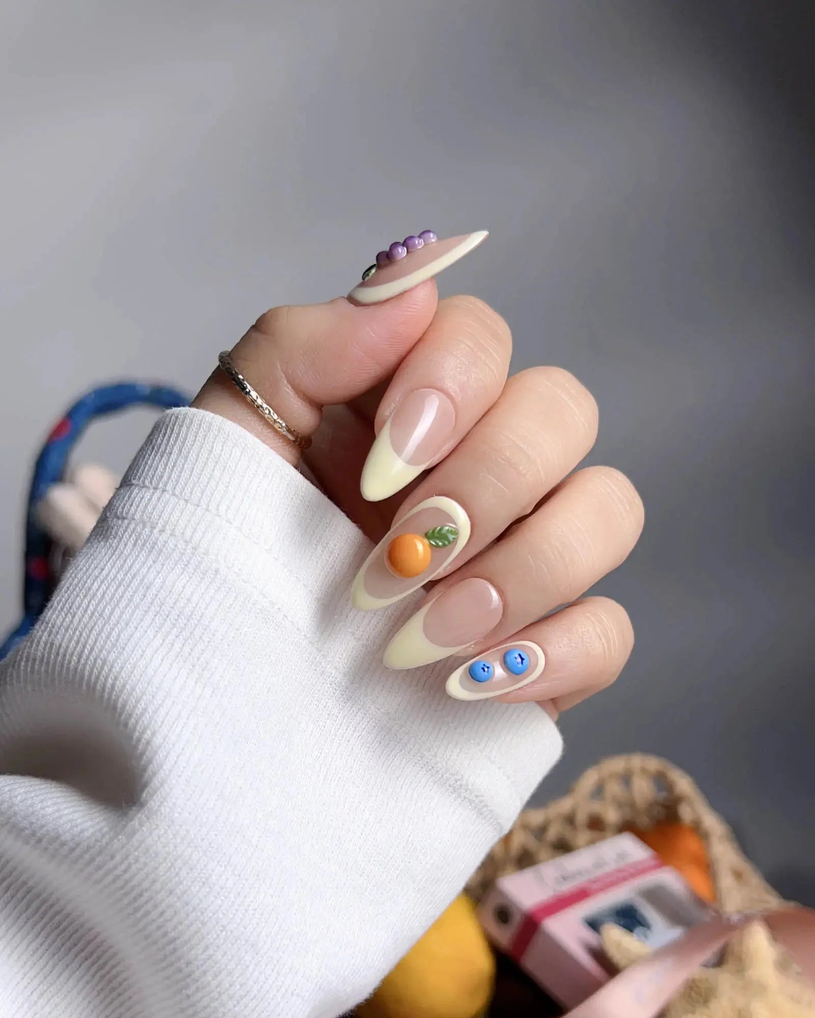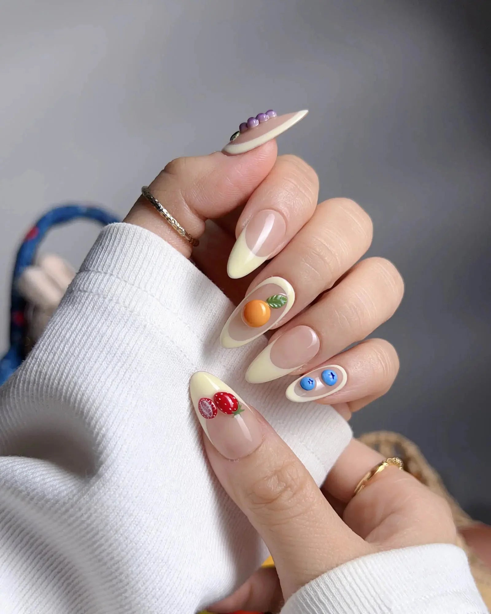 Lemon yellows meet pastel peaches and berries in this French-tip mix. The vibe is light, refined, and summery—like sipping iced tea under striped umbrellas. Style it with a linen top, ballet flats, and messy hair buns.