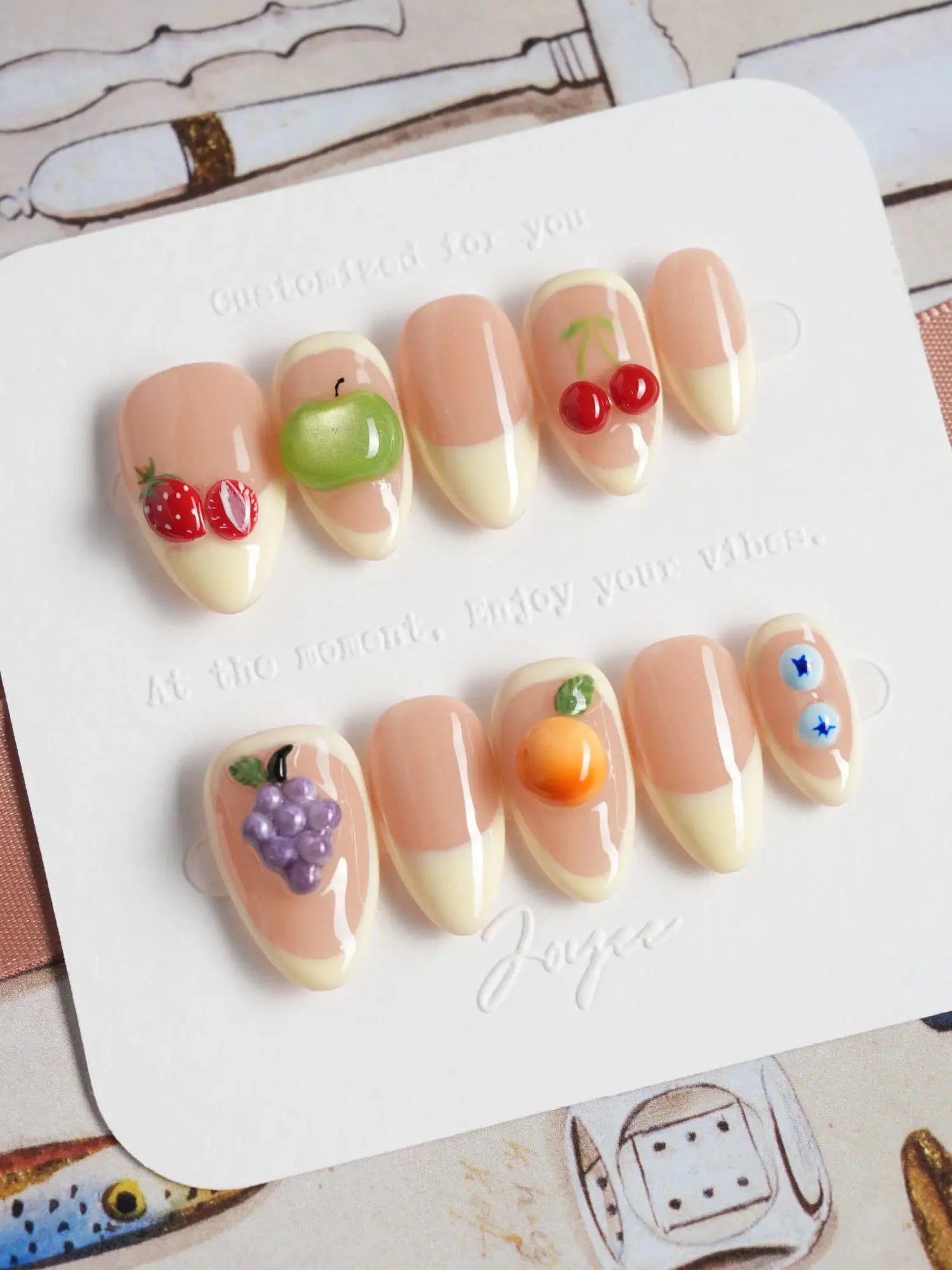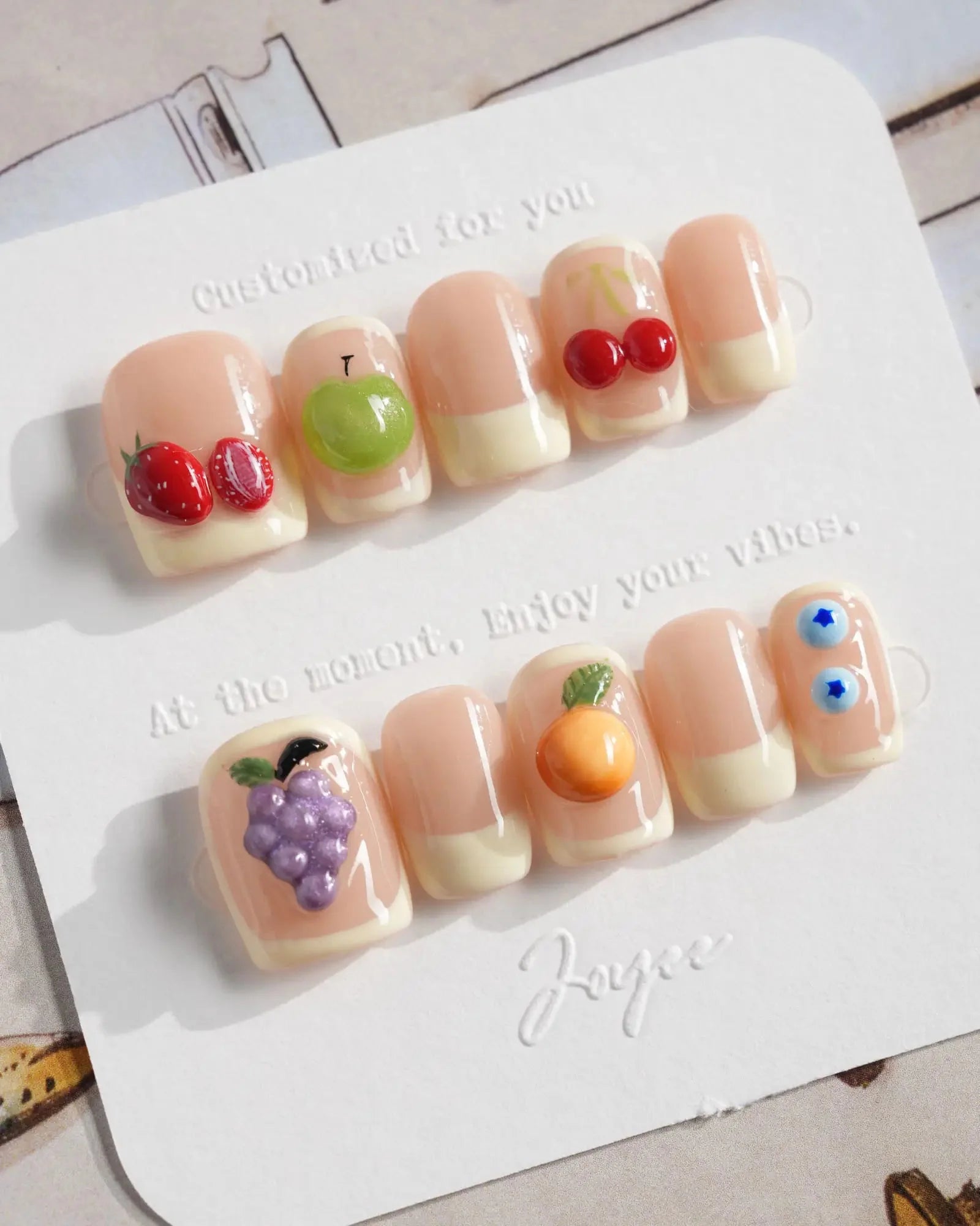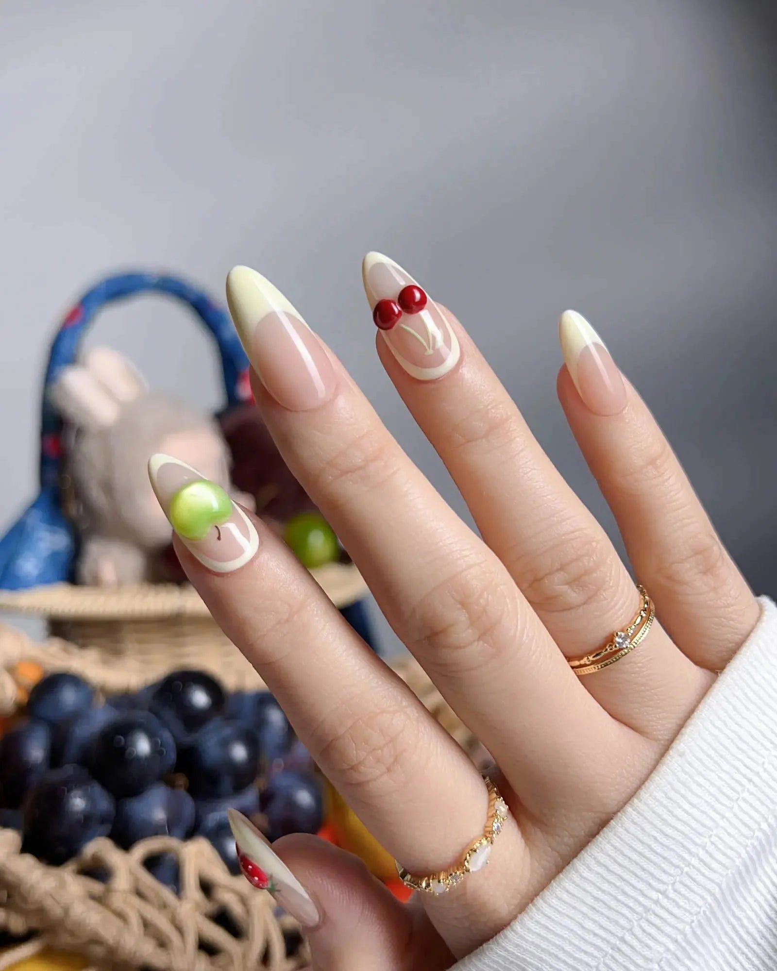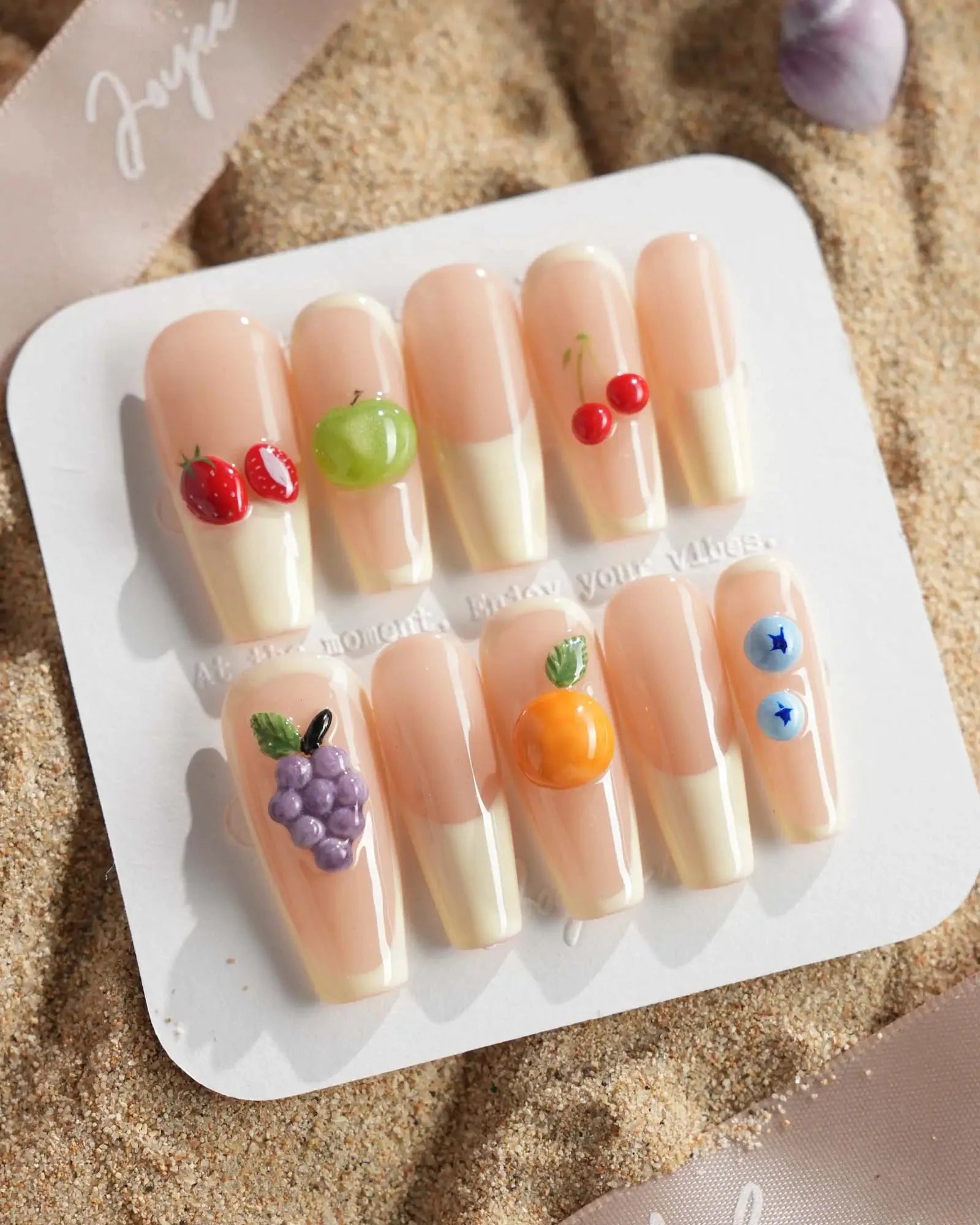 Lemon yellows meet pastel peaches and berries in this French-tip mix. The vibe is light, refined, and summery—like sipping iced tea under striped umbrellas. Style it with a linen top, ballet flats, and messy hair buns.