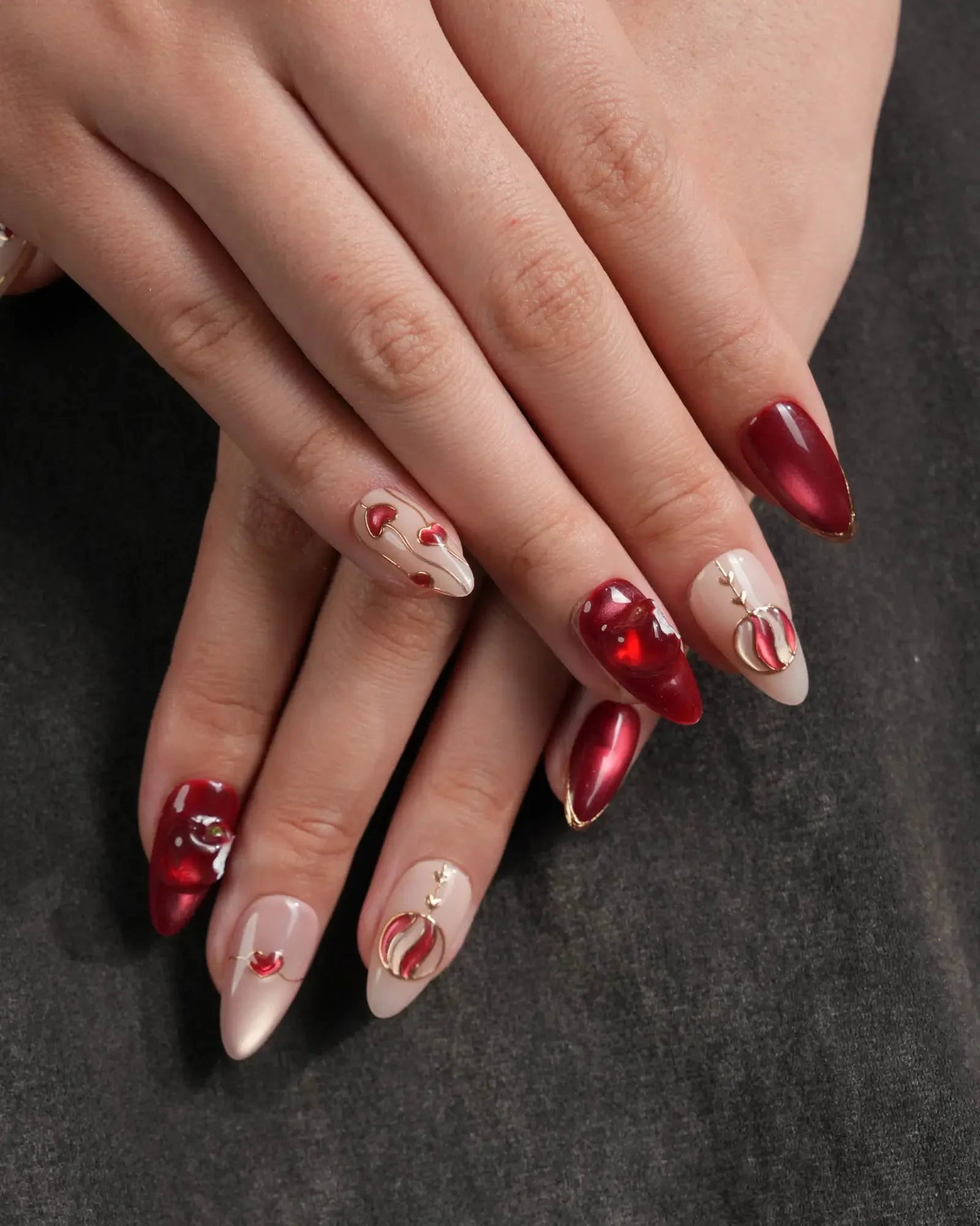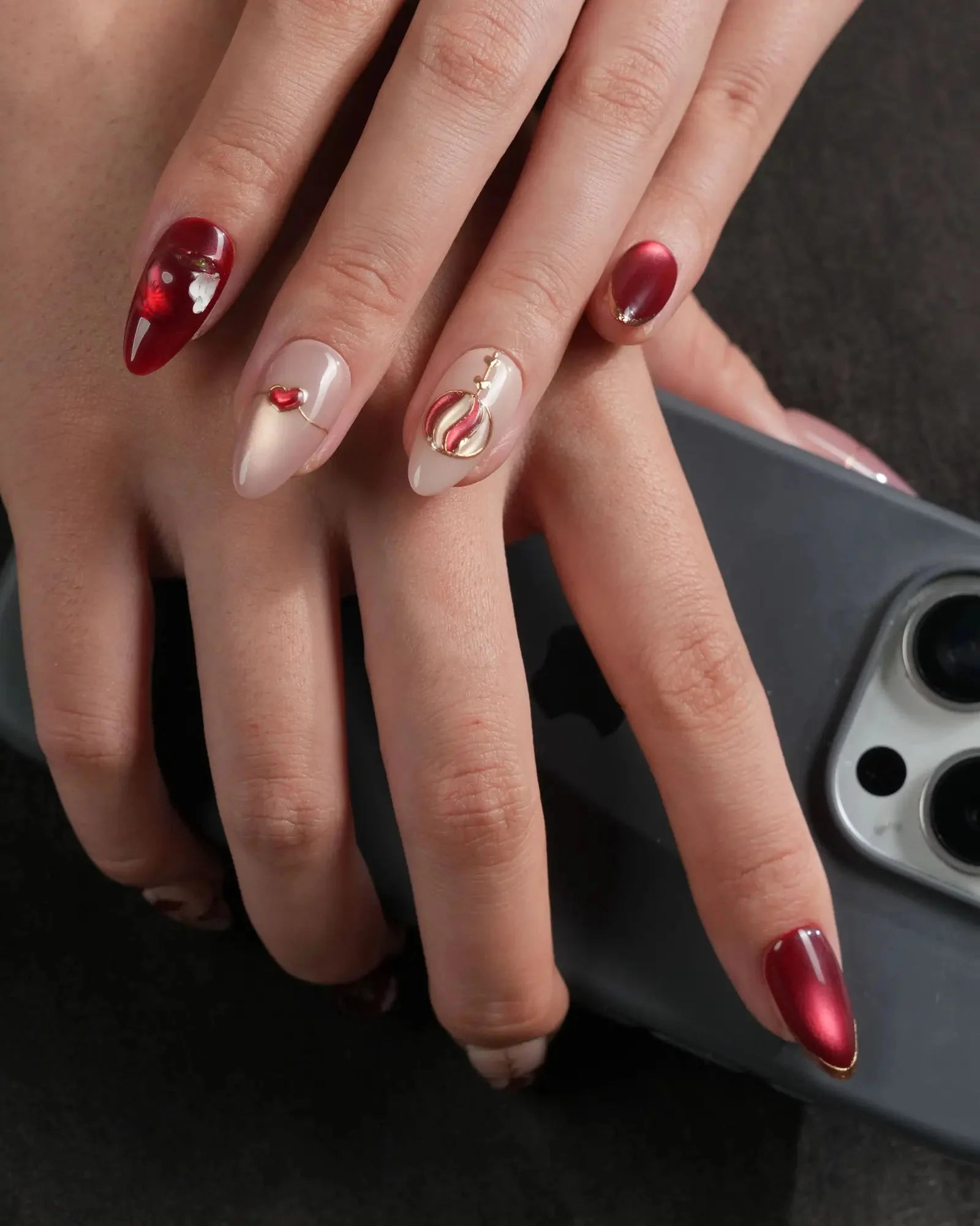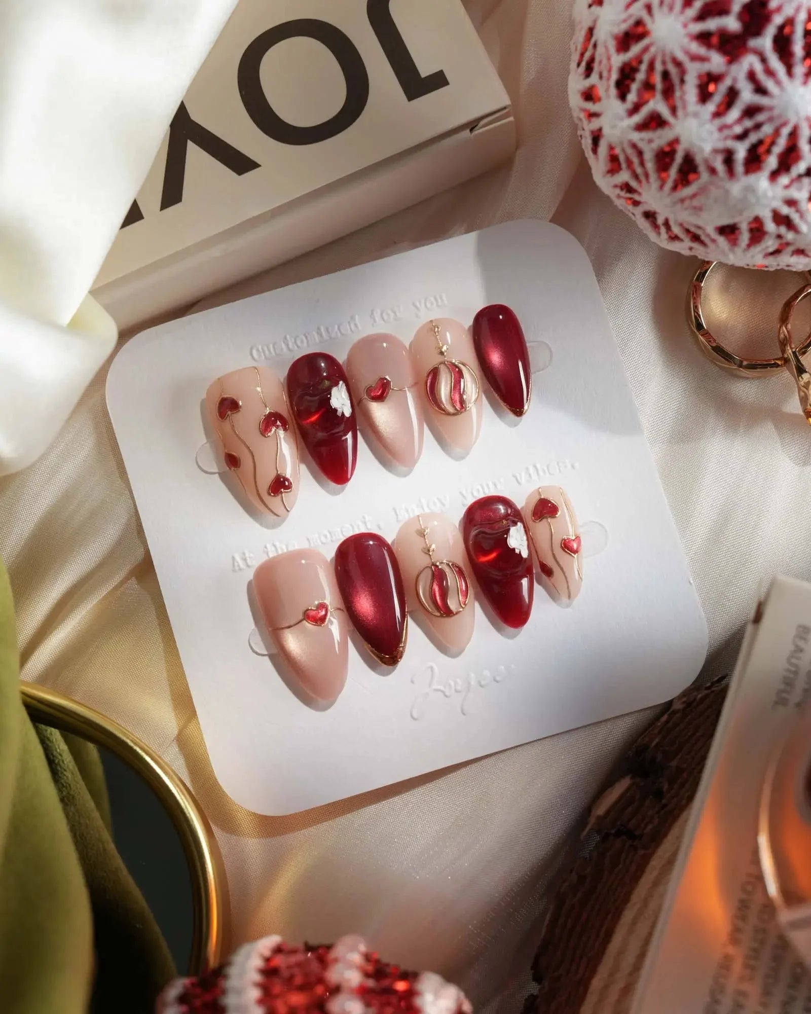 This Christmas-inspired red press-on nail set combines glossy cat-eye effects with 3D apple and ornament details. Accented with fine gold lines and sculpted gel designs, it’s both chic and festive—perfect for cozy winter gatherings or sparkling holiday parties.