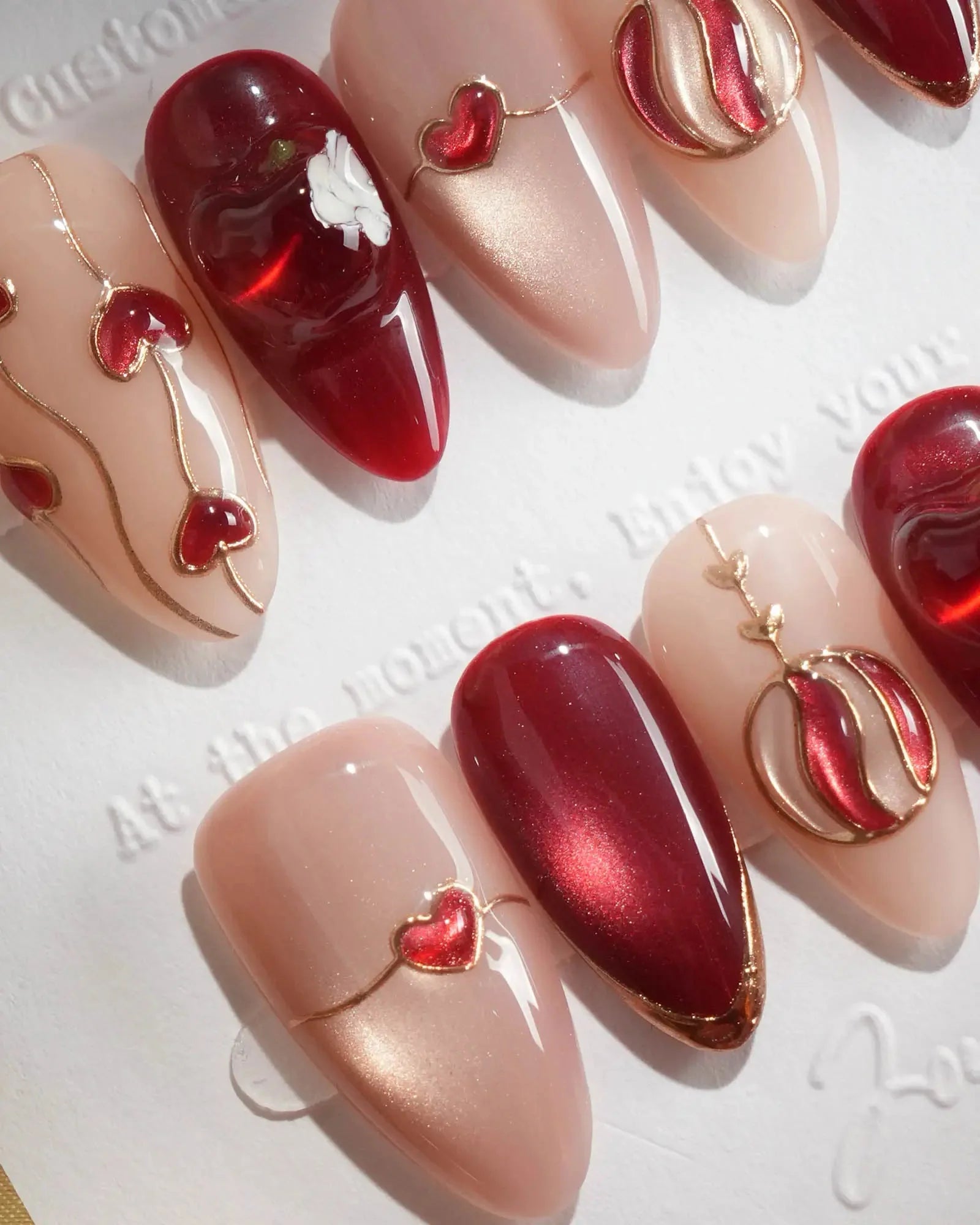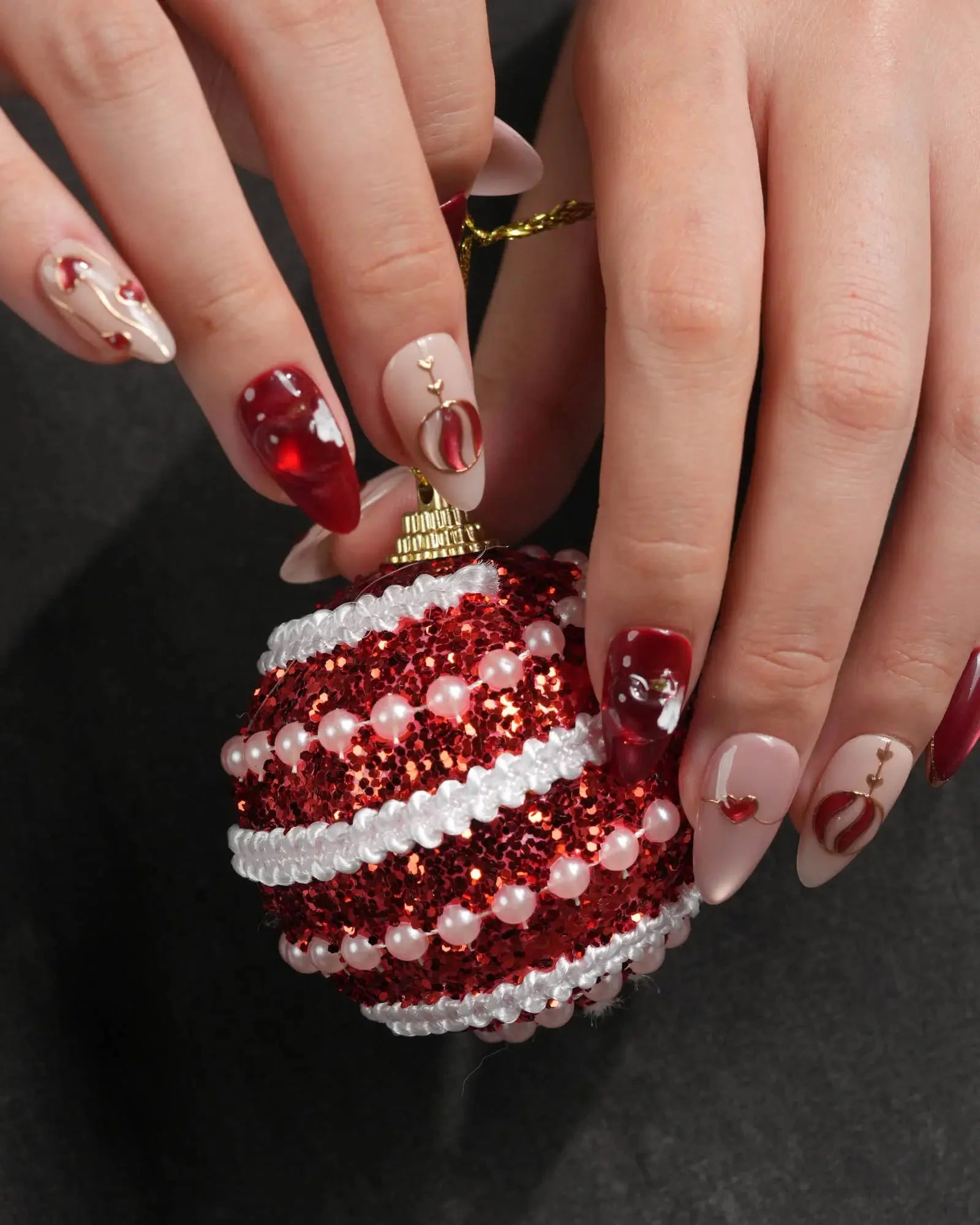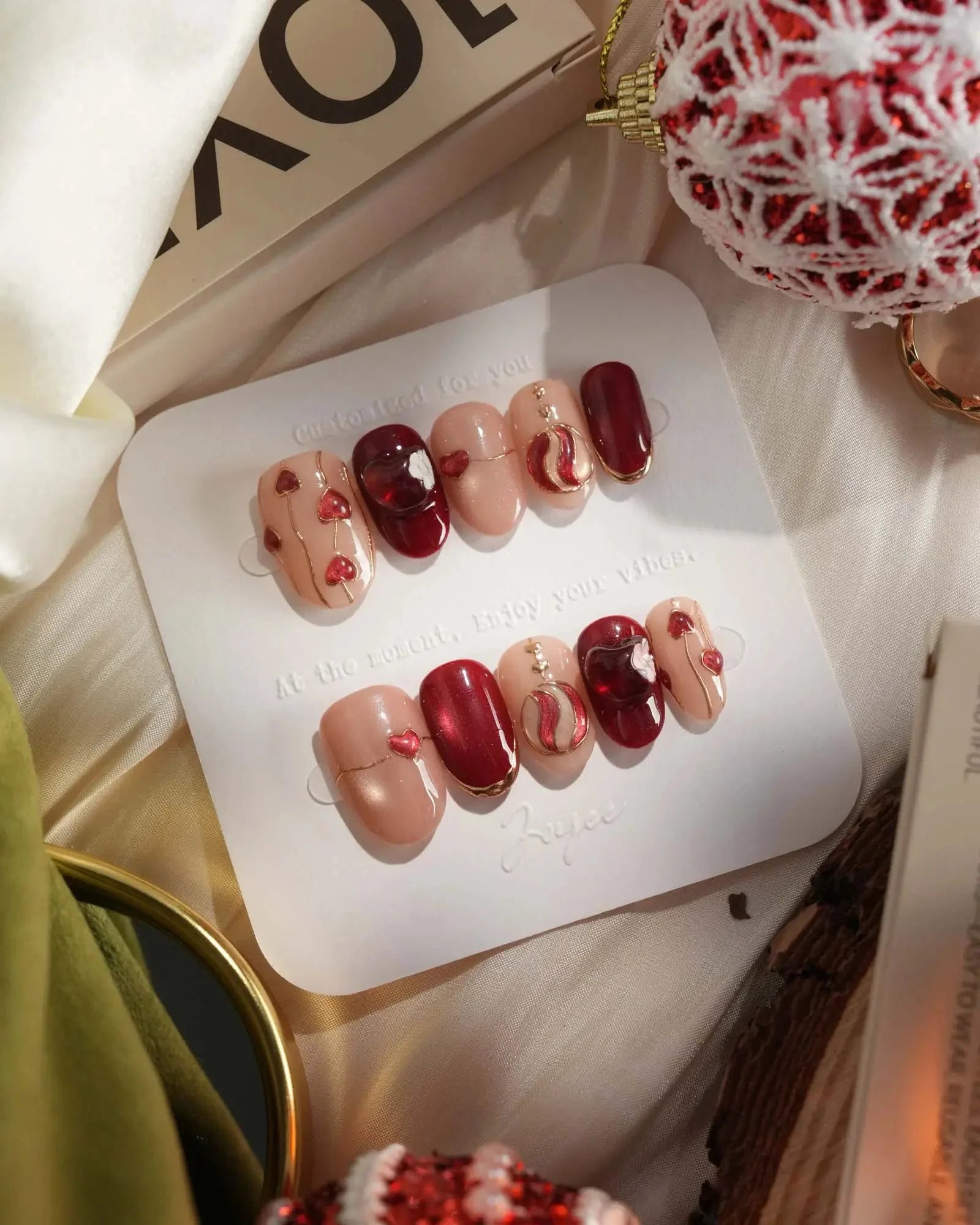 This Christmas-inspired red press-on nail set combines glossy cat-eye effects with 3D apple and ornament details. Accented with fine gold lines and sculpted gel designs, it’s both chic and festive—perfect for cozy winter gatherings or sparkling holiday parties.