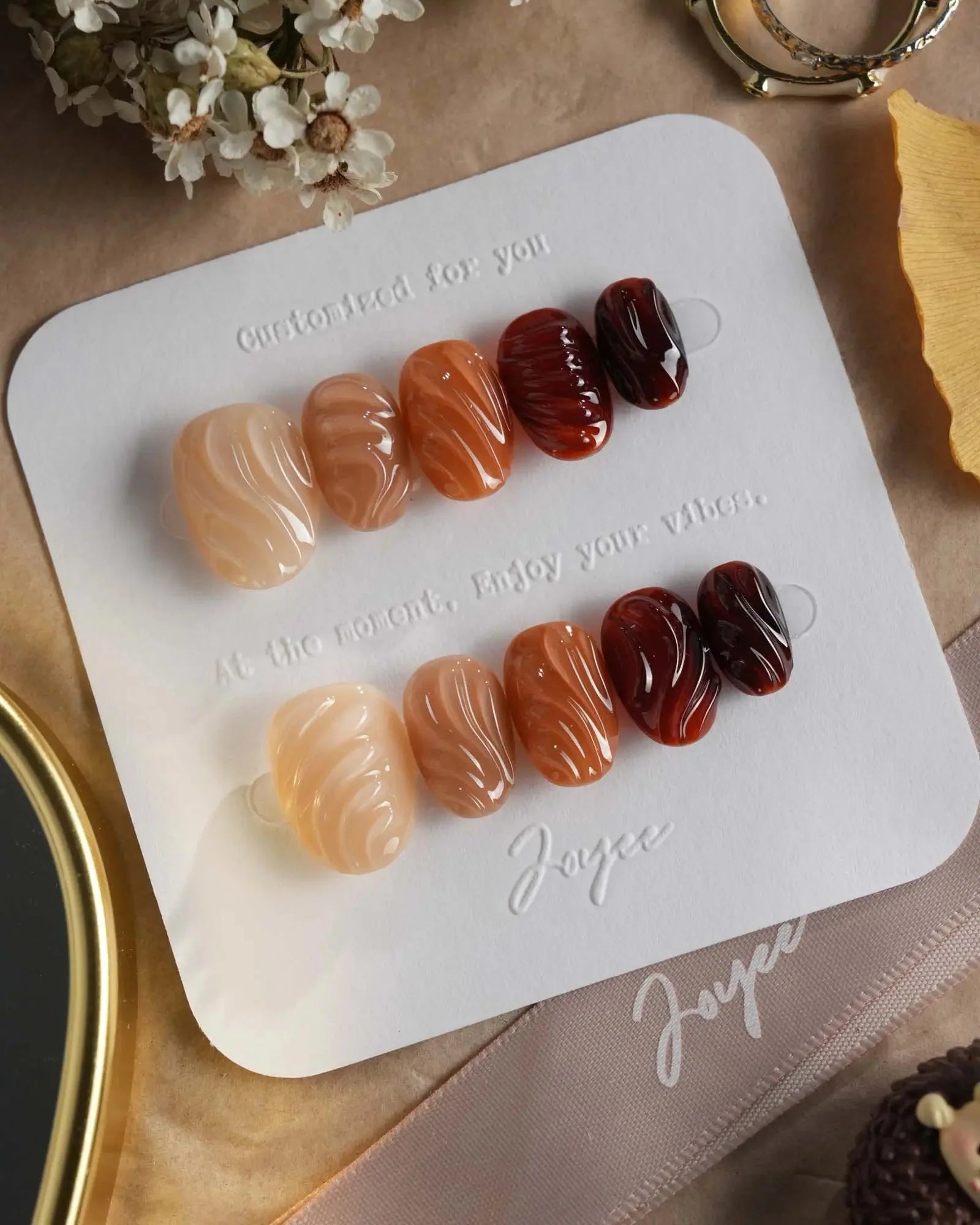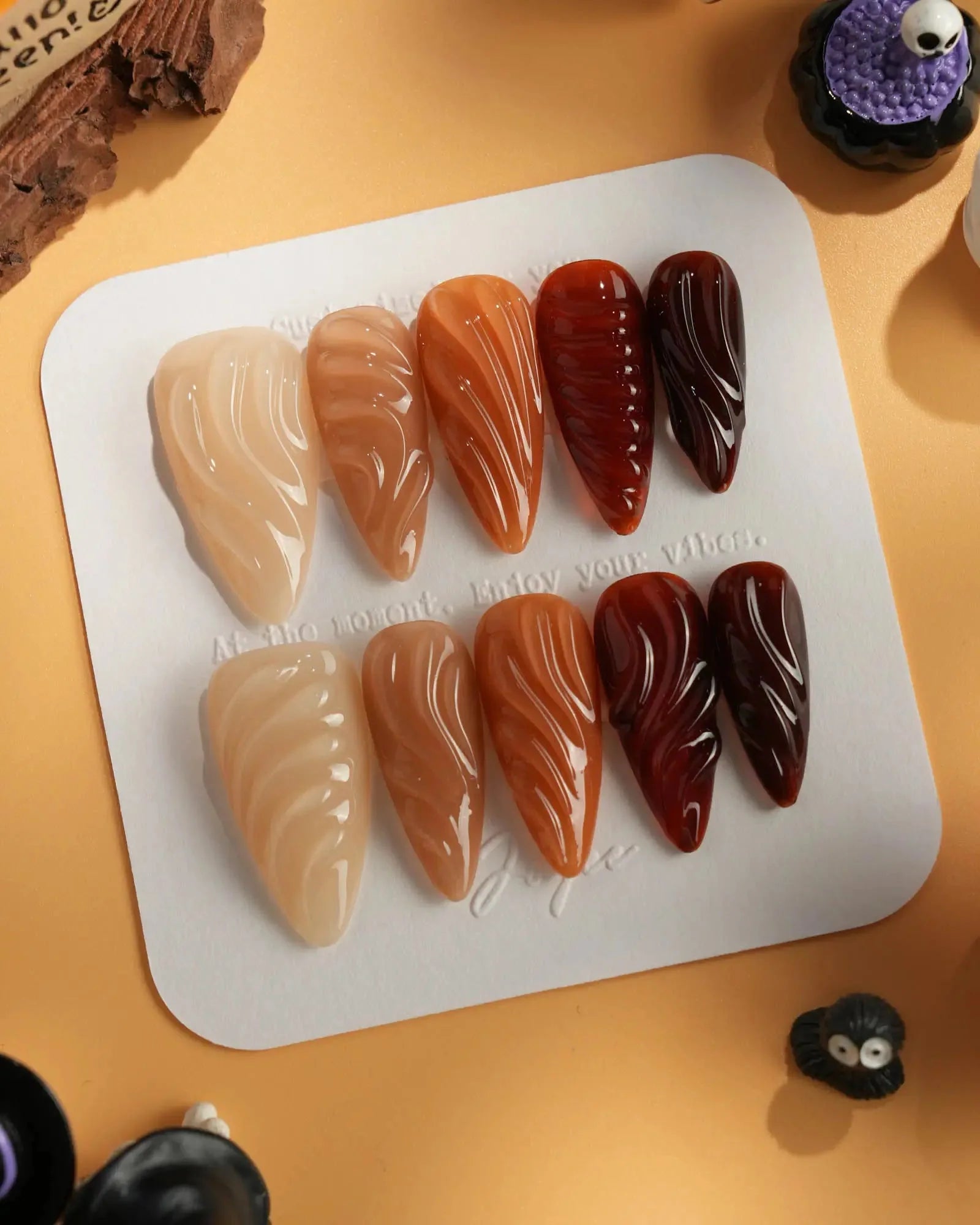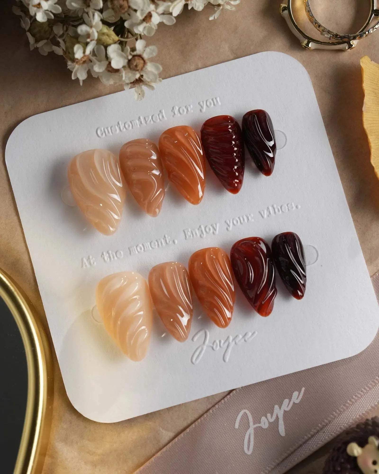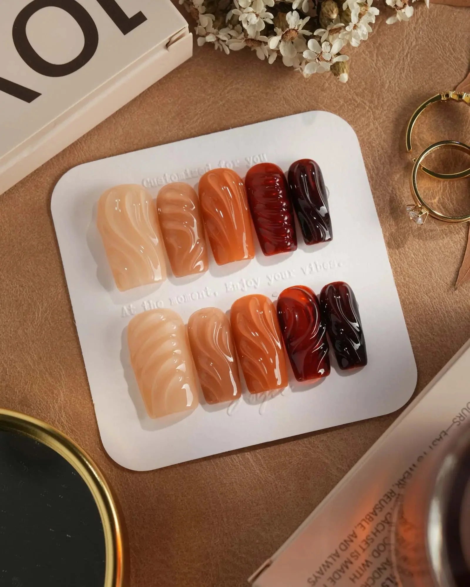 Minimal yet striking, this brown gradient set blends nude beige, caramel, and deep burgundy shades with 3D gel carved lines. Handmade and reusable, they bring sculpted detail and autumn-inspired artistry to your seasonal looks.