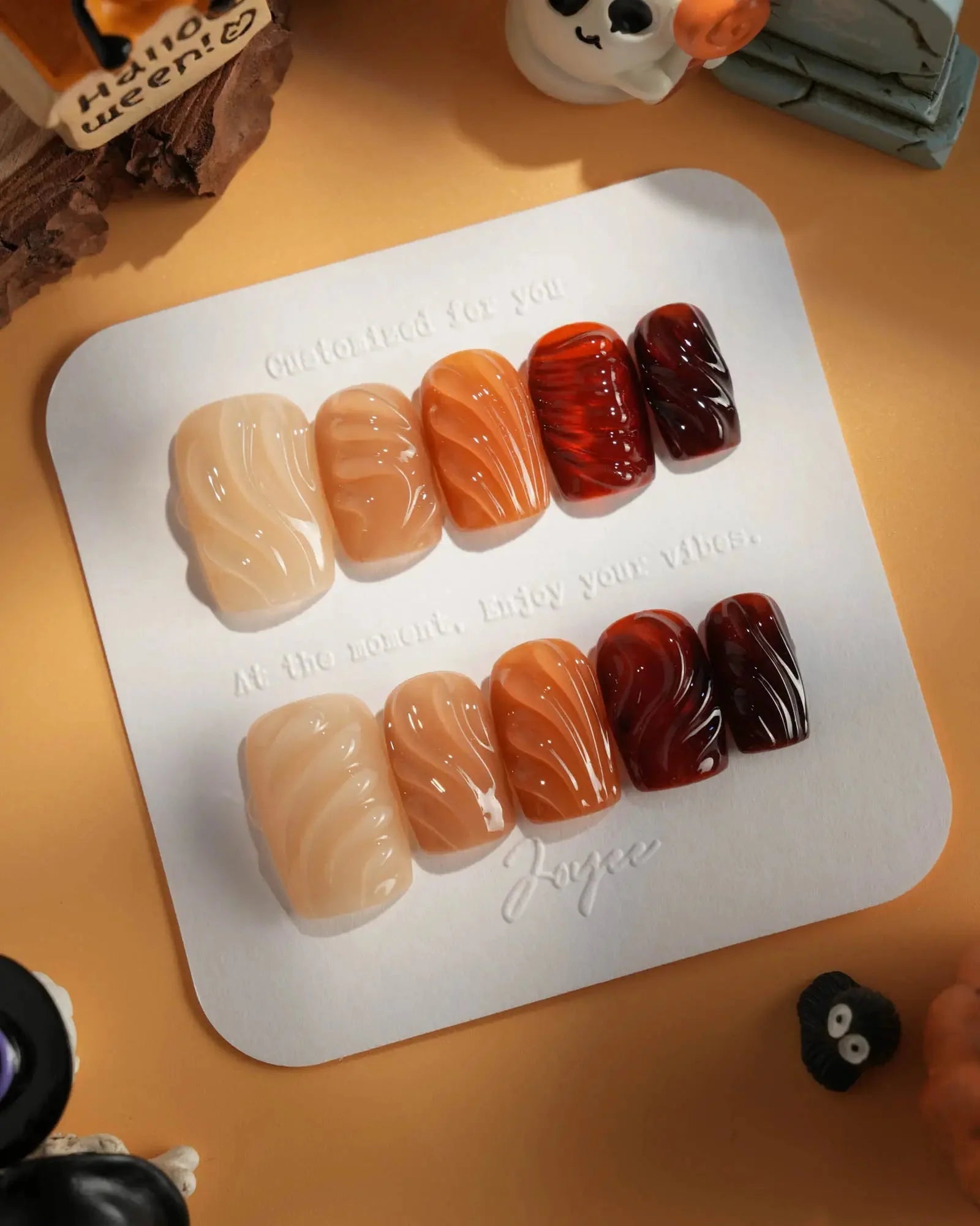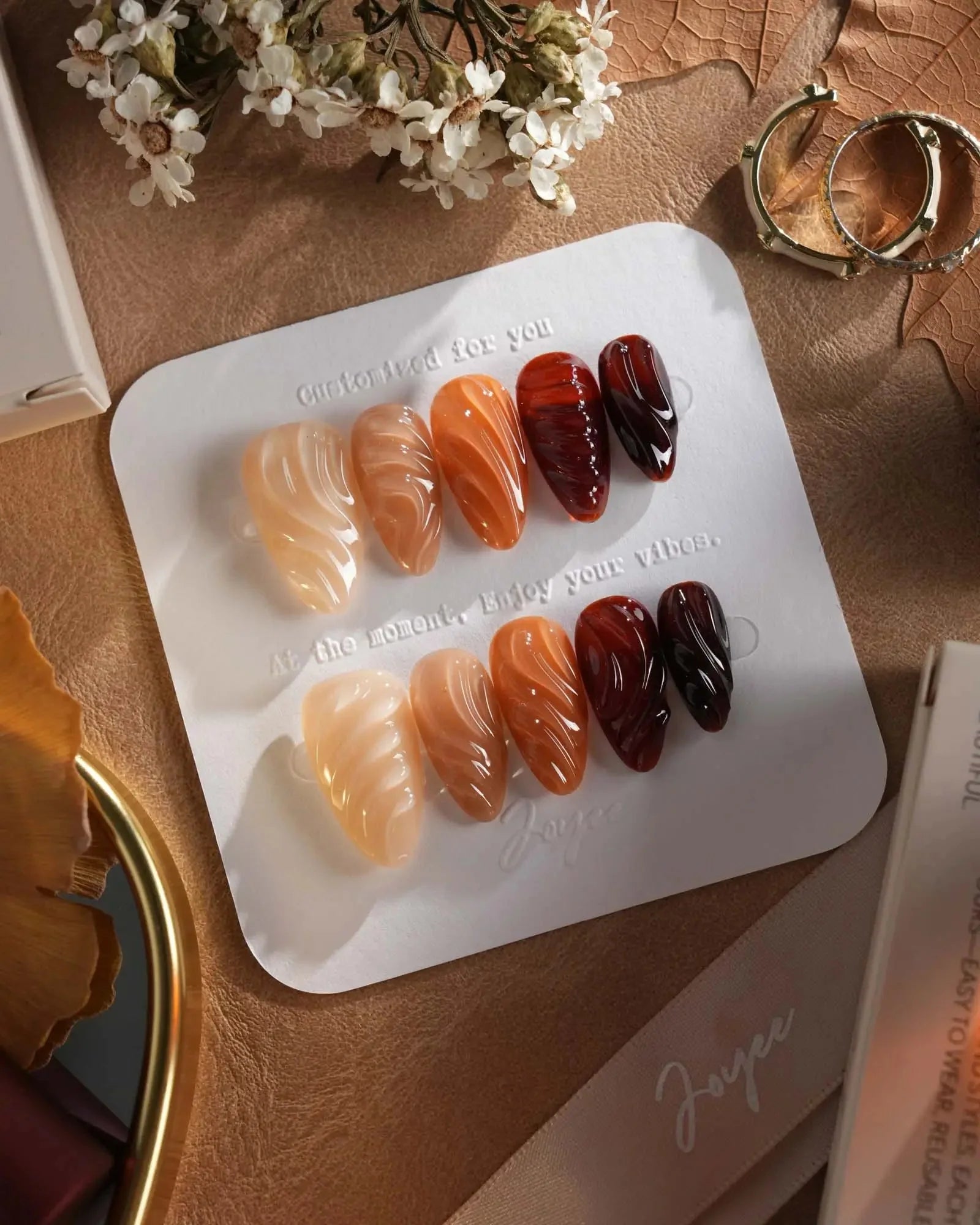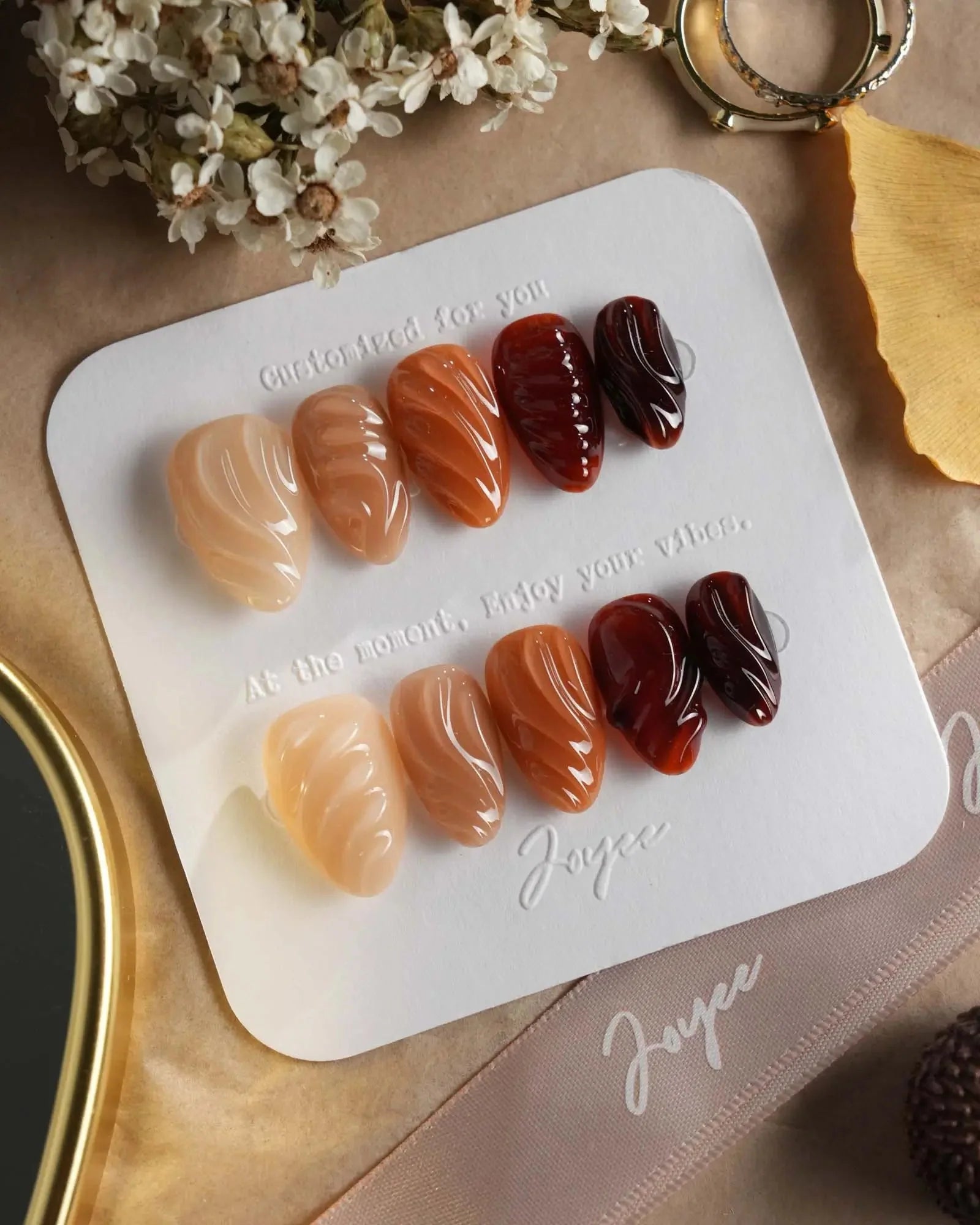 Minimal yet striking, this brown gradient set blends nude beige, caramel, and deep burgundy shades with 3D gel carved lines. Handmade and reusable, they bring sculpted detail and autumn-inspired artistry to your seasonal looks.