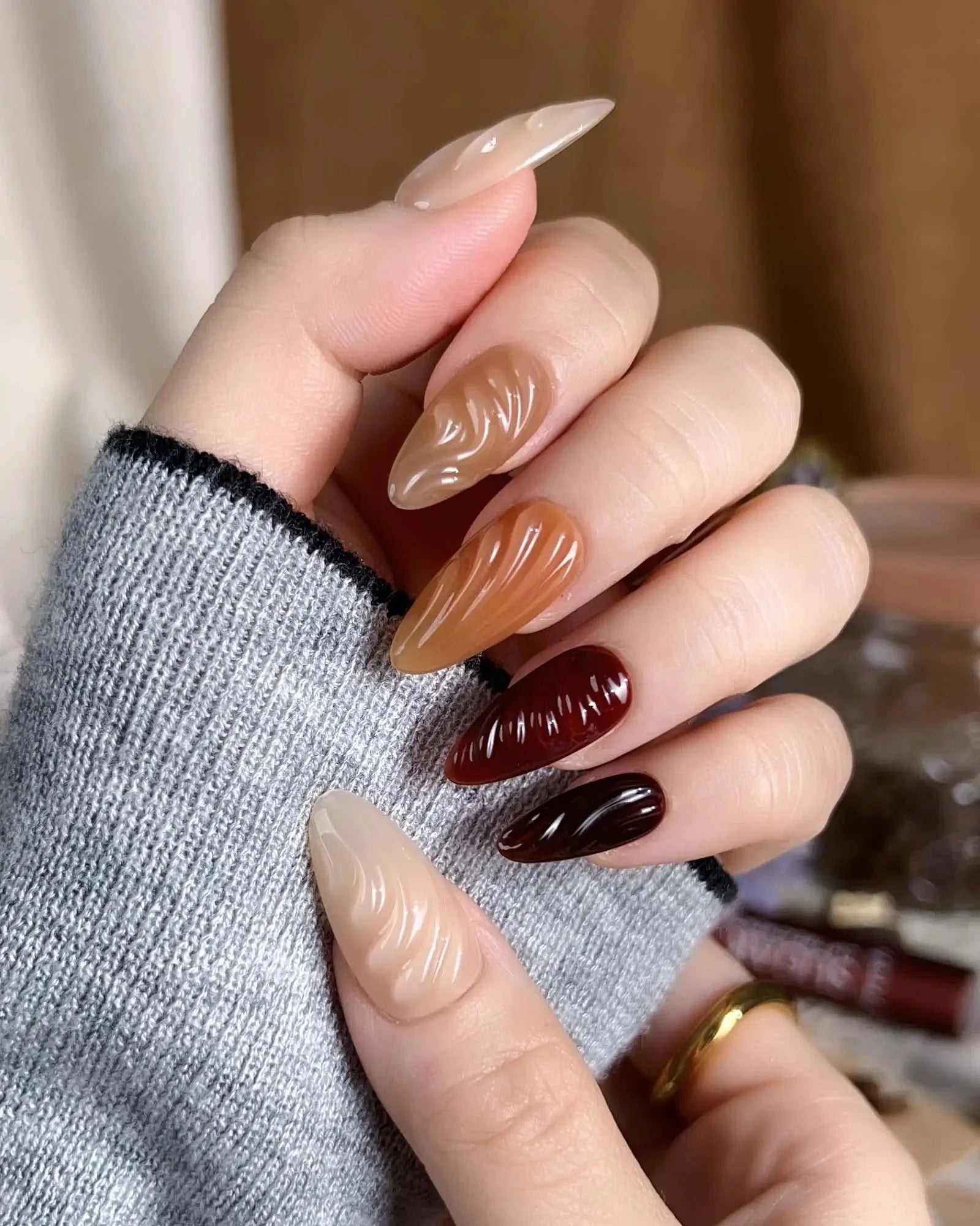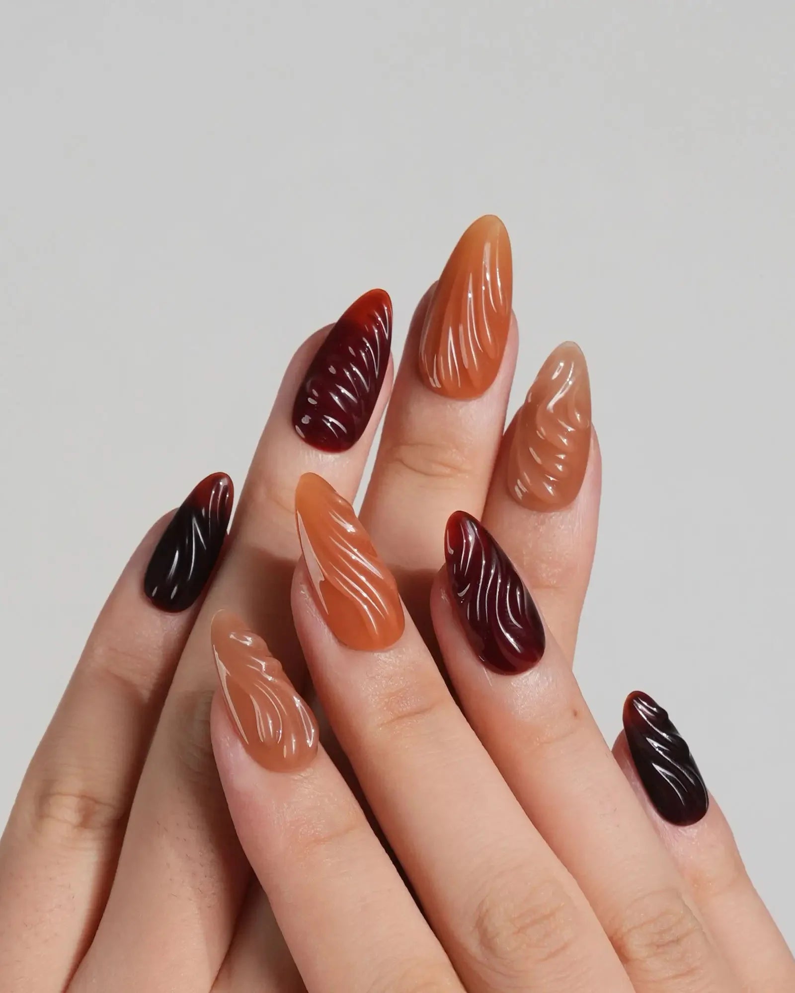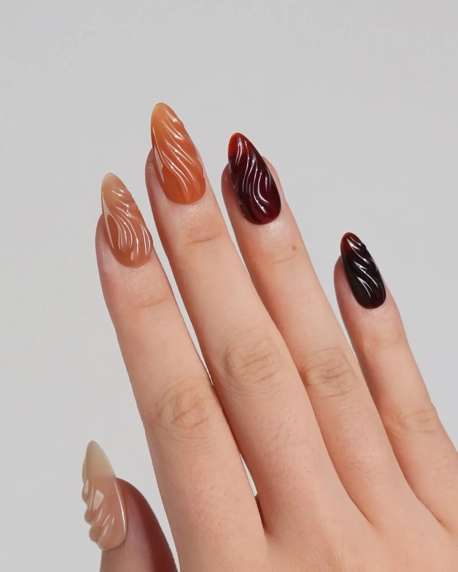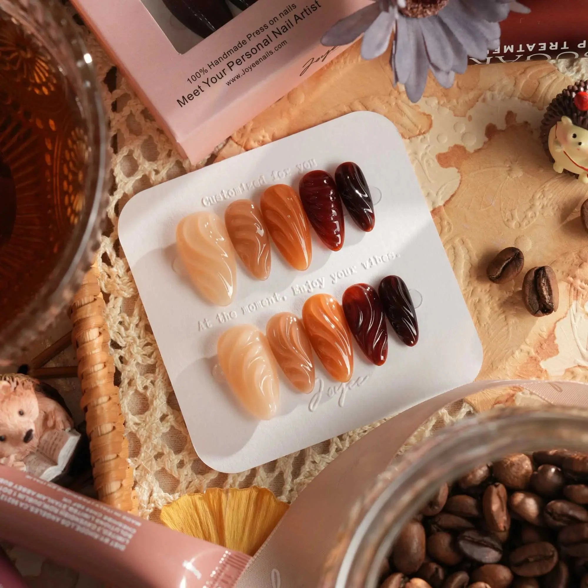 Minimal yet striking, this brown gradient set blends nude beige, caramel, and deep burgundy shades with 3D gel carved lines. Handmade and reusable, they bring sculpted detail and autumn-inspired artistry to your seasonal looks.
