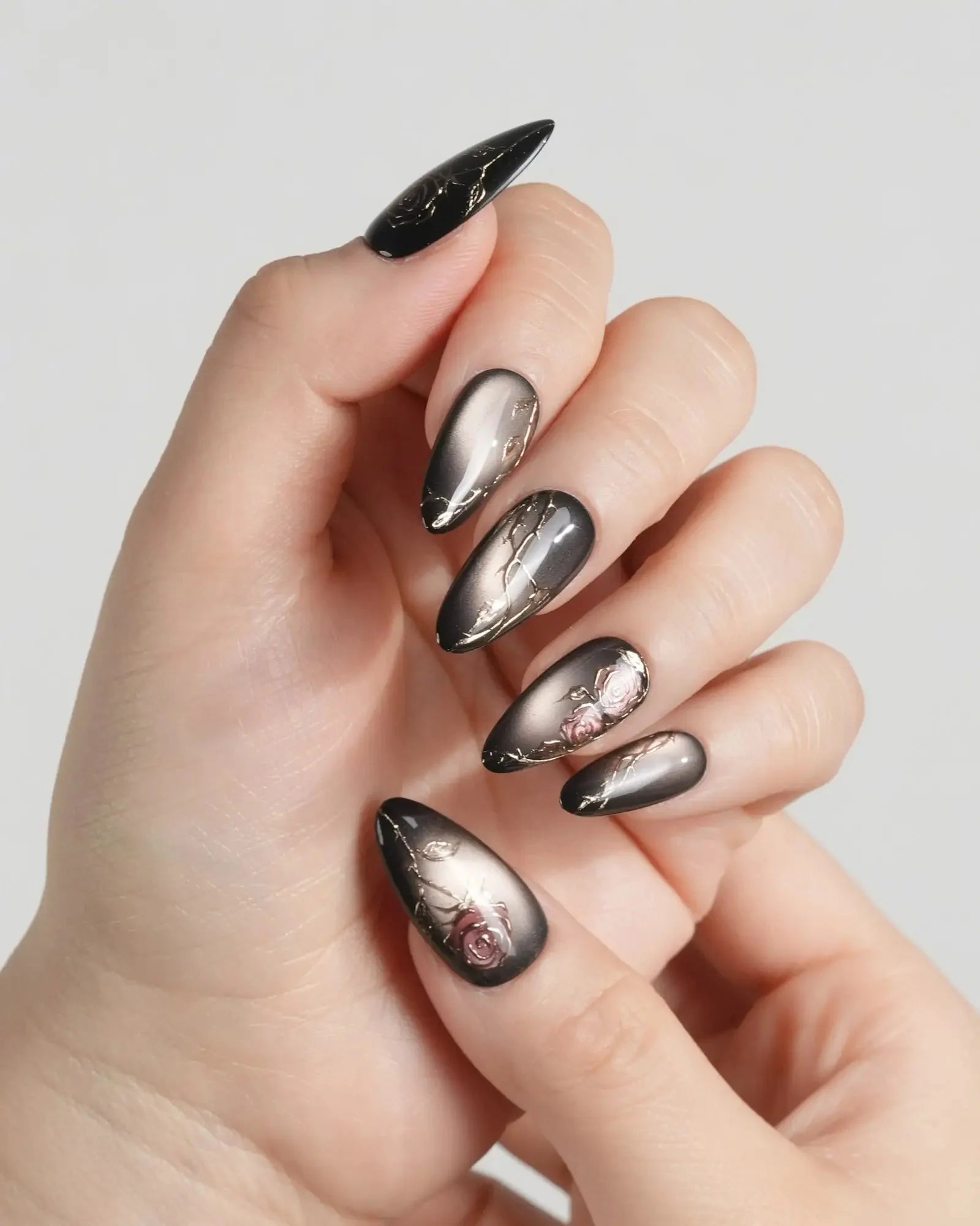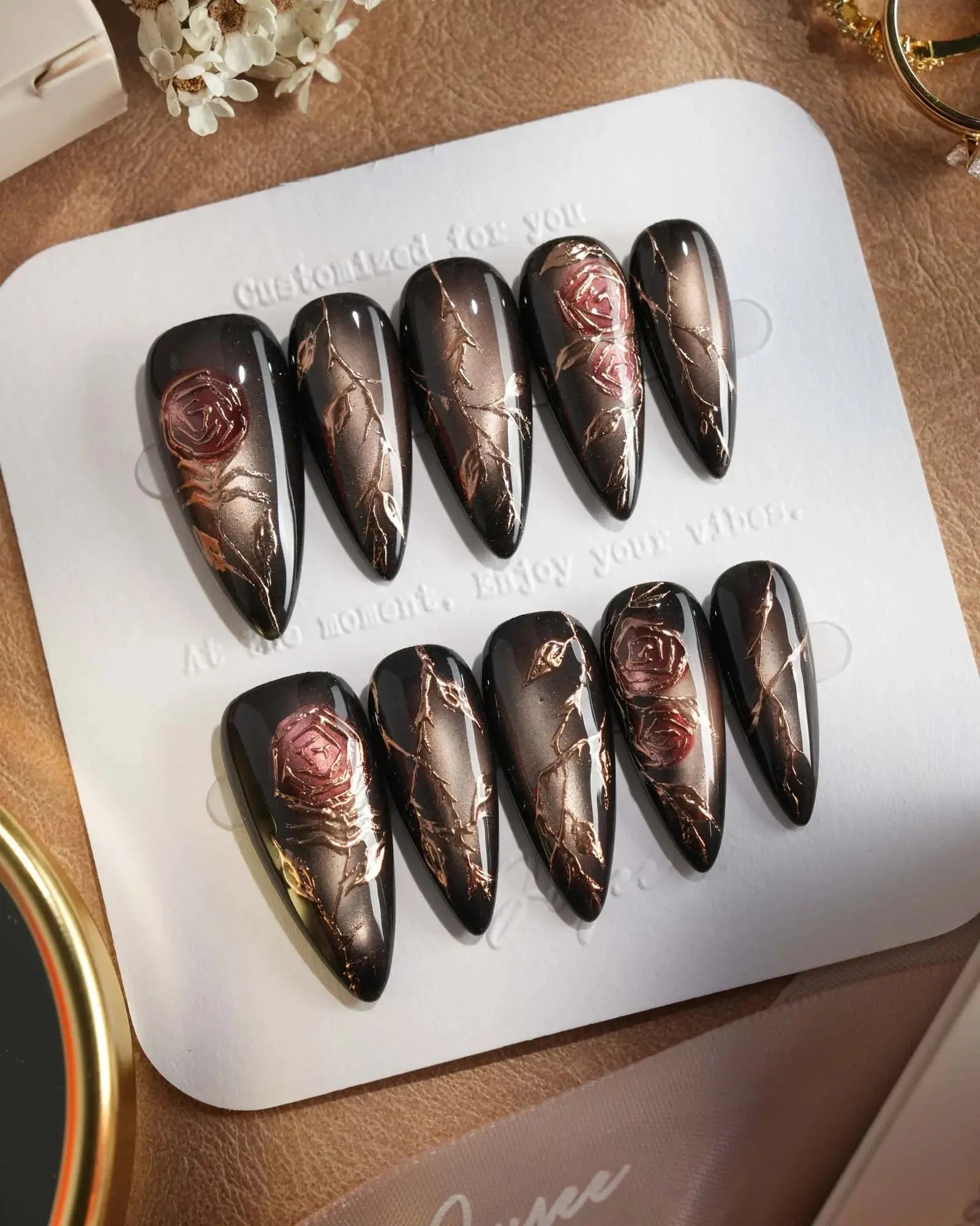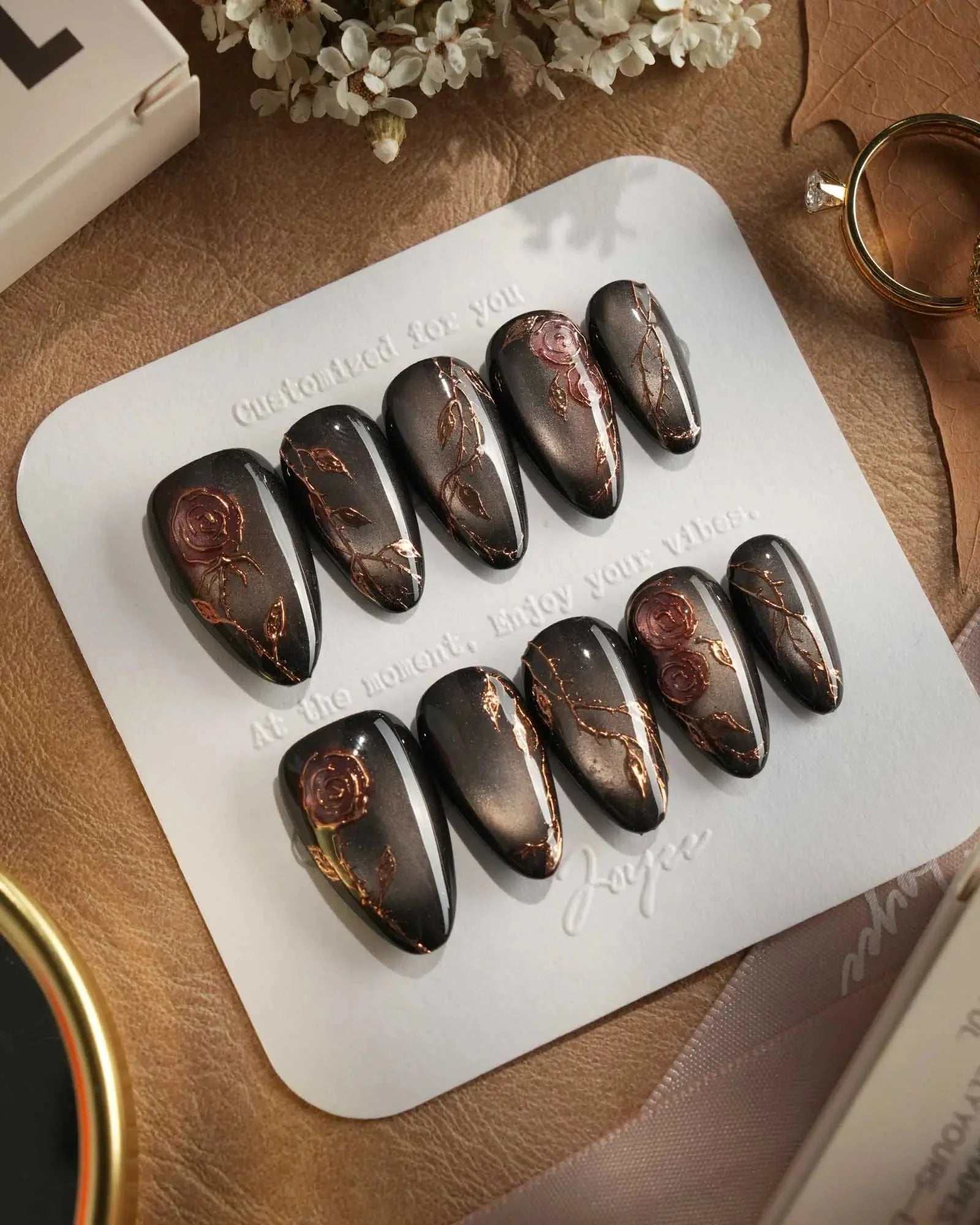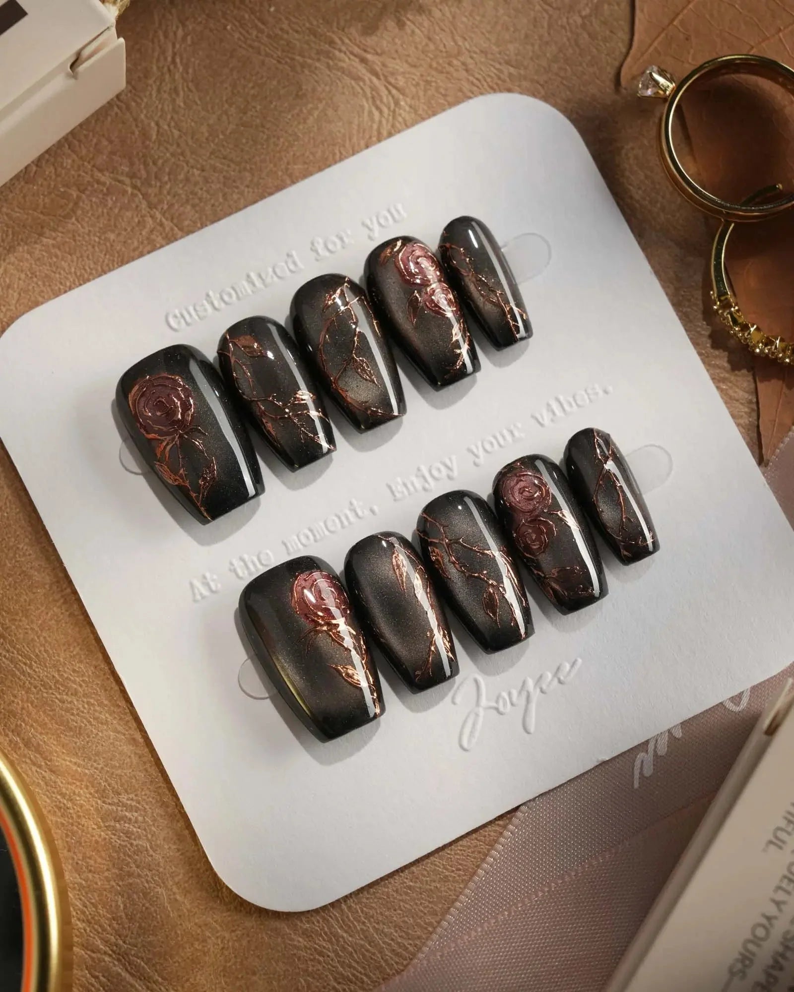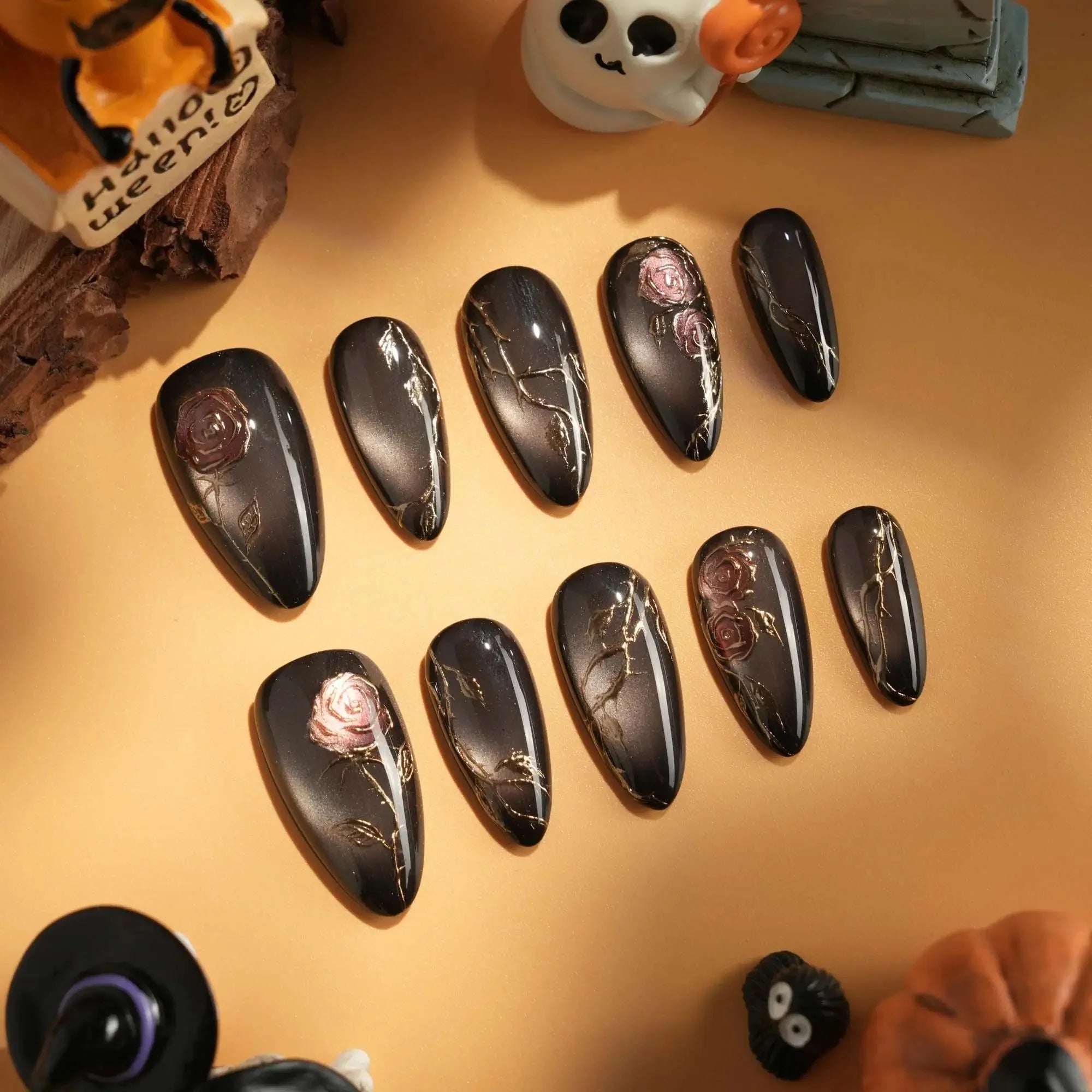 A rust-black cat-eye base glowing with antique gold, layered with roses and crawling thorns. Gothic and romantic, like beauty hidden in danger.