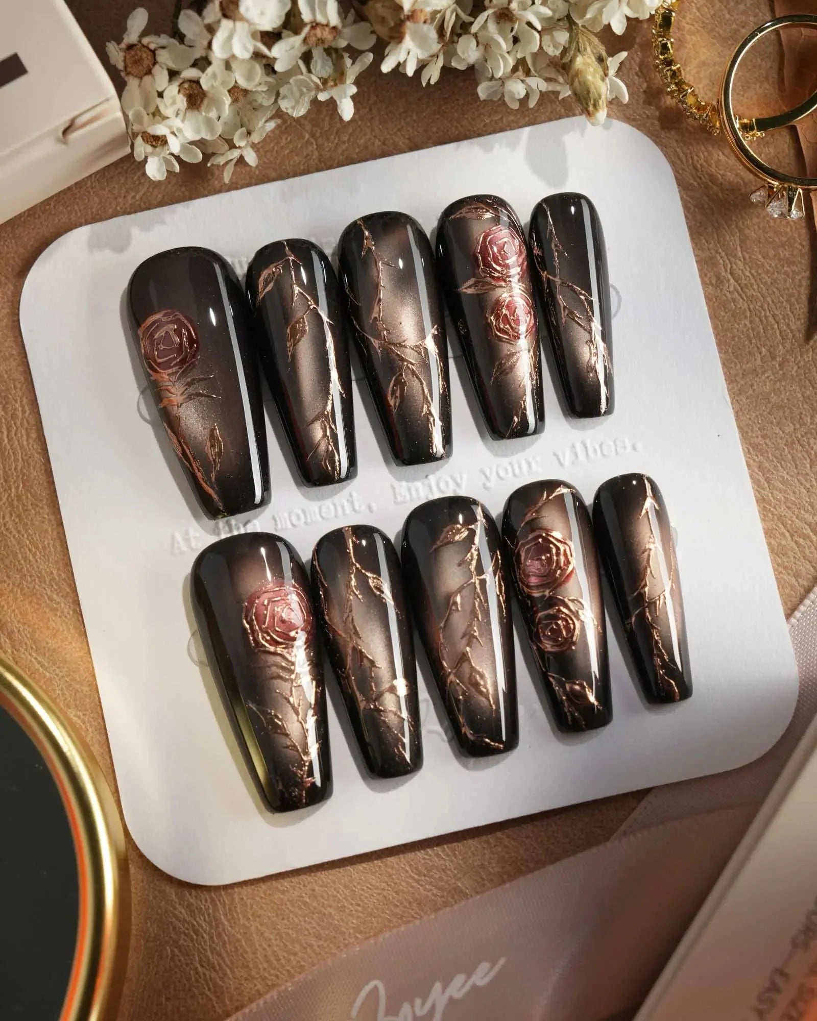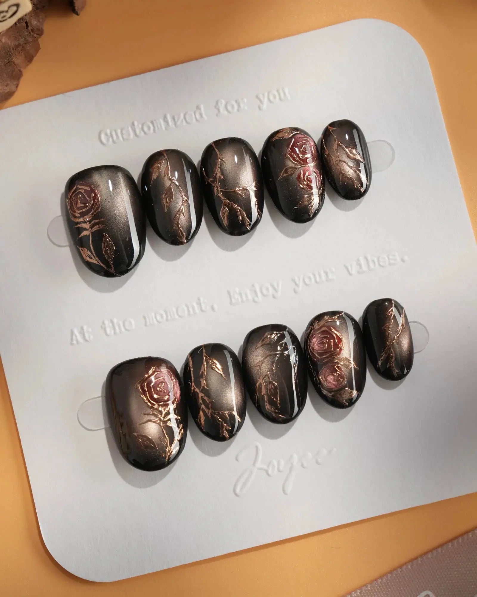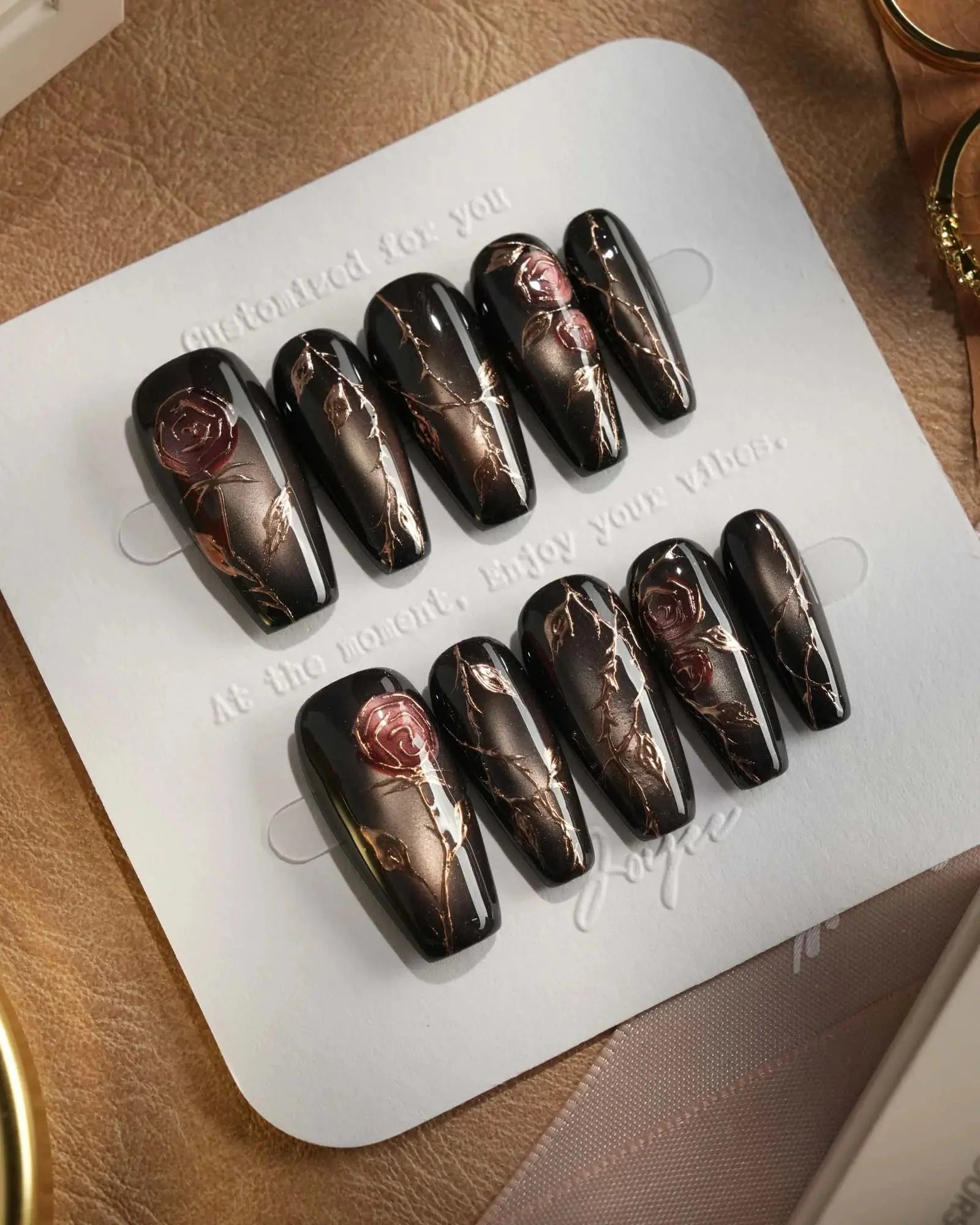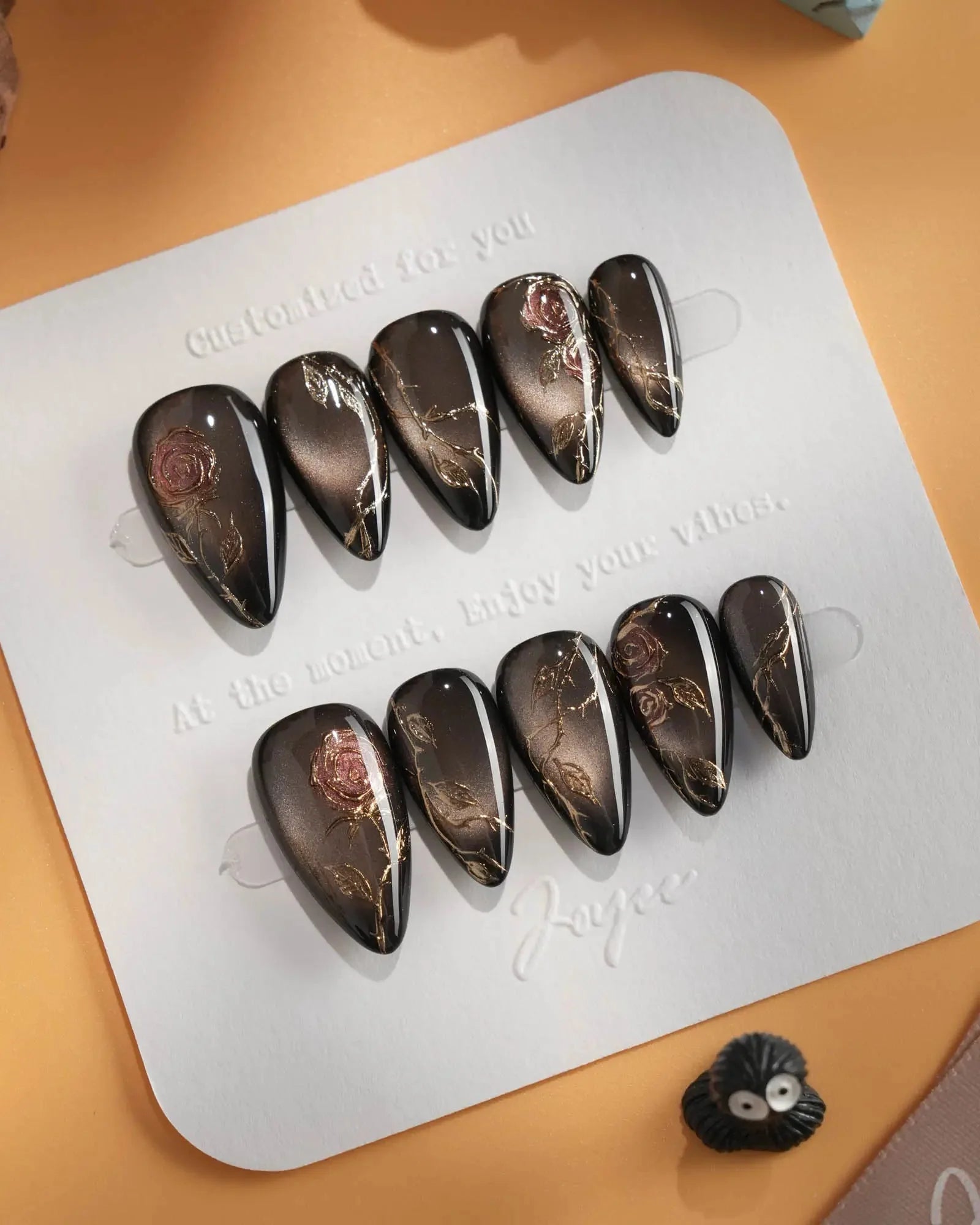 A rust-black cat-eye base glowing with antique gold, layered with roses and crawling thorns. Gothic and romantic, like beauty hidden in danger.