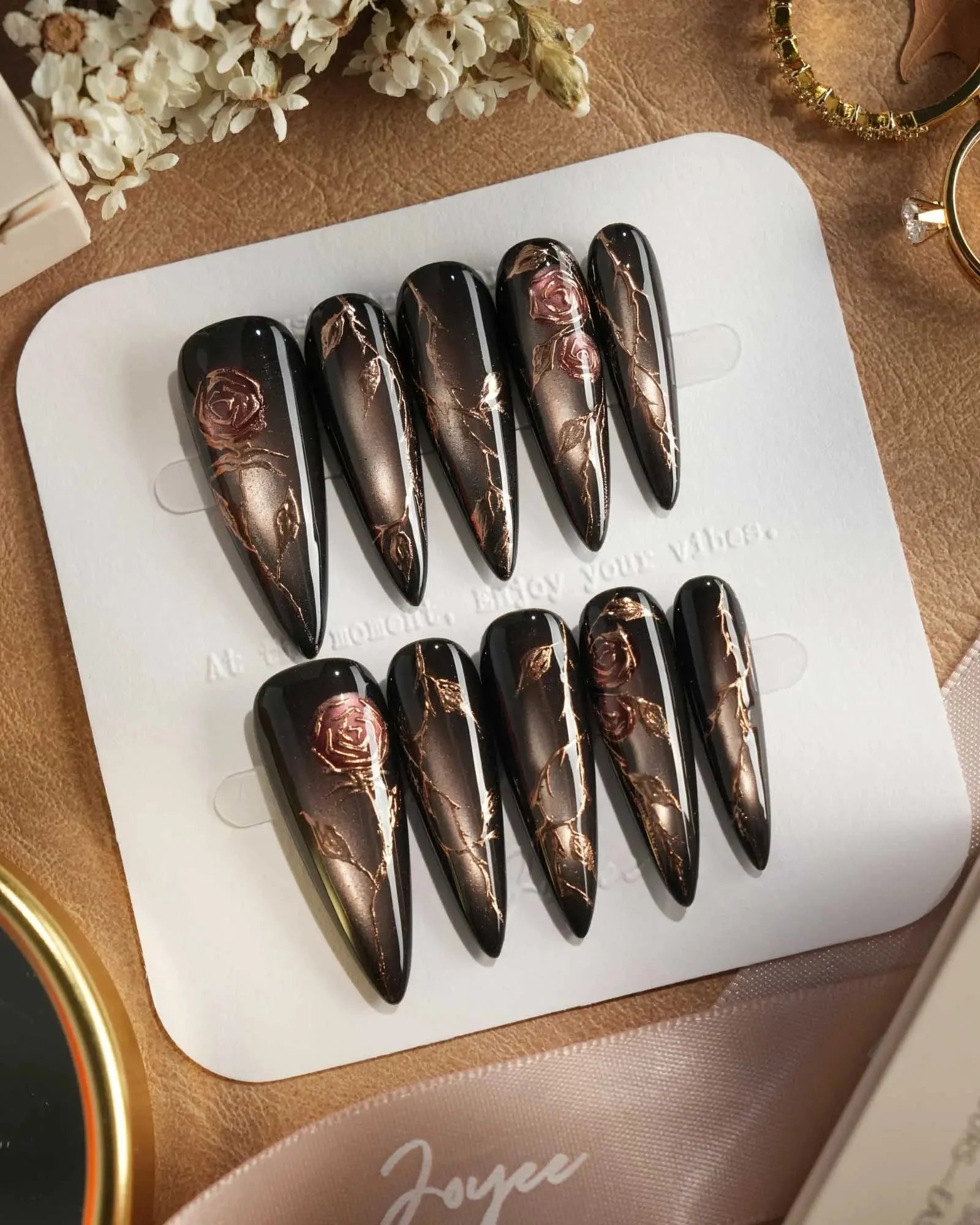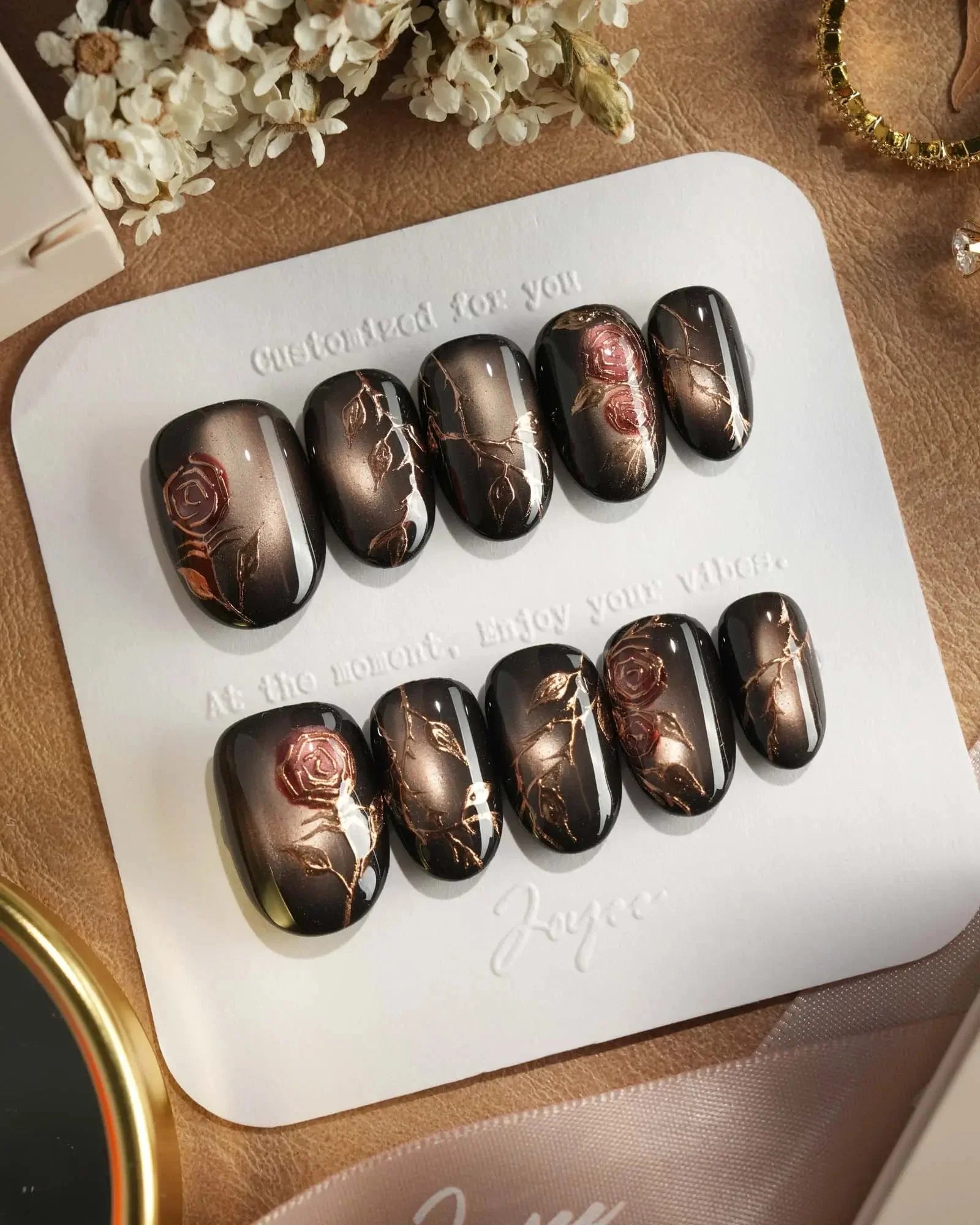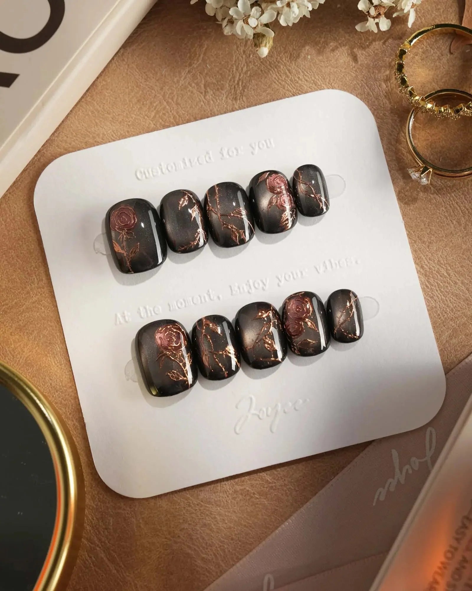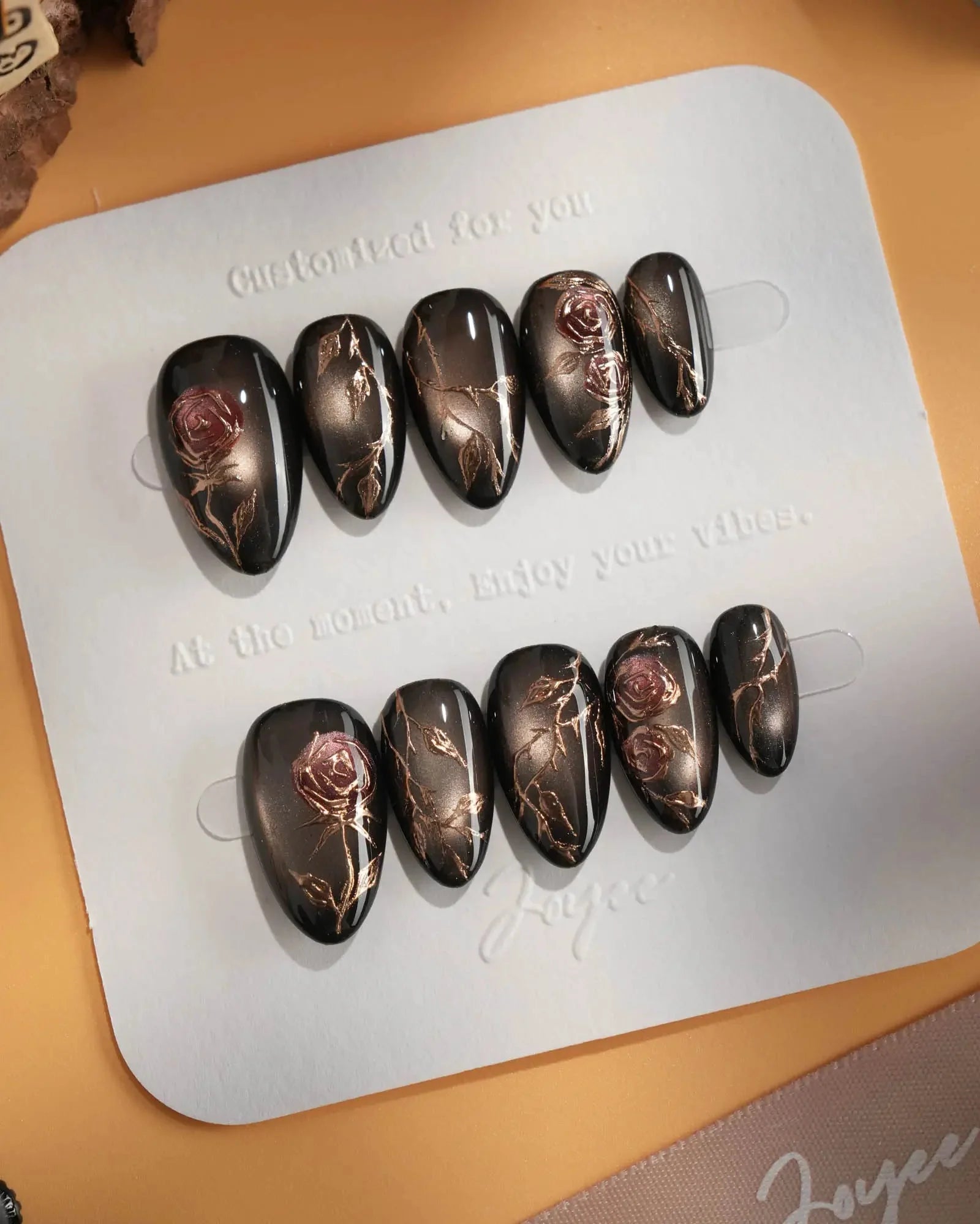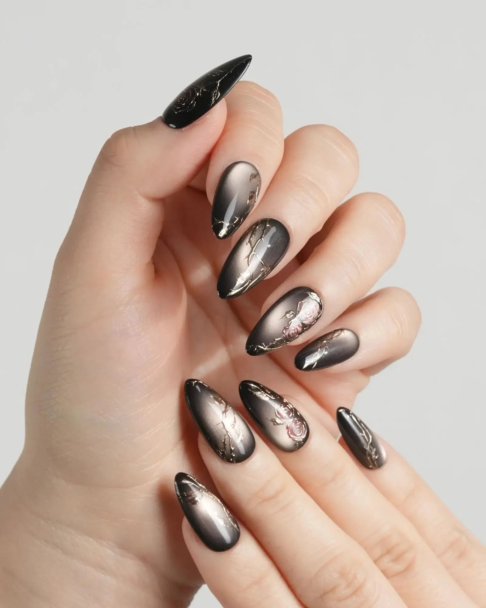 A rust-black cat-eye base glowing with antique gold, layered with roses and crawling thorns. Gothic and romantic, like beauty hidden in danger.