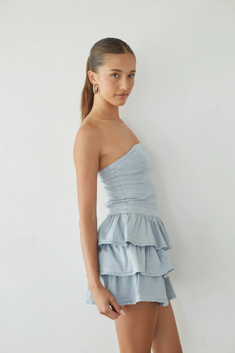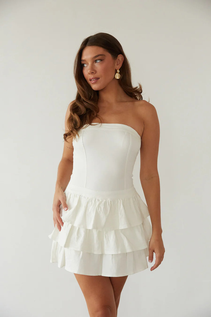 Channel your inner white swan in the Venus Strapless Ruffle Mini Dress! This white mini dress features a strapless neckline, fit and flare silhouette, and tiered ruffle skirt! Available in White Denim; accessorize to complete the look!