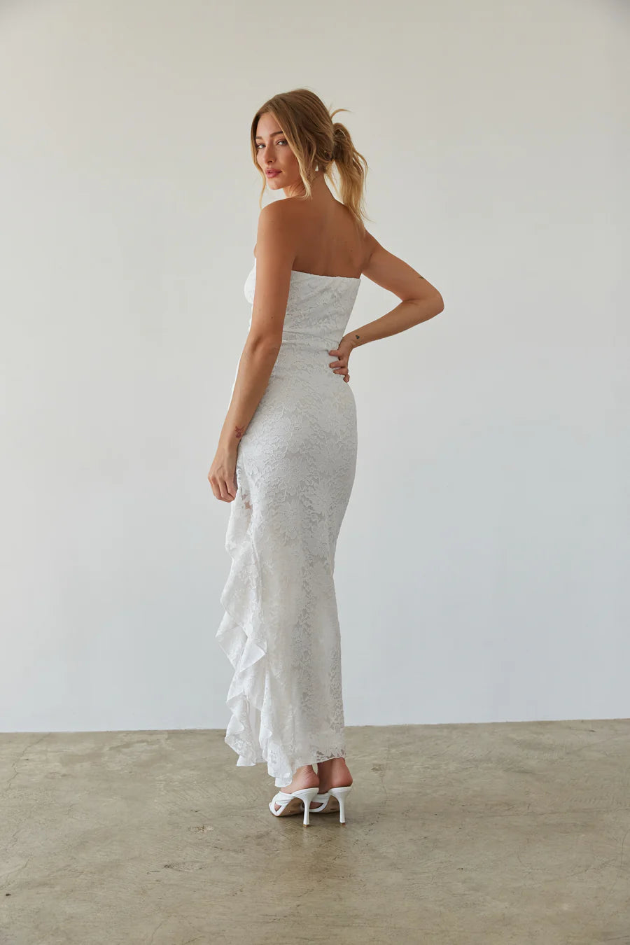 Shine in the Vivienne Lace Ruffle Maxi Dress! This gorgeous dress features a straight across neckline and a high leg slit with a ruffle trim. Available in white floral lace. Pair with a sleek heel to complete the look!