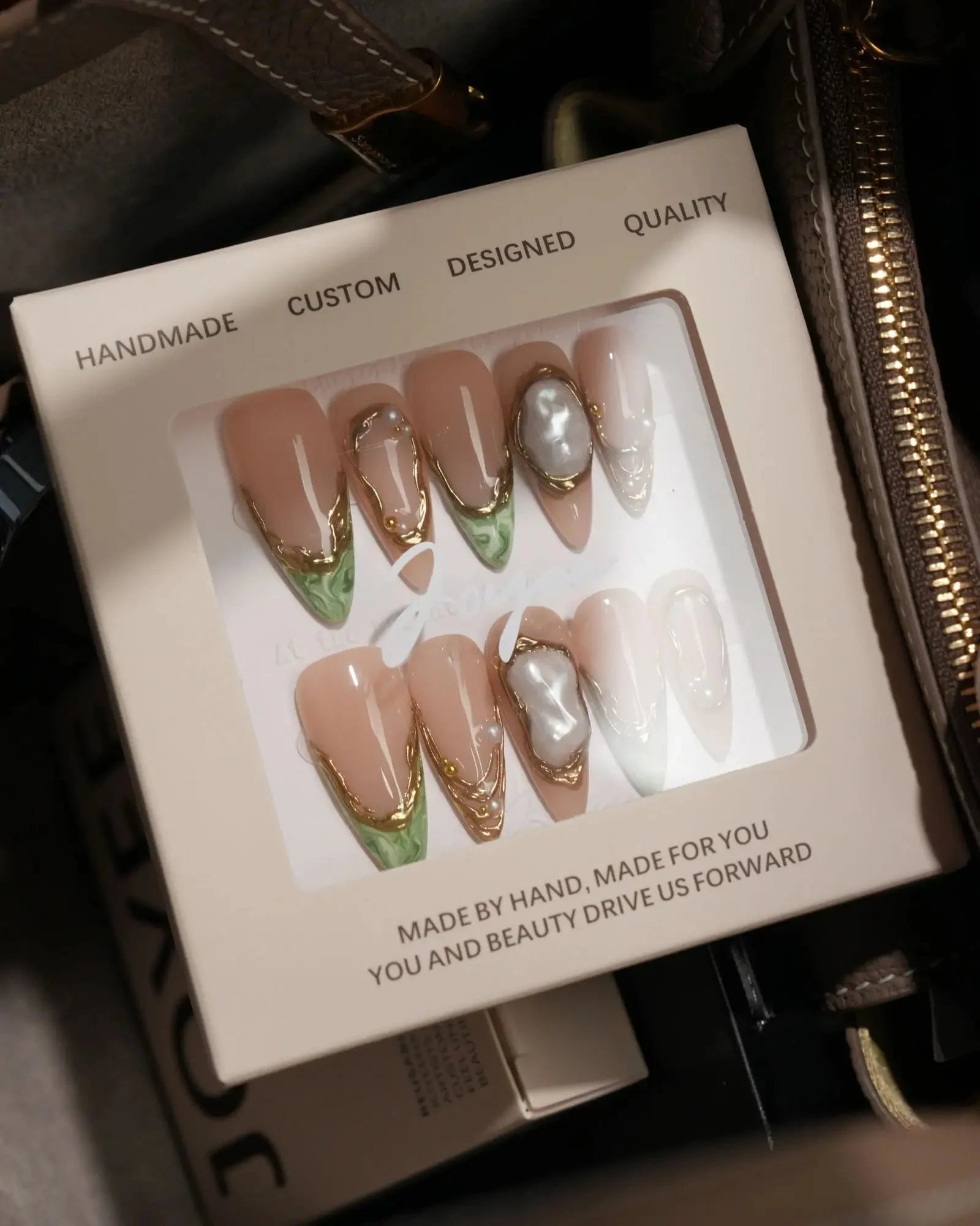 A luxurious French-style press-on nail set combining nude tones, metallic gold edges, and olive-green tips. The 3D gel pearl detail adds a sculptural dimension, while the glossy finish creates a refined yet bold look—ideal for parties, holidays, and special occasions.