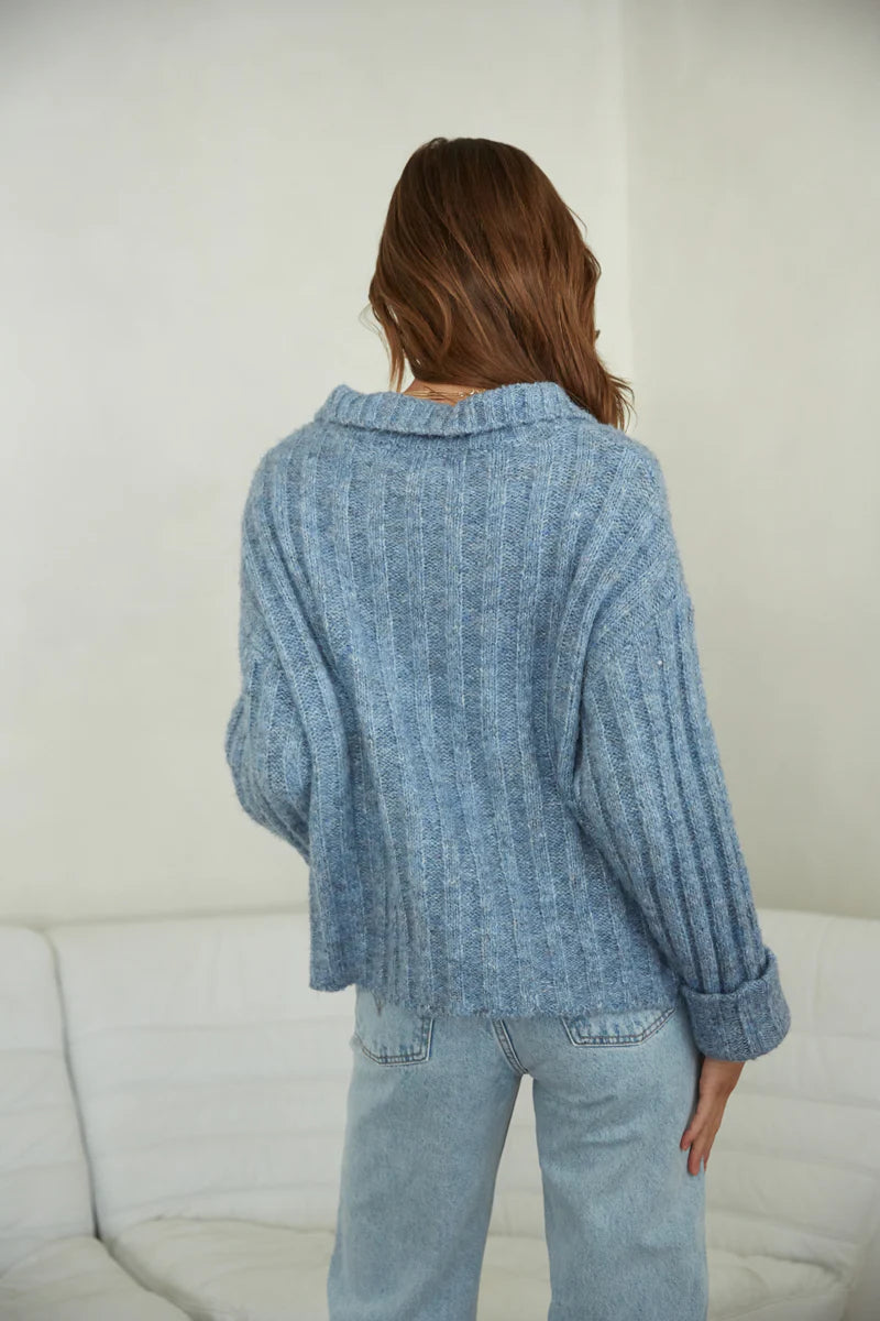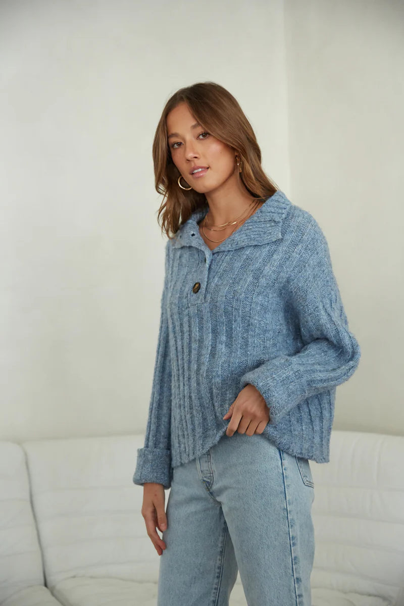 Your closet isn't complete without the Waverly Collared Sweater! This cozy sweater features a fuzzy rib knit, oversize boxy fit, and quarter button up design. Available in heather blue. Pair with some denim to complete the look!