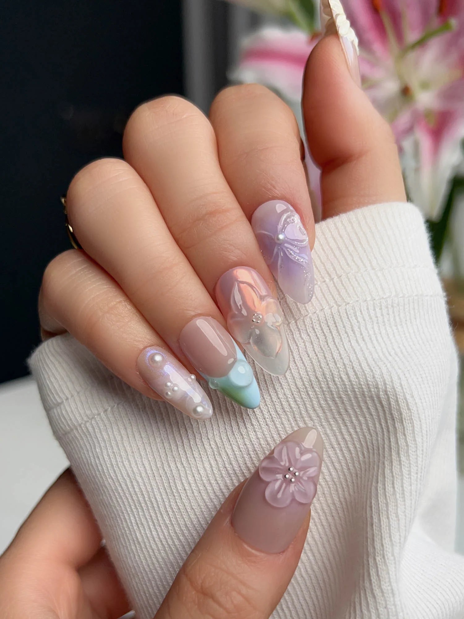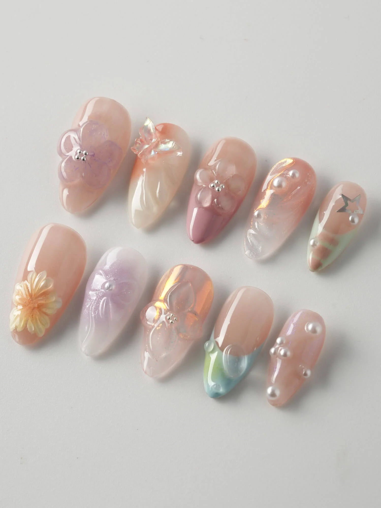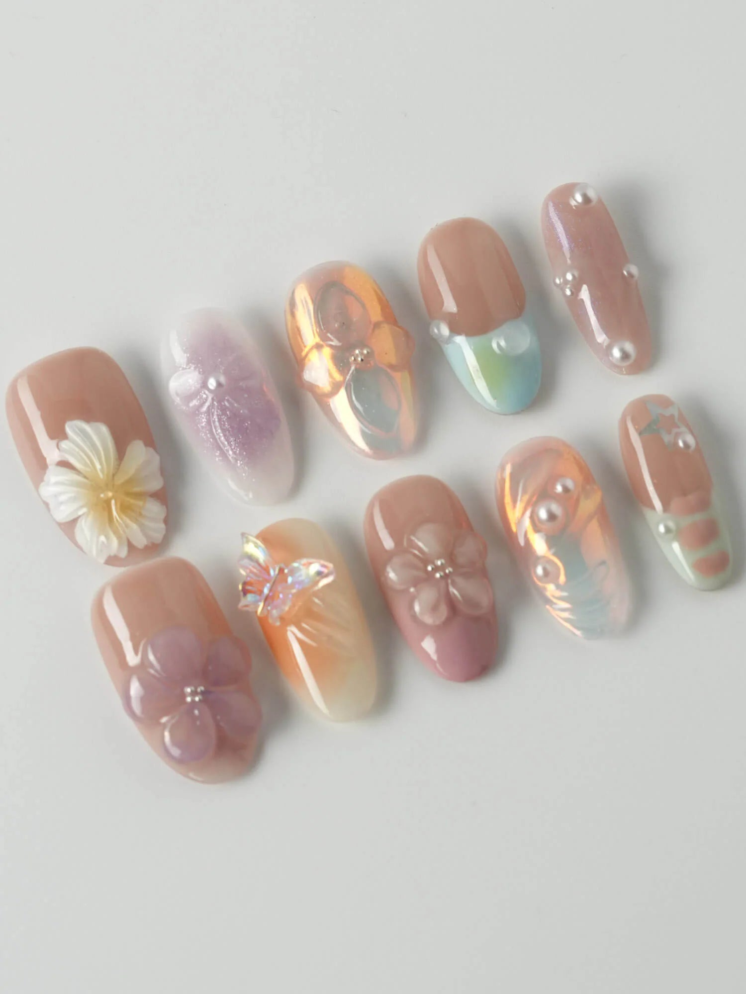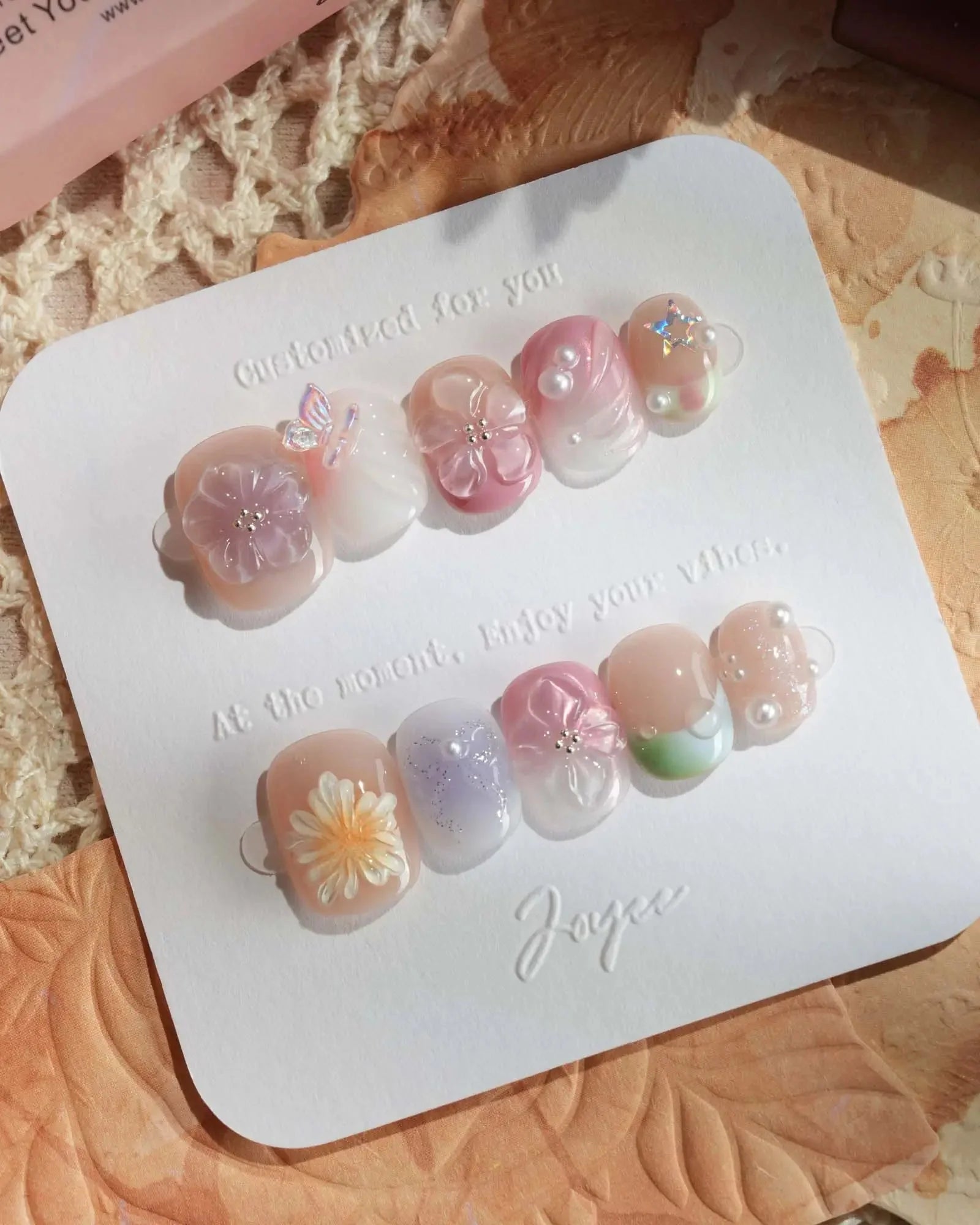 This handmade set features a soft pink base adorned with delicate 3D floral accents and tiny pearls that catch the light. Floral nail designs are a perennial favorite – especially in the spring when fresh flower motifs trend on Pinterest– and this elegant pink blossom pattern keeps you on-trend. The result is a feminine, eye-catching look that’s both stylish and timeless, instantly elevating your manicure.