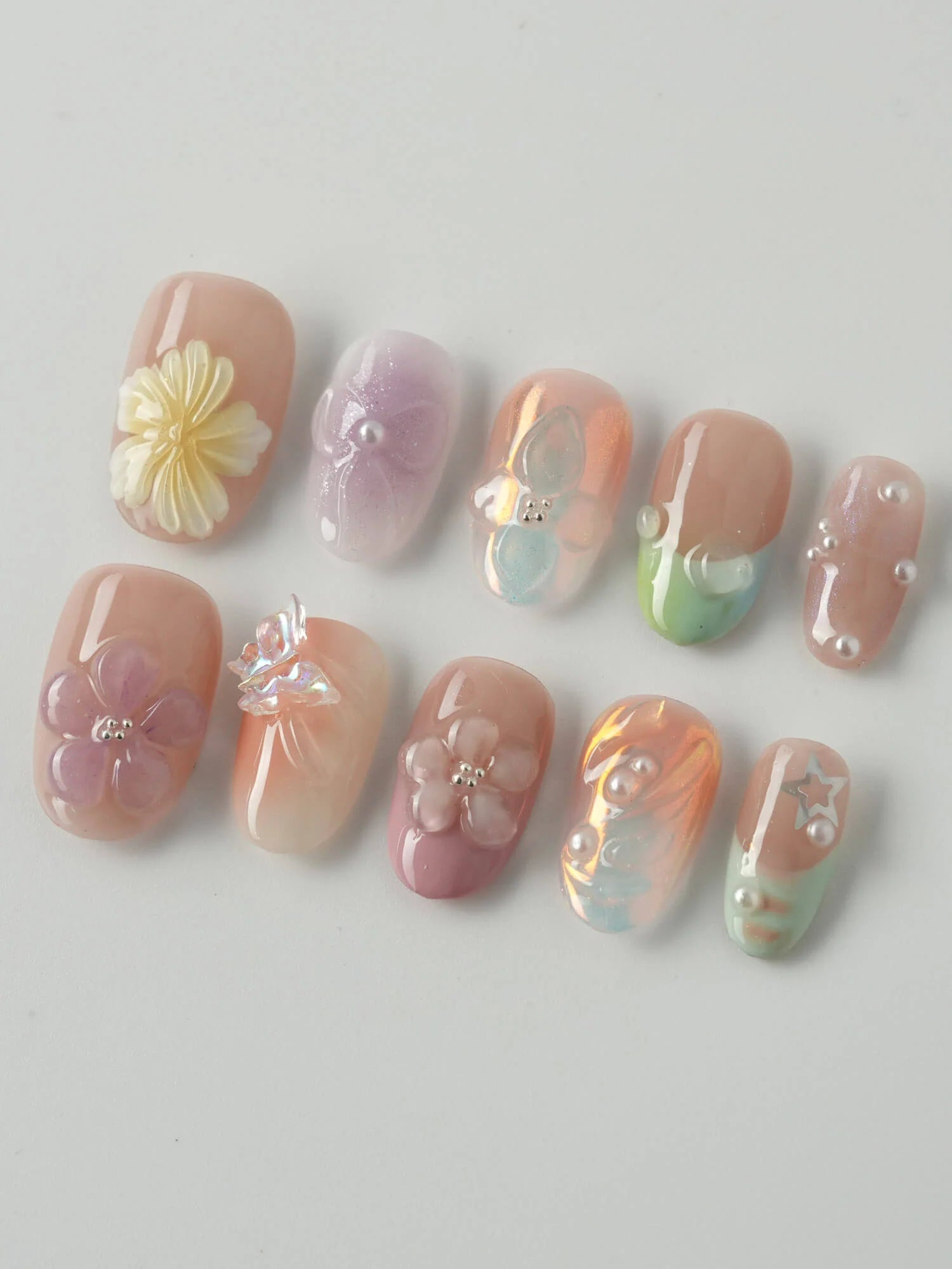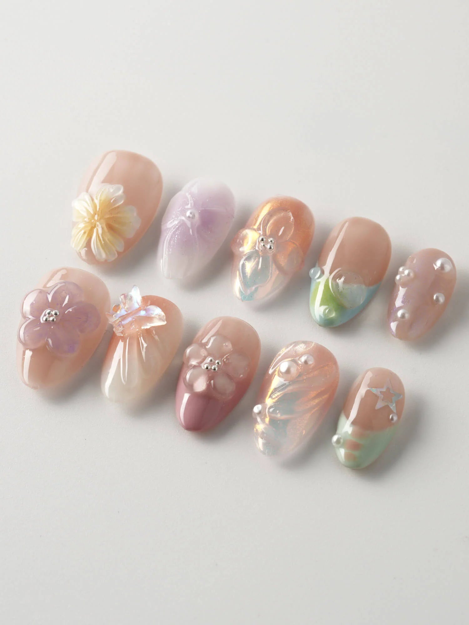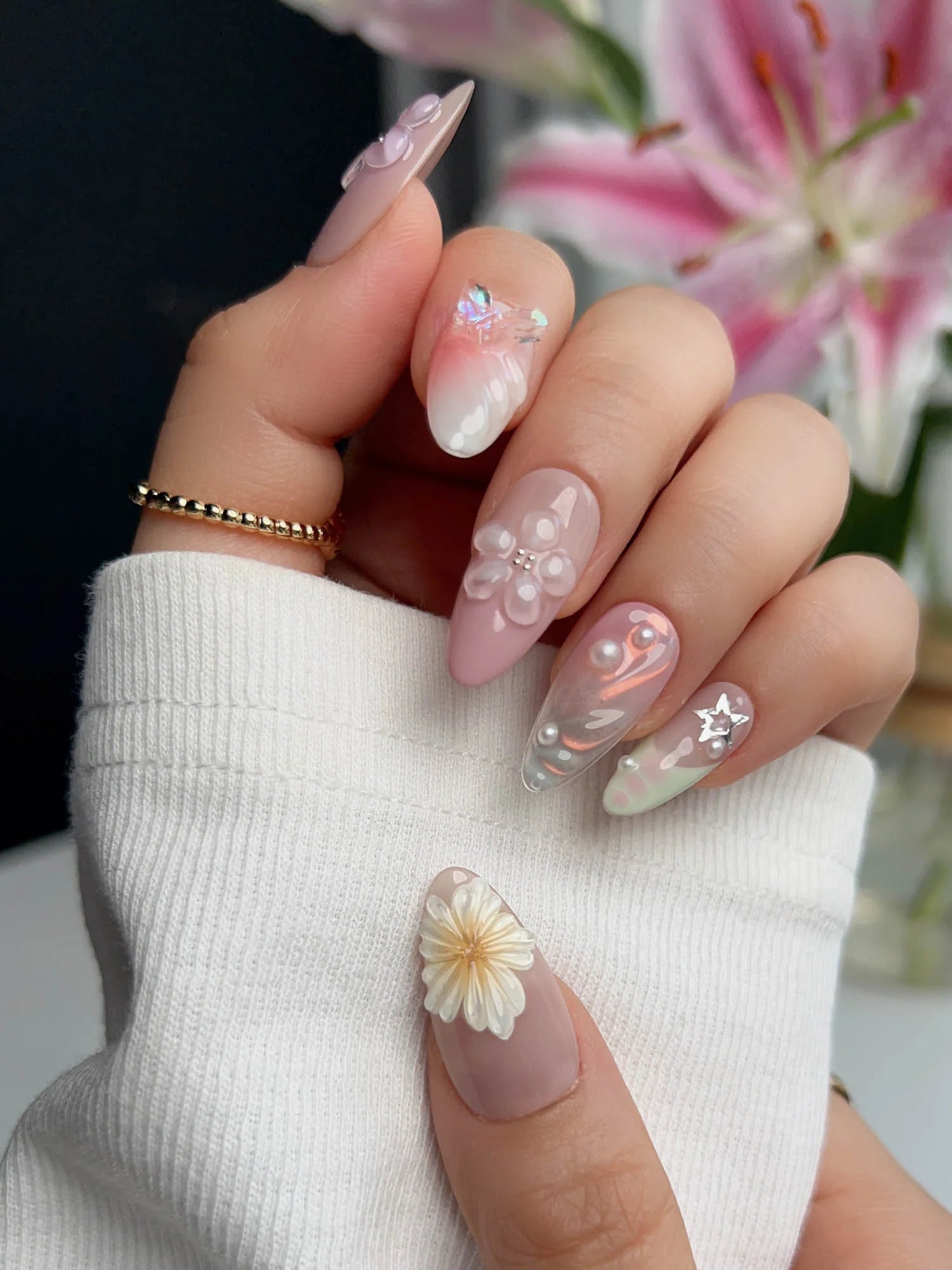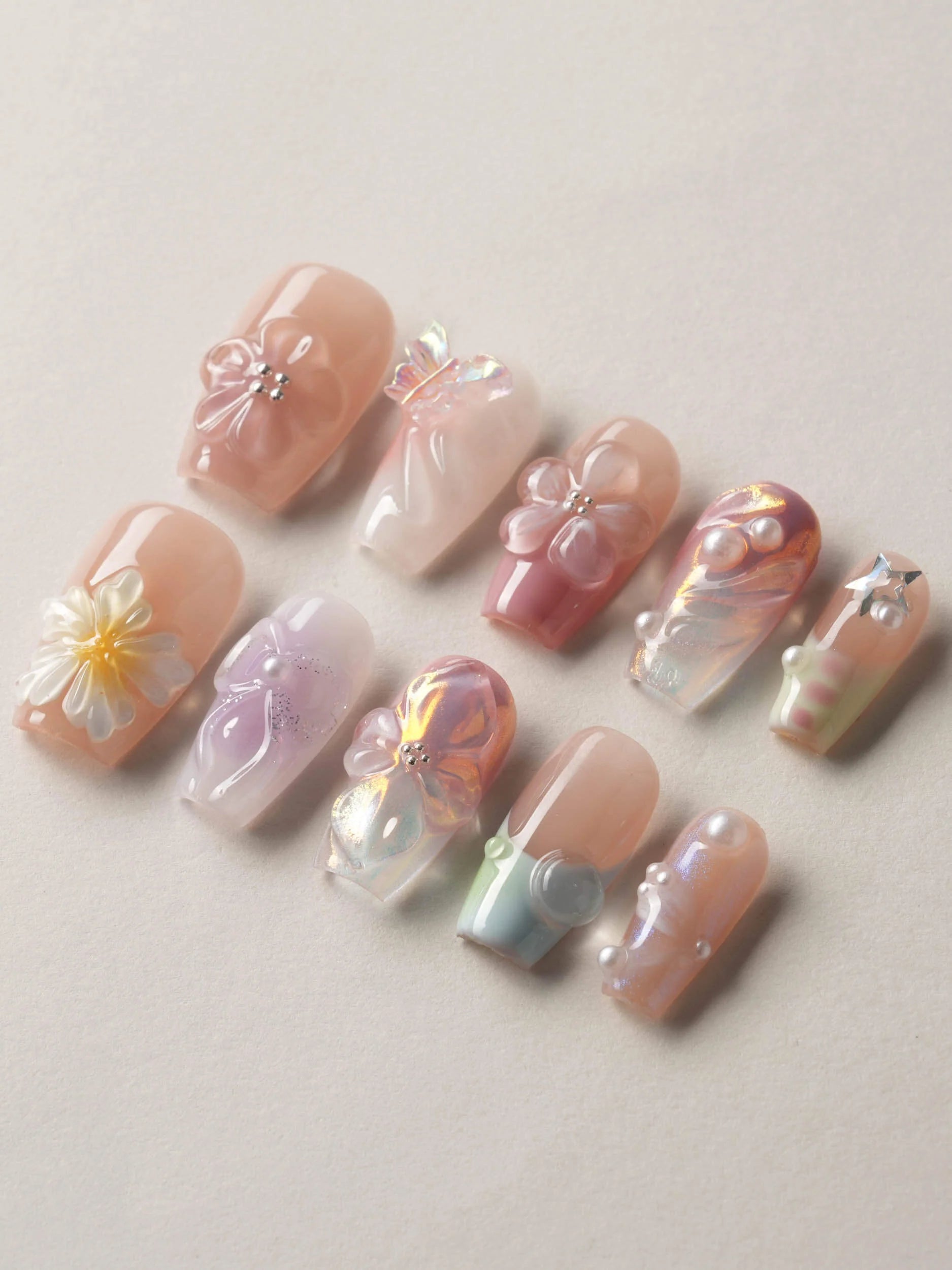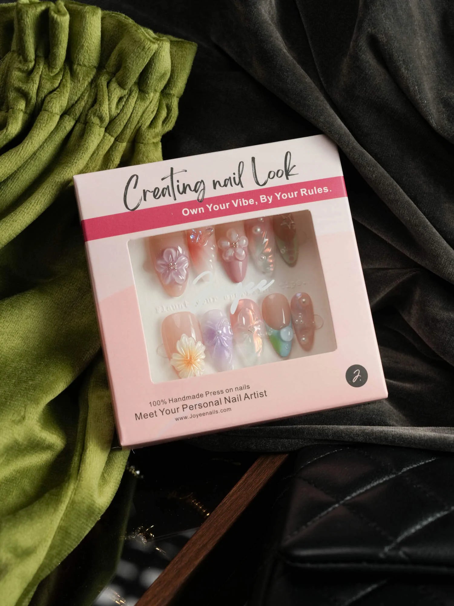 This handmade set features a soft pink base adorned with delicate 3D floral accents and tiny pearls that catch the light. Floral nail designs are a perennial favorite – especially in the spring when fresh flower motifs trend on Pinterest– and this elegant pink blossom pattern keeps you on-trend. The result is a feminine, eye-catching look that’s both stylish and timeless, instantly elevating your manicure.