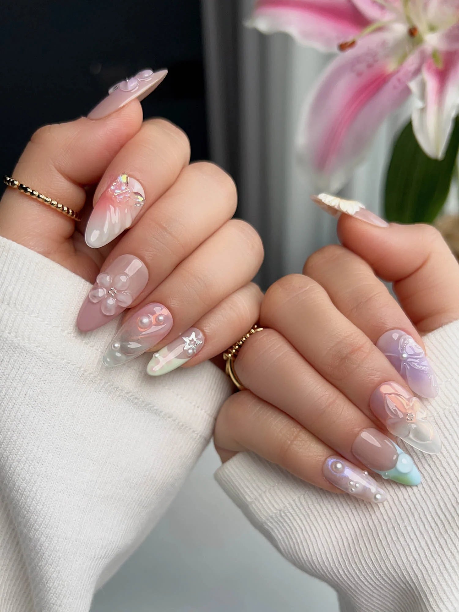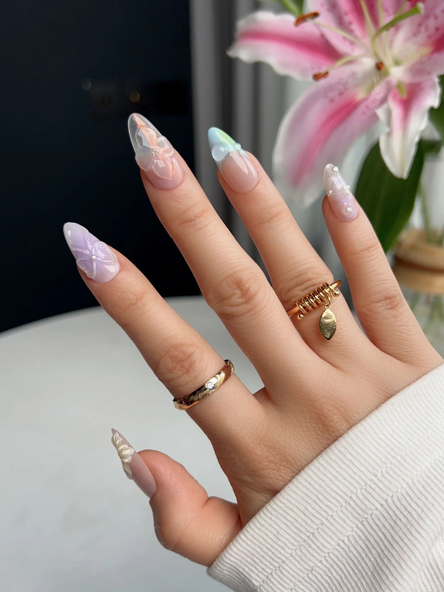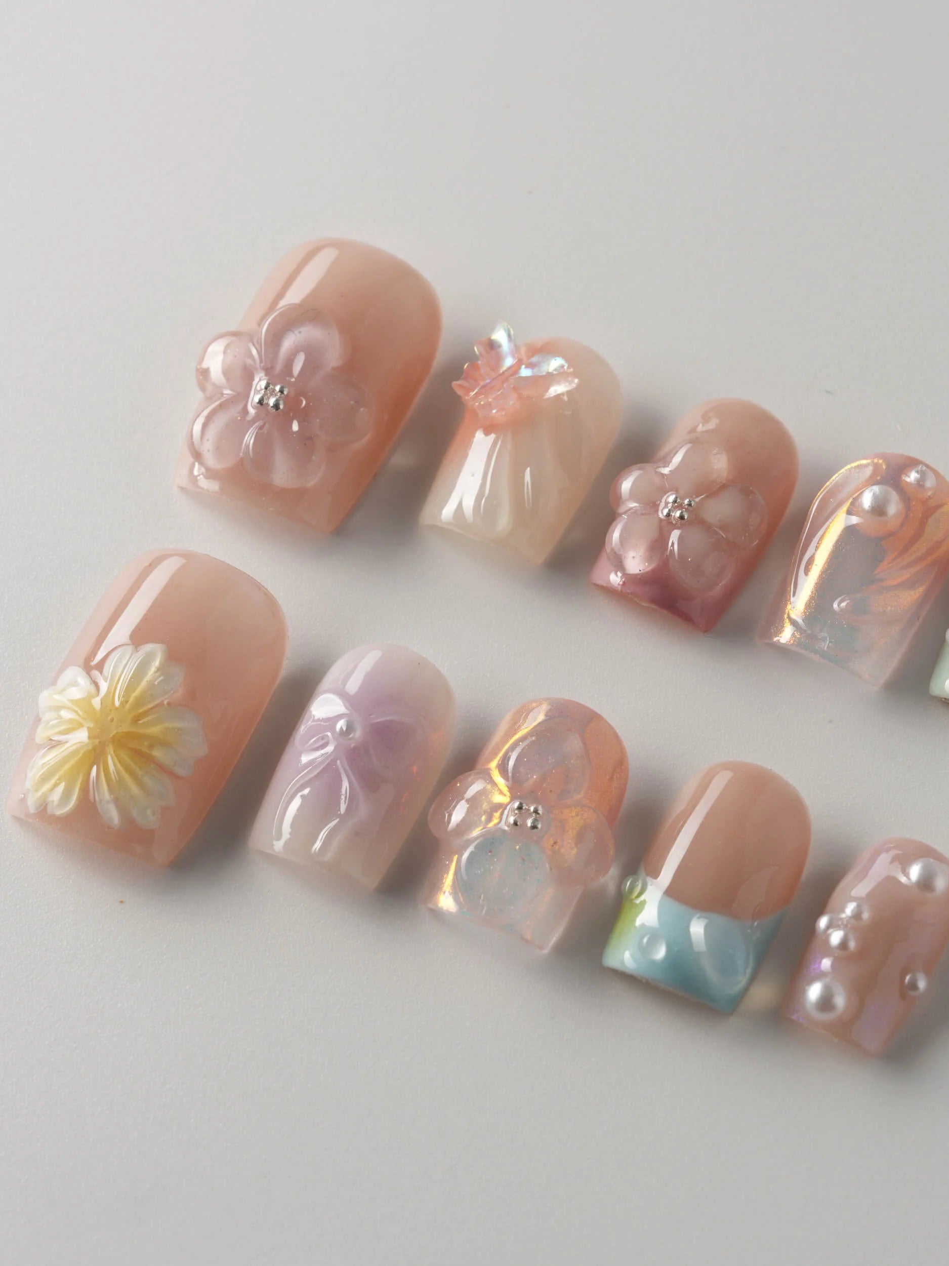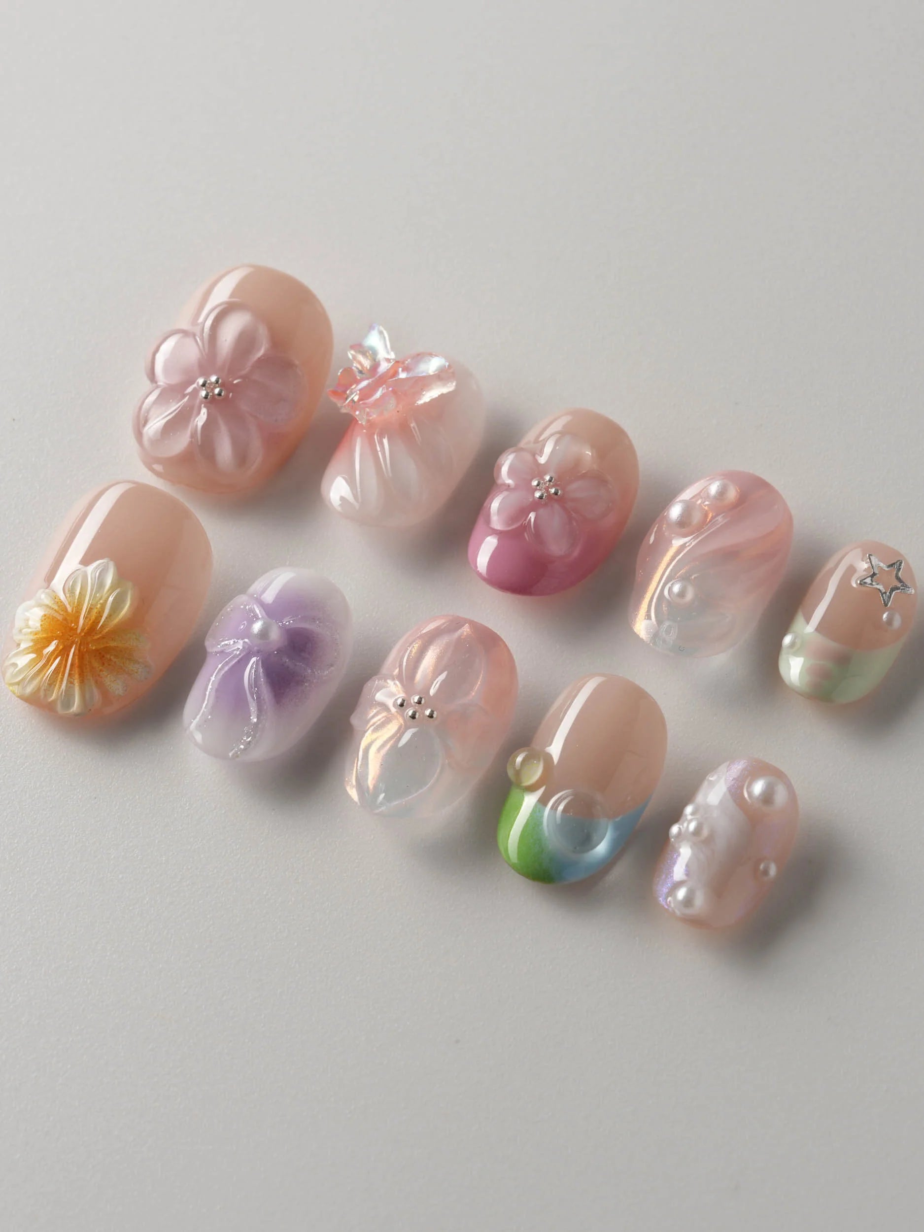 This handmade set features a soft pink base adorned with delicate 3D floral accents and tiny pearls that catch the light. Floral nail designs are a perennial favorite – especially in the spring when fresh flower motifs trend on Pinterest– and this elegant pink blossom pattern keeps you on-trend. The result is a feminine, eye-catching look that’s both stylish and timeless, instantly elevating your manicure.